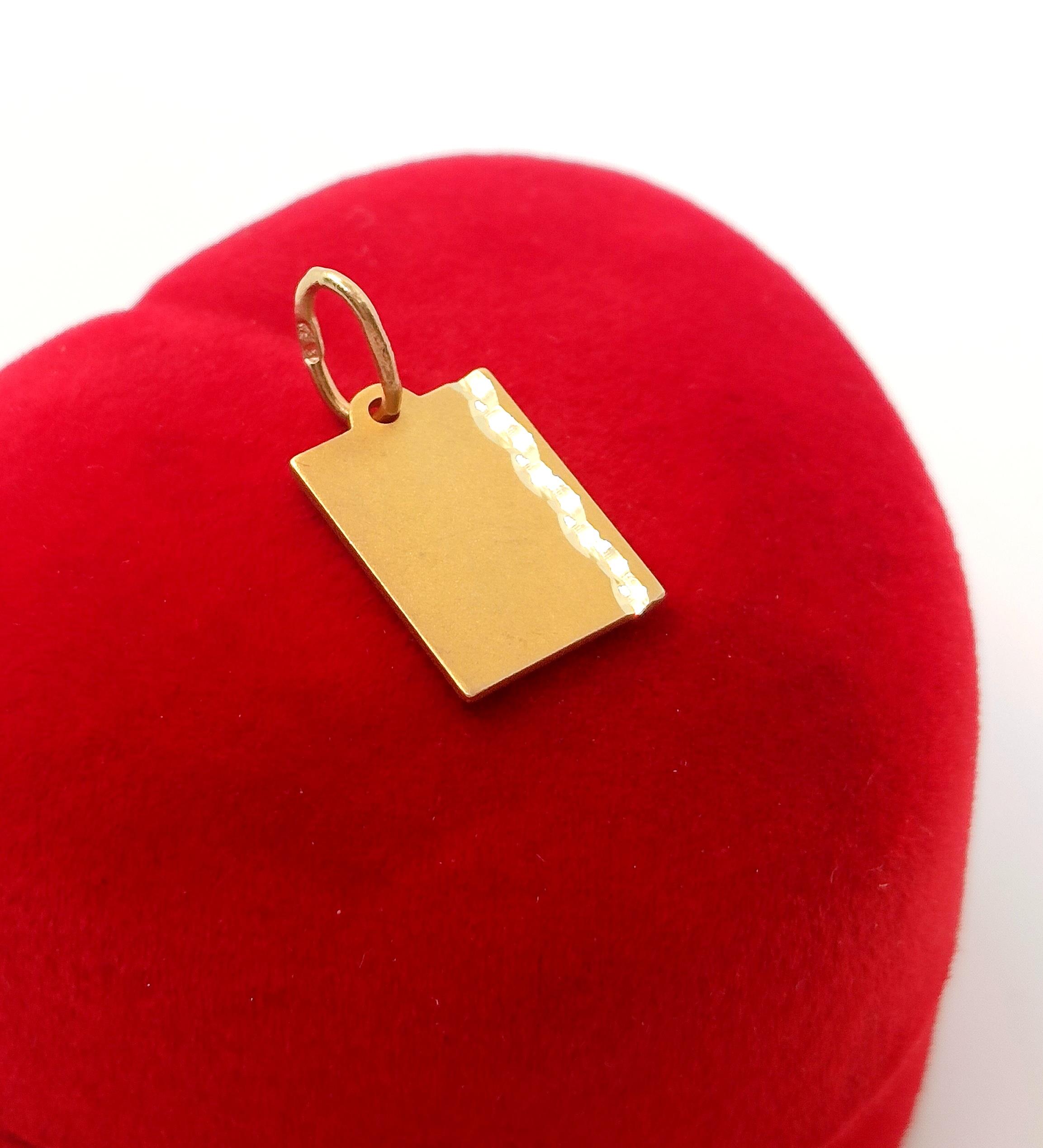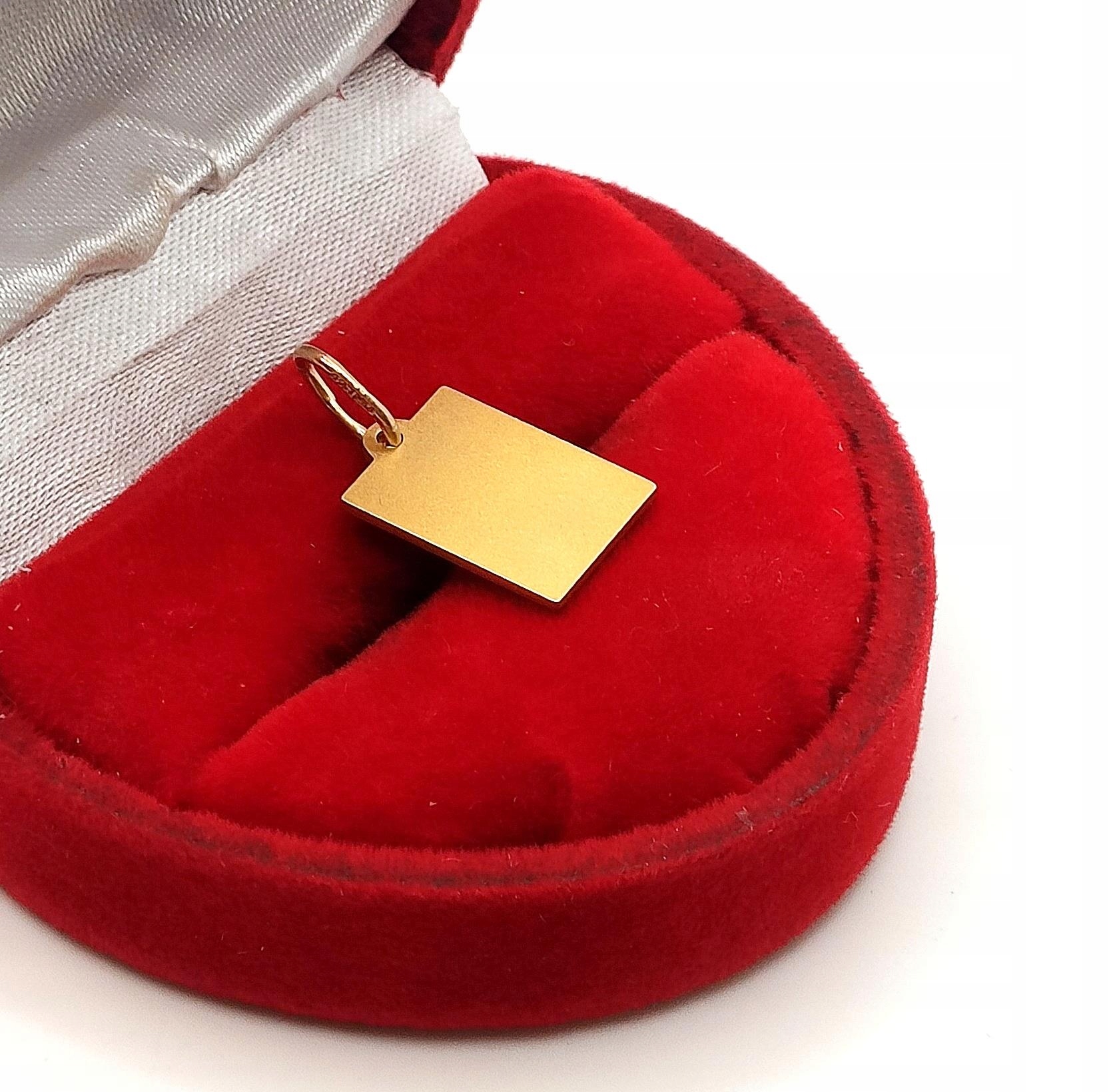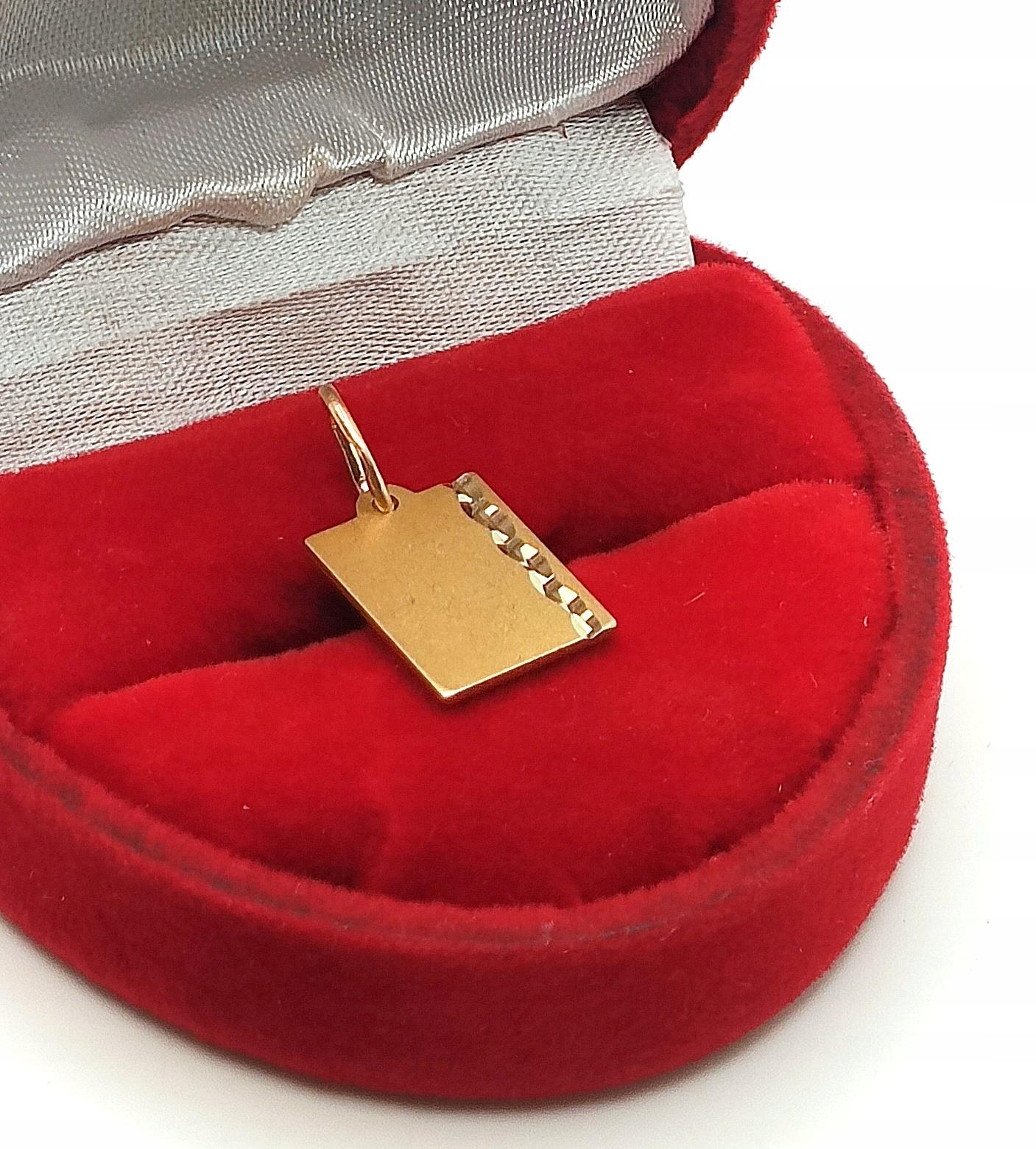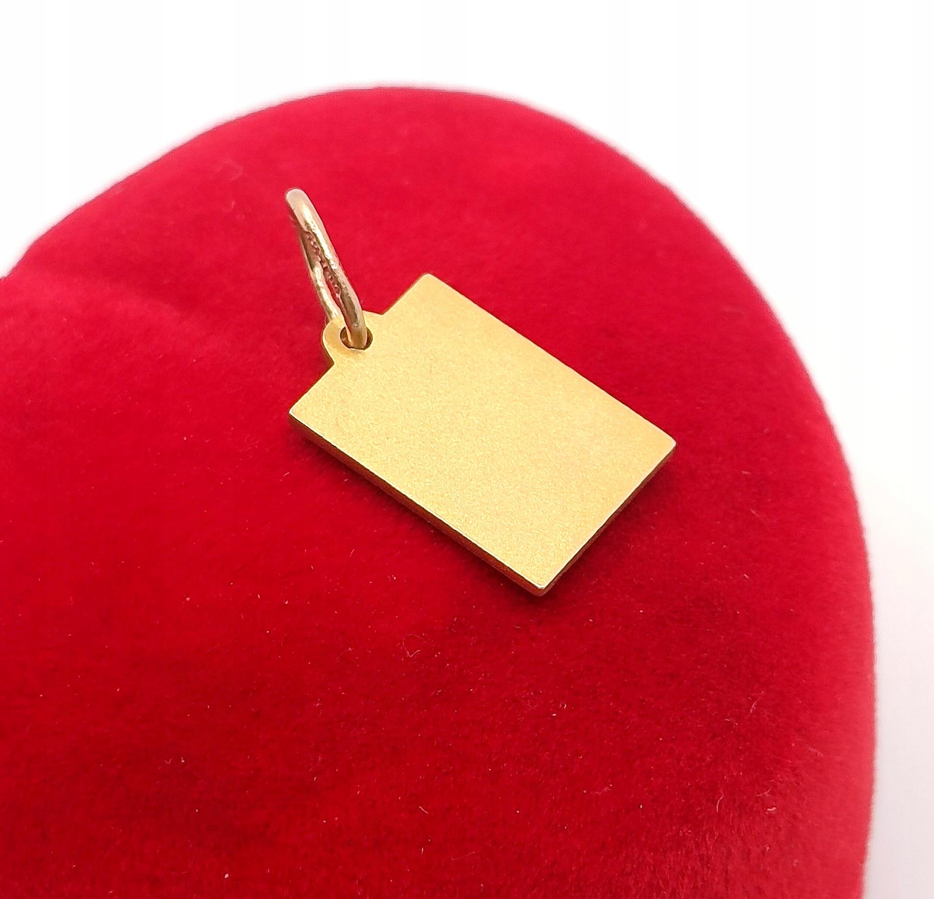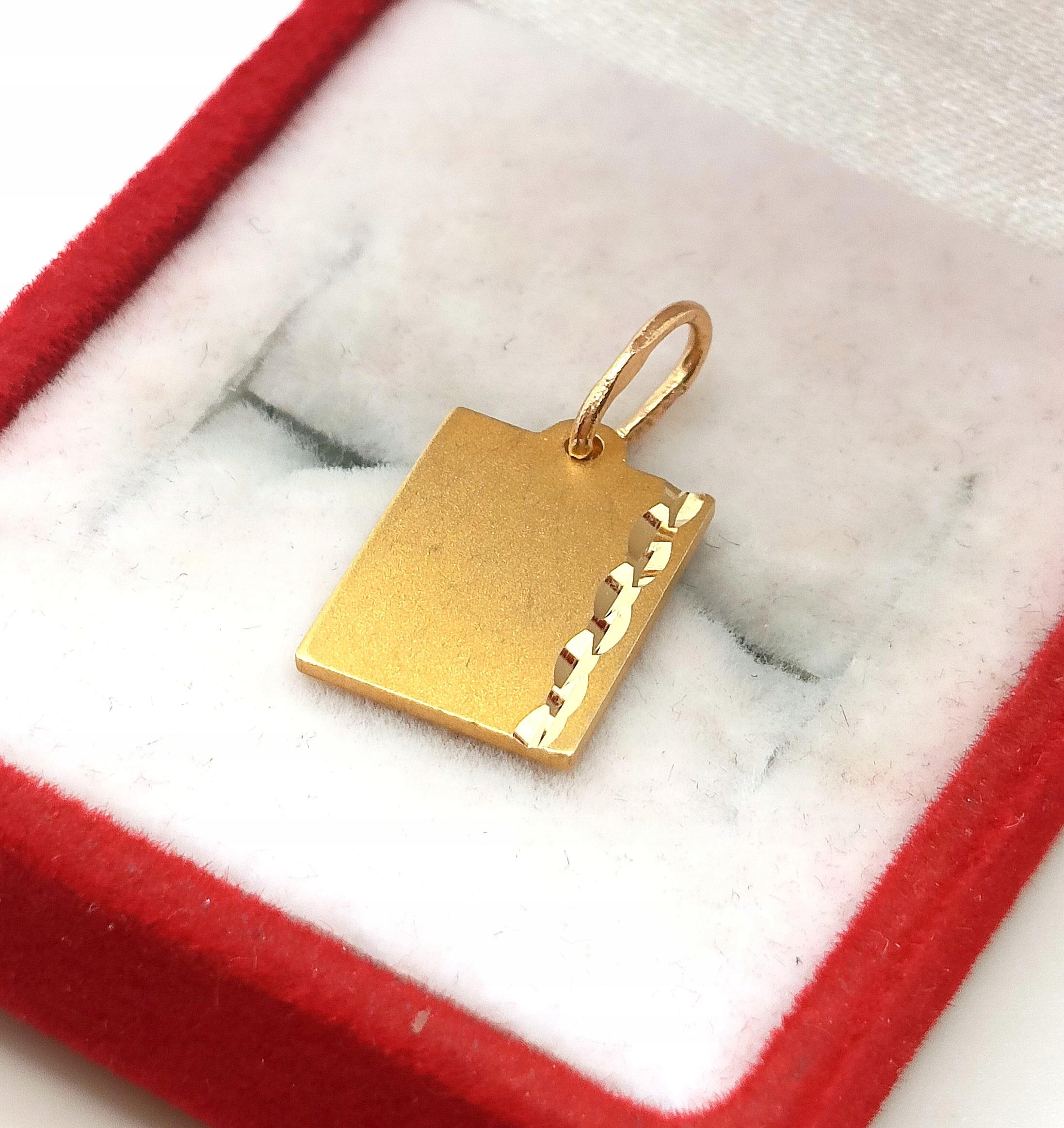 W ofercie na sprzedaż mamy dla państwa , złotą zawieszkę blaszkę . Z przodu zdobienie w formie żłobienia pionowo mieniące się. Z tyłu całkowicie gładka