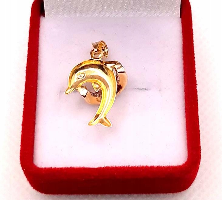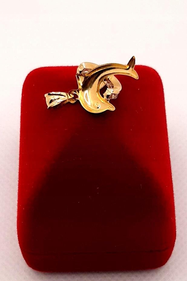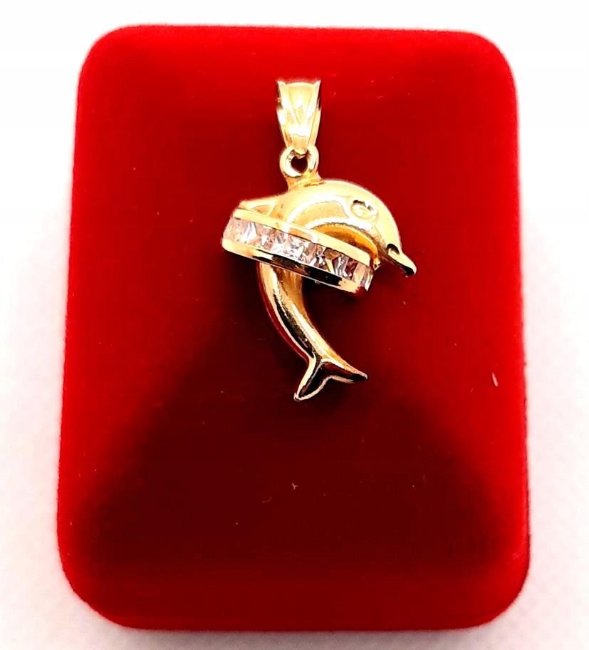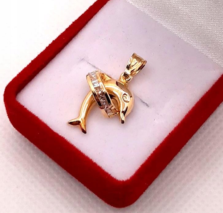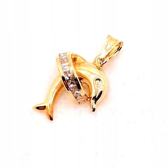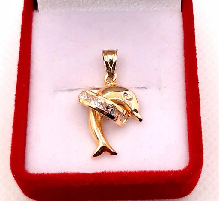 W ofercie sprzedaży posiadamy piękną, złotą zawieszkę w kształcie delfina, w obręczy ozdobionej cyrkoniami.