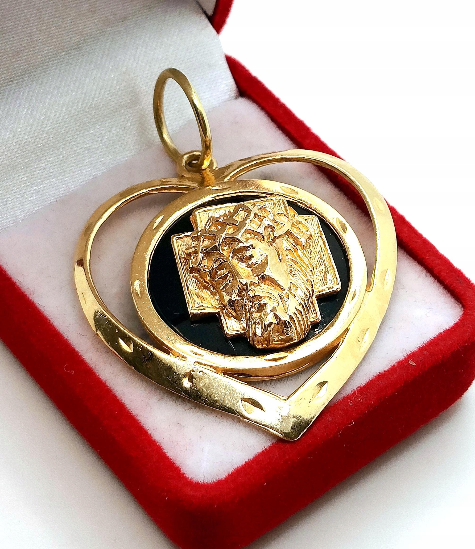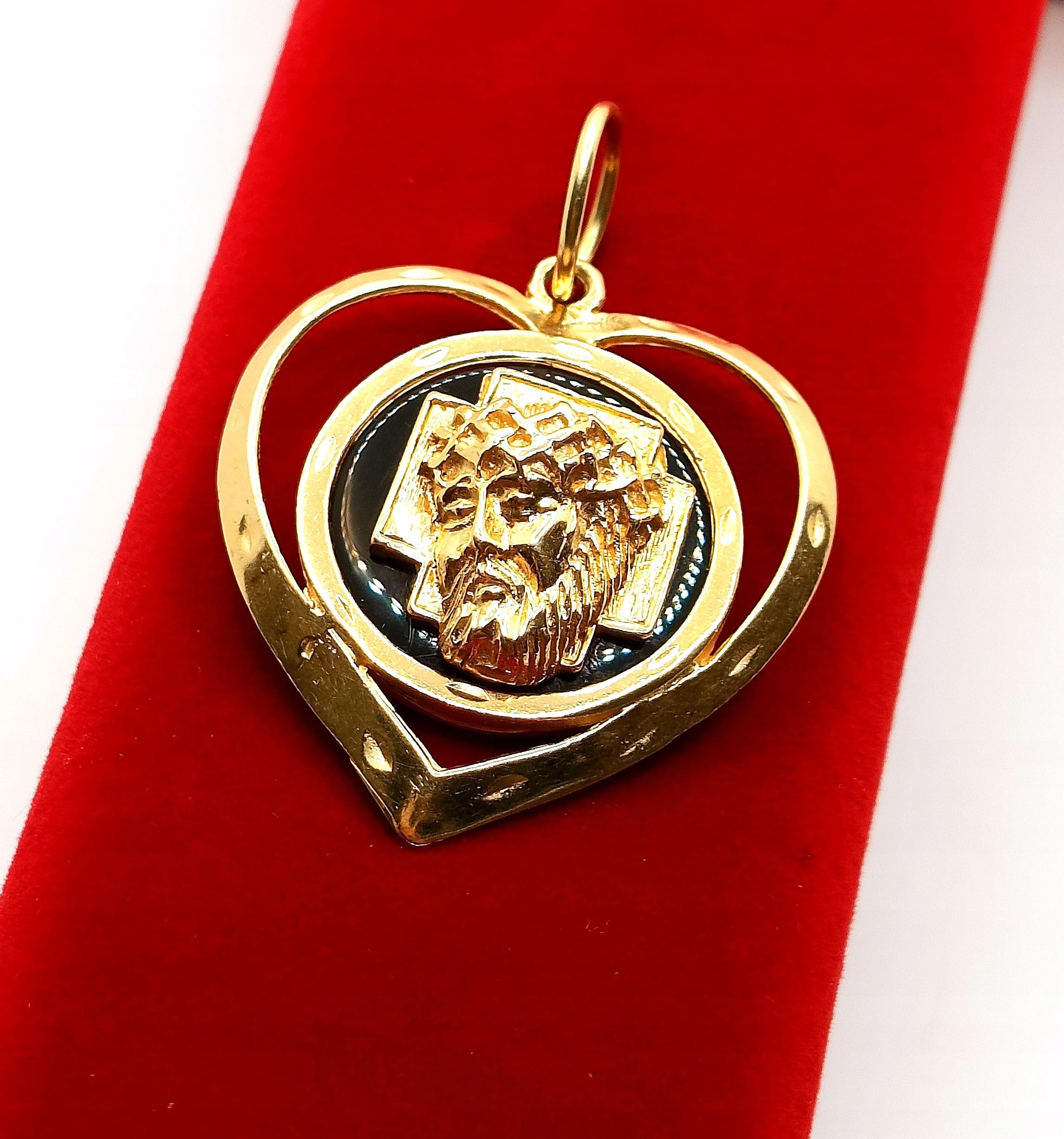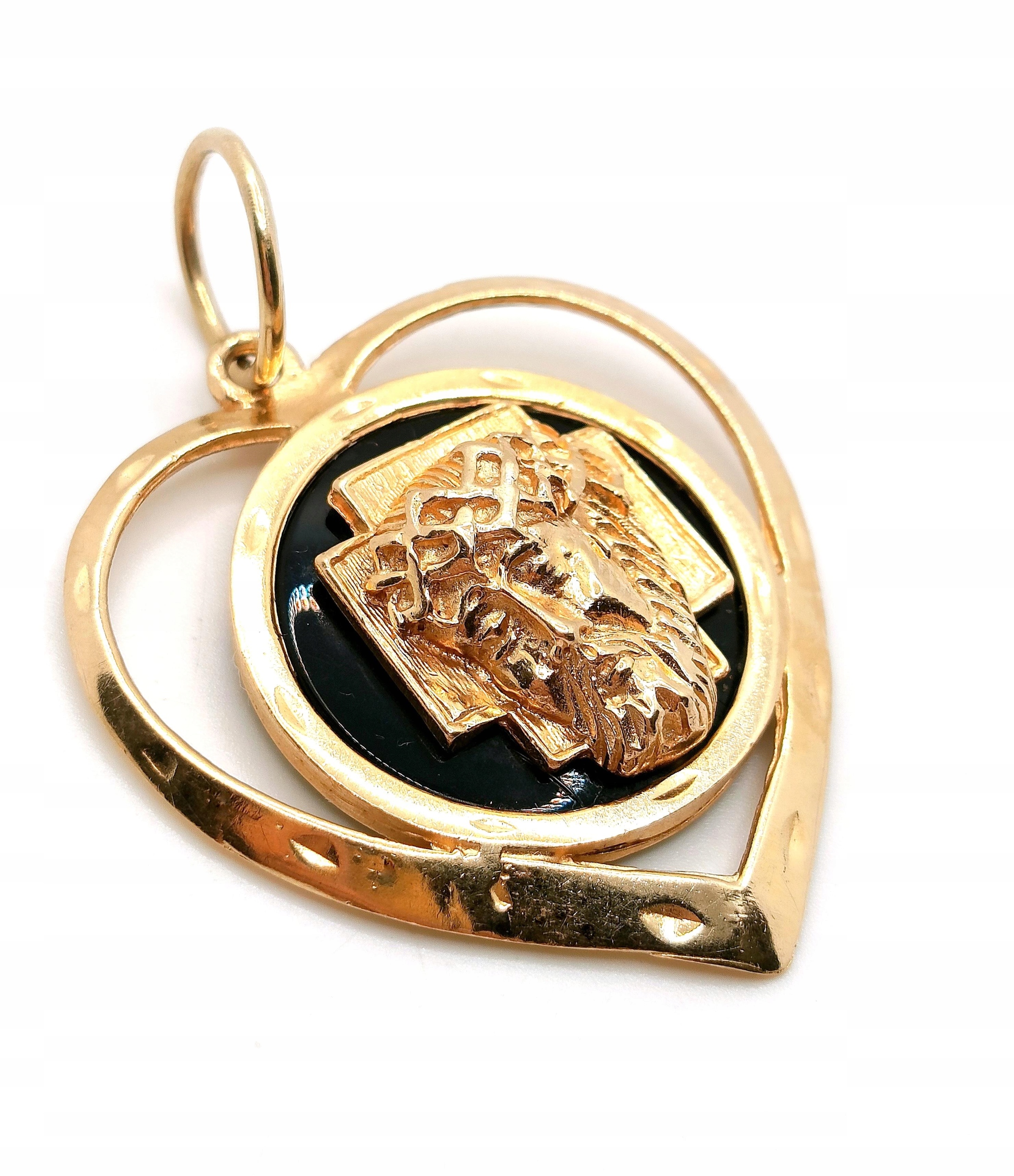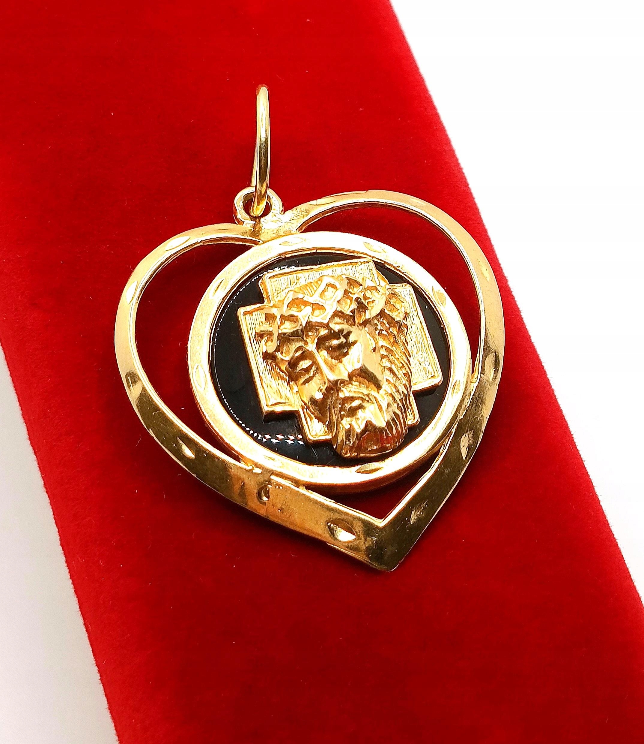 Oferujemy na sprzedaż dużą, złotą zawieszkę Serce z podobizną Jezusa na czarnym tle z Onyksu.