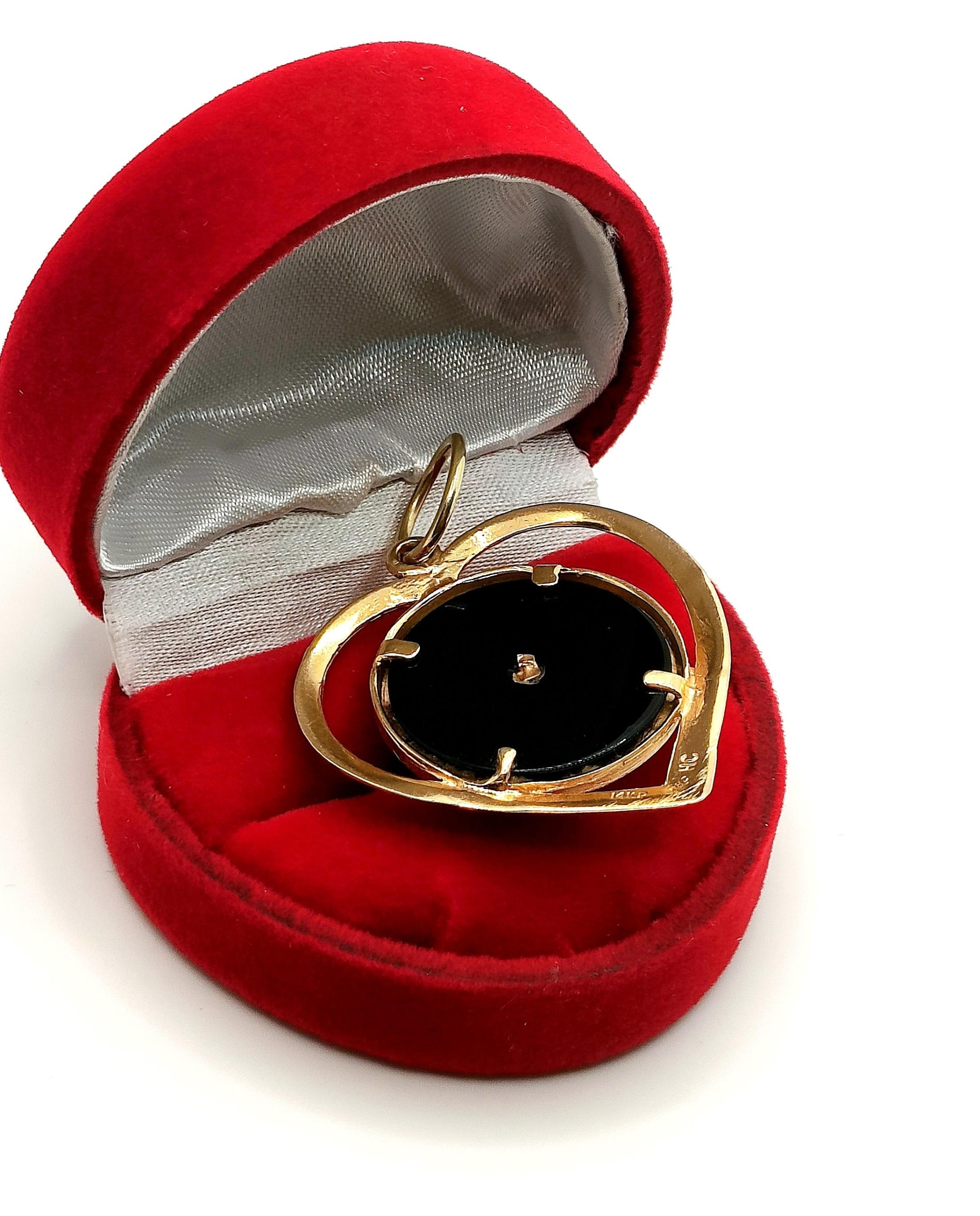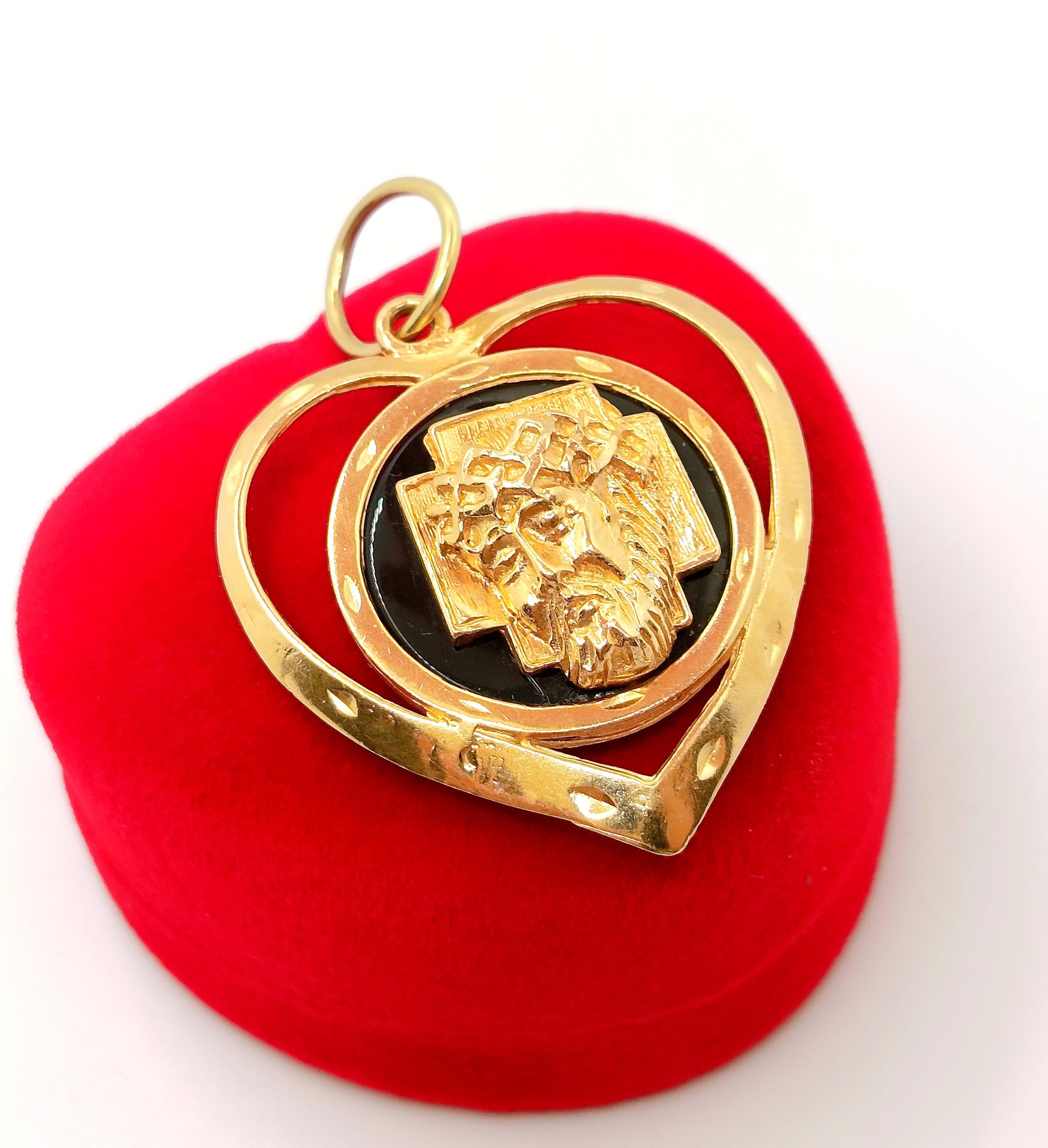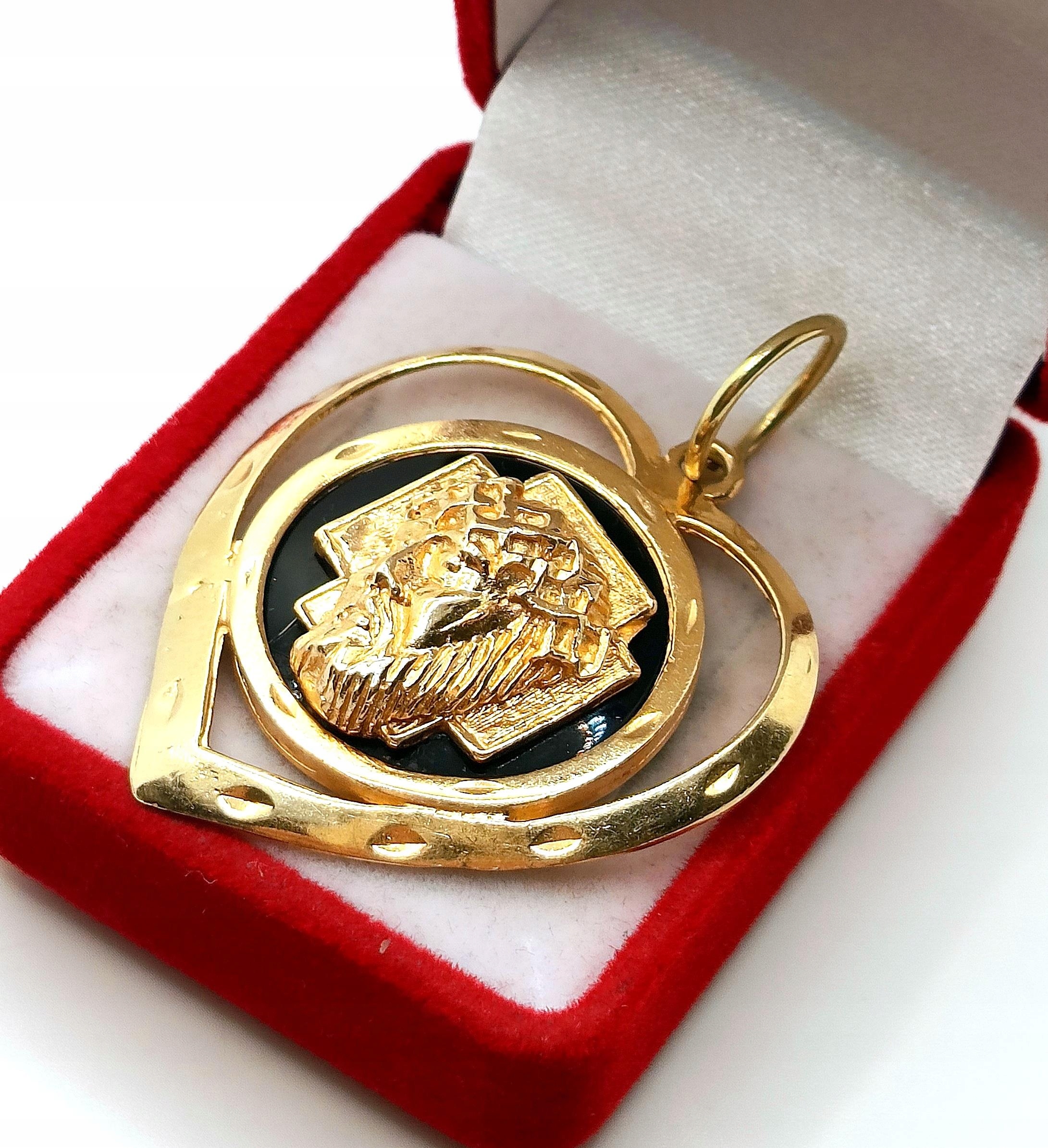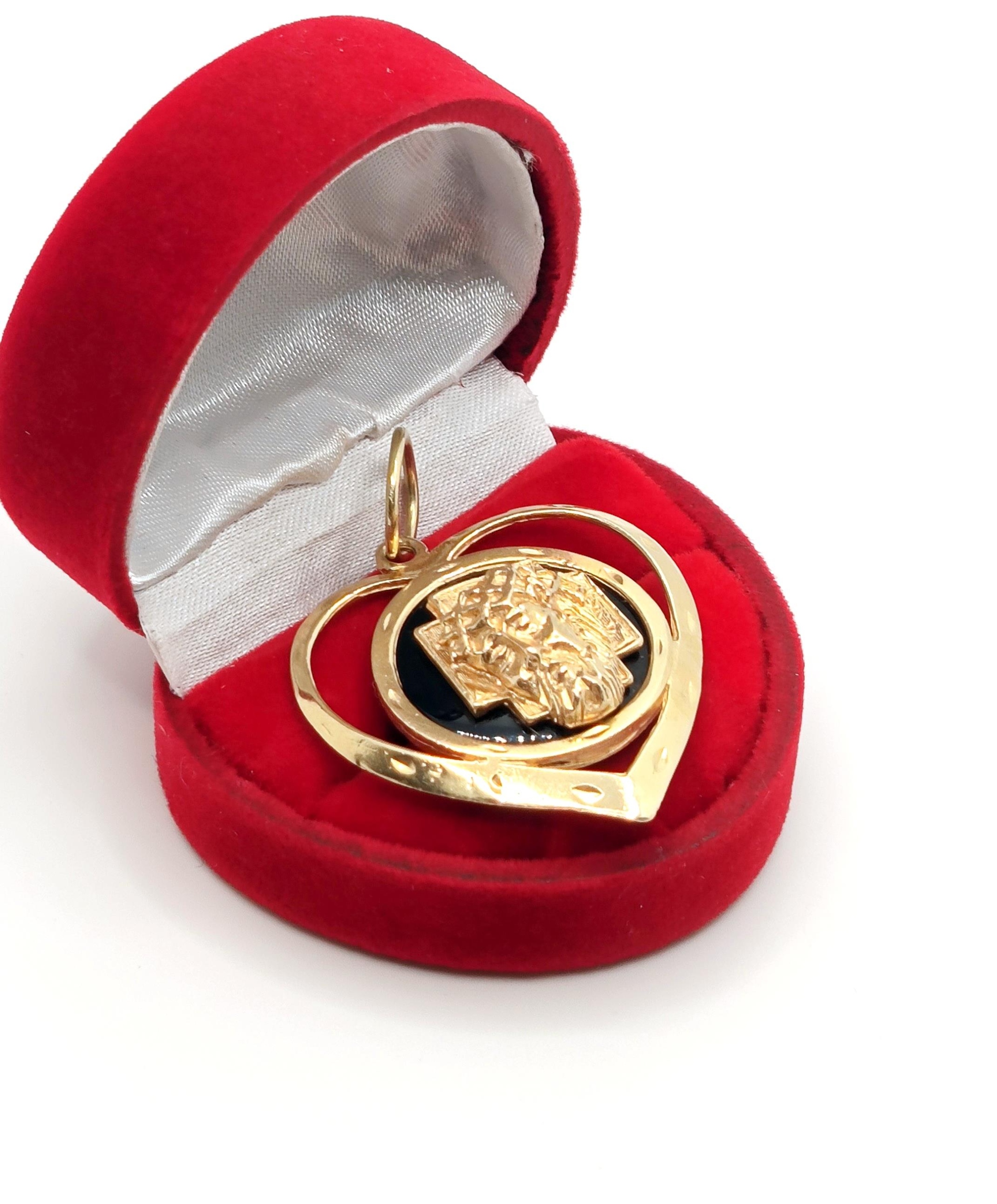 Oferujemy na sprzedaż dużą, złotą zawieszkę Serce z podobizną Jezusa na czarnym tle z Onyksu.