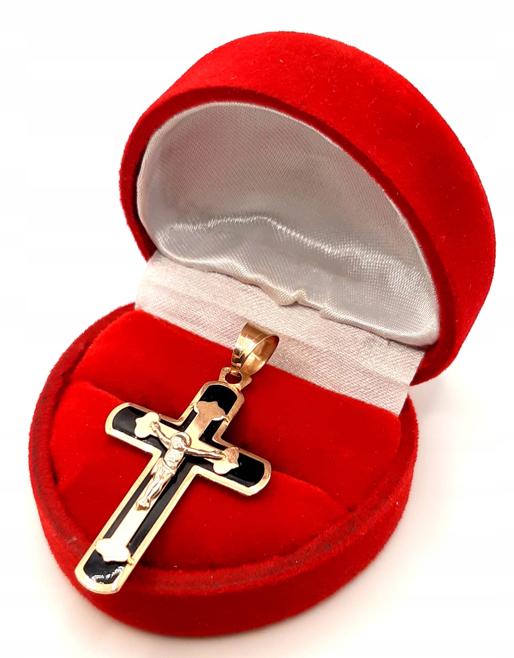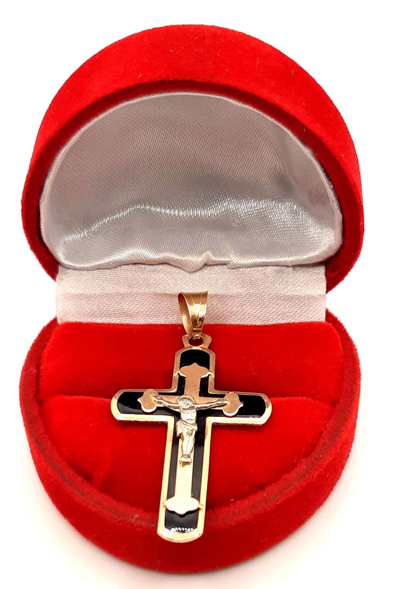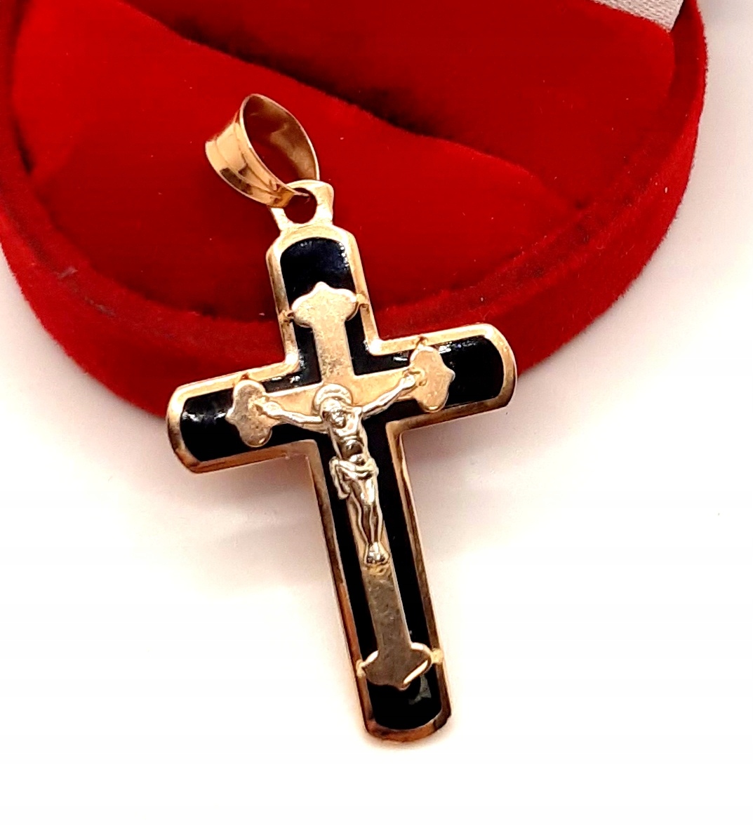 W ofercie na sprzedaż mamy dla Państwa piękną, złotą zawieszkę w kształcie krzyża z Chrystusem, ozdobioną onyksem.