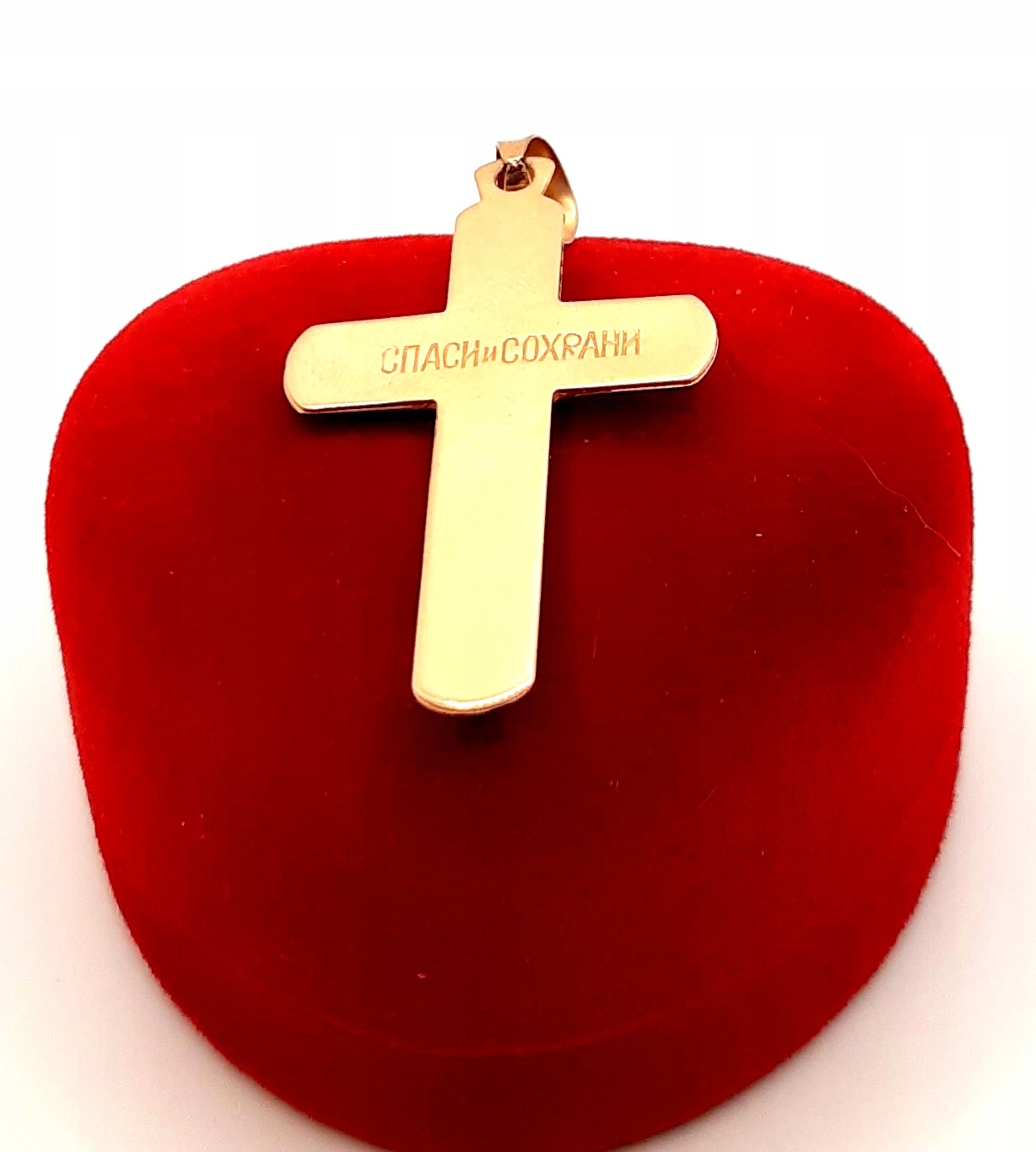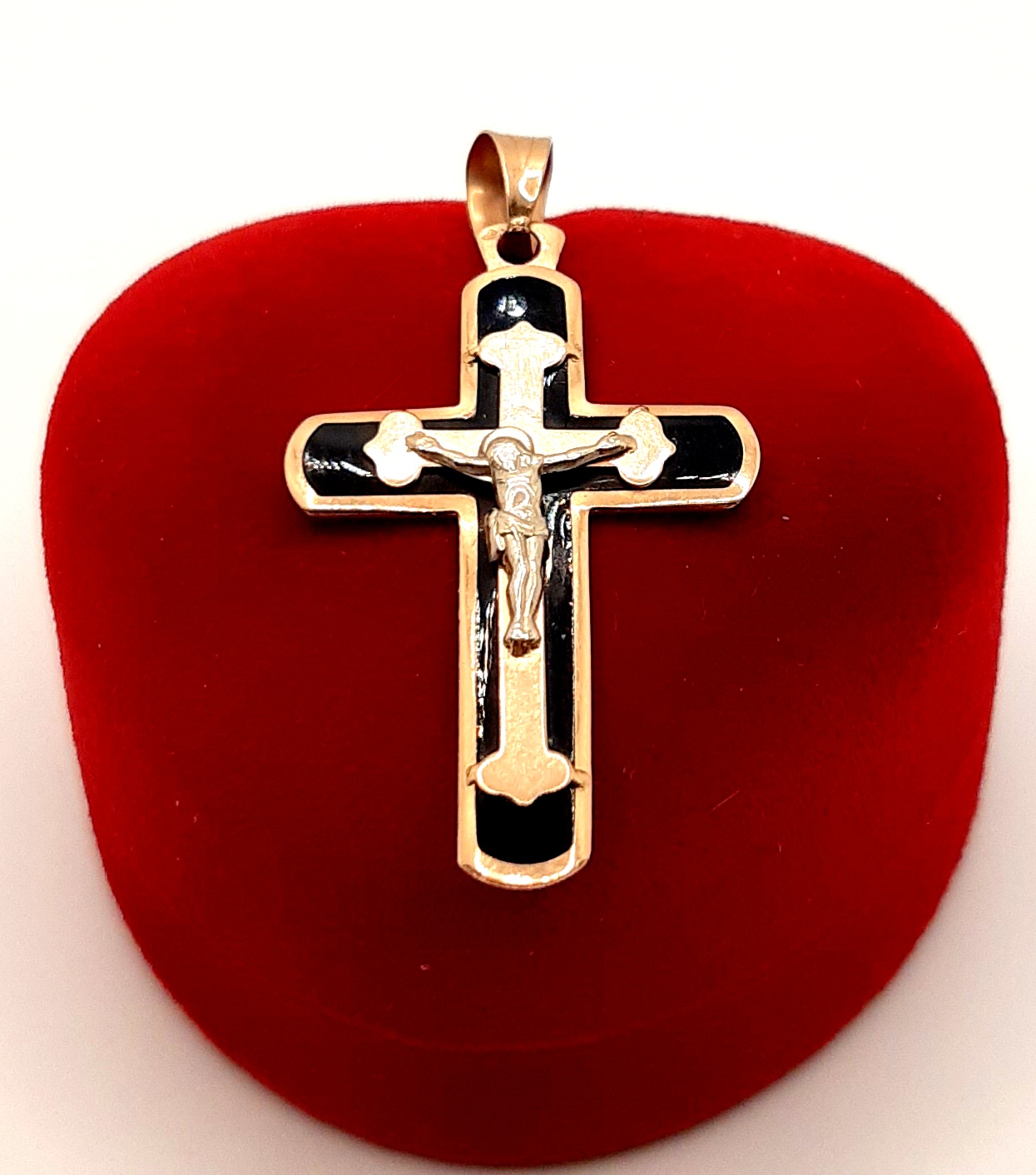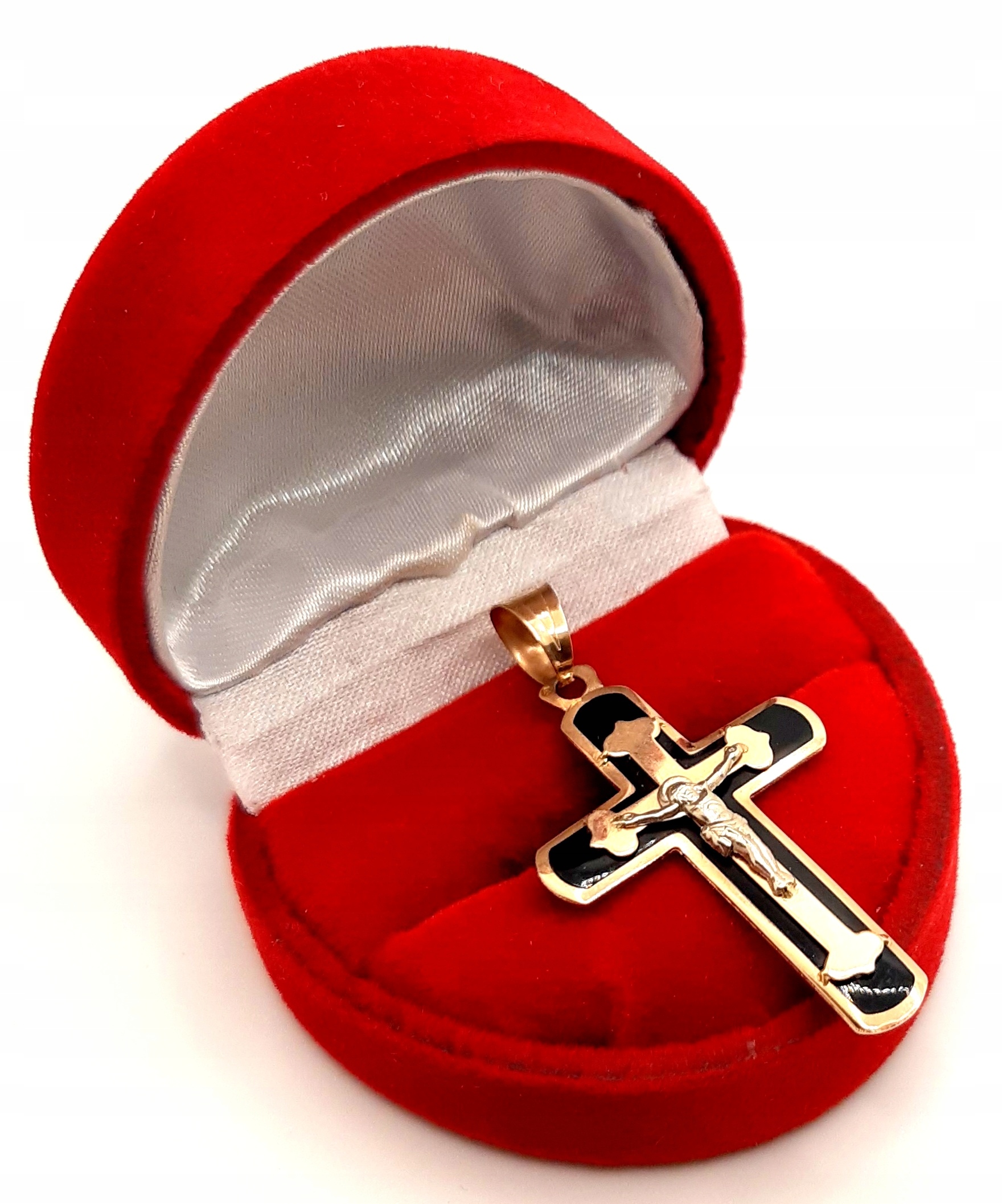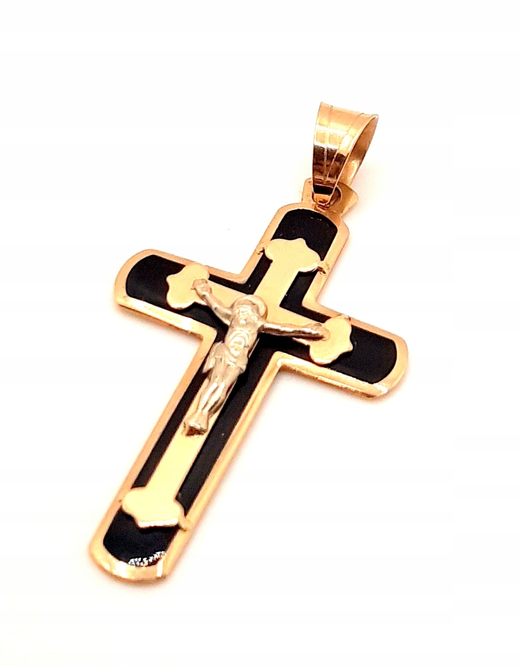 W ofercie na sprzedaż mamy dla Państwa piękną, złotą zawieszkę w kształcie krzyża z Chrystusem, ozdobioną onyksem.