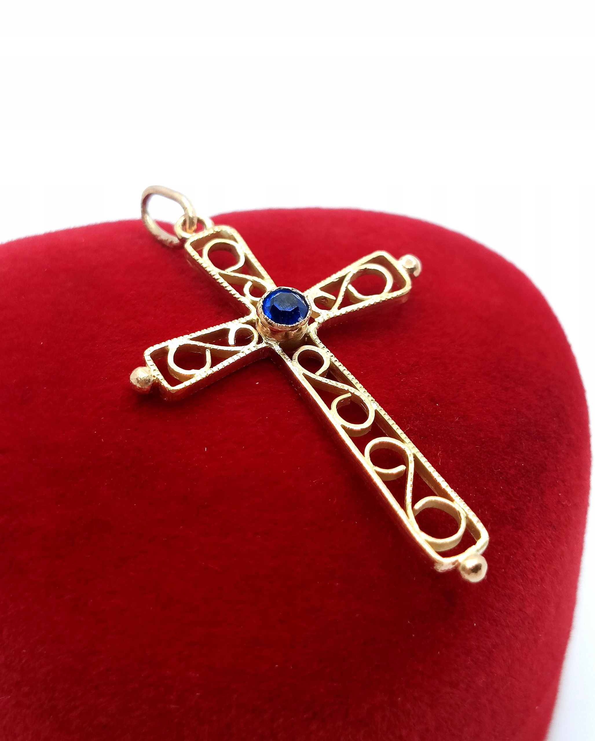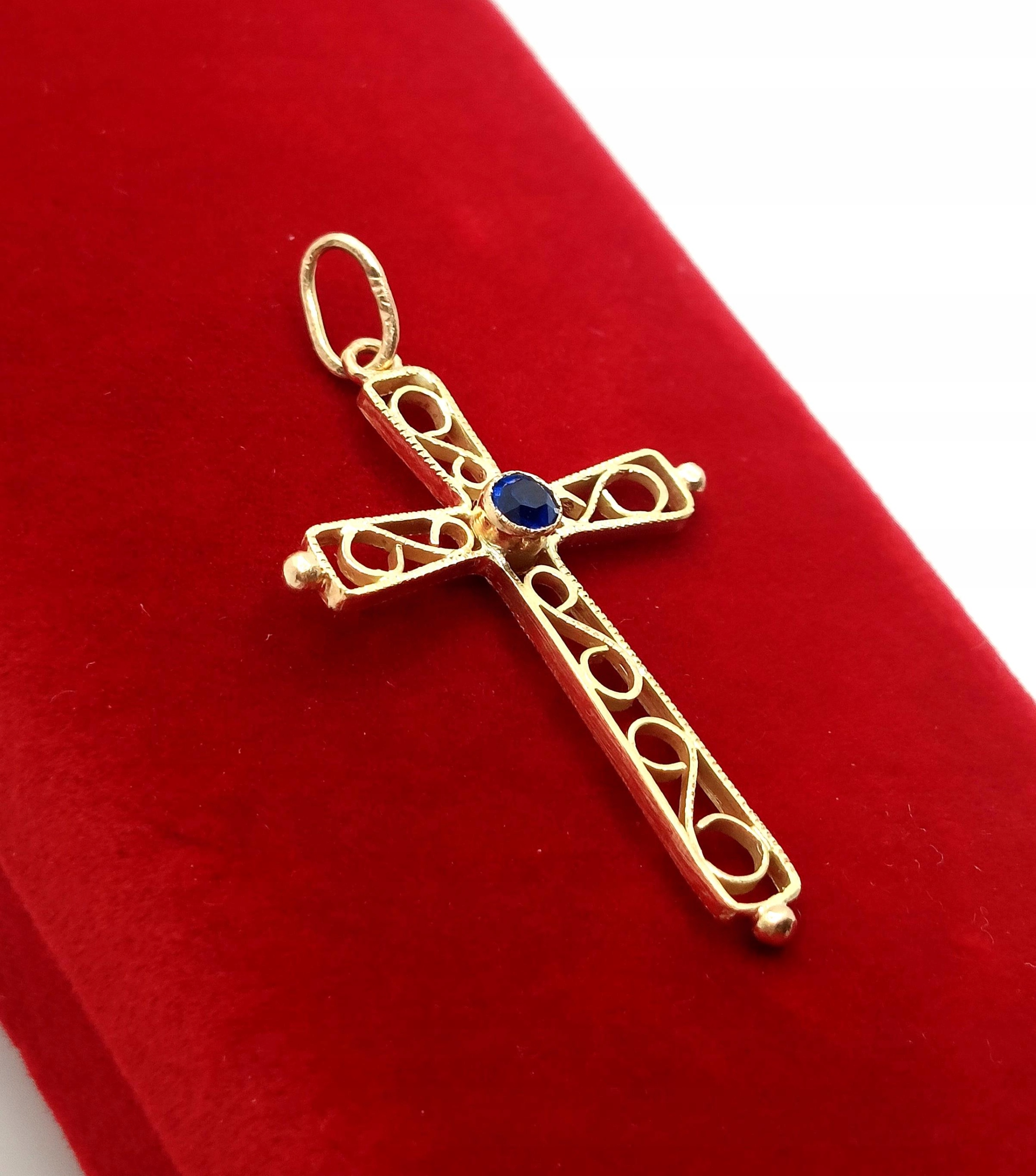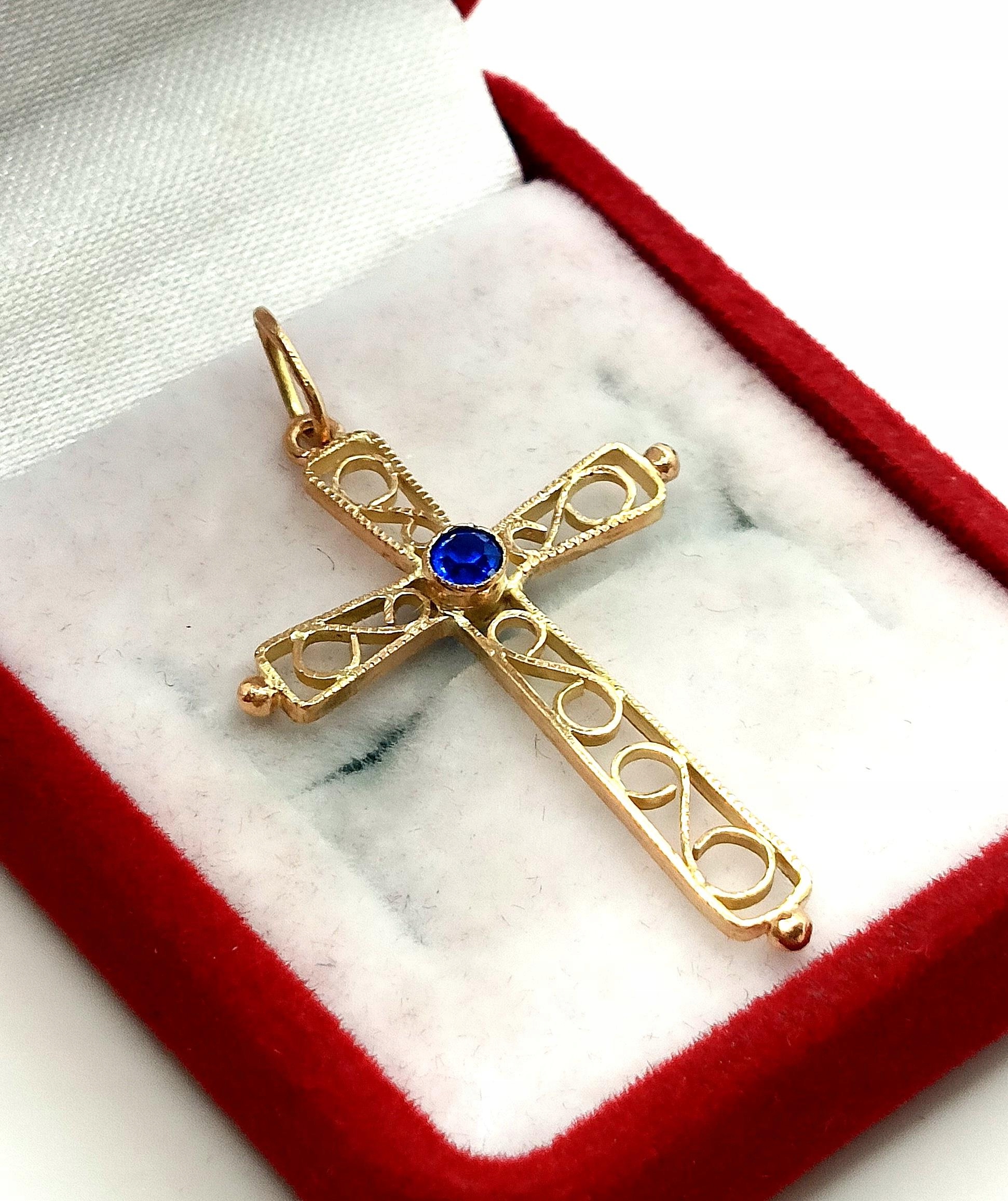 Oferujemy na sprzedaż złotą zawieszkę krzyżyk zdobiony niebieską cyrkonią oraz ażurowym ornamentem.