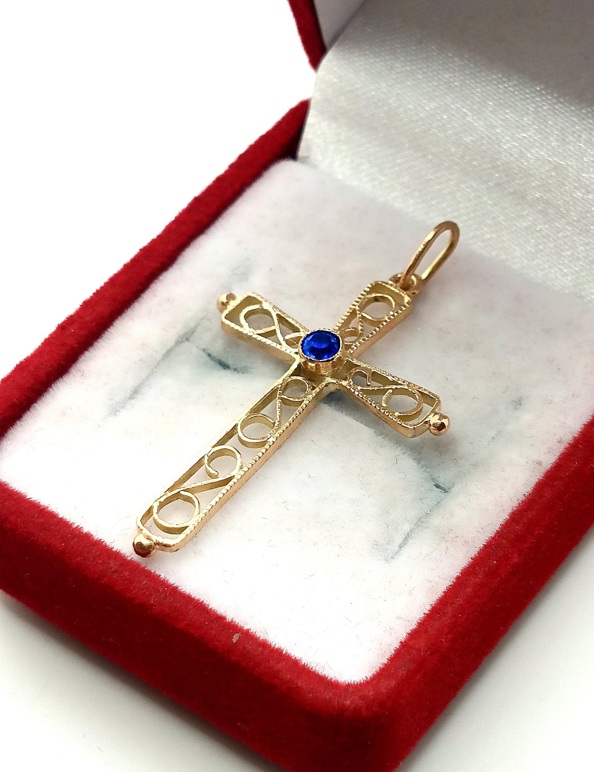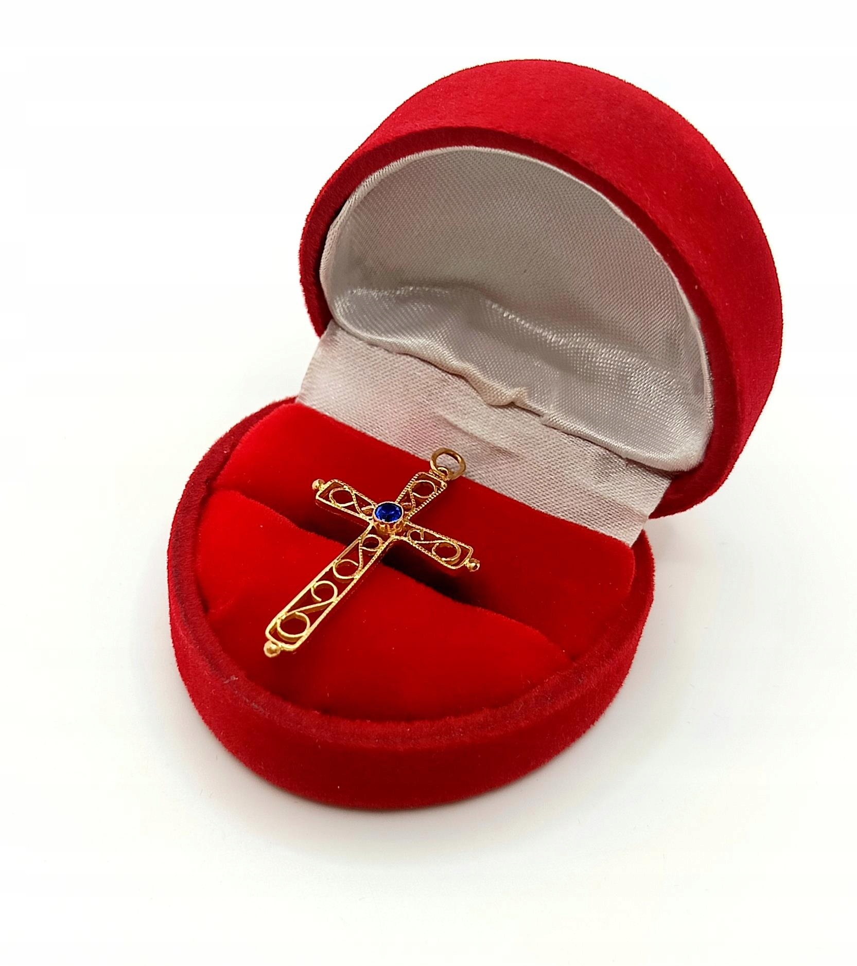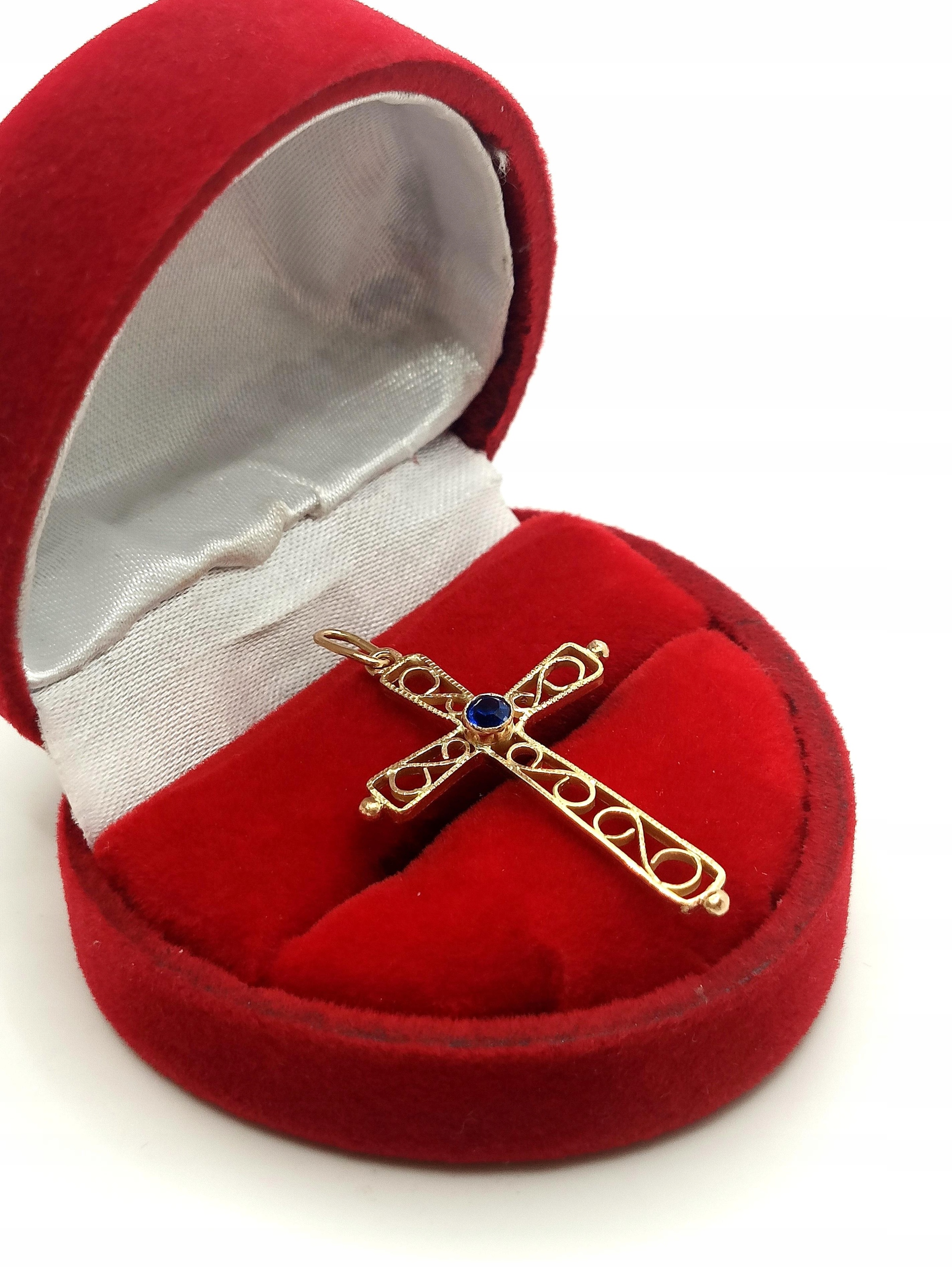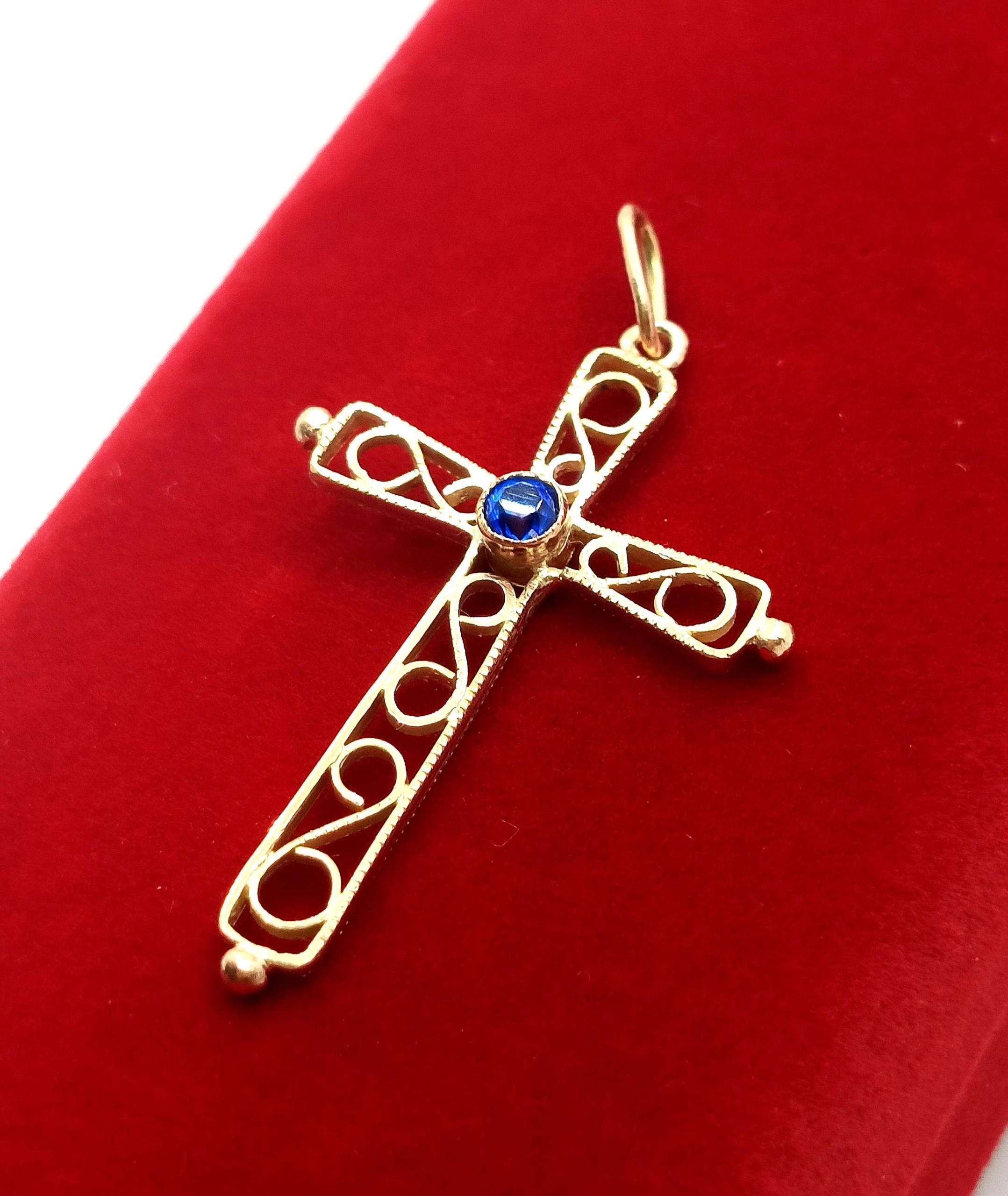 Oferujemy na sprzedaż złotą zawieszkę krzyżyk zdobiony niebieską cyrkonią oraz ażurowym ornamentem.