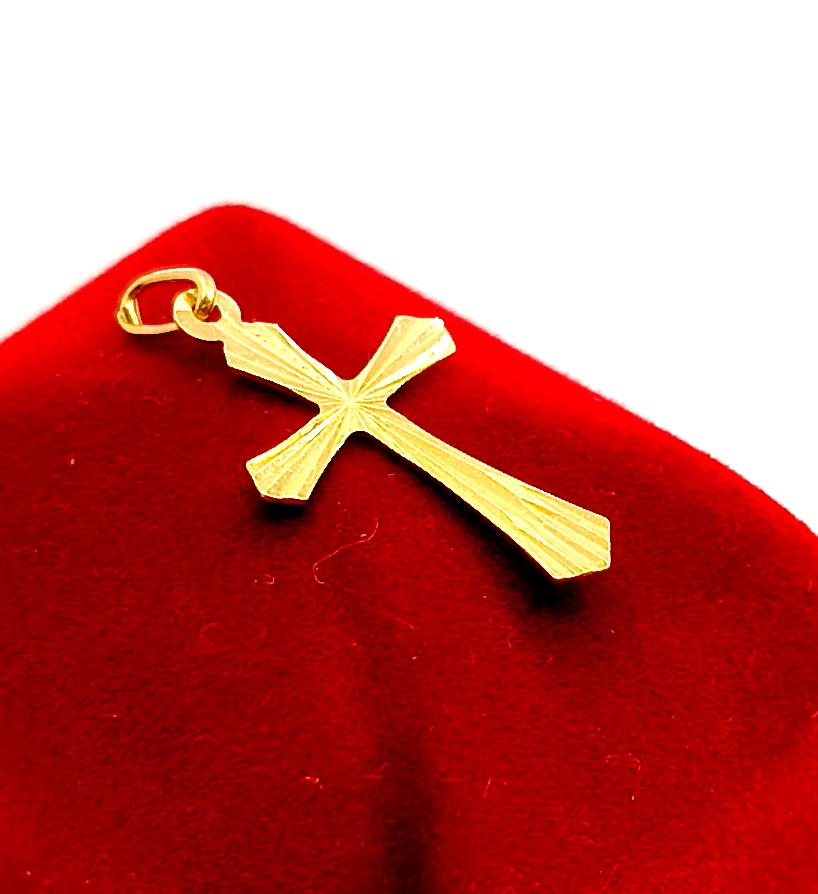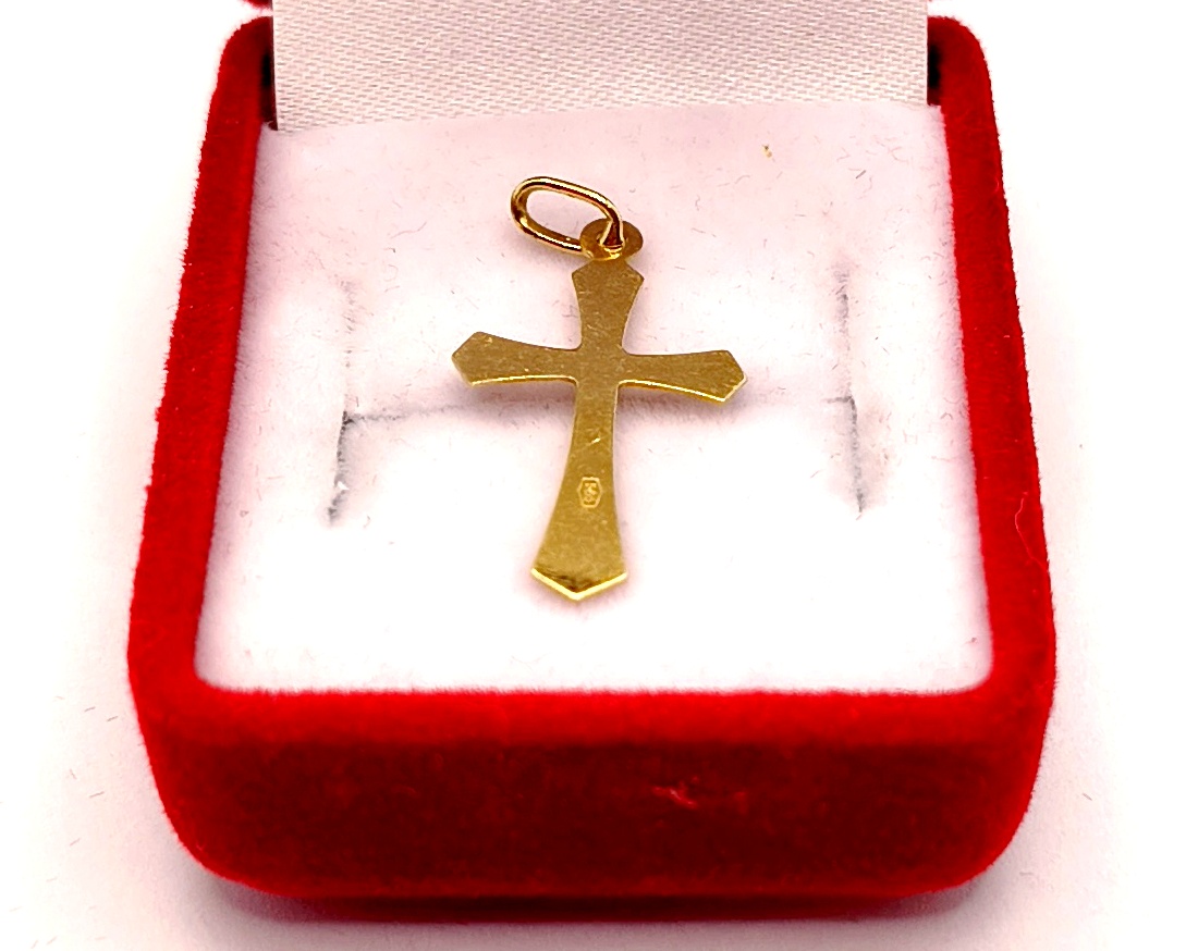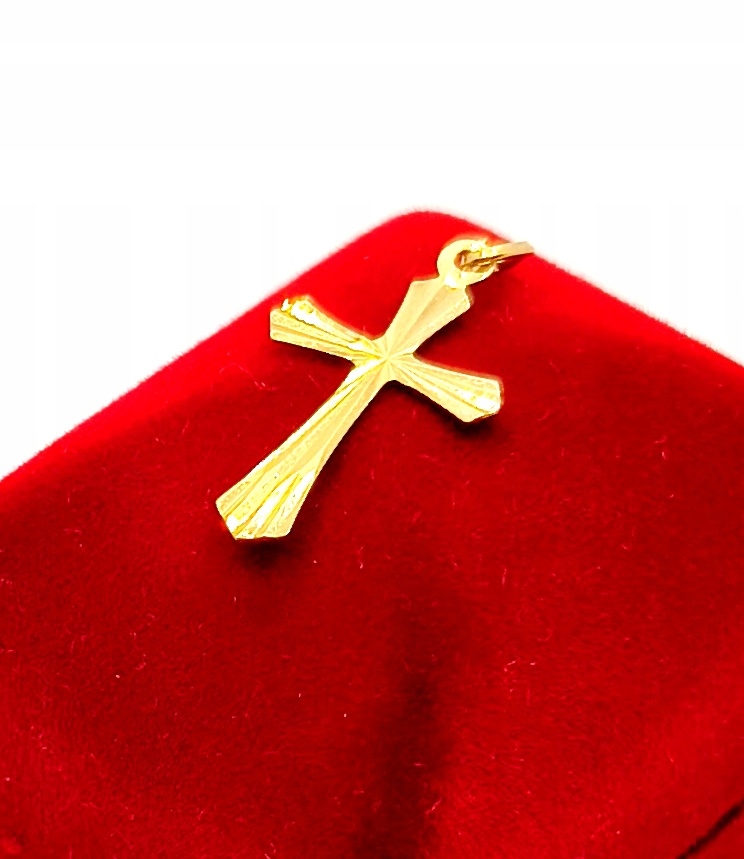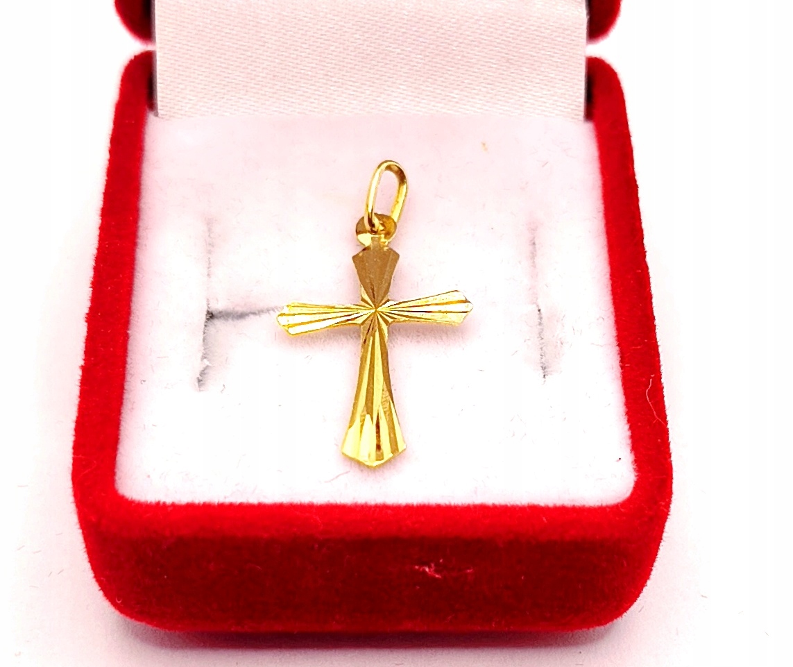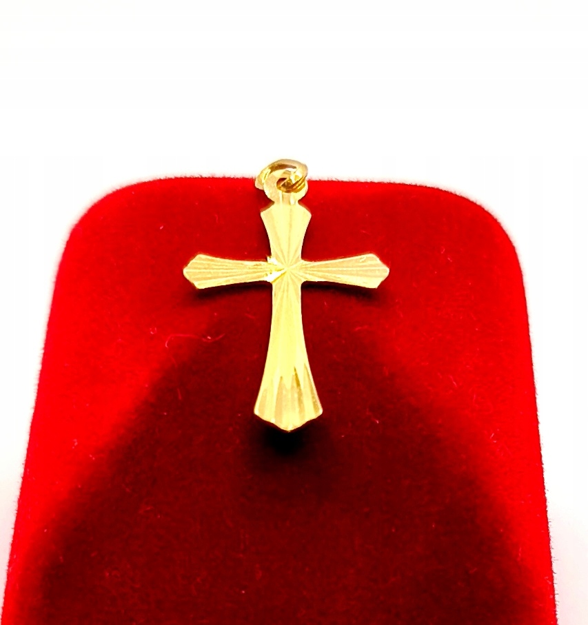 Oferujemy na sprzedaż piękną, złotą zawieszkę w kształcie zdobionego krzyżyka.