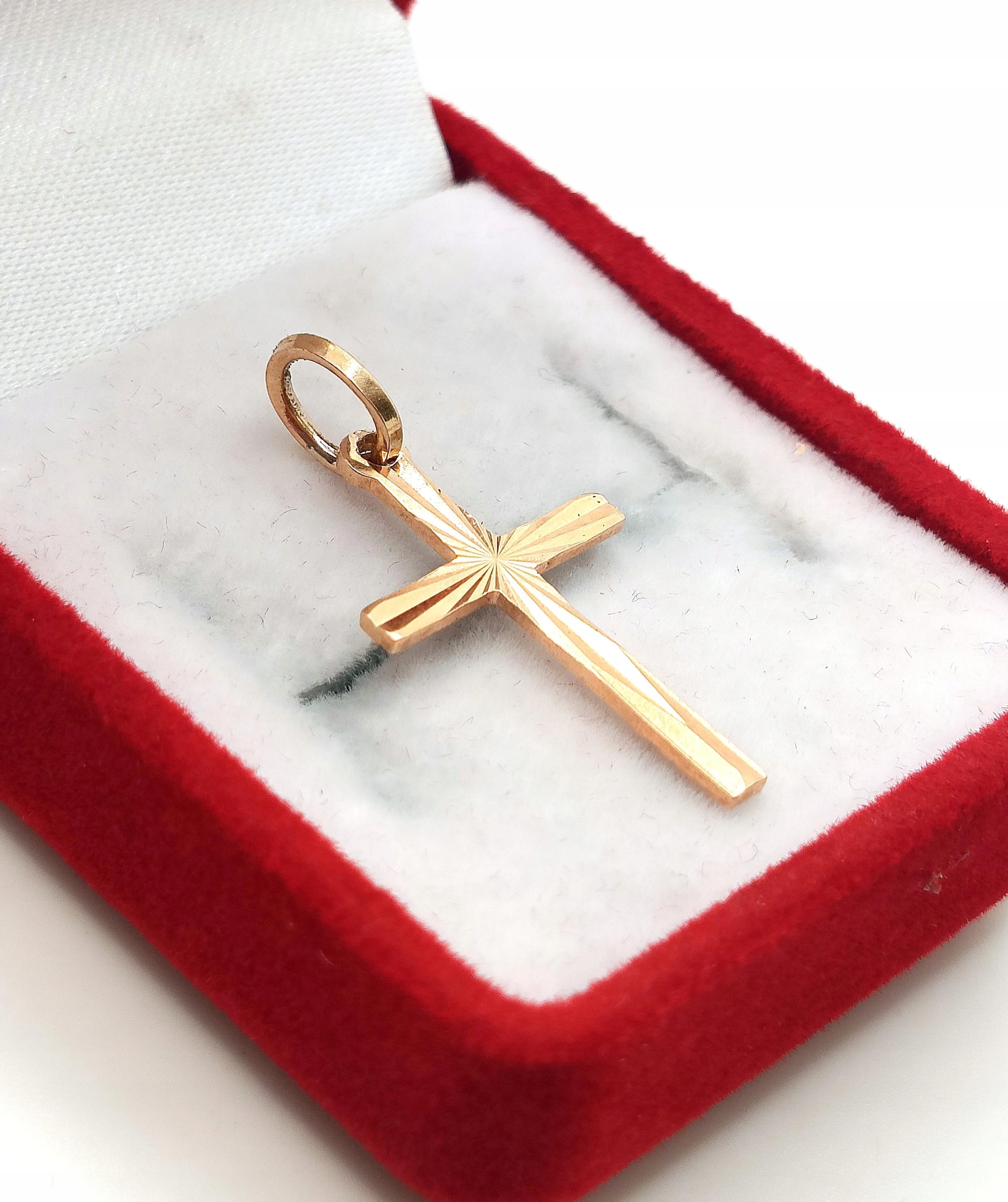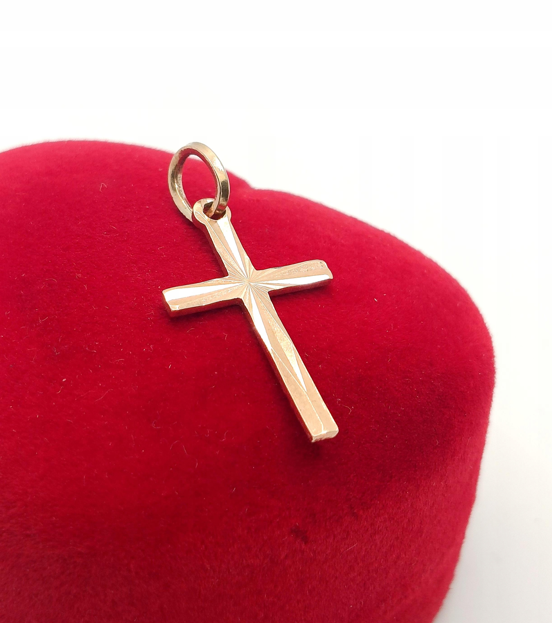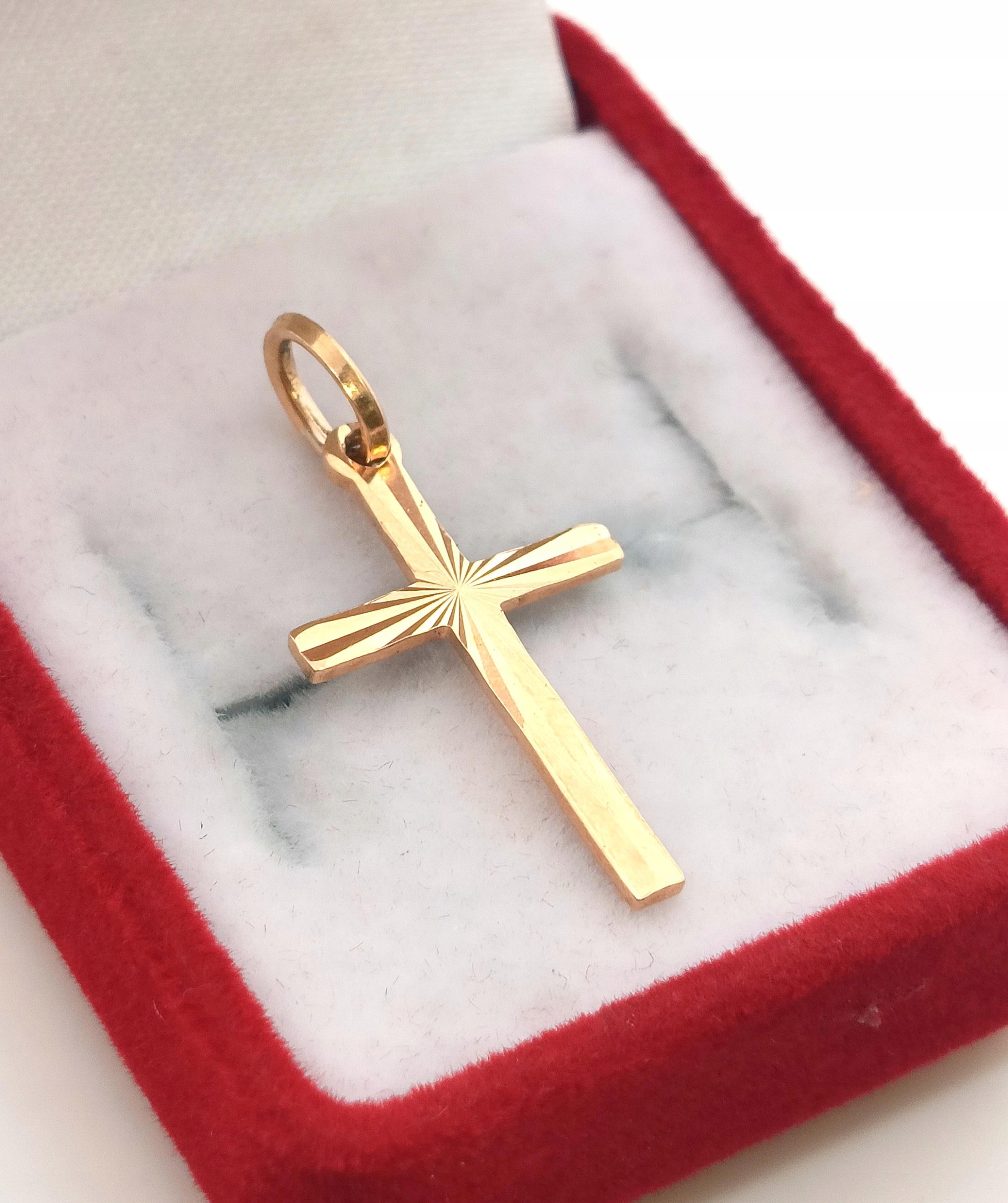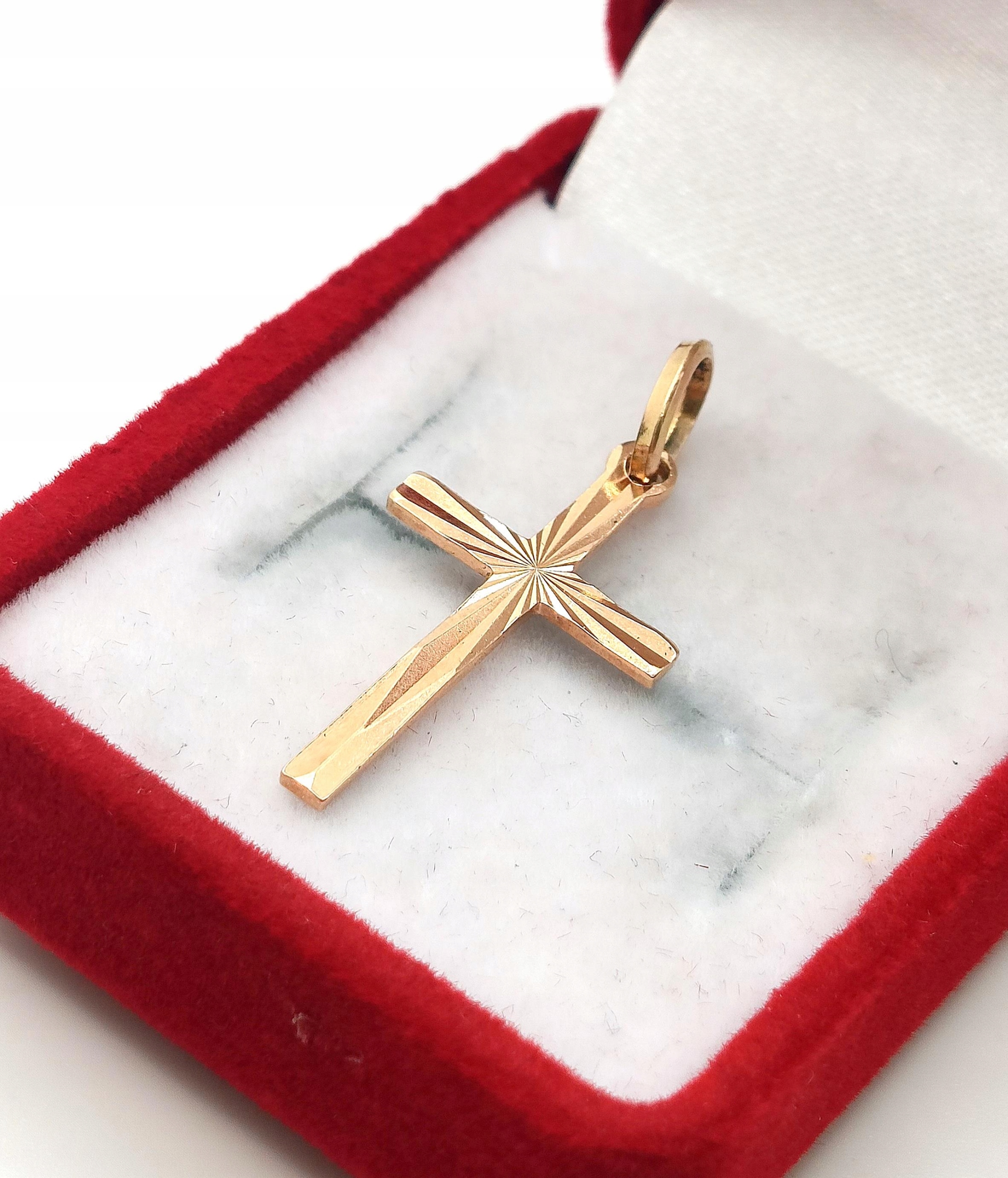 W ofercie na sprzedaż mamy dla Państwa złoty krzyżyk ze zdobieniem w formie żłobień, które pięknie odbijają światło.