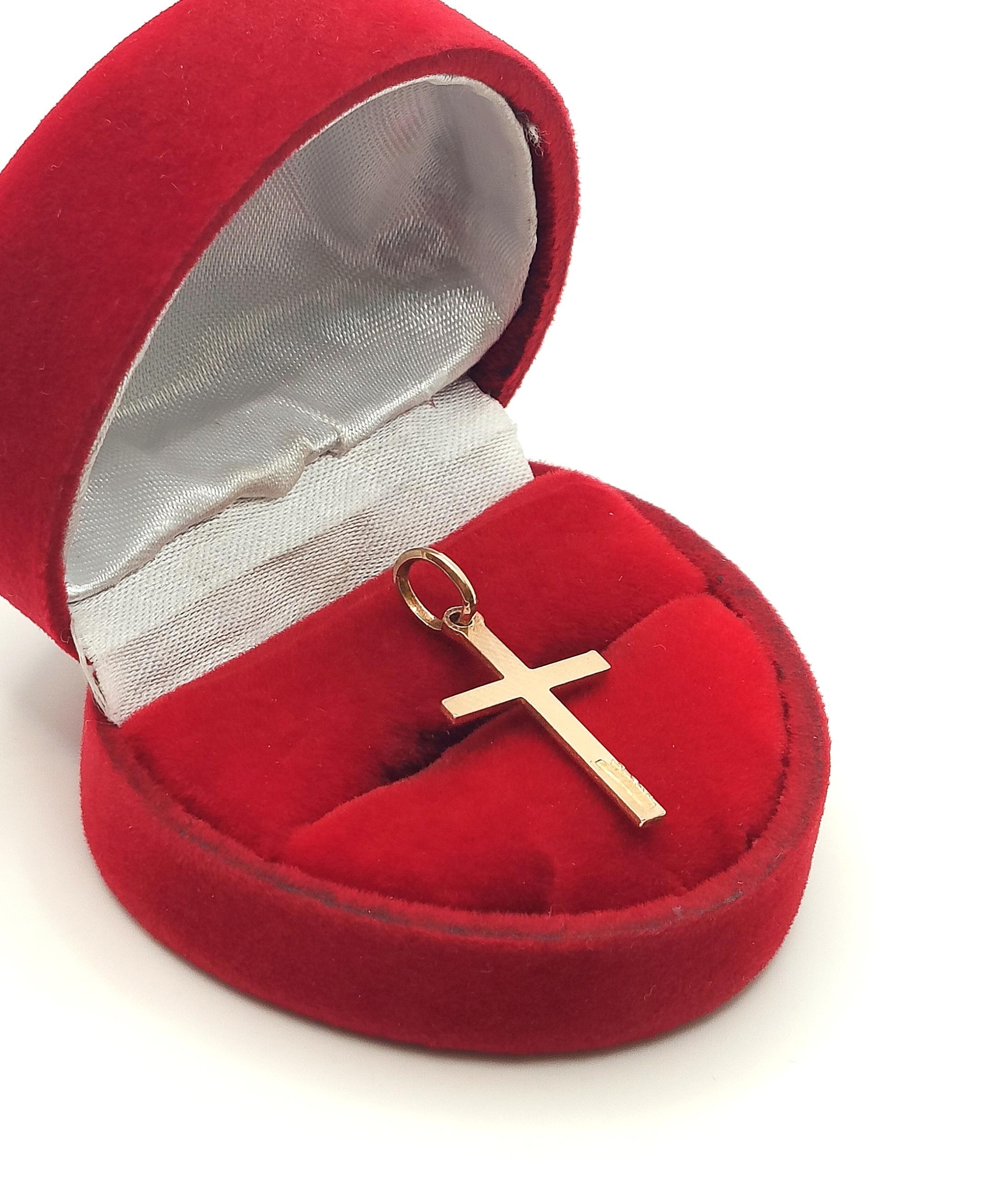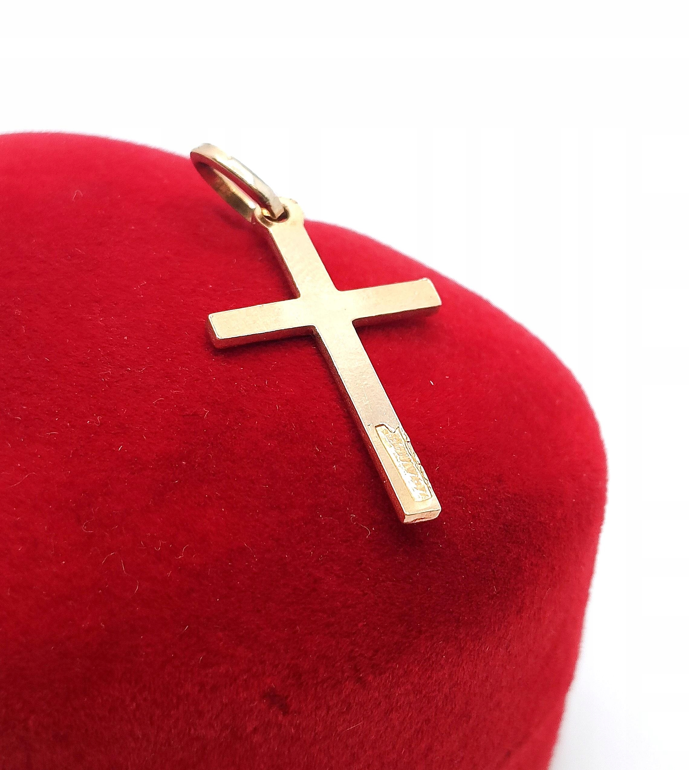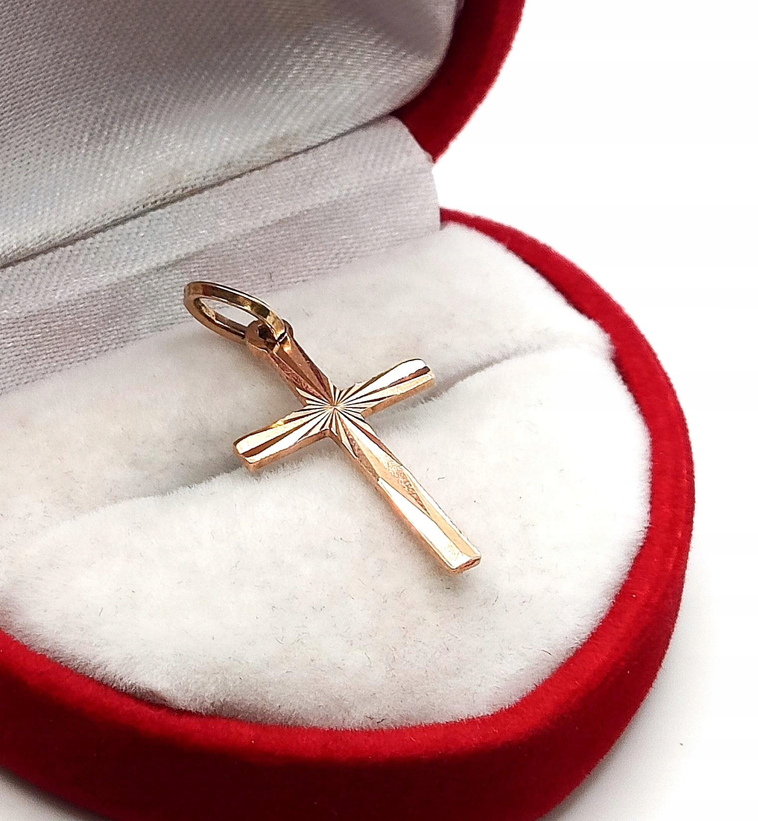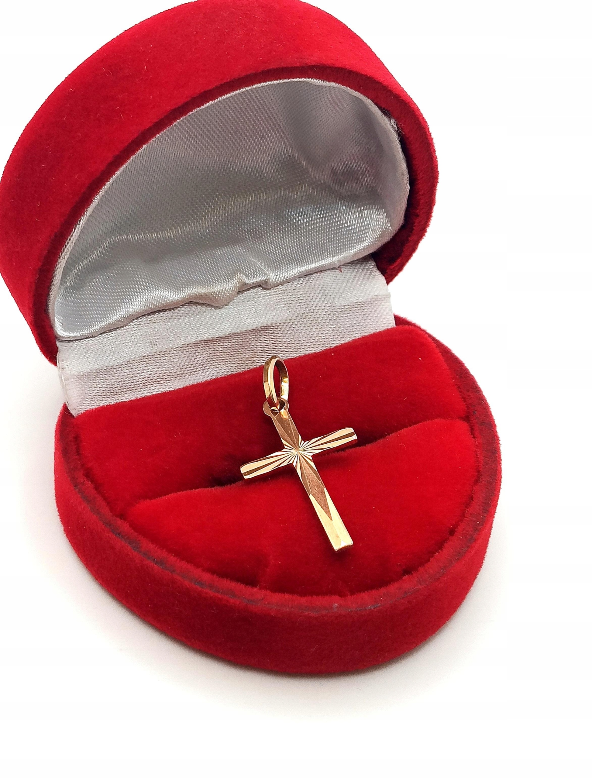 W ofercie na sprzedaż mamy dla Państwa złoty krzyżyk ze zdobieniem w formie żłobień, które pięknie odbijają światło.