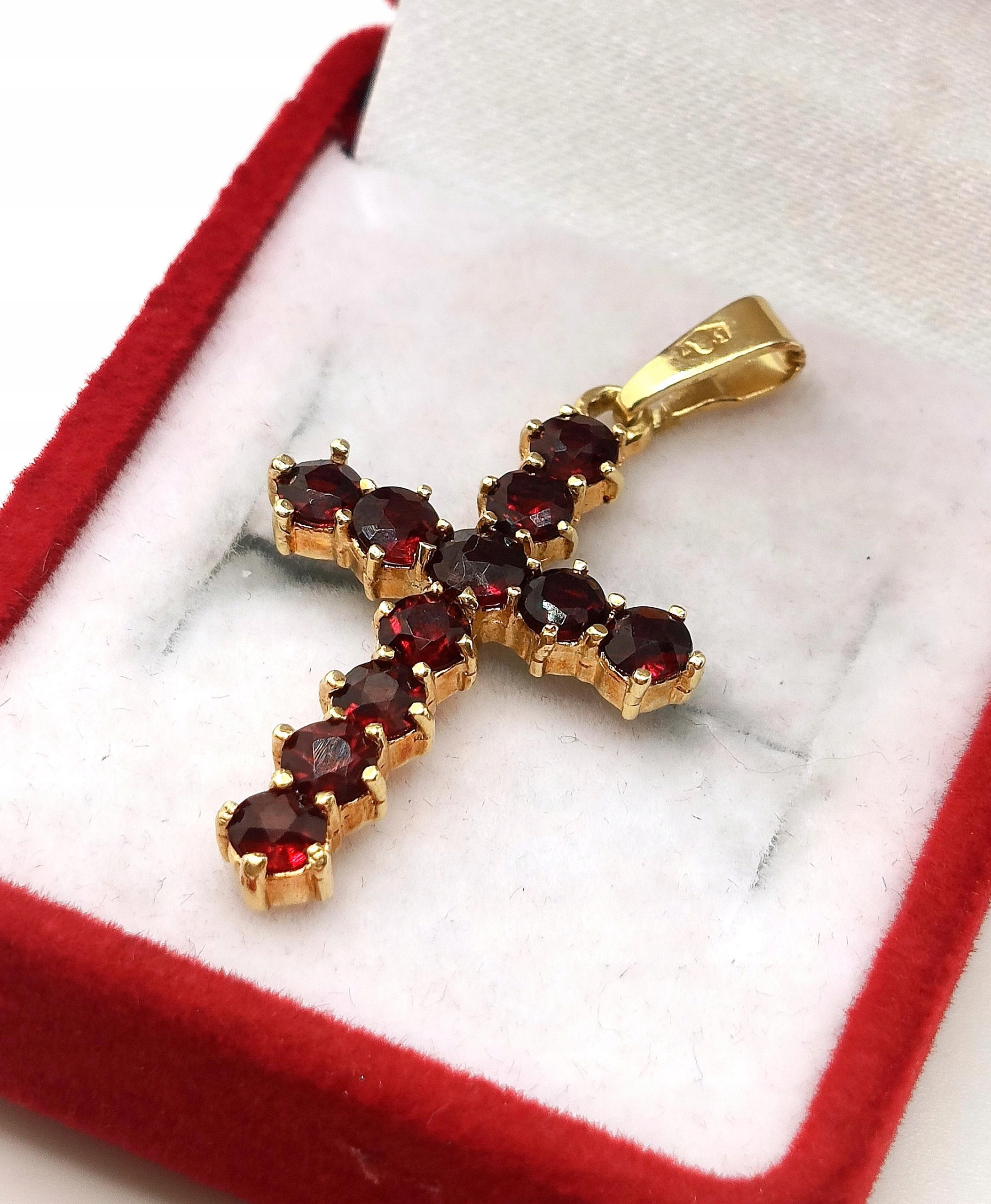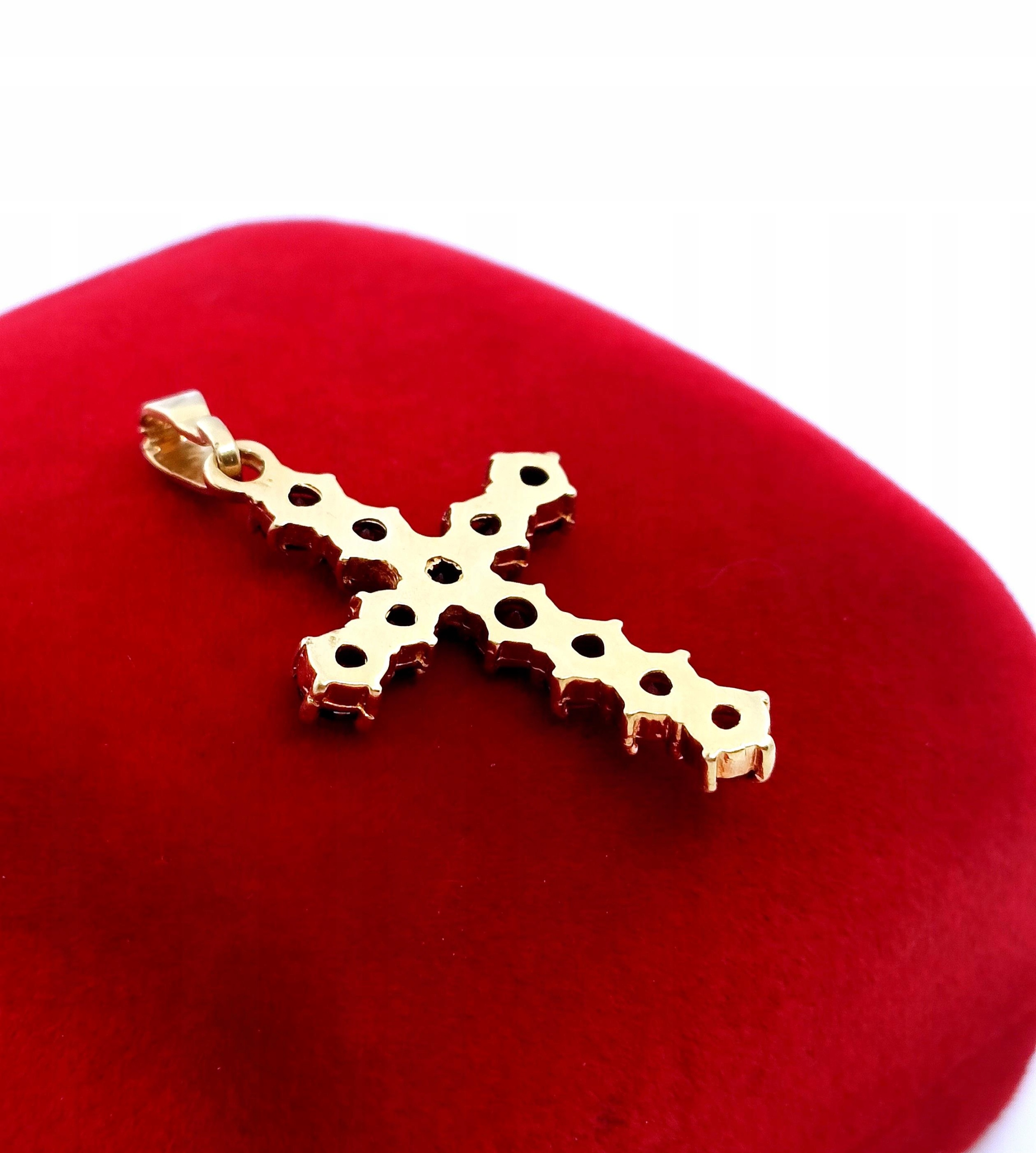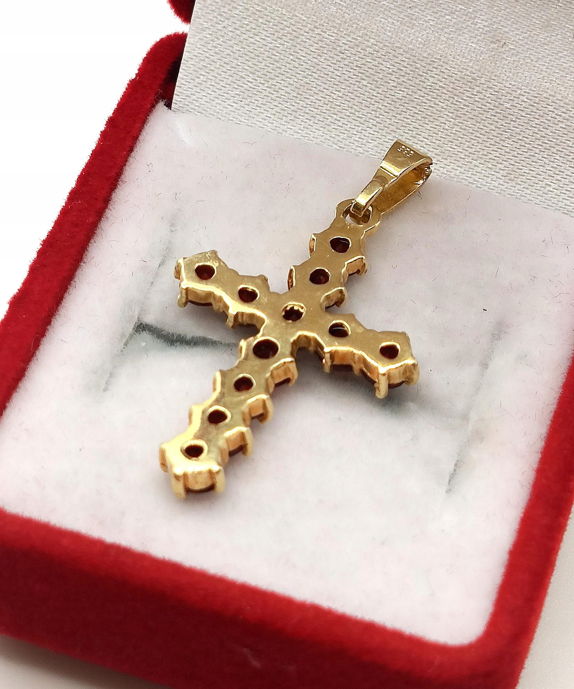 Oferujemy na sprzedaż piękny, złoty krzyżyk ozdobiony Granatami