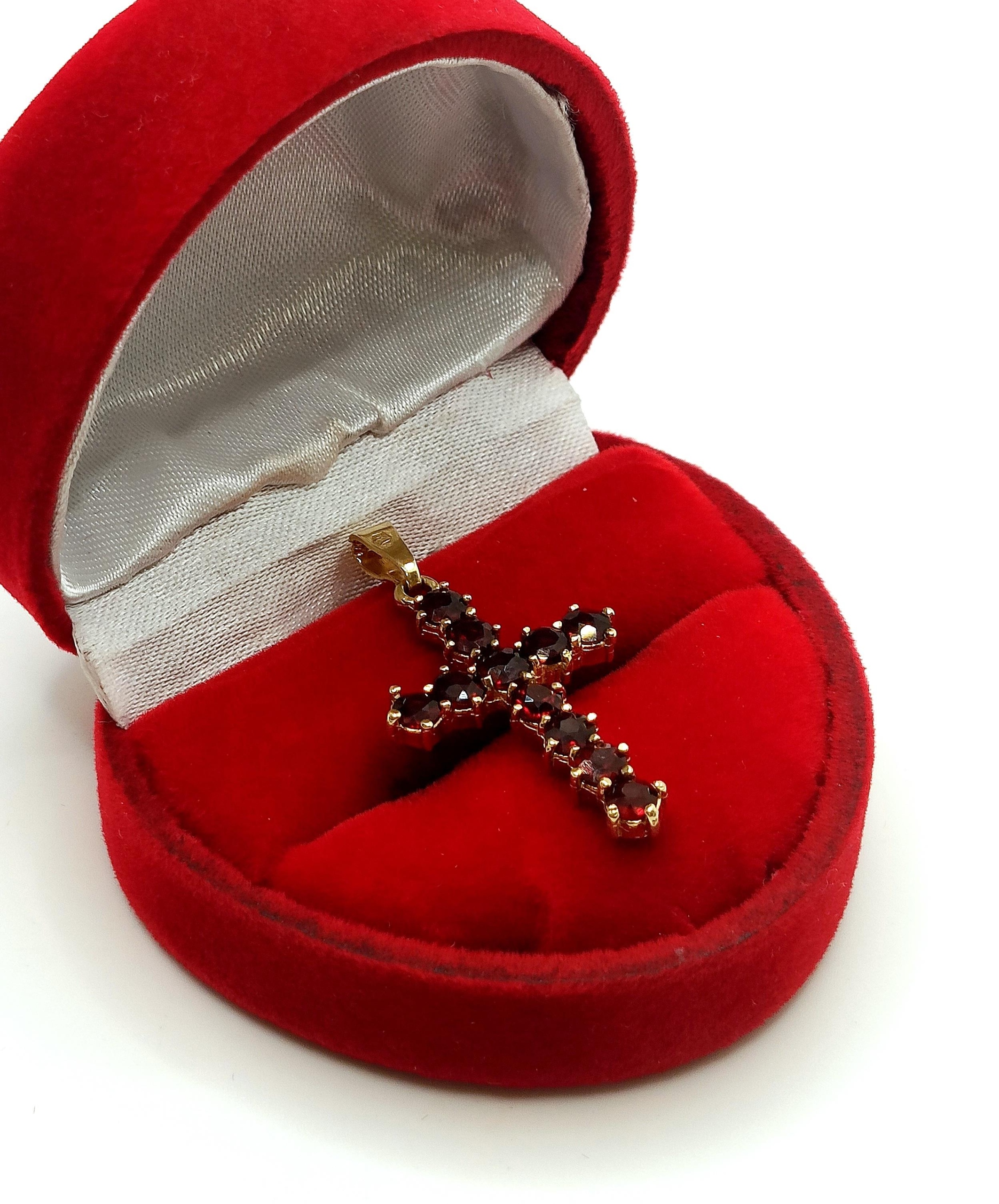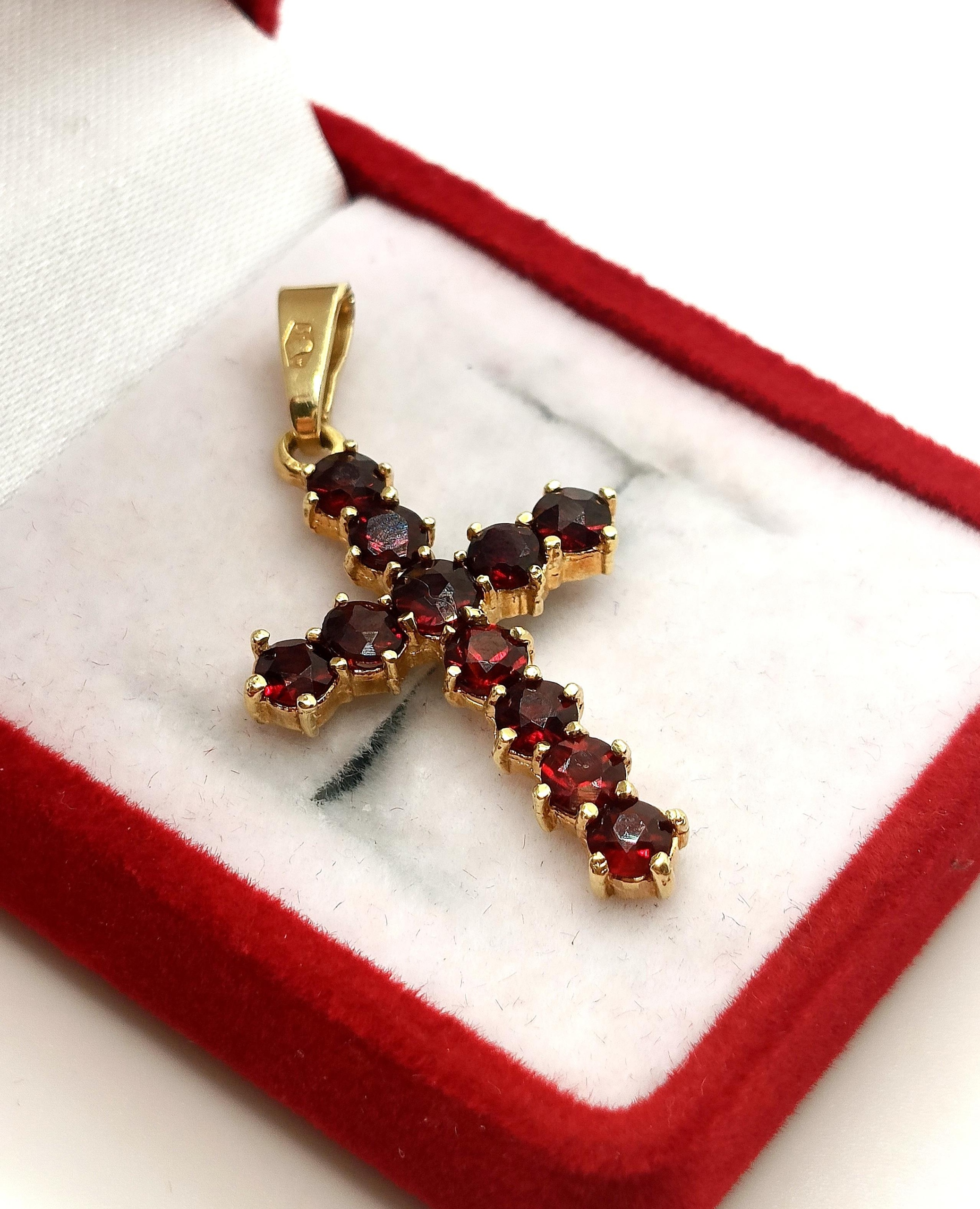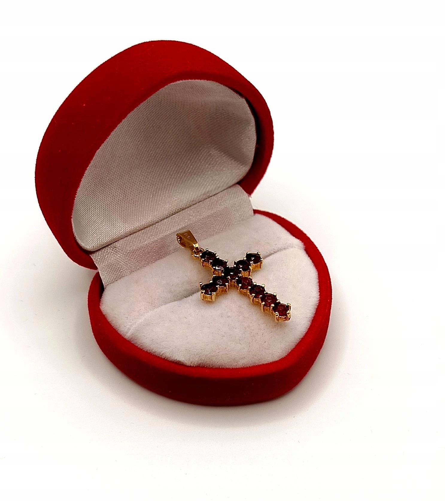 Oferujemy na sprzedaż piękny, złoty krzyżyk ozdobiony Granatami