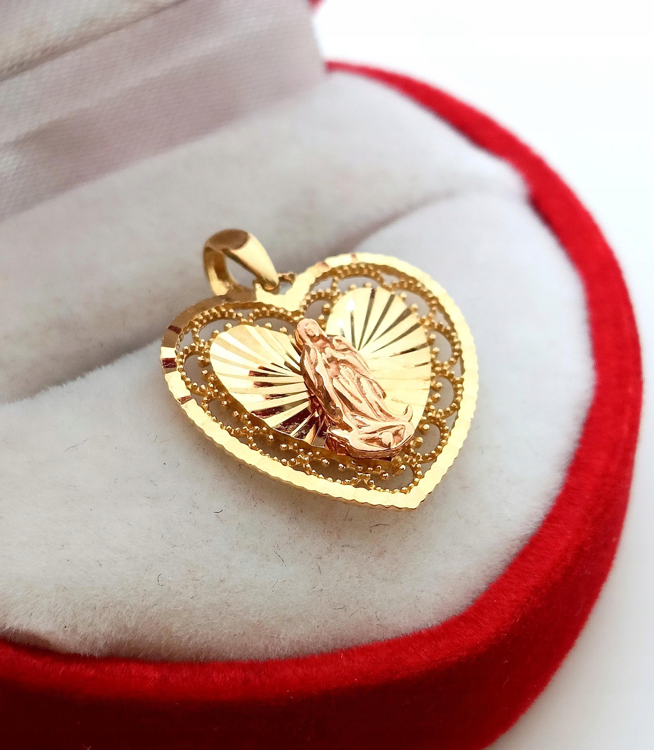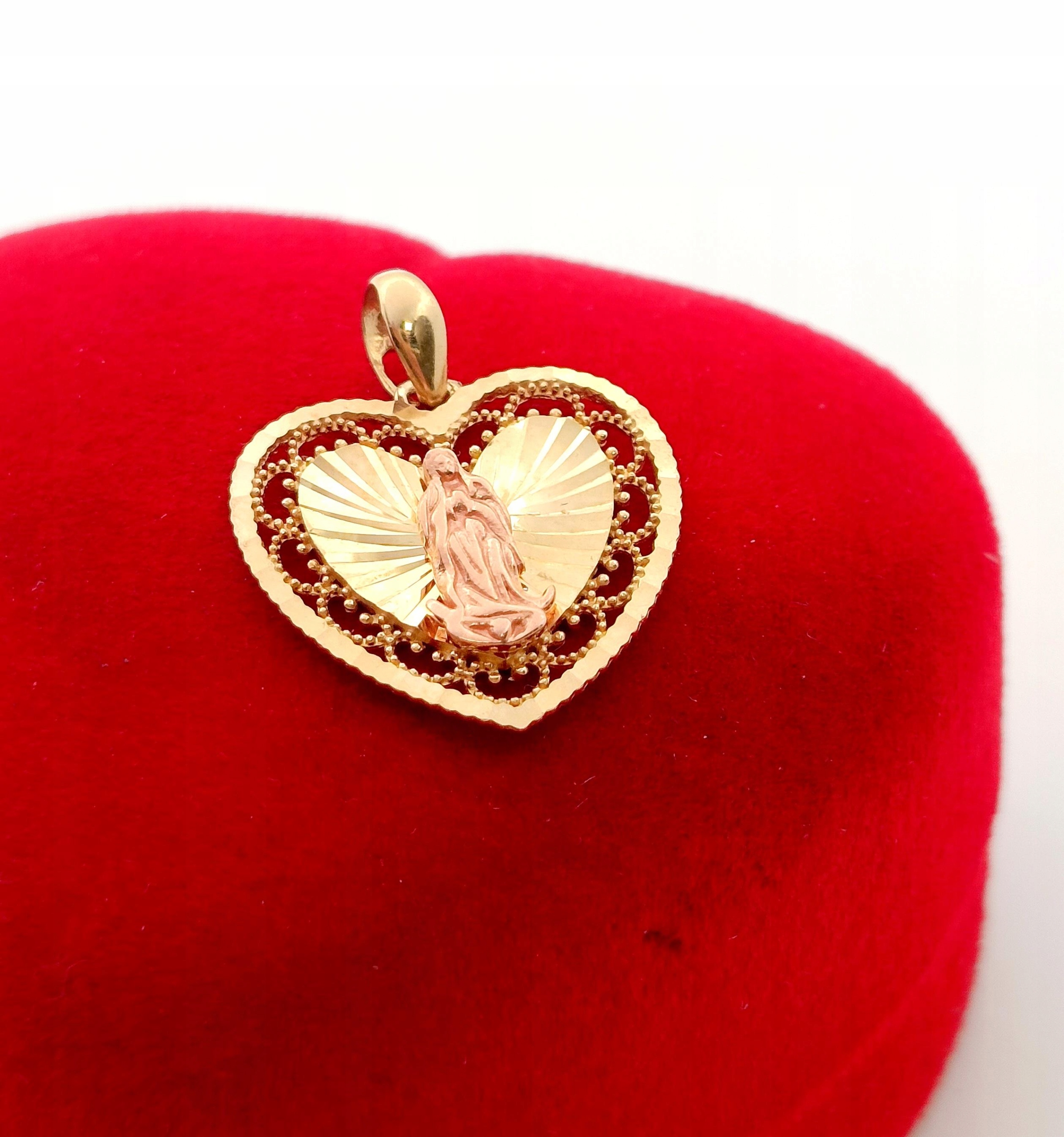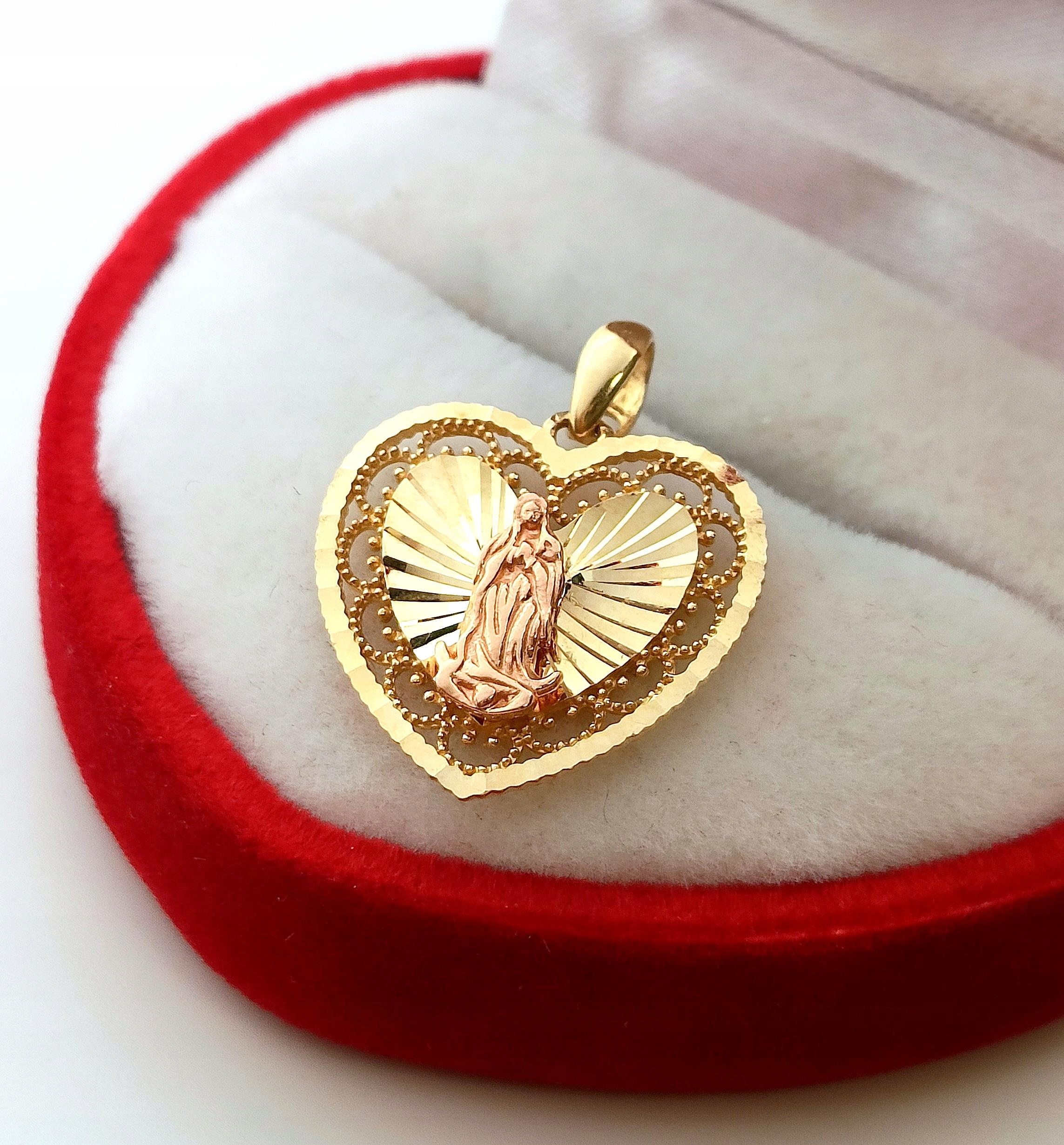 W ofercie na sprzedaż mamy dla Państwa złotą zawieszkę w formie serca z wizerunkiem Matki Boskiej.