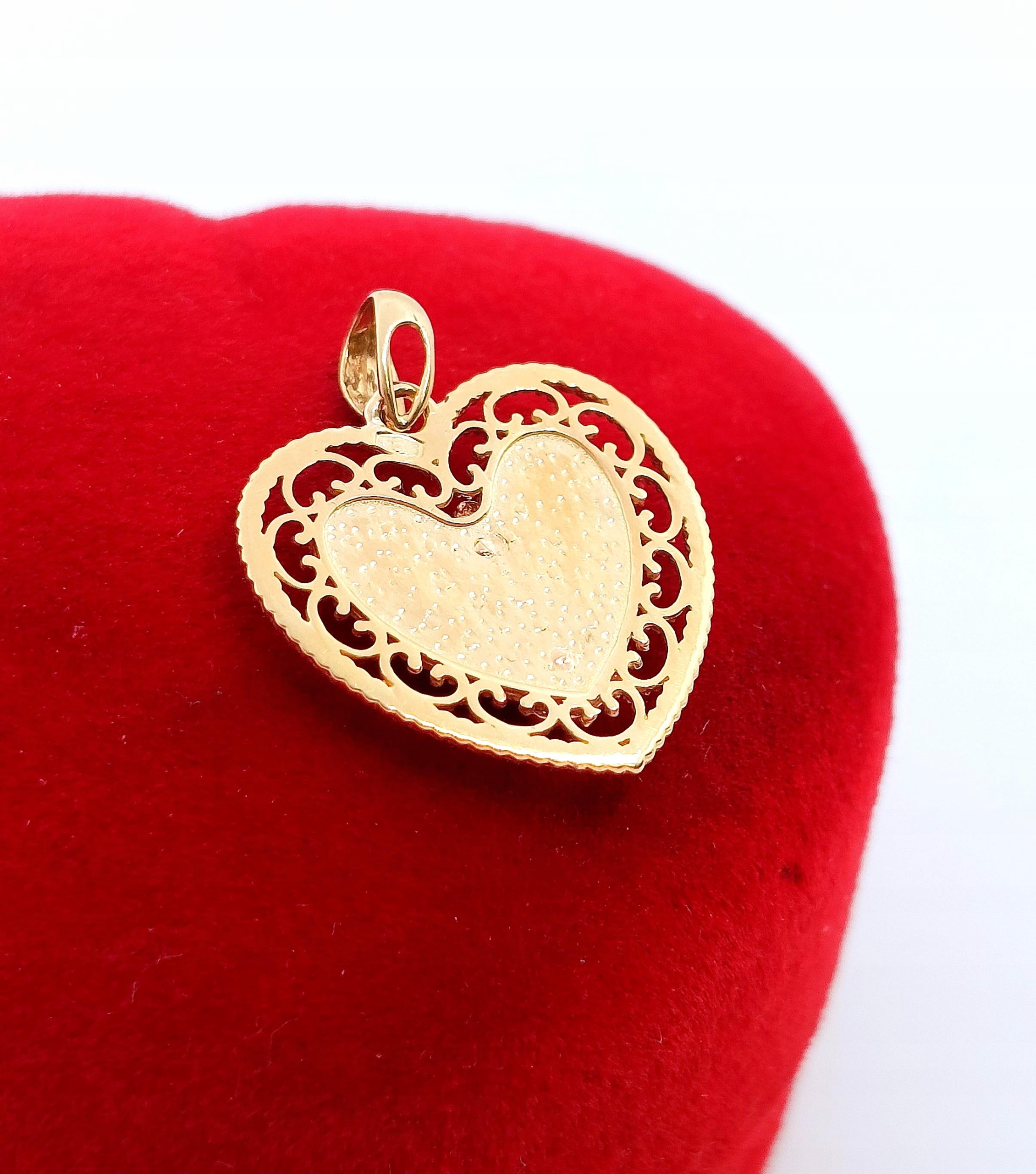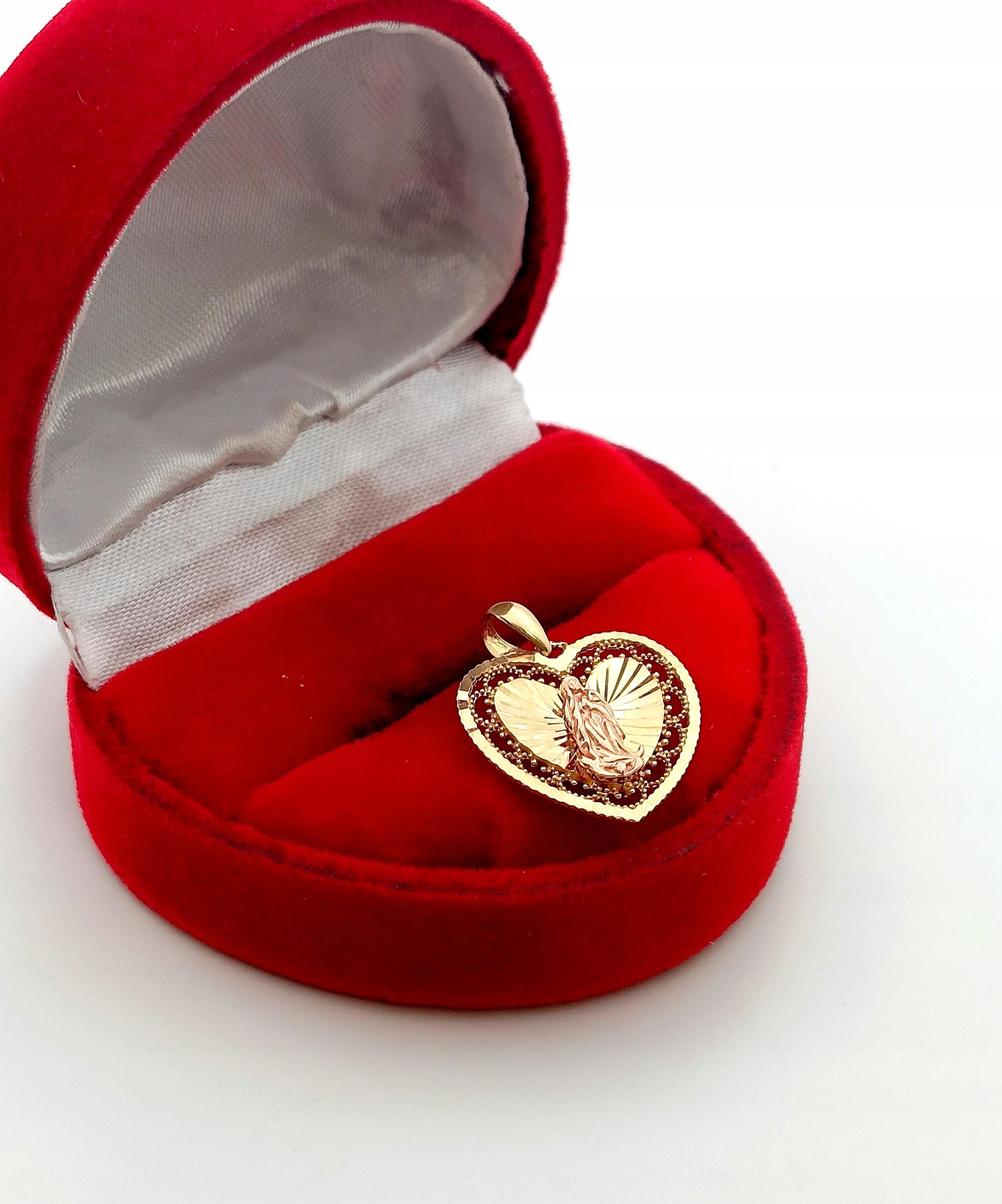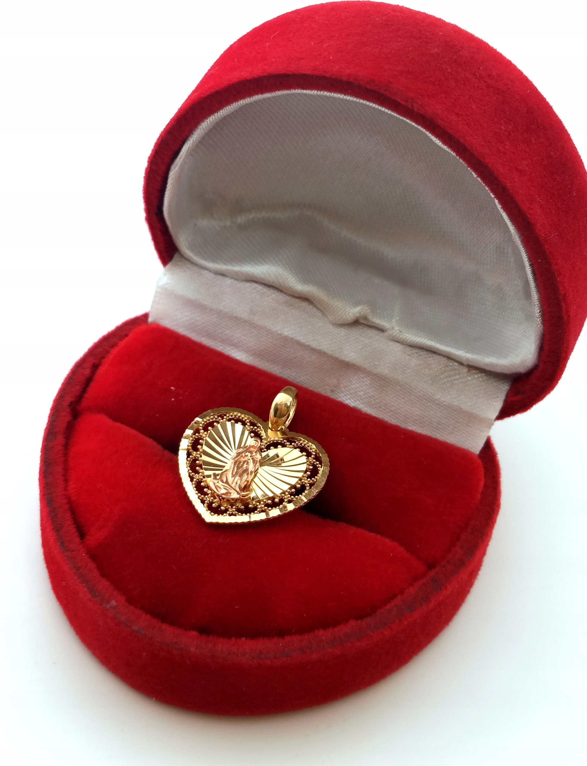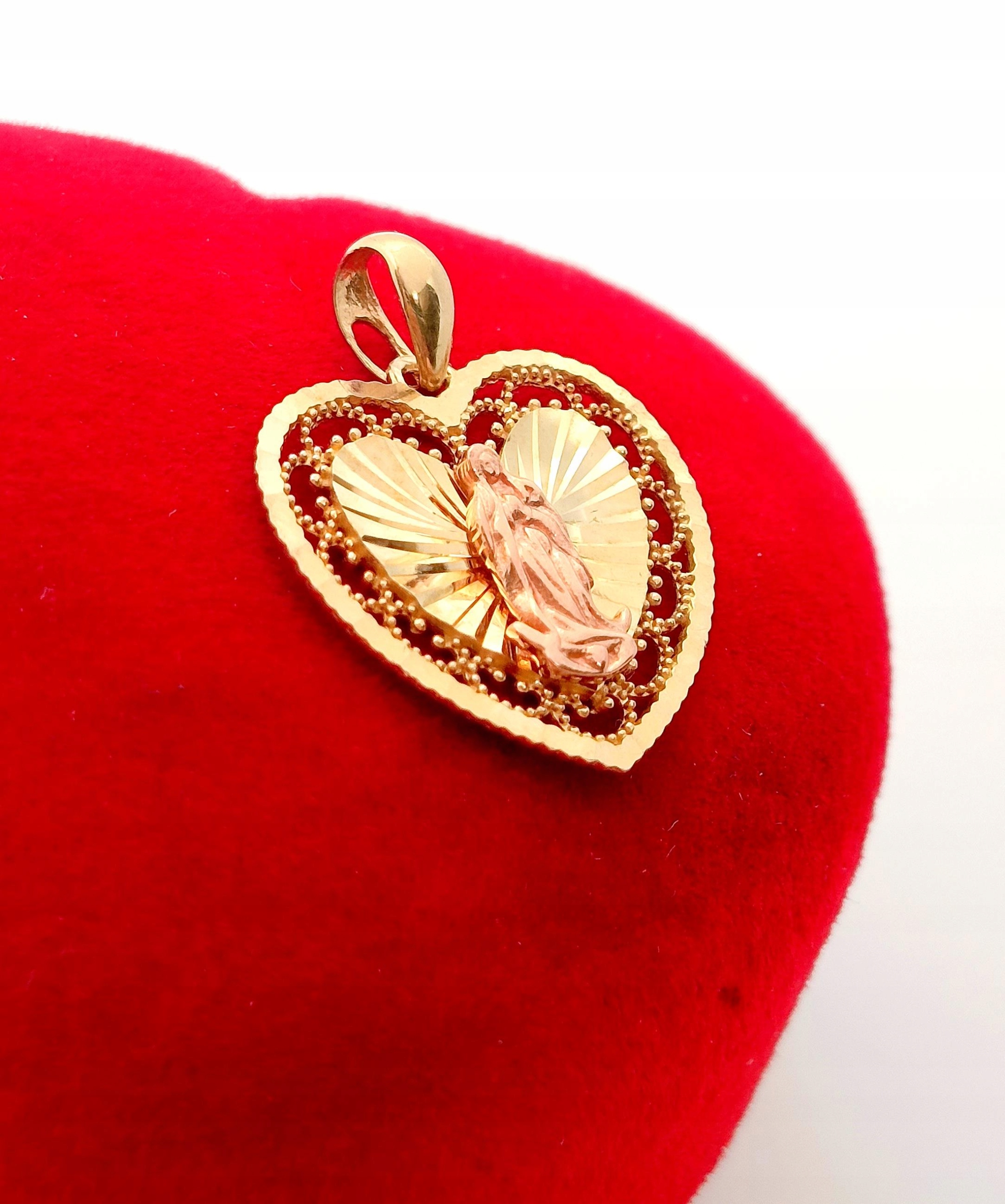 W ofercie na sprzedaż mamy dla Państwa złotą zawieszkę w formie serca z wizerunkiem Matki Boskiej.