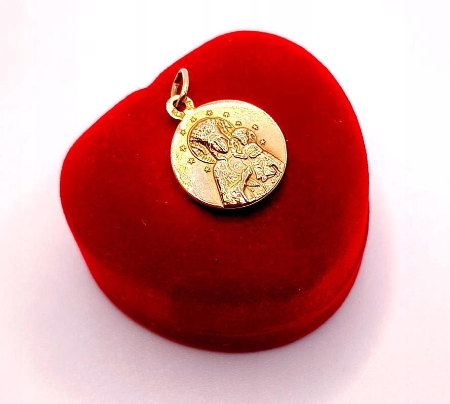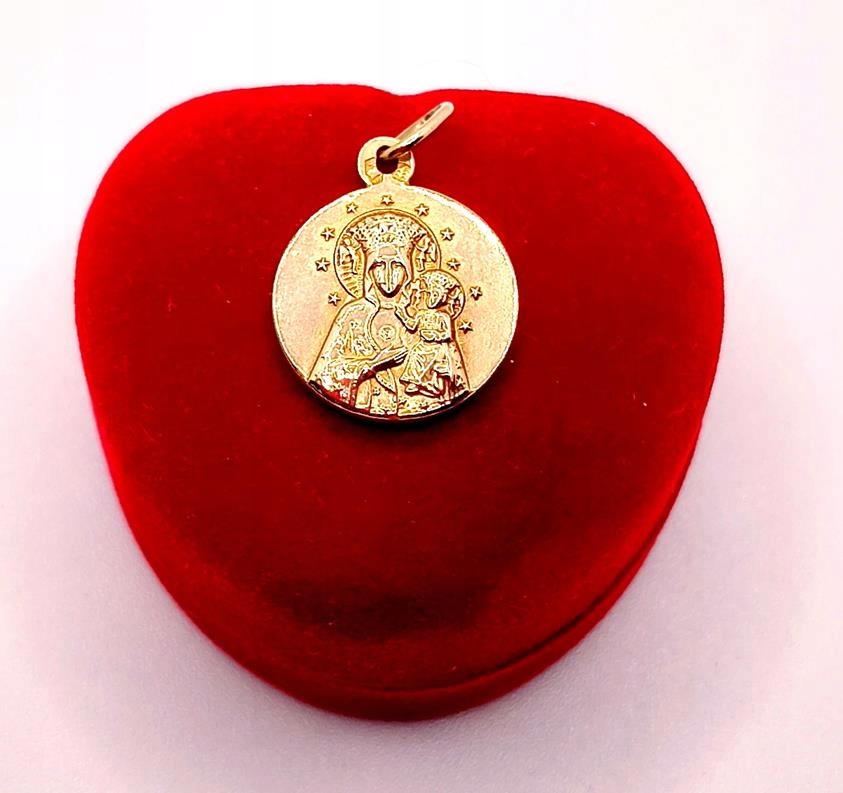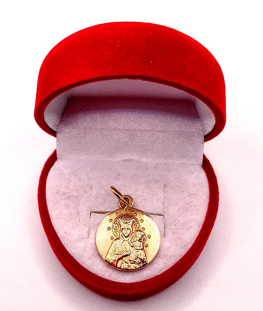 W ofercie sprzedaży posiadamy złotą zawieszkę, medalik z wizerunkiem Matki Boskiej Częstochowskiej, firmy Warmet.