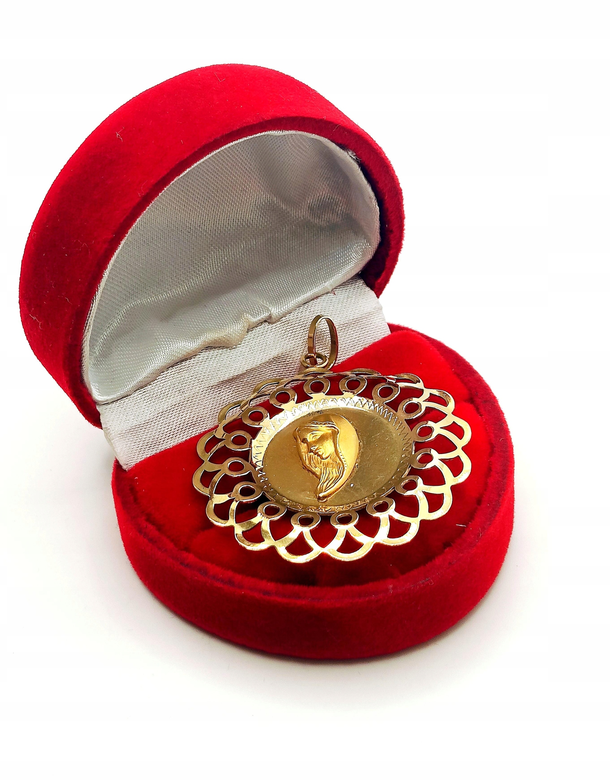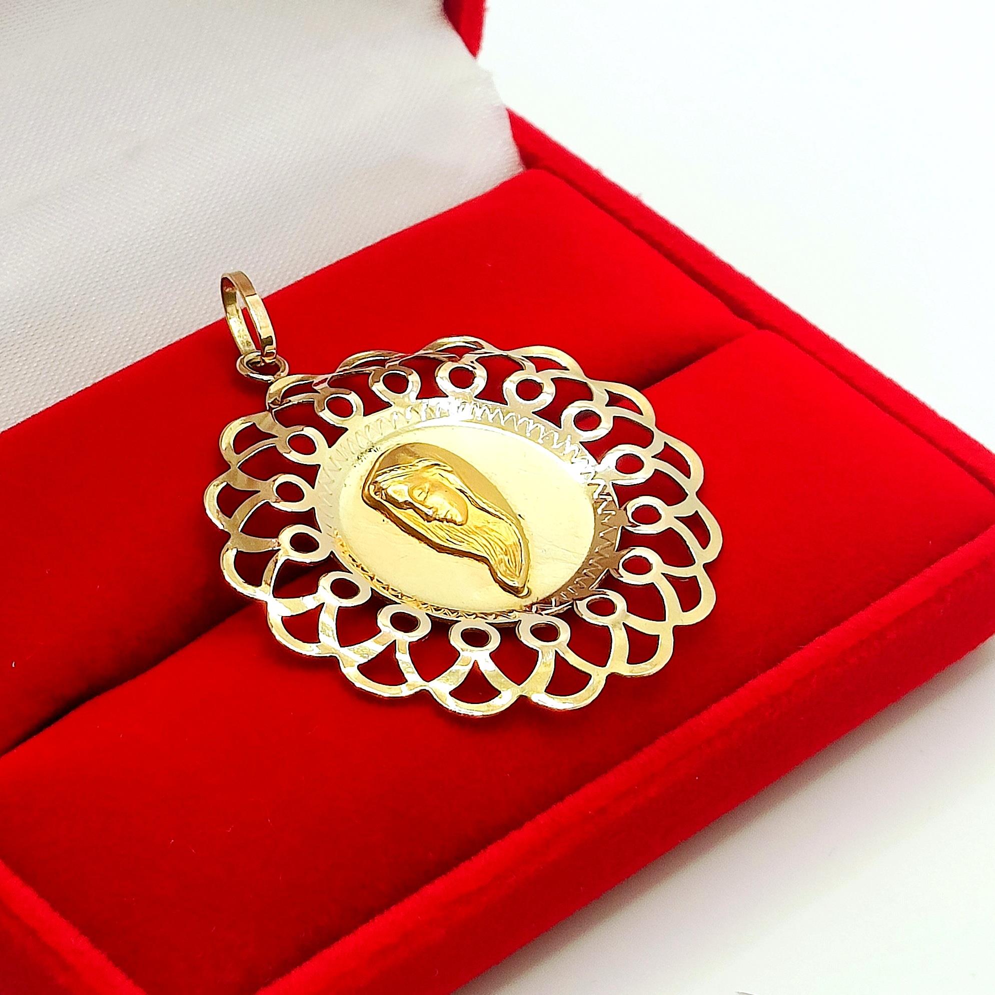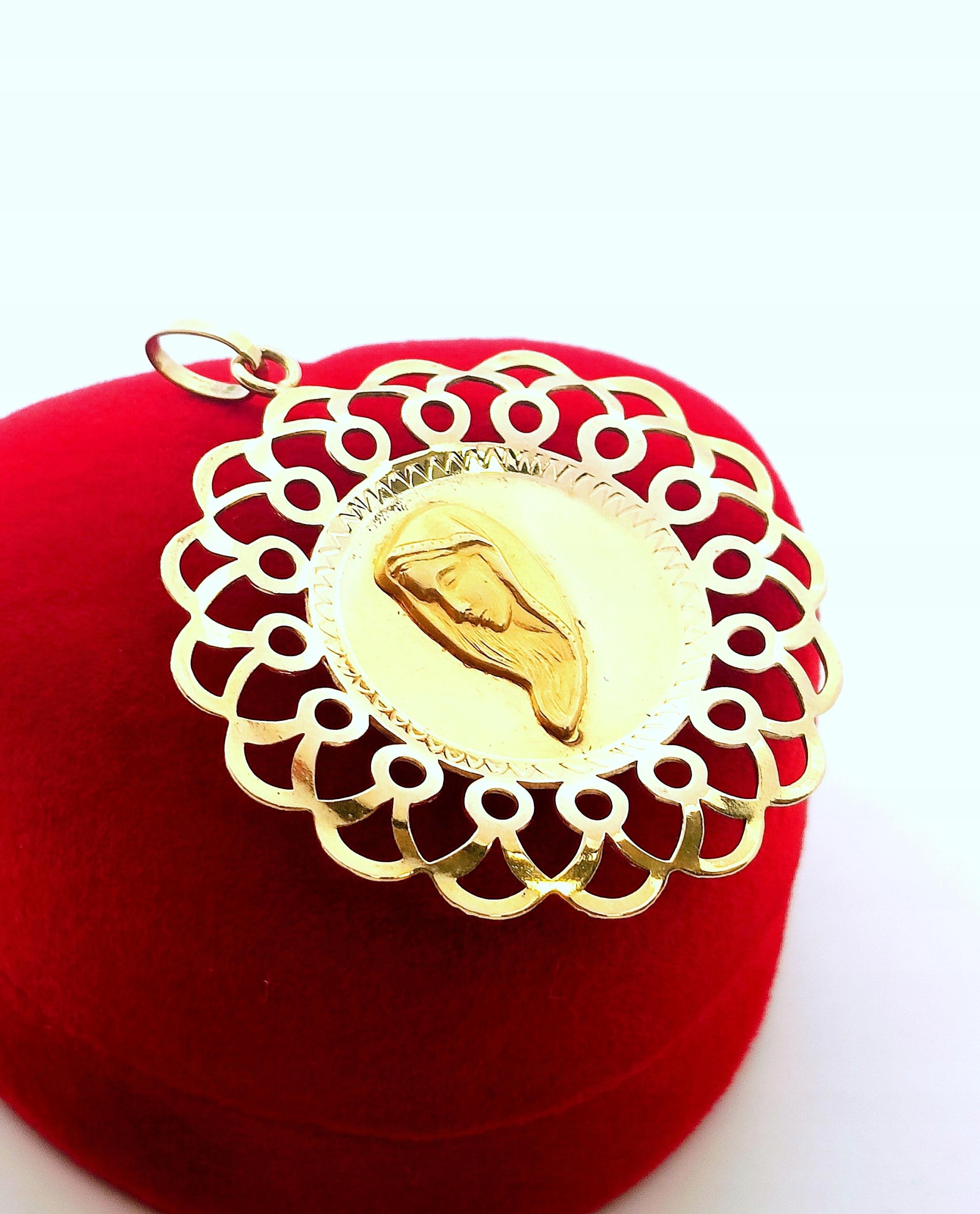 W ofercie na sprzedaż mamy dla Państwa dużą, okrągłą zawieszkę z wizerunkiem Matki Boskiej. Dookoła ażurowe zdobienie.