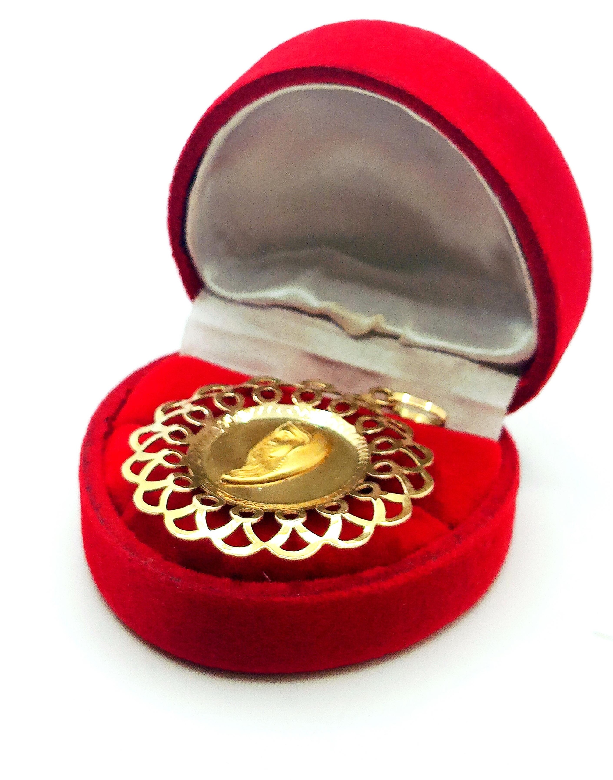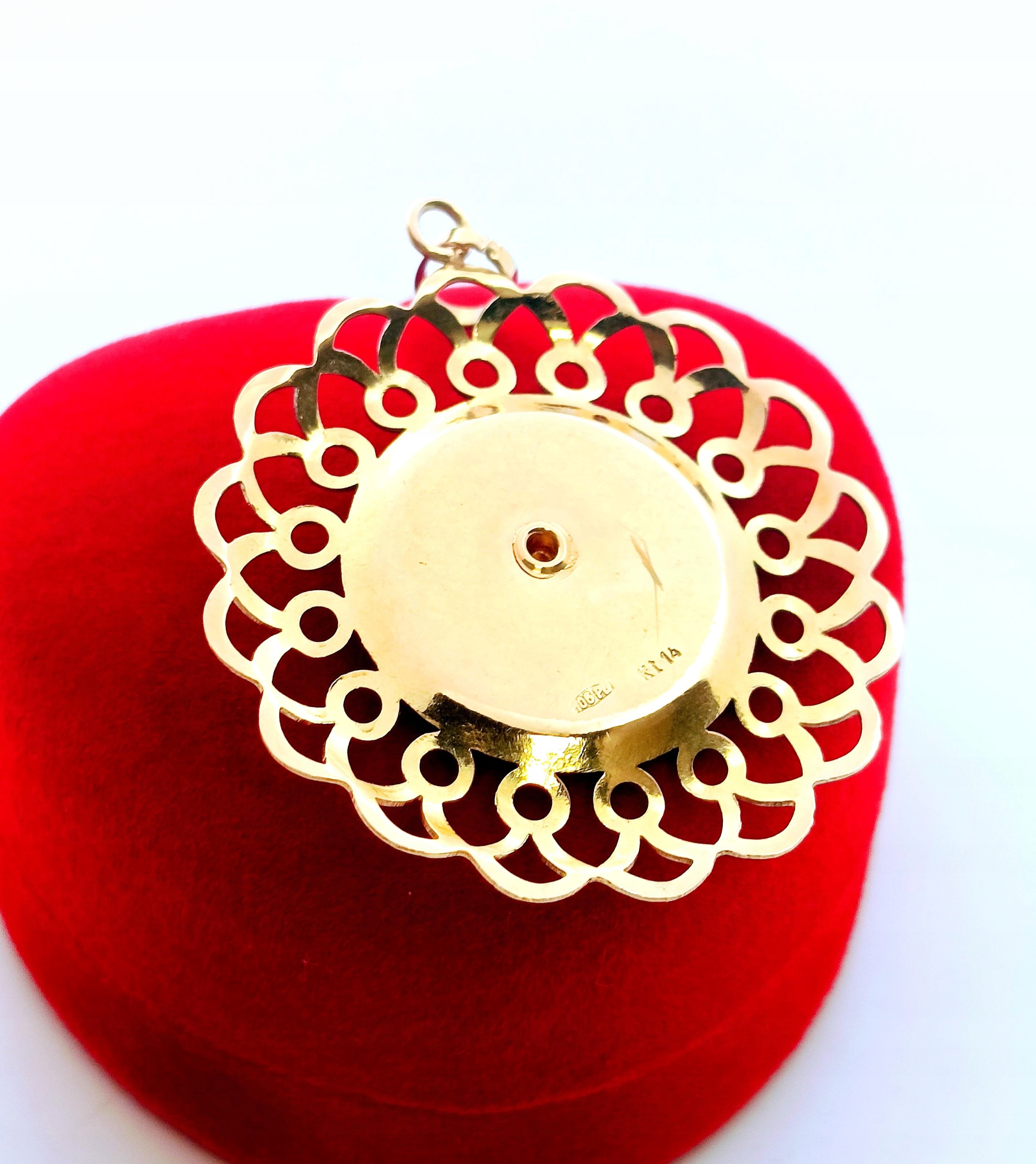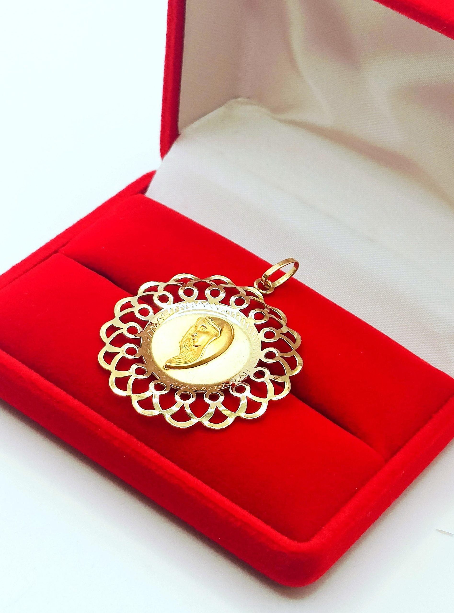 W ofercie na sprzedaż mamy dla Państwa dużą, okrągłą zawieszkę z wizerunkiem Matki Boskiej. Dookoła ażurowe zdobienie.