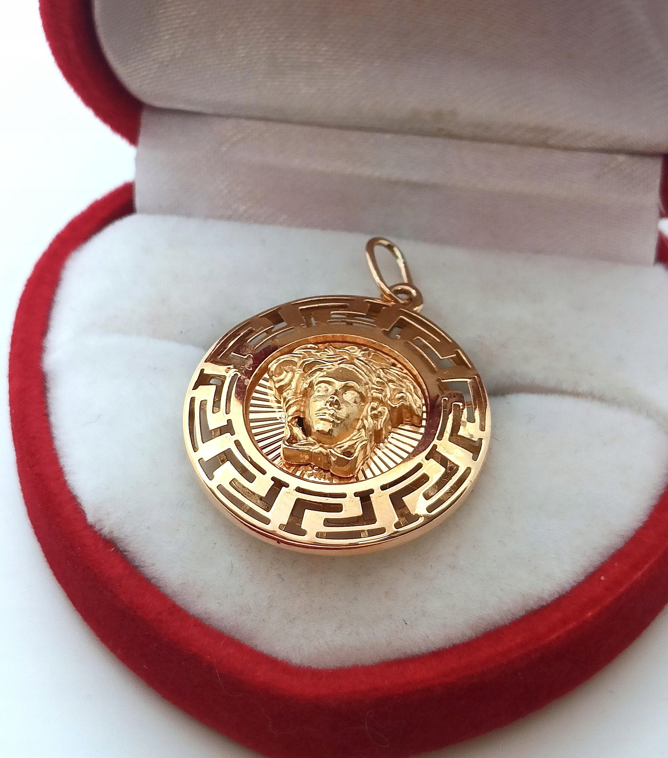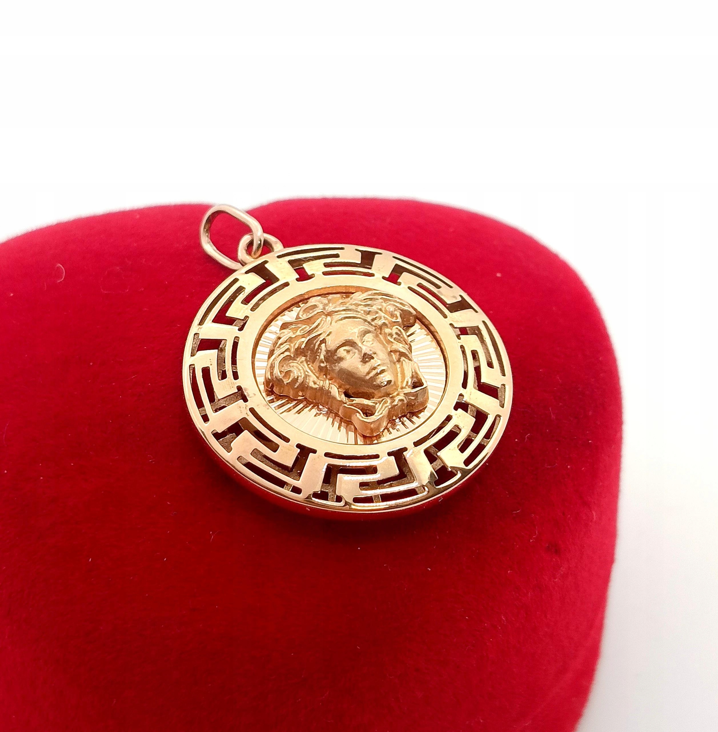 W ofercie na sprzedaż mamy dla Państwa złotą zawieszkę ze znakiem Versace, ozdobioną ażurowym, greckim wzorem.