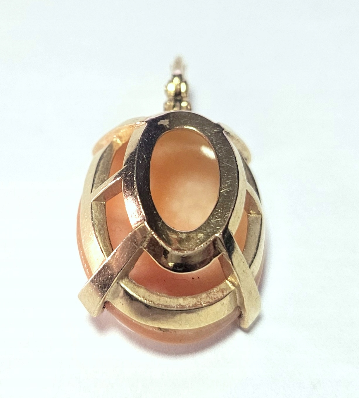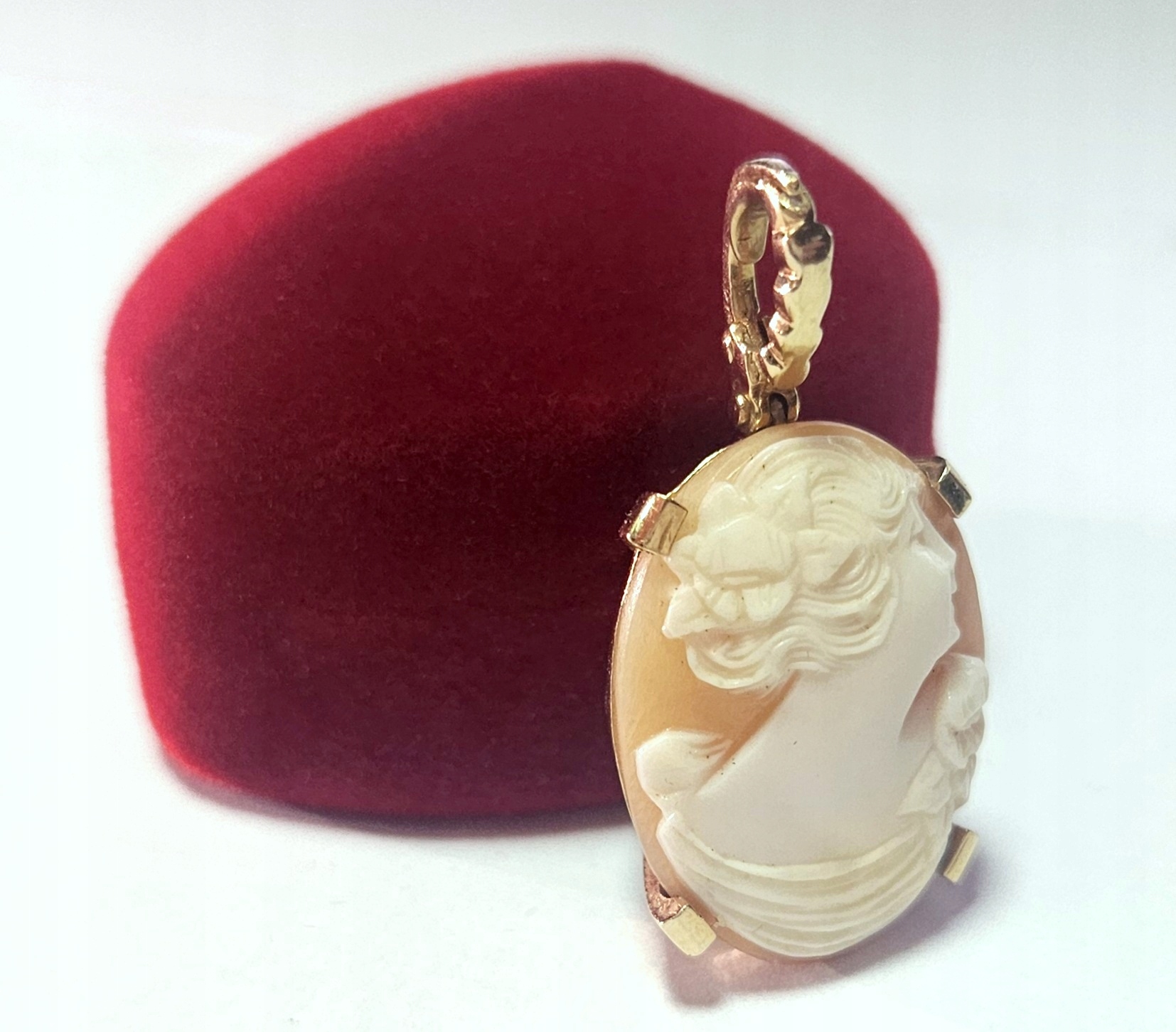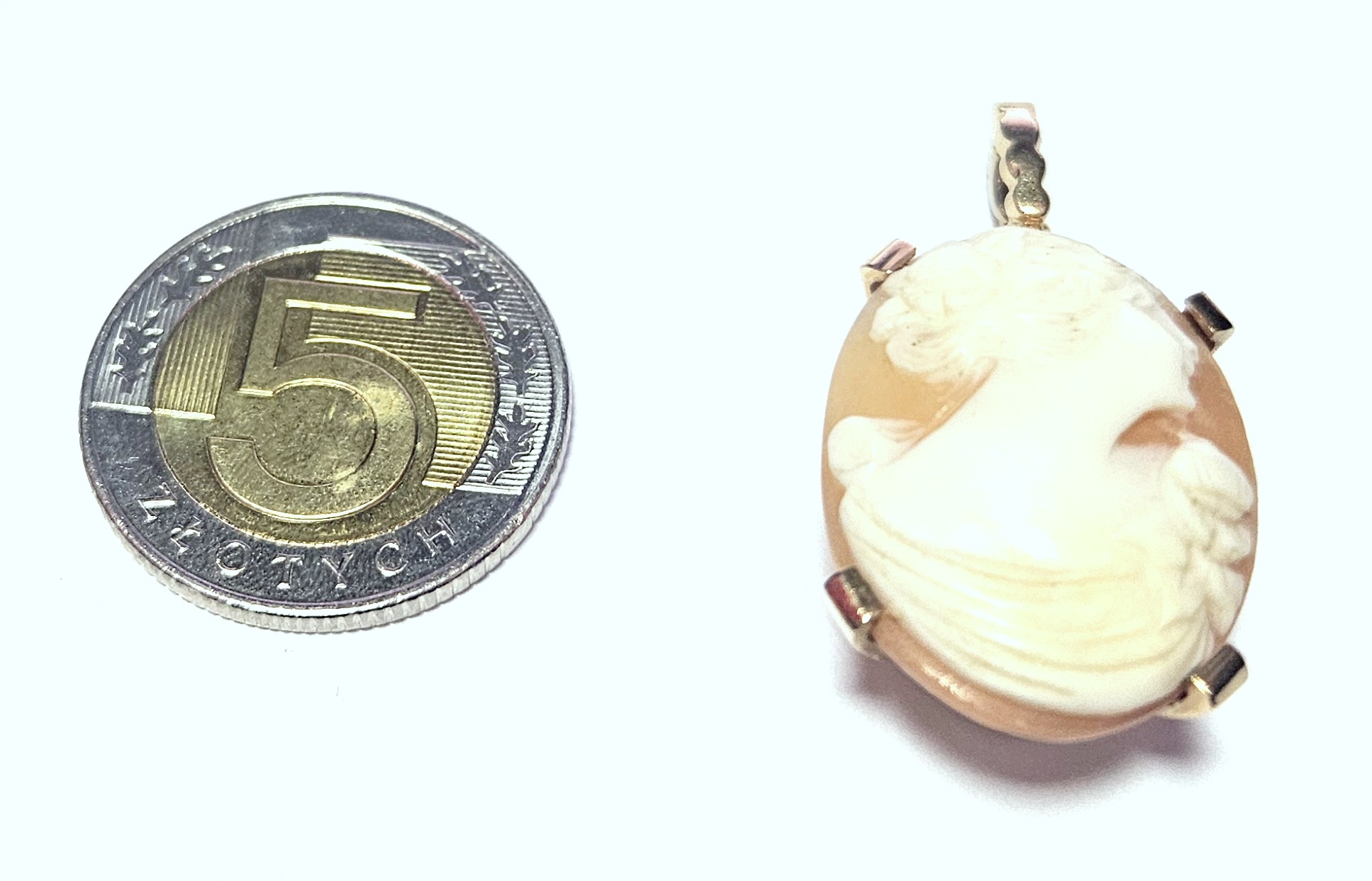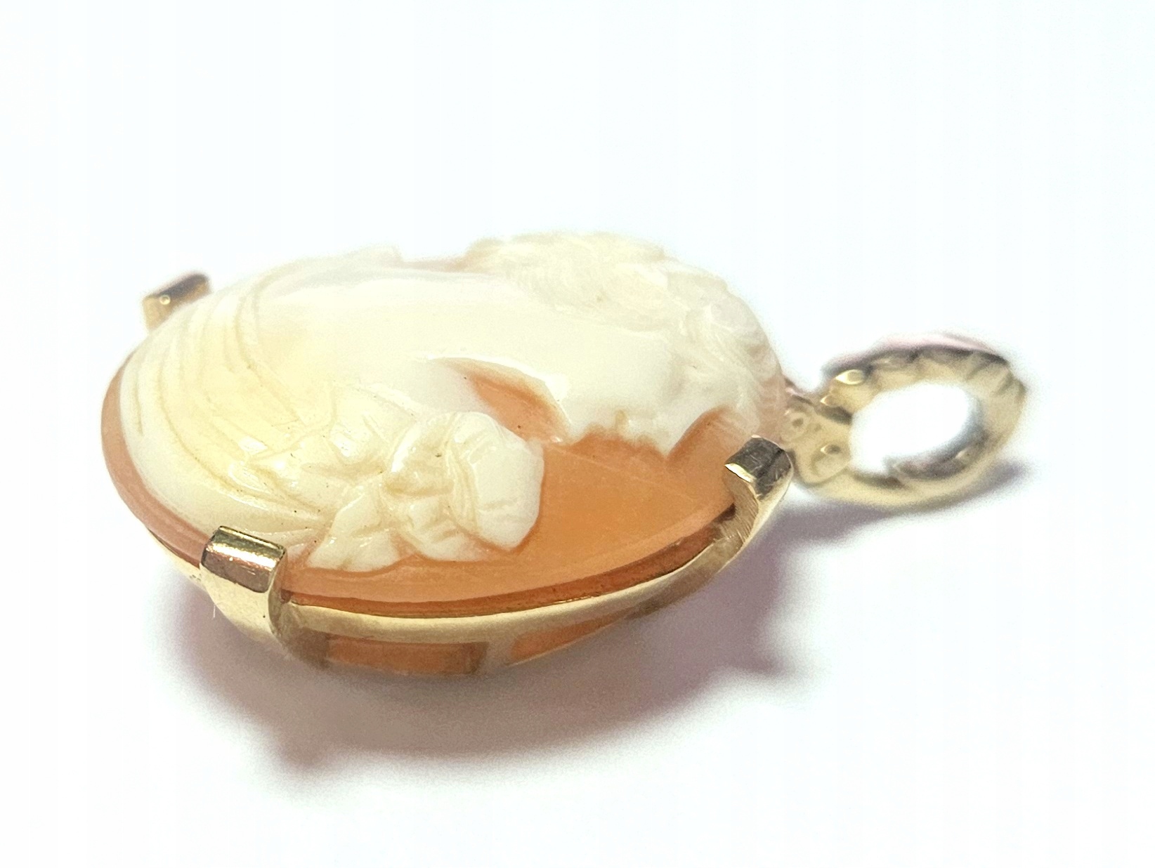 Oferujemy na sprzedaż złotą zawieszkę wykonaną z różowego złota zdobioną okazałą kameą.