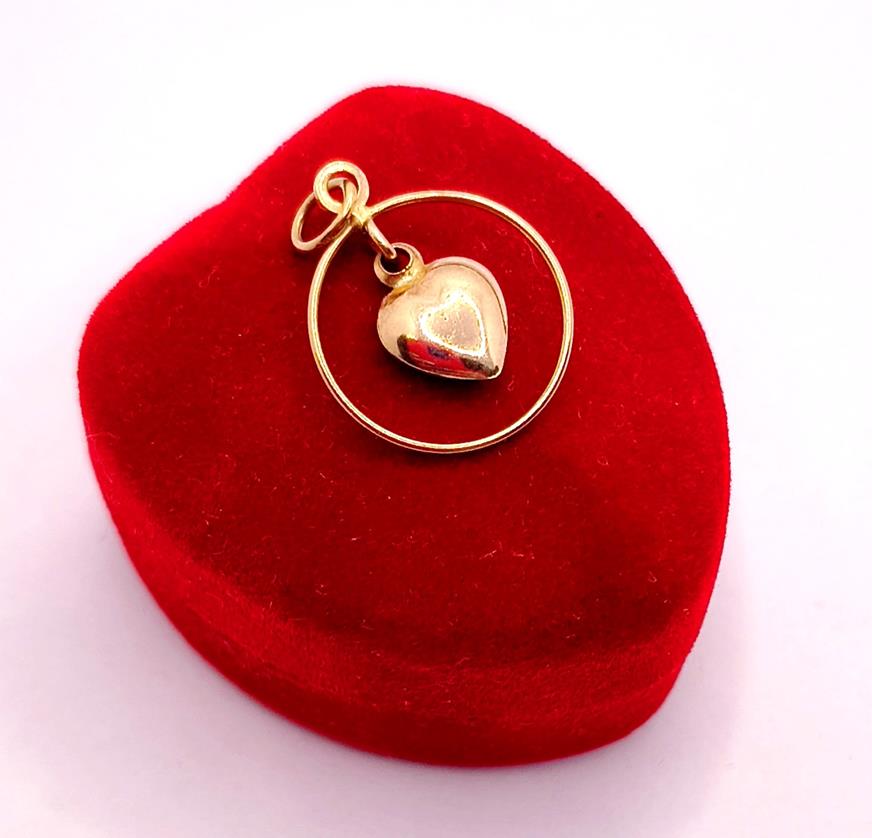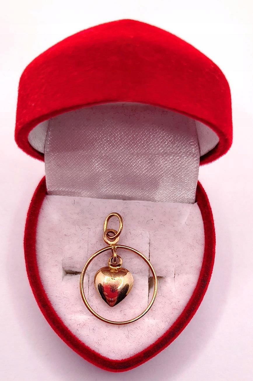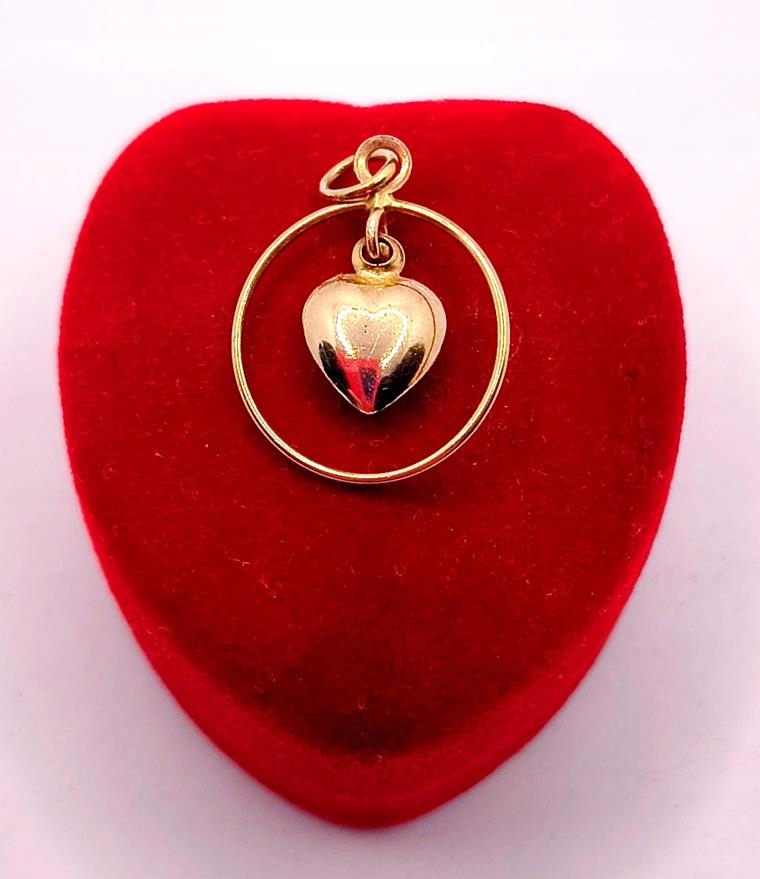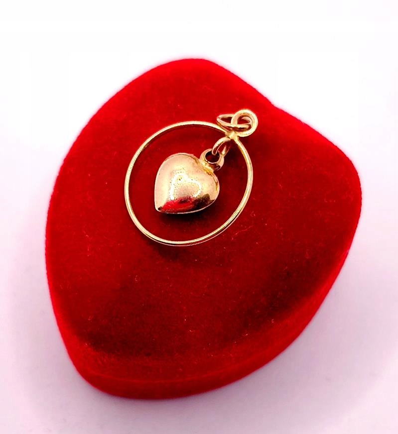 W ofercie sprzedaży posiadamy piękną, złotą zawieszkę ozdobioną sercem zawieszonym w obręczy.