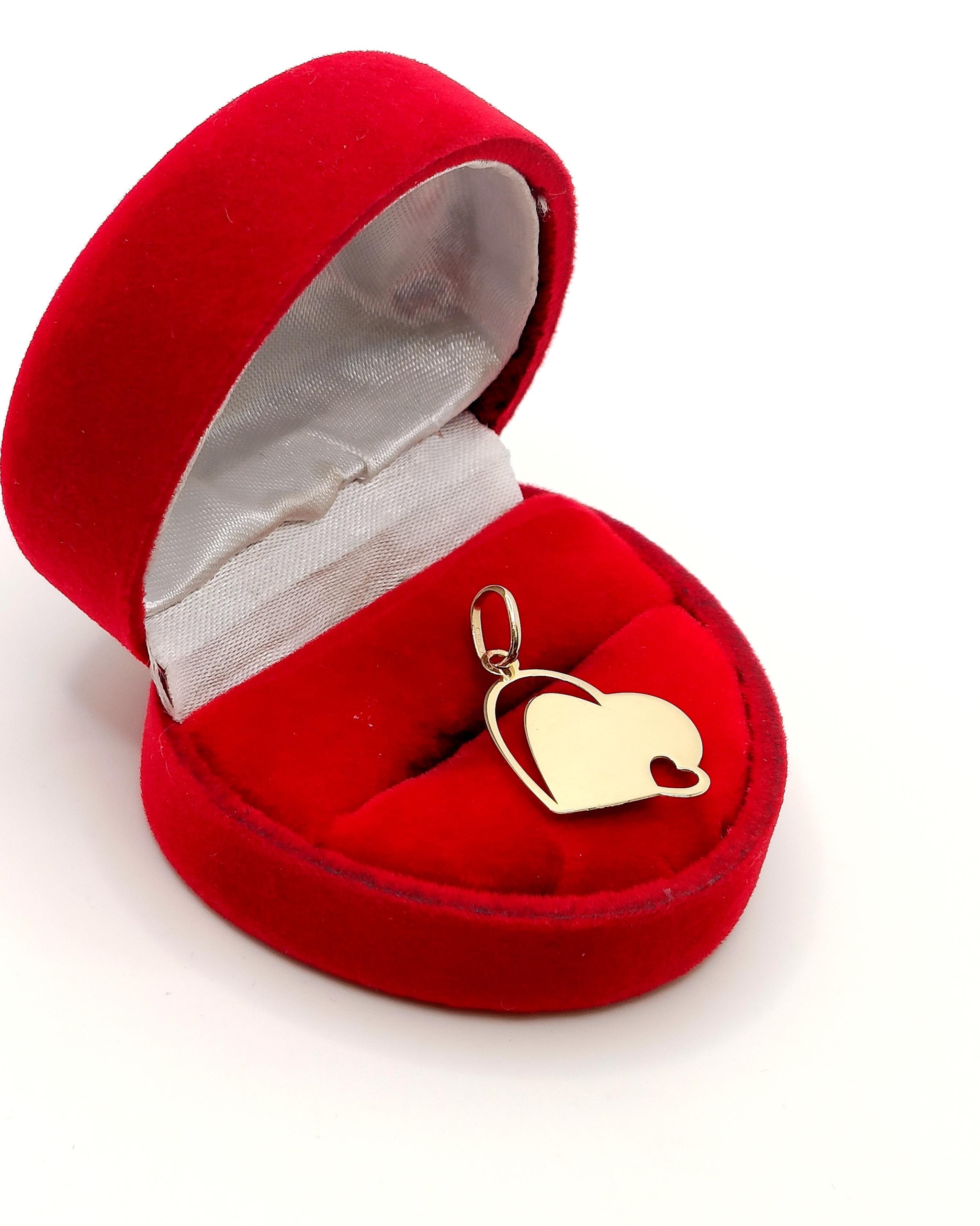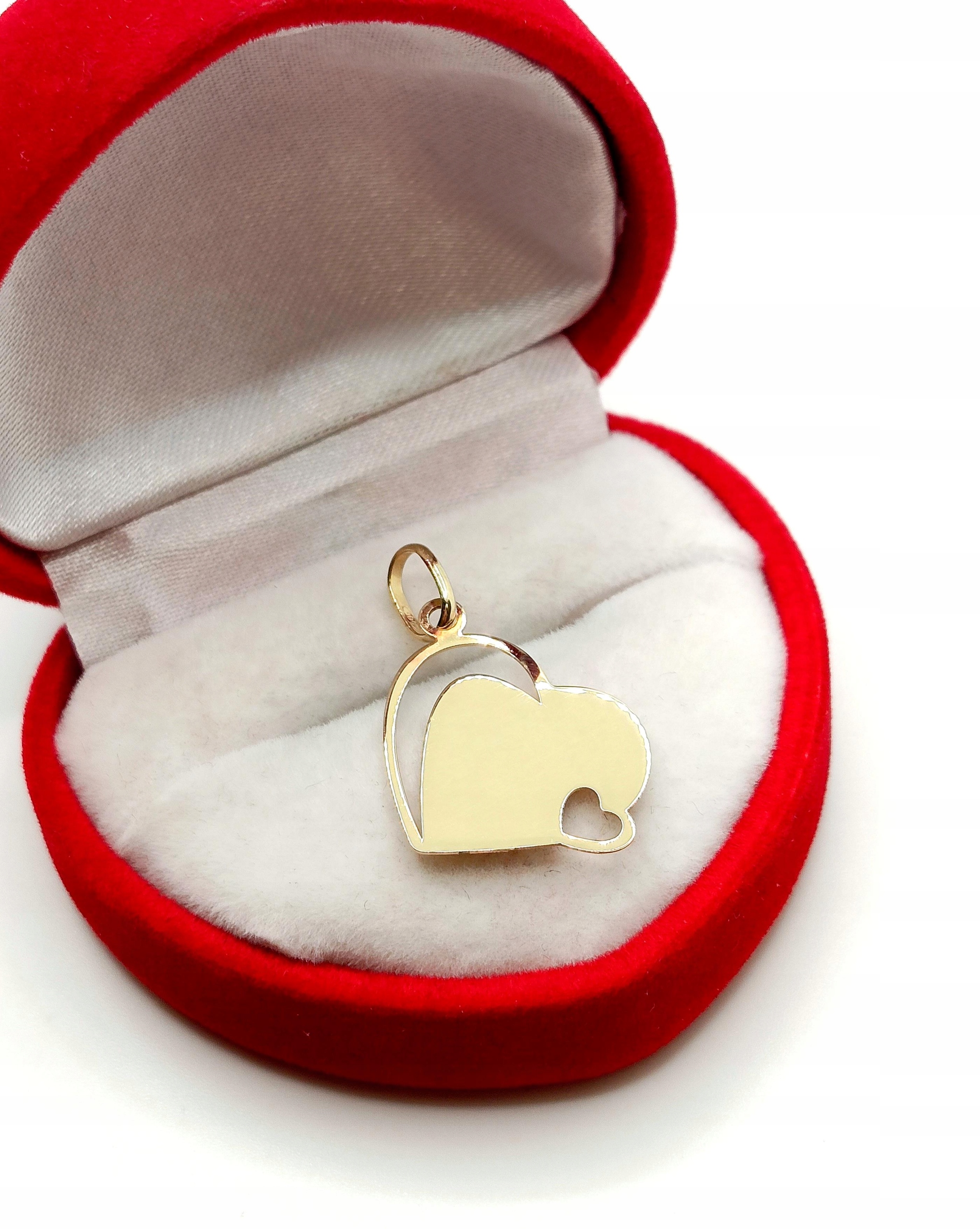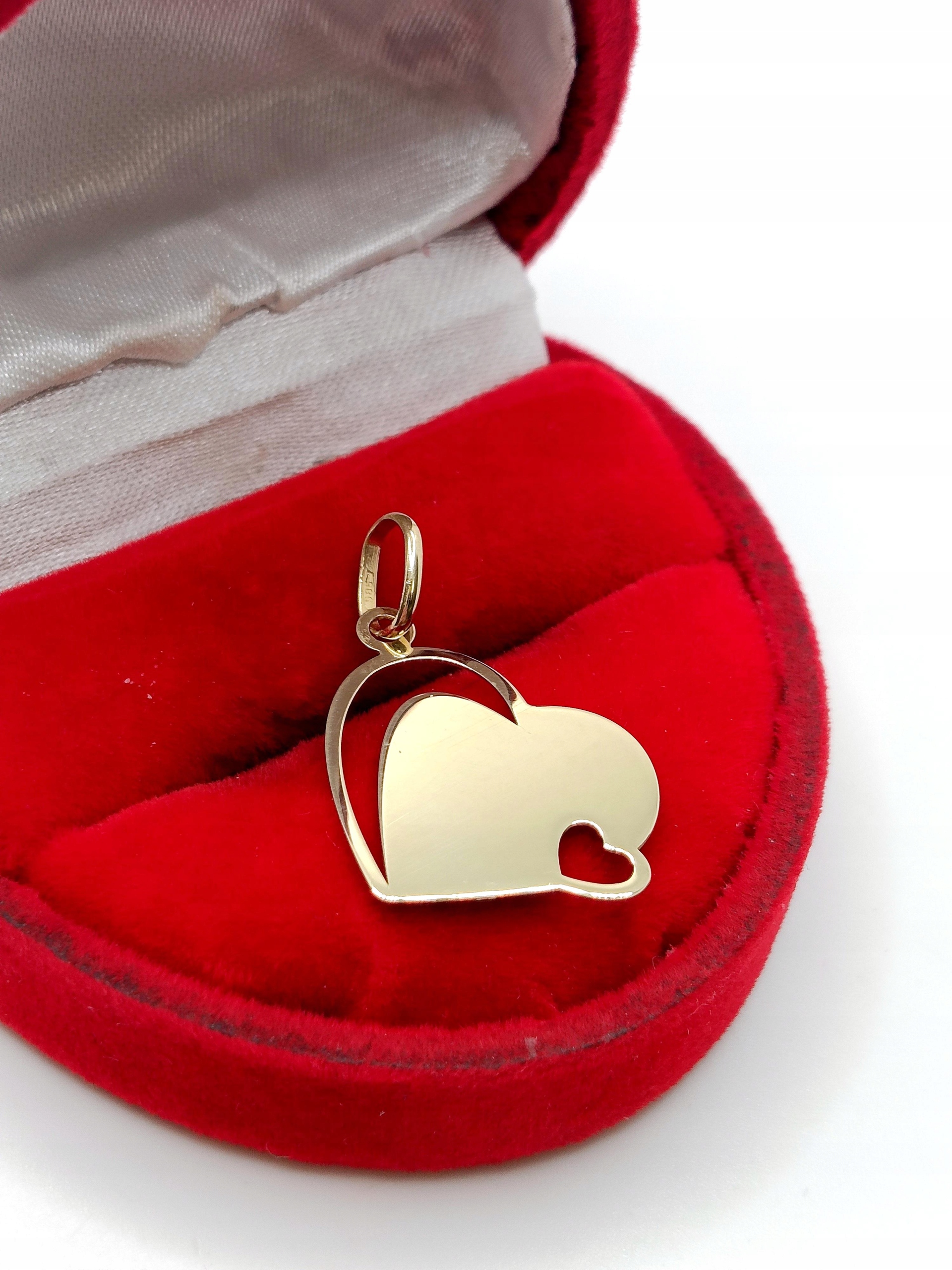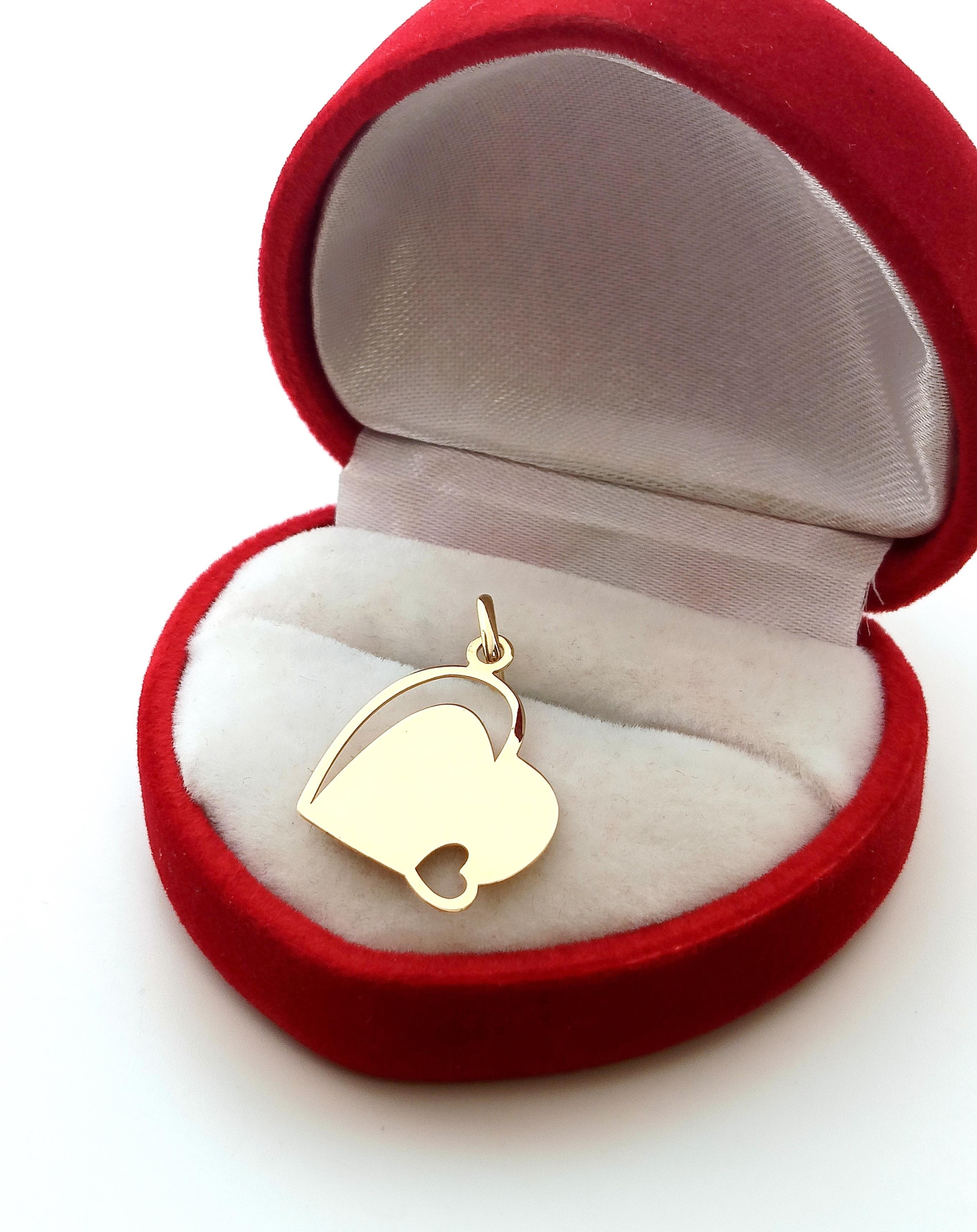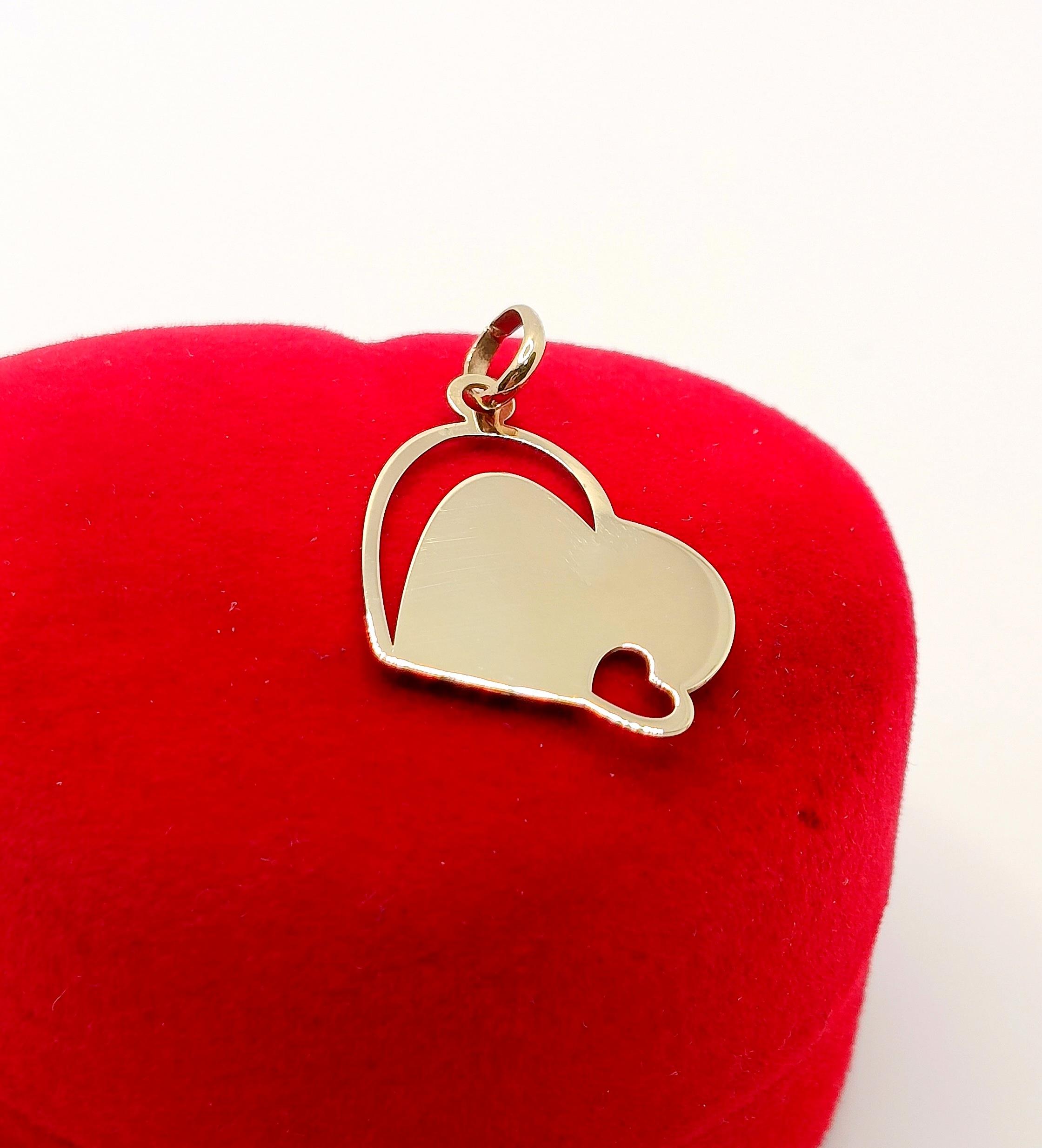 Oferujemy na sprzedaż złotą zawieszkę w formie blaszki w kształcie serca z wycięciami.