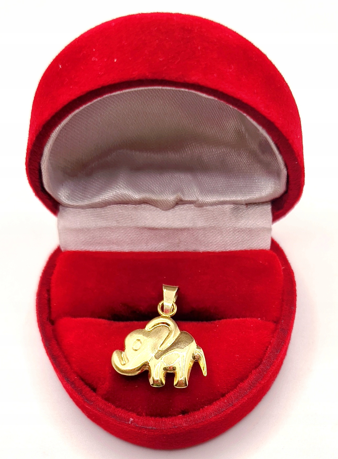 Oferujemy na sprzedaż piękną, złotą zawieszkę w kształcie słonia z podniesioną trąbą.