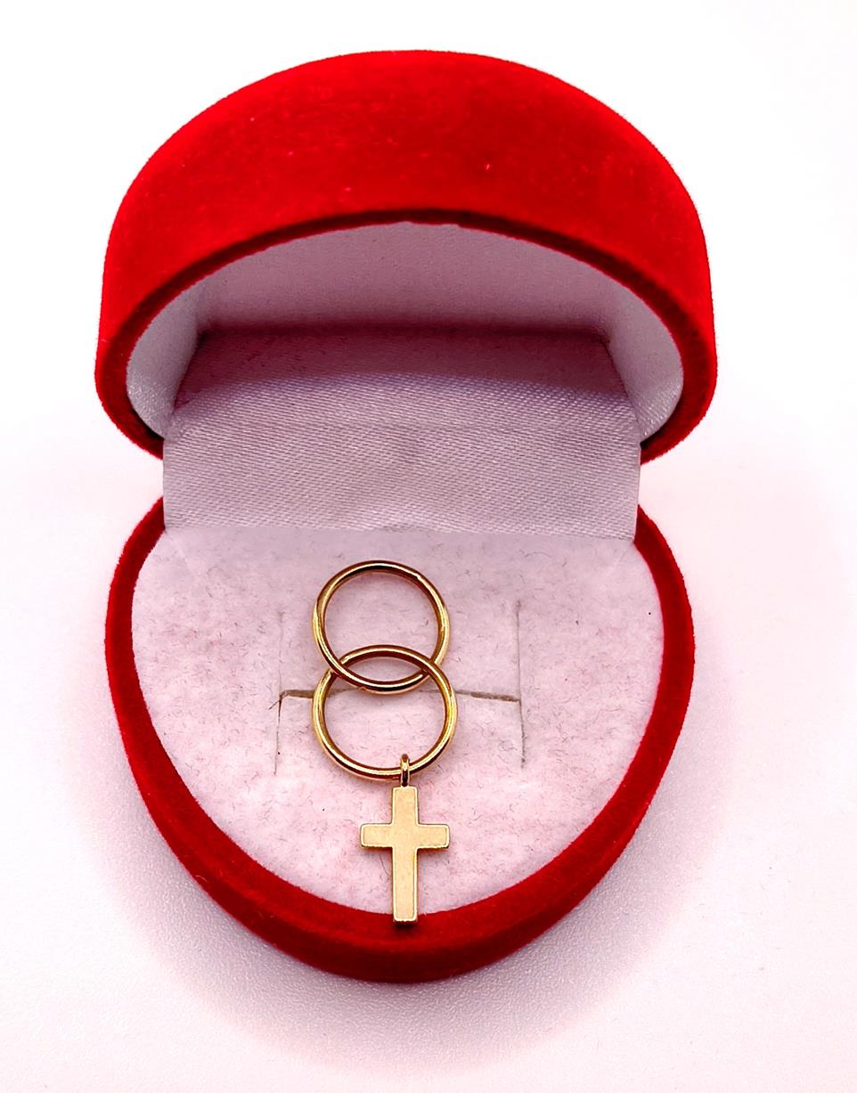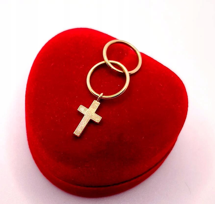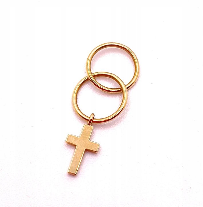 W ofercie sprzedaży posiadamy piękną, złotą zawieszkę w postaci krzyżyka zawieszonego na dwóch kółkach.