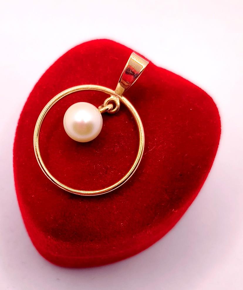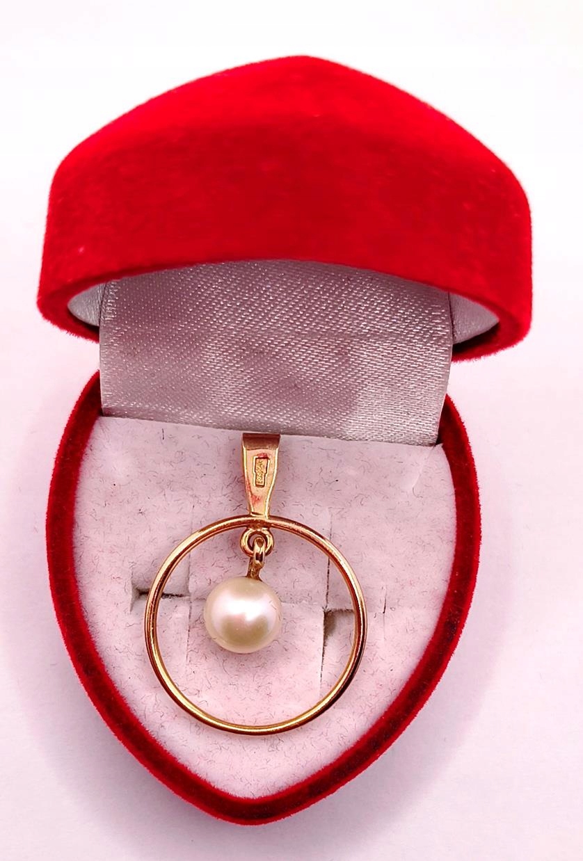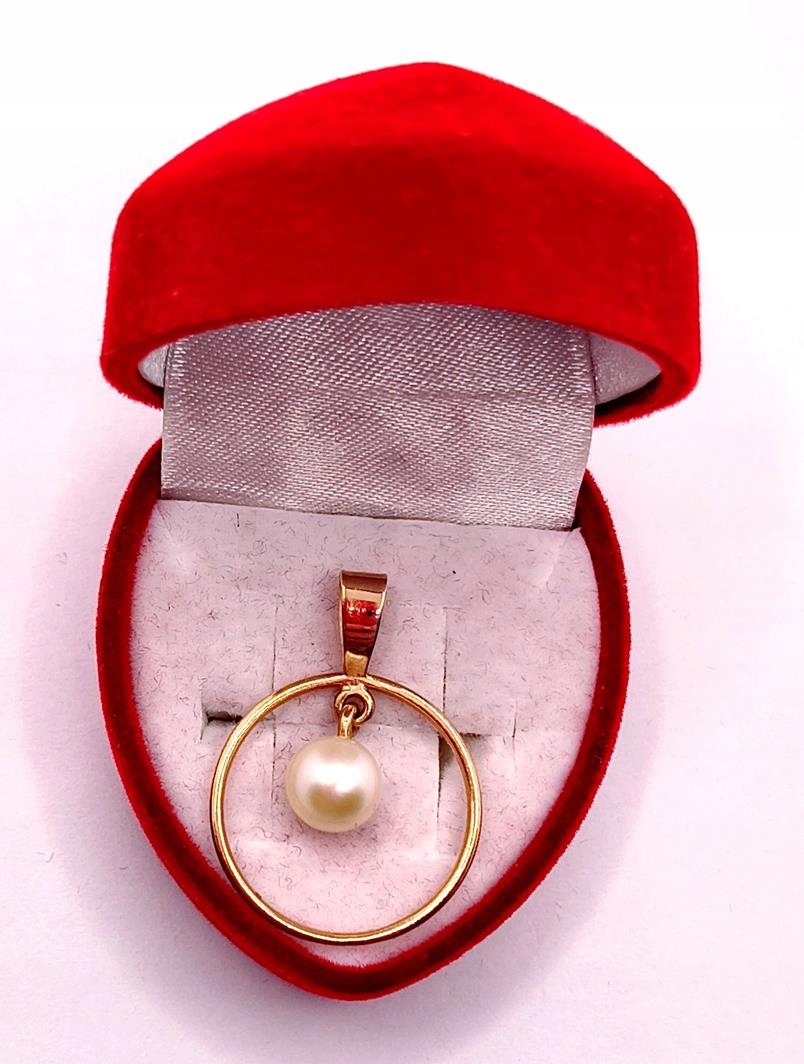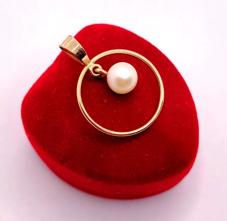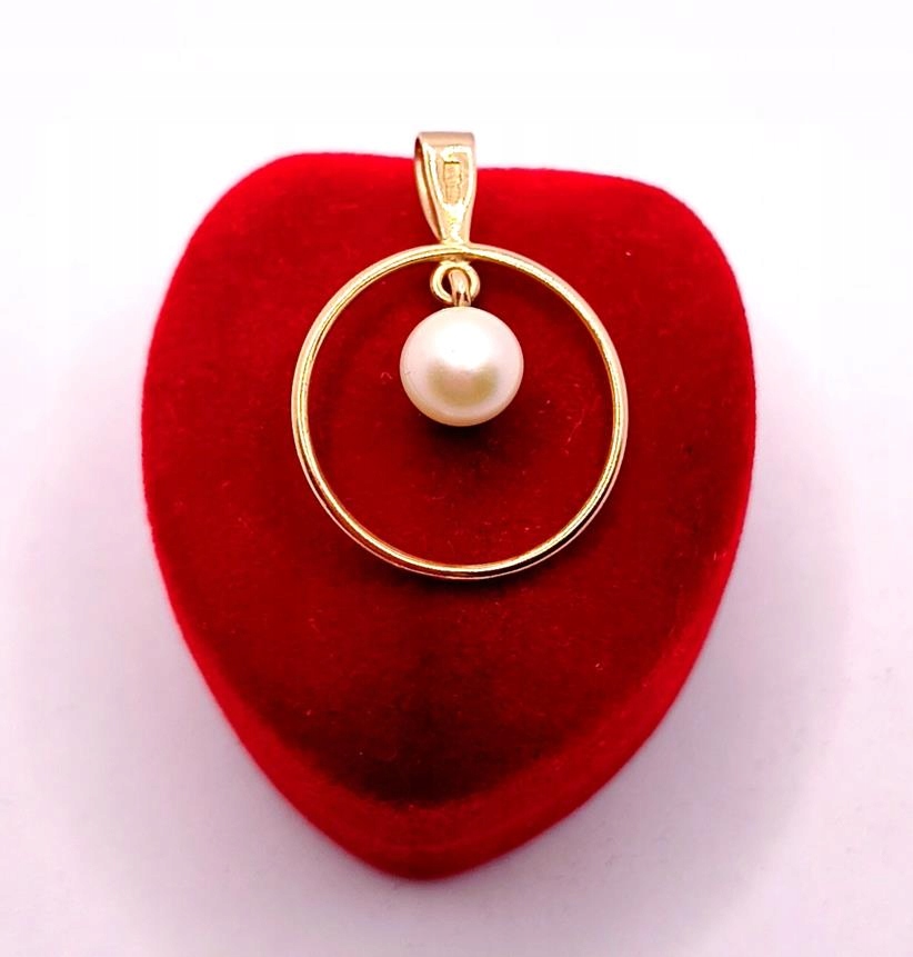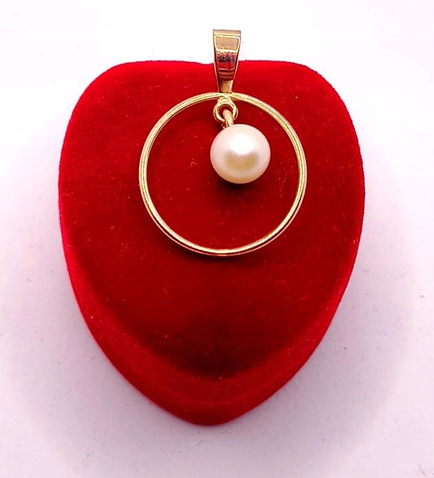 W ofercie sprzedaży posiadamy piękną, złotą zawieszkę, ozdobioną perłą hodowlaną zawieszoną w obręczy.