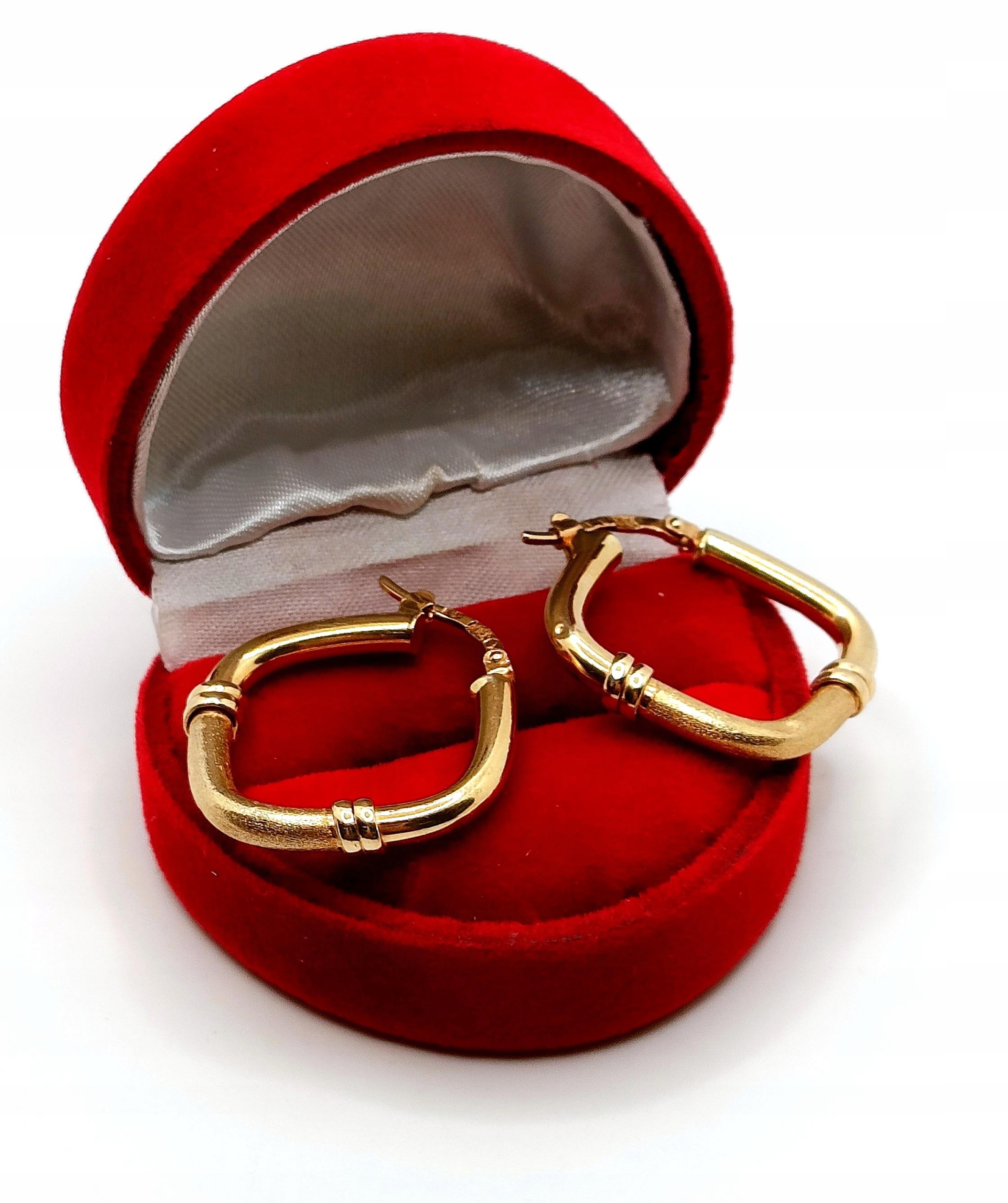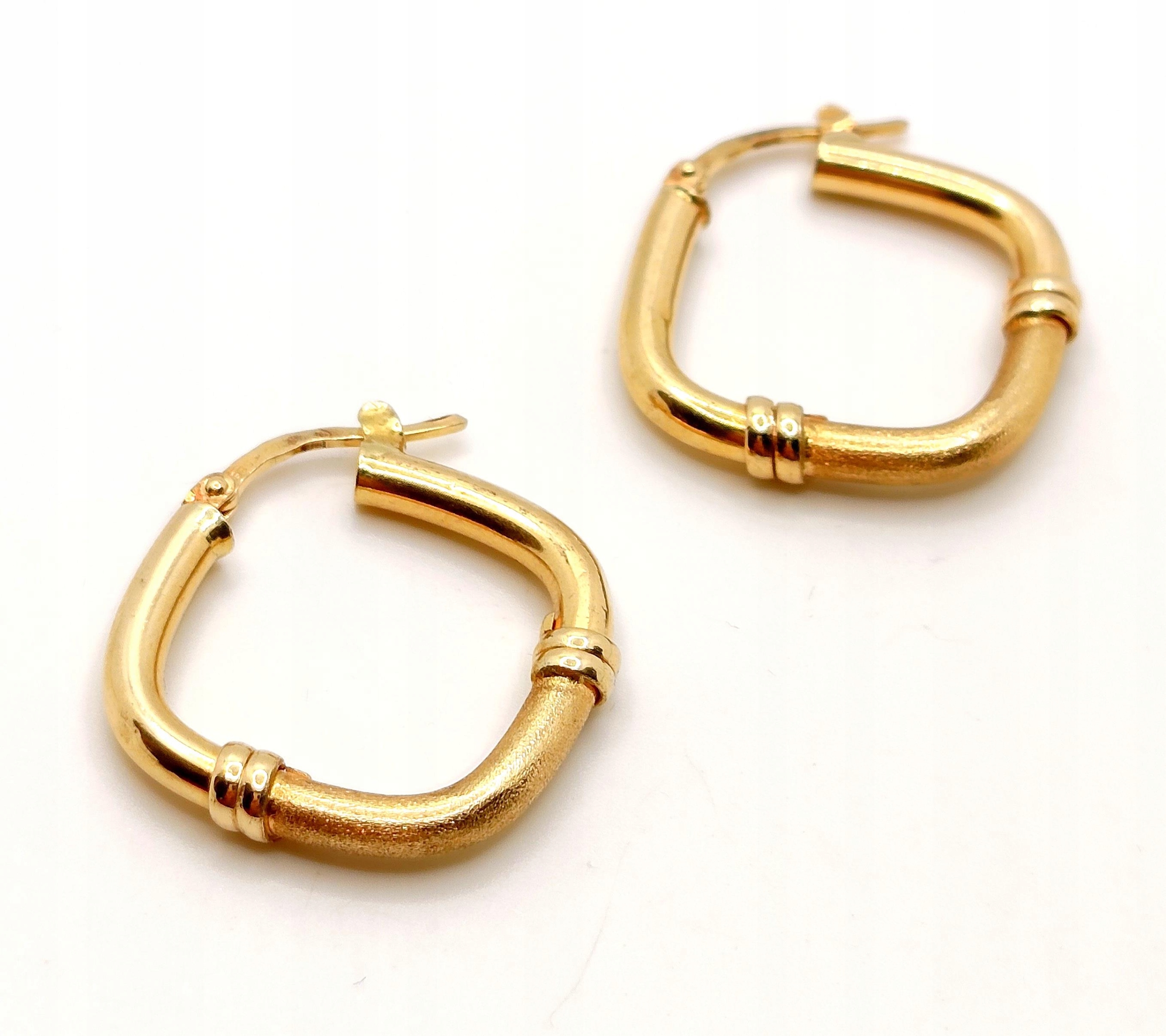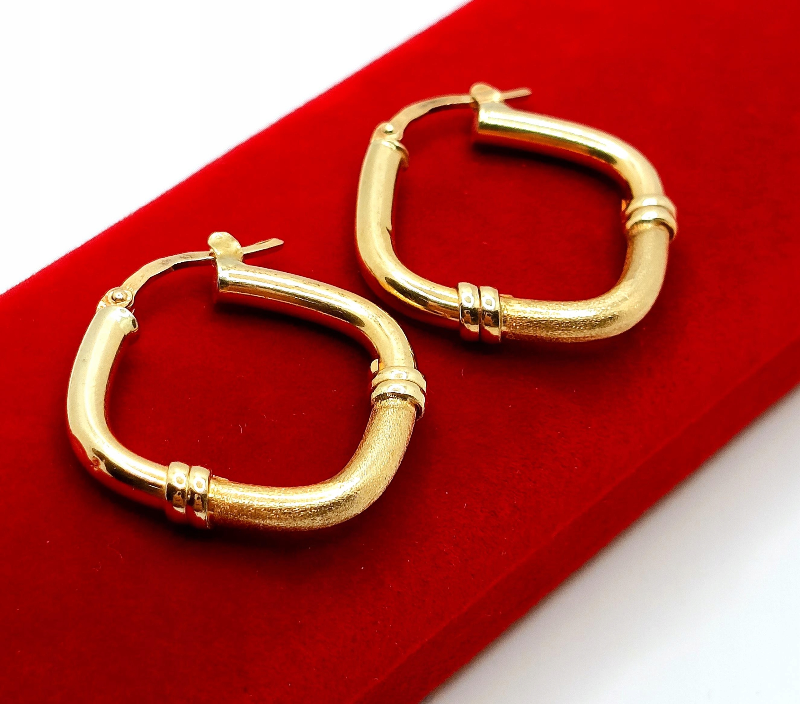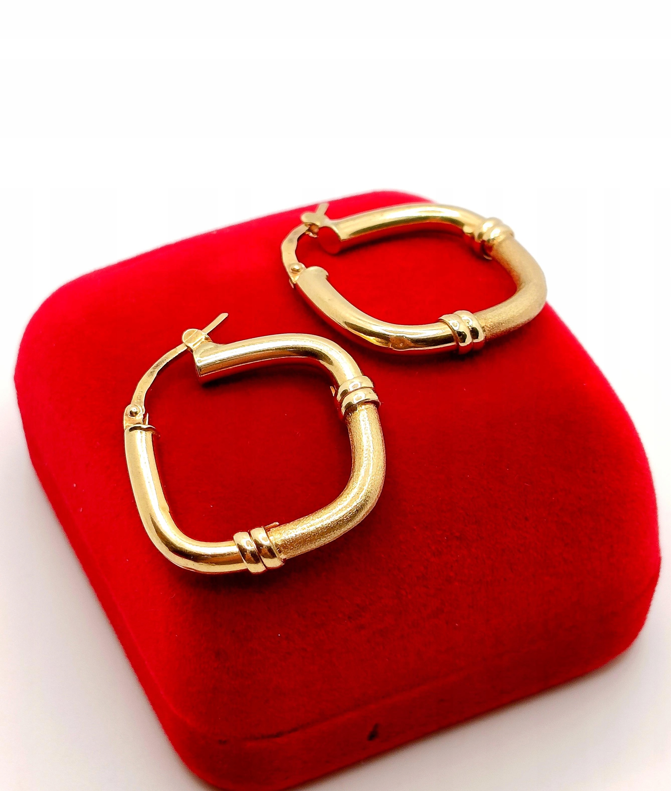 W ofercie na sprzedaż mamy dla Państwa złote kolczyki w kształcie dużych kwadratów. Częściowo zdobione satynowym wykończeniem. W środku puste.