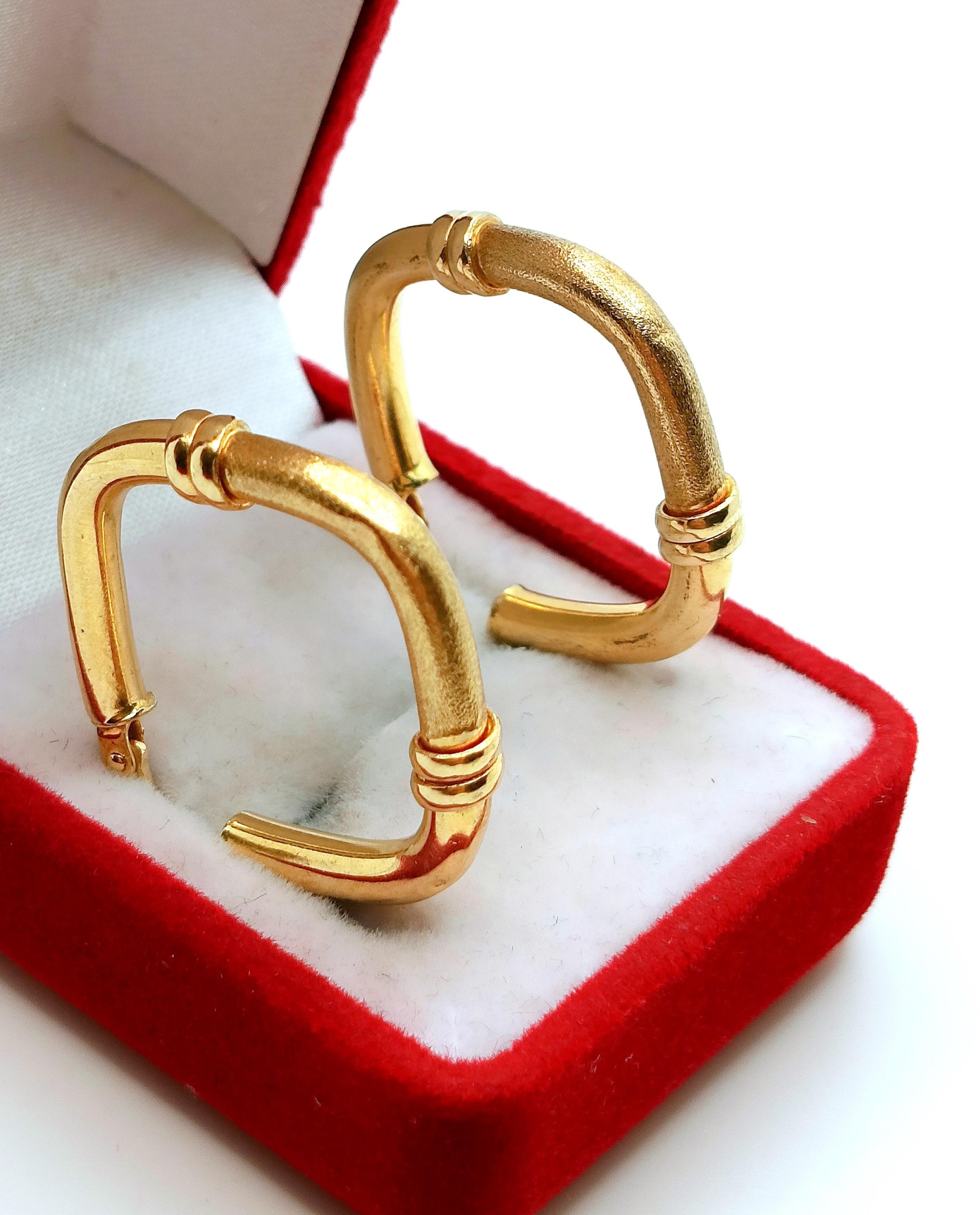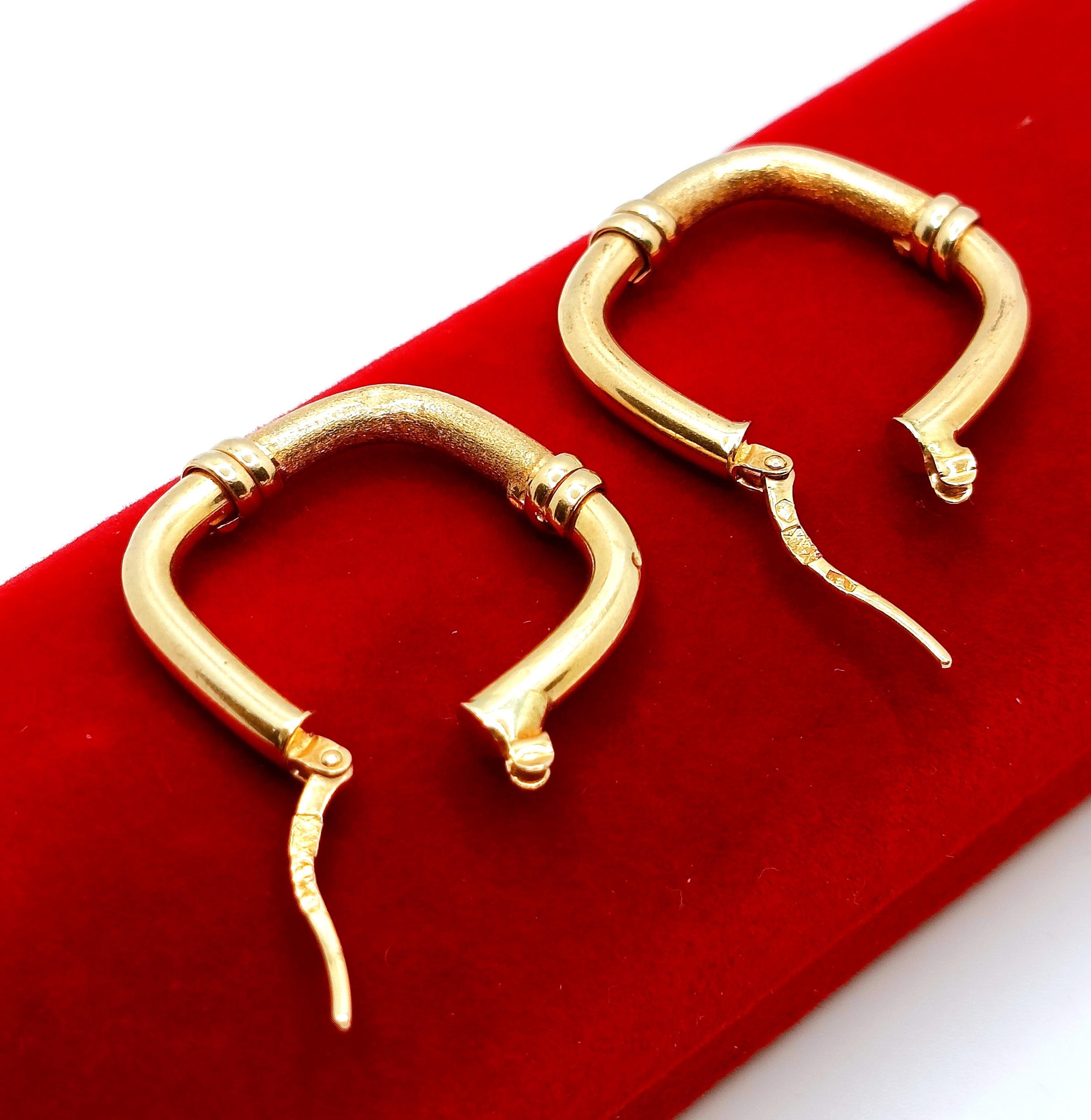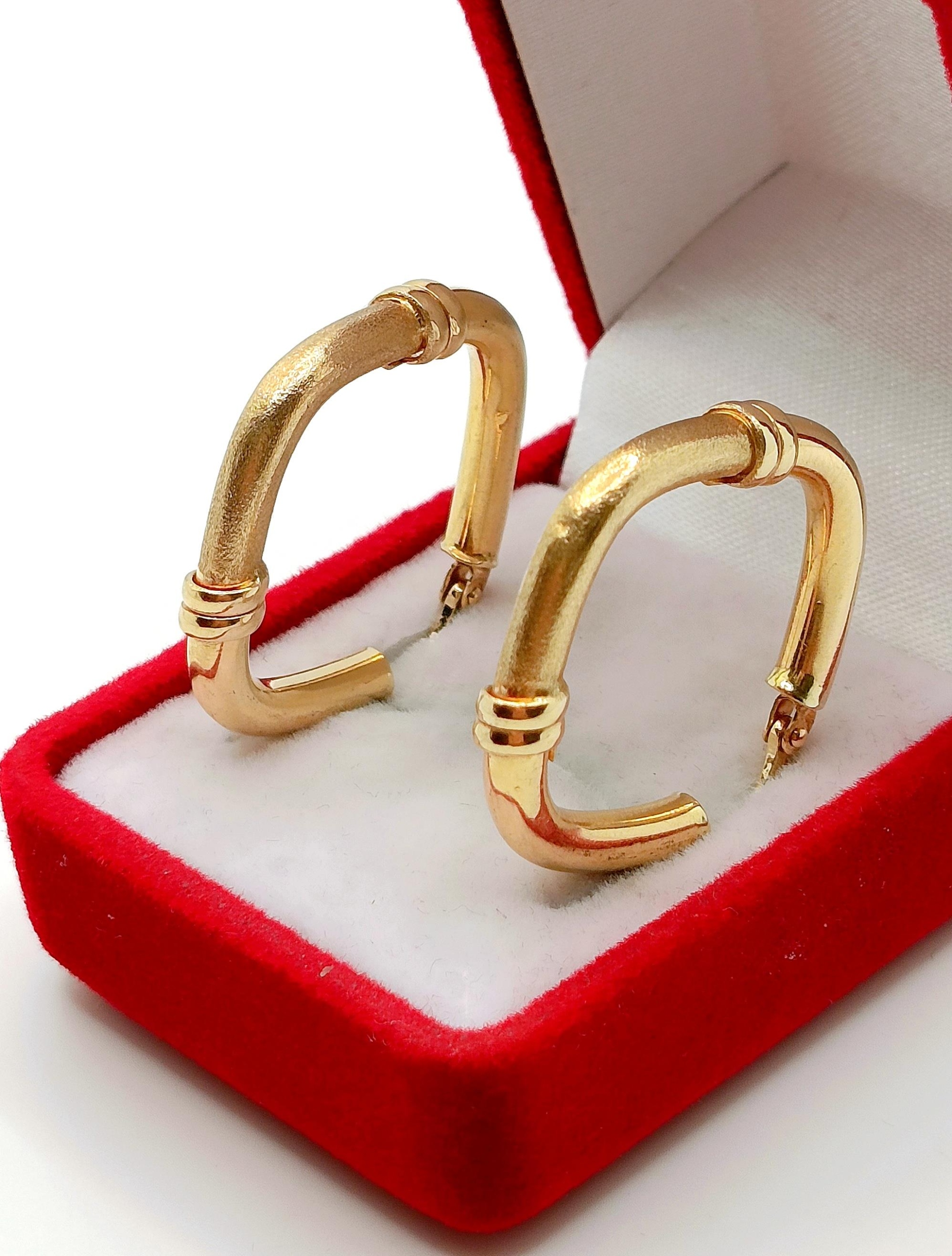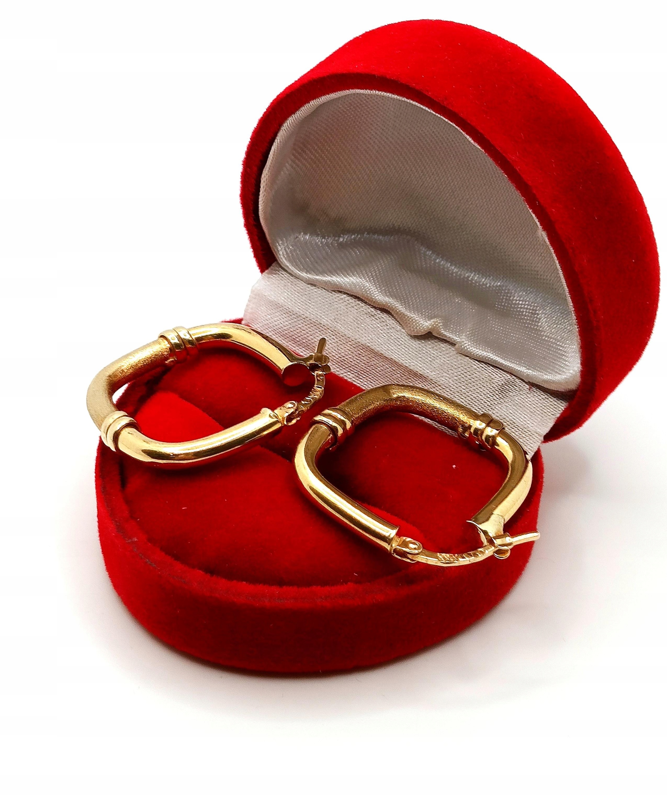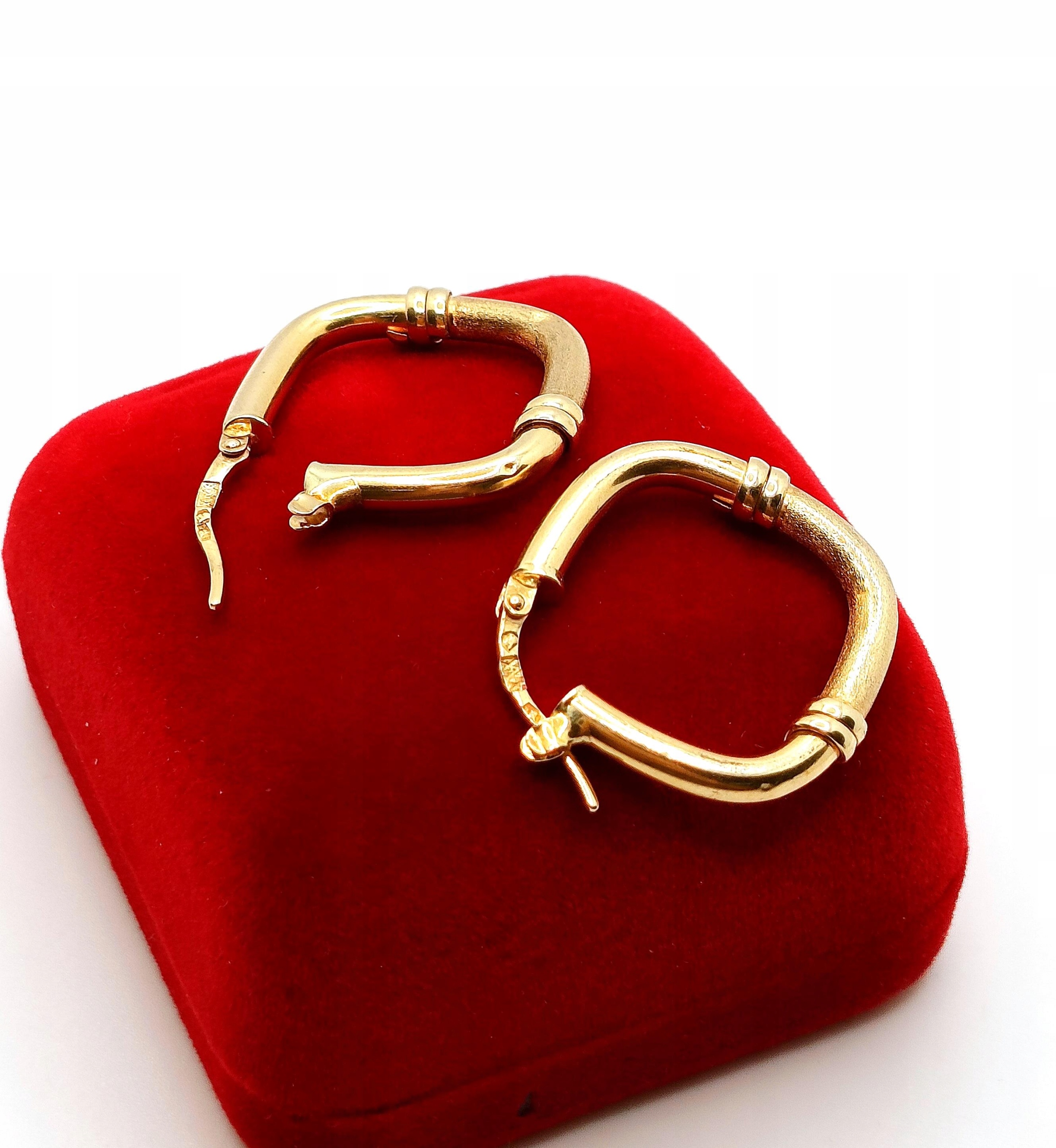 W ofercie na sprzedaż mamy dla Państwa złote kolczyki w kształcie dużych kwadratów. Częściowo zdobione satynowym wykończeniem. W środku puste.