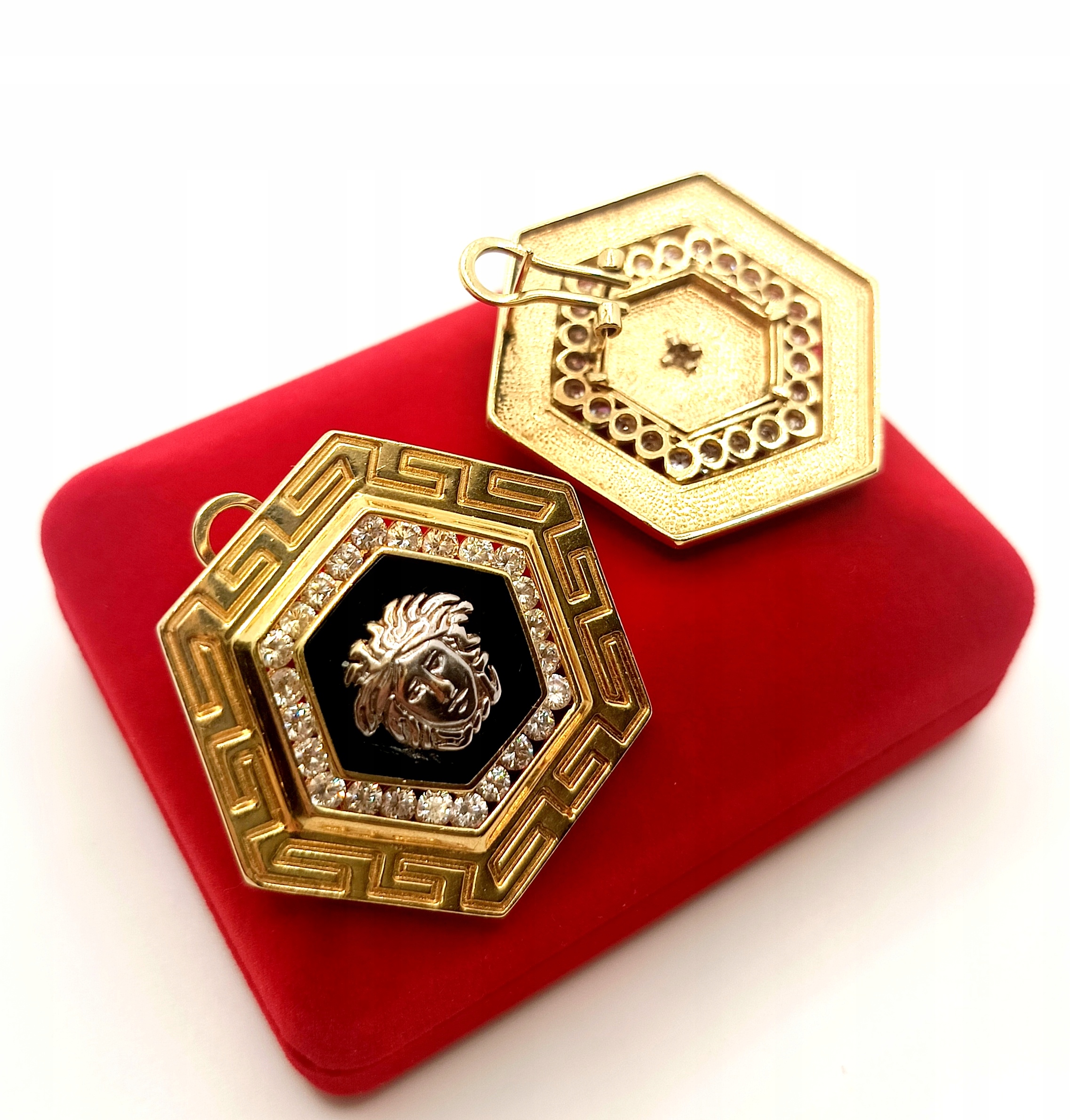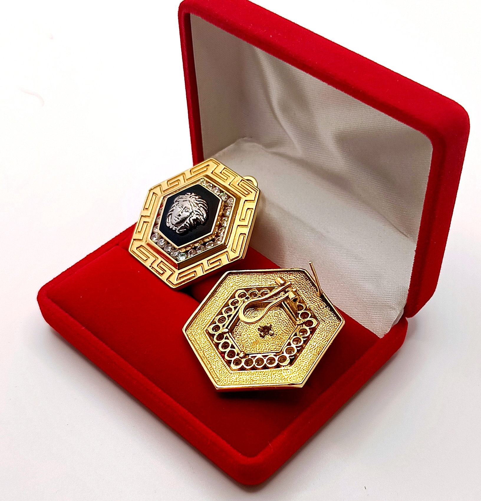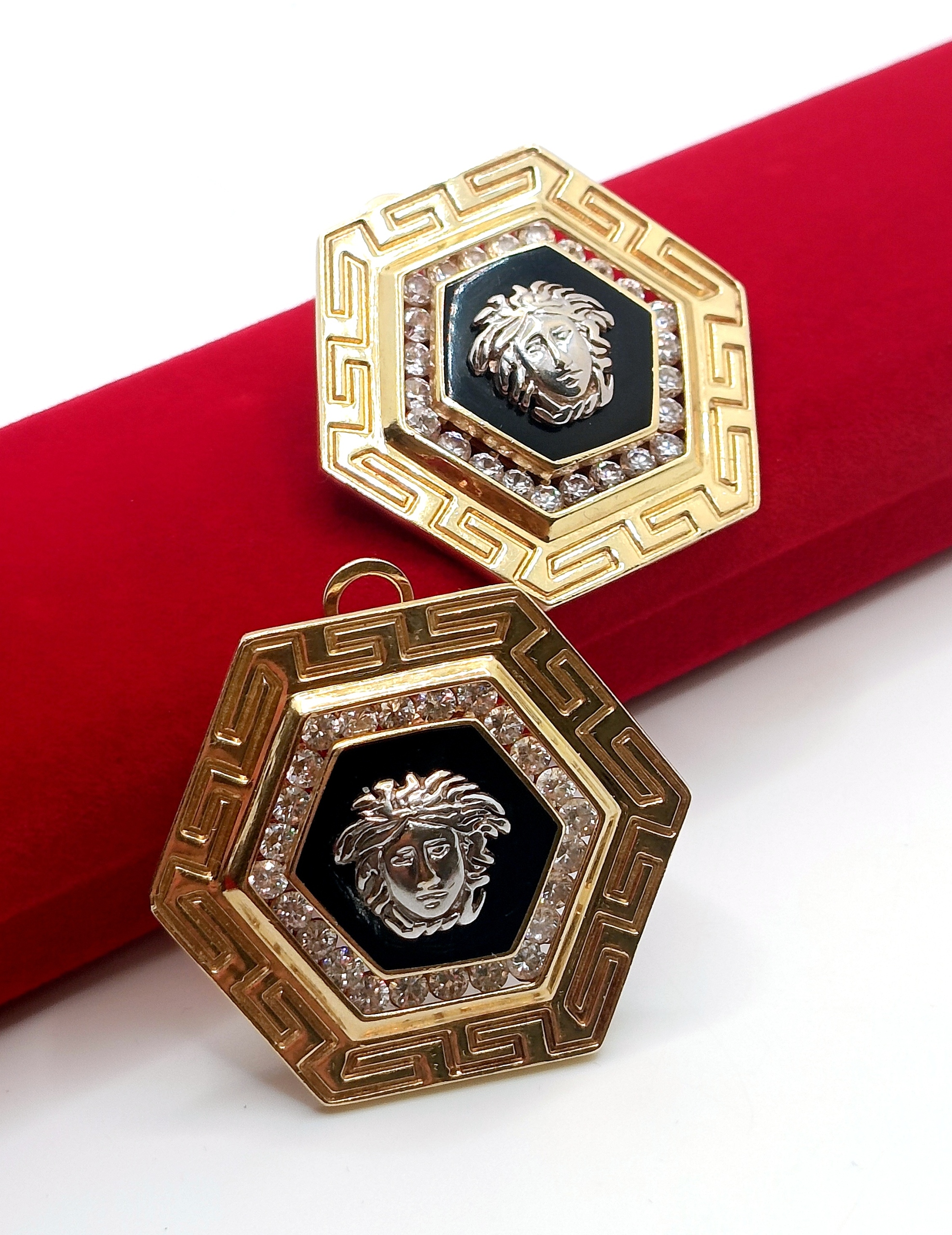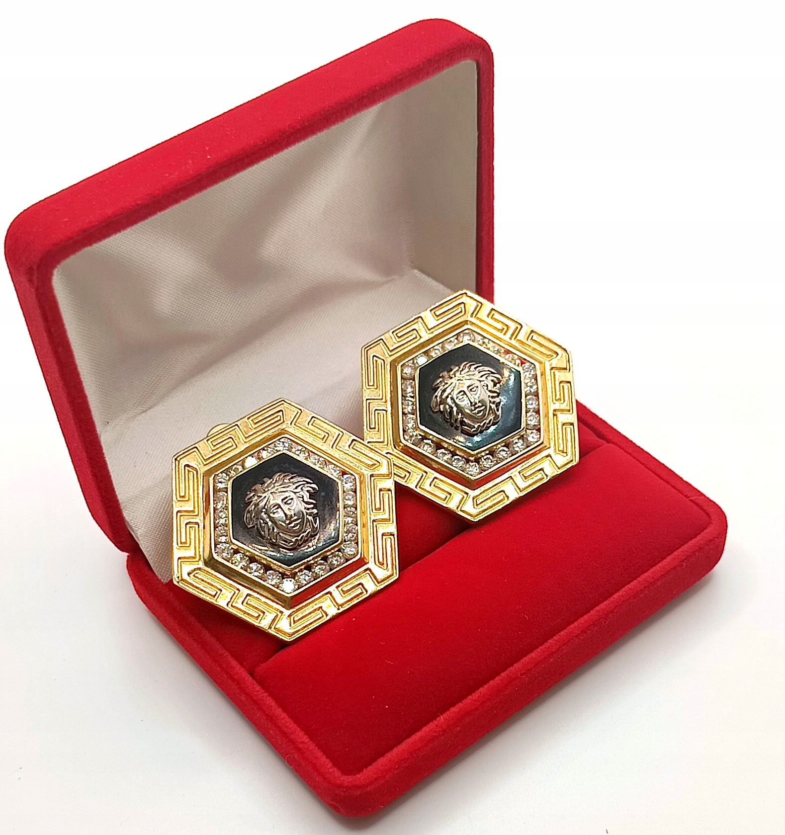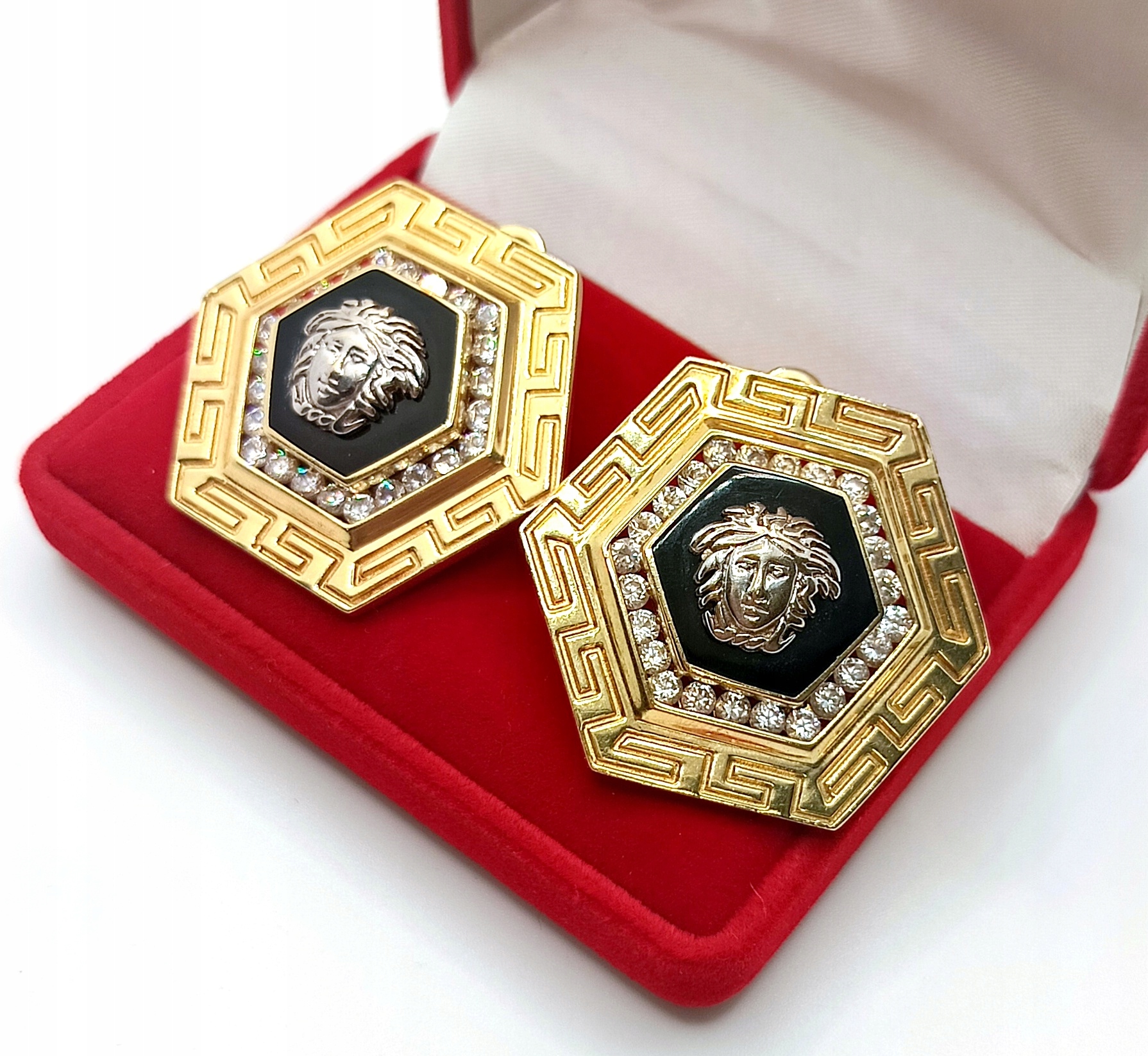 W ofercie na sprzedaż mamy dla państwa piękne, złote kolczyki Versace ozdobione cyrkoniami oraz greckim wzorem.