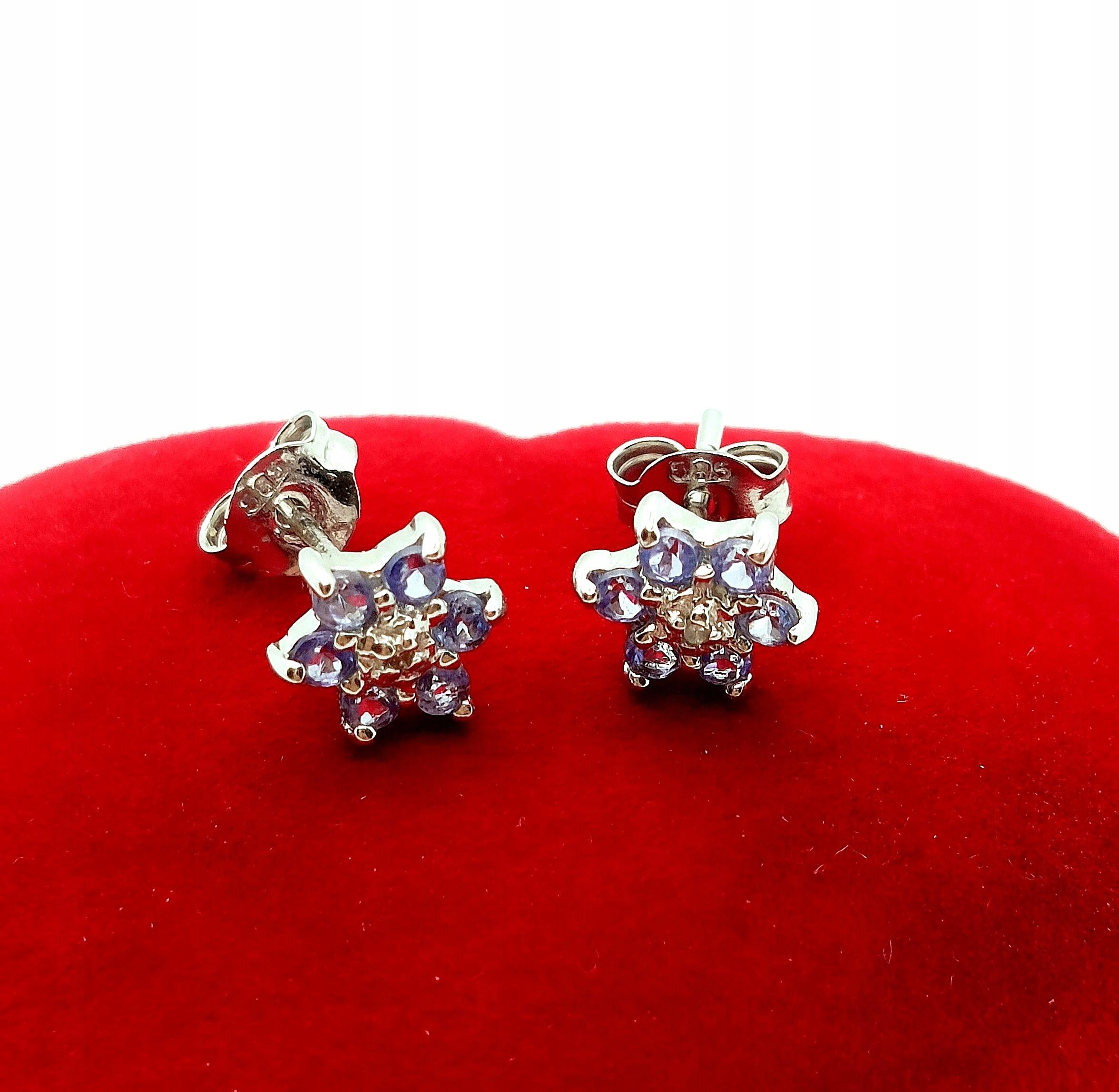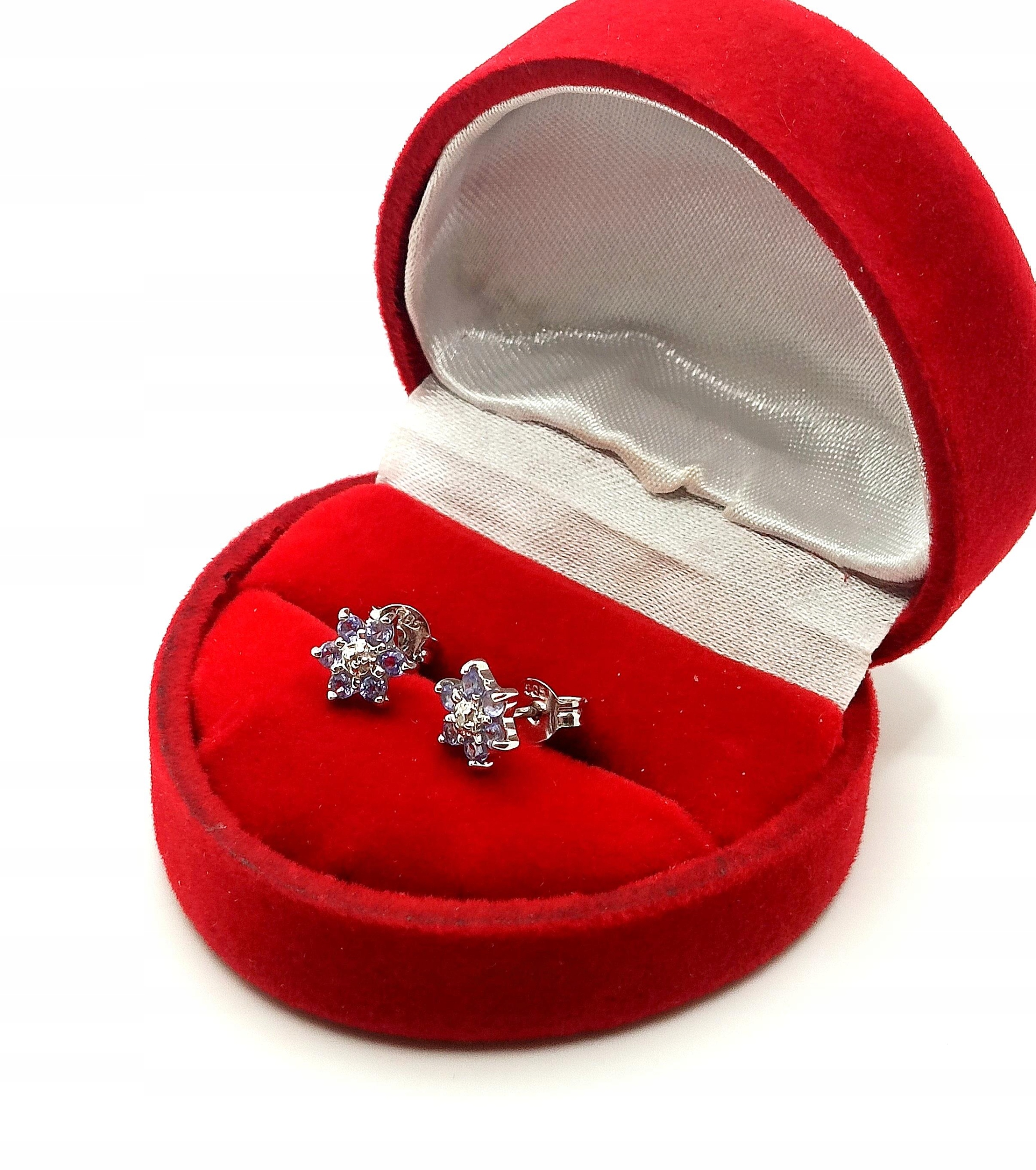 W ofercie na sprzedaż mamy dla Państwa piękne, złote kolczyki kształtem przypominające kwiatki, ozdobione białą i fioletowymi cyrkoniami.