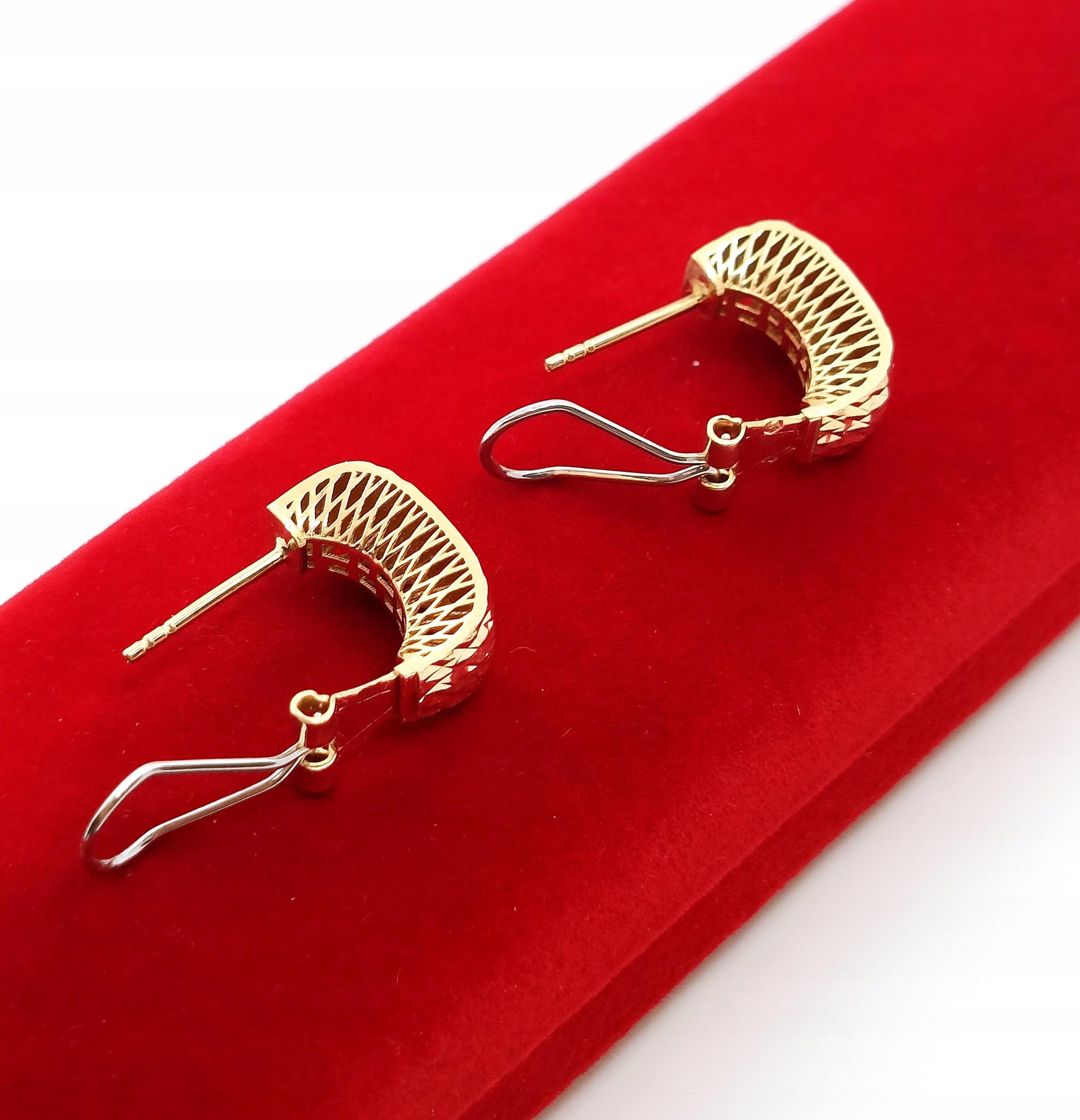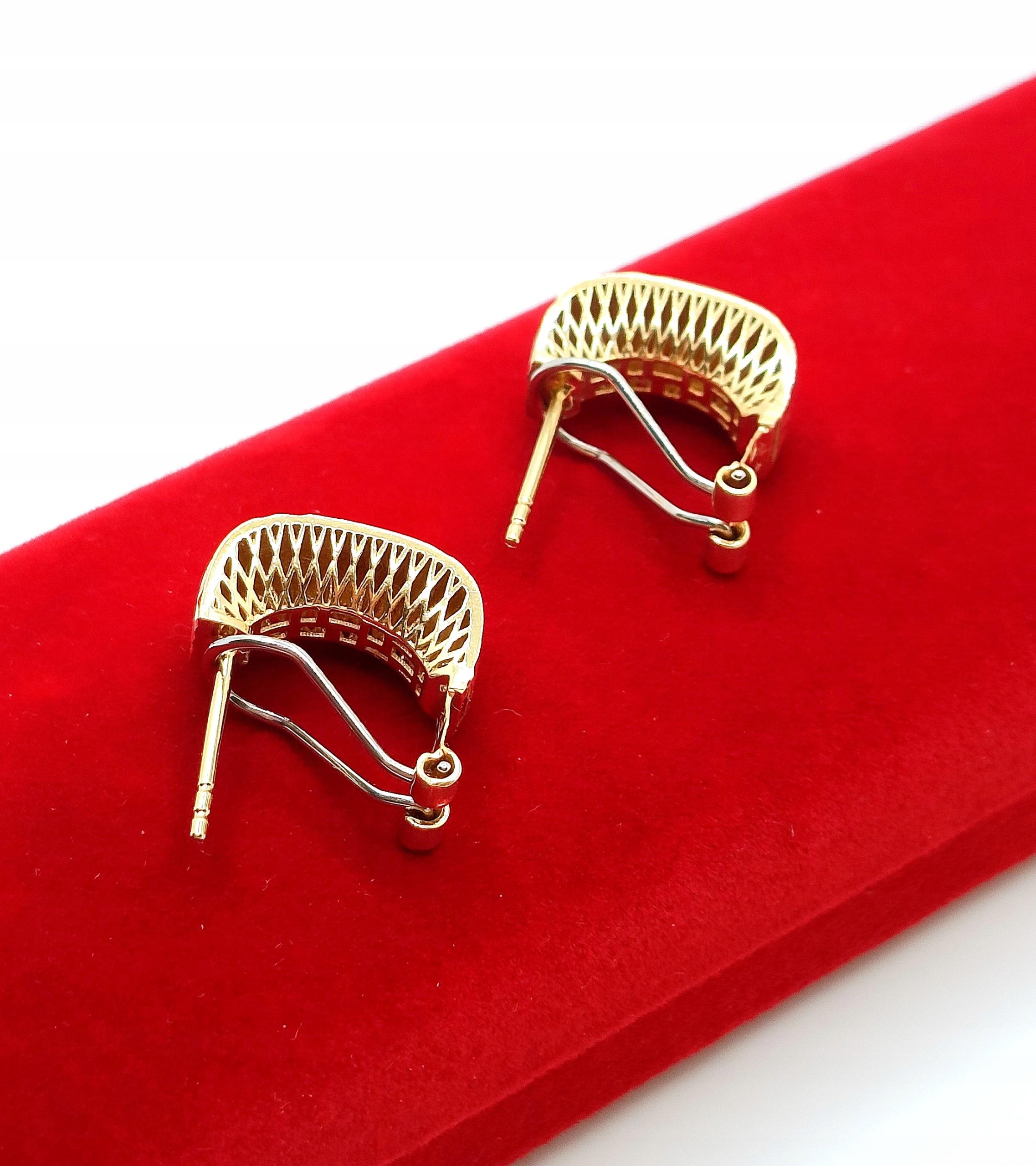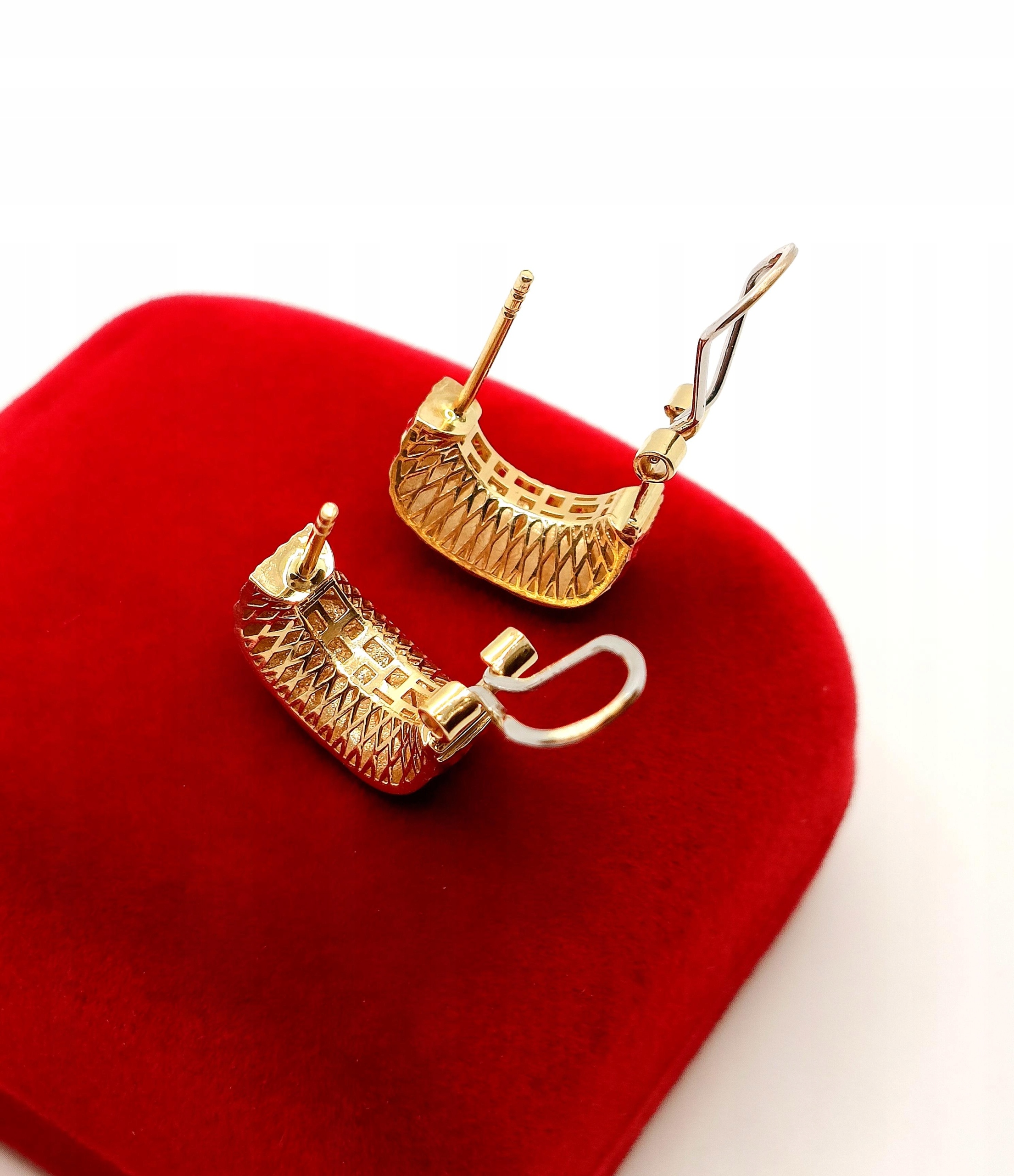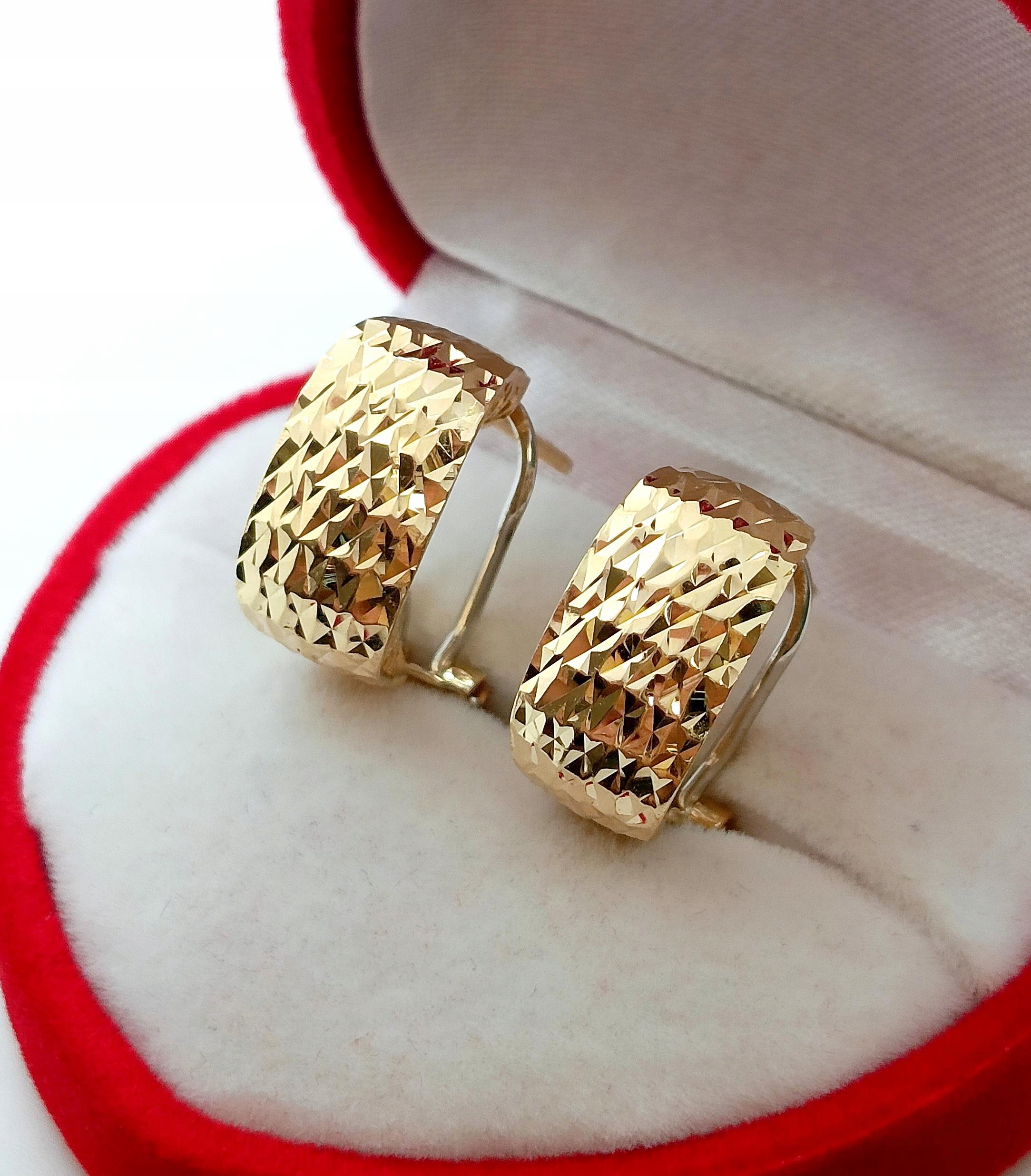 W ofercie na sprzedaż mamy dla Państwa złote kolczyki , Prostokąty zdobione żłobieniami na powierzchni. pięknie się mienią. Z tyłu kolczyki maja również piękne ażurowe zdobienie ze złota.