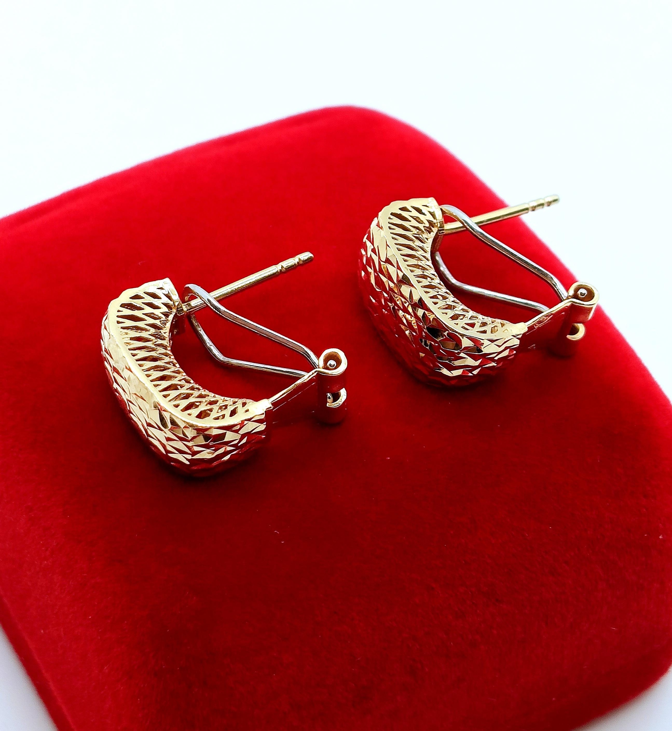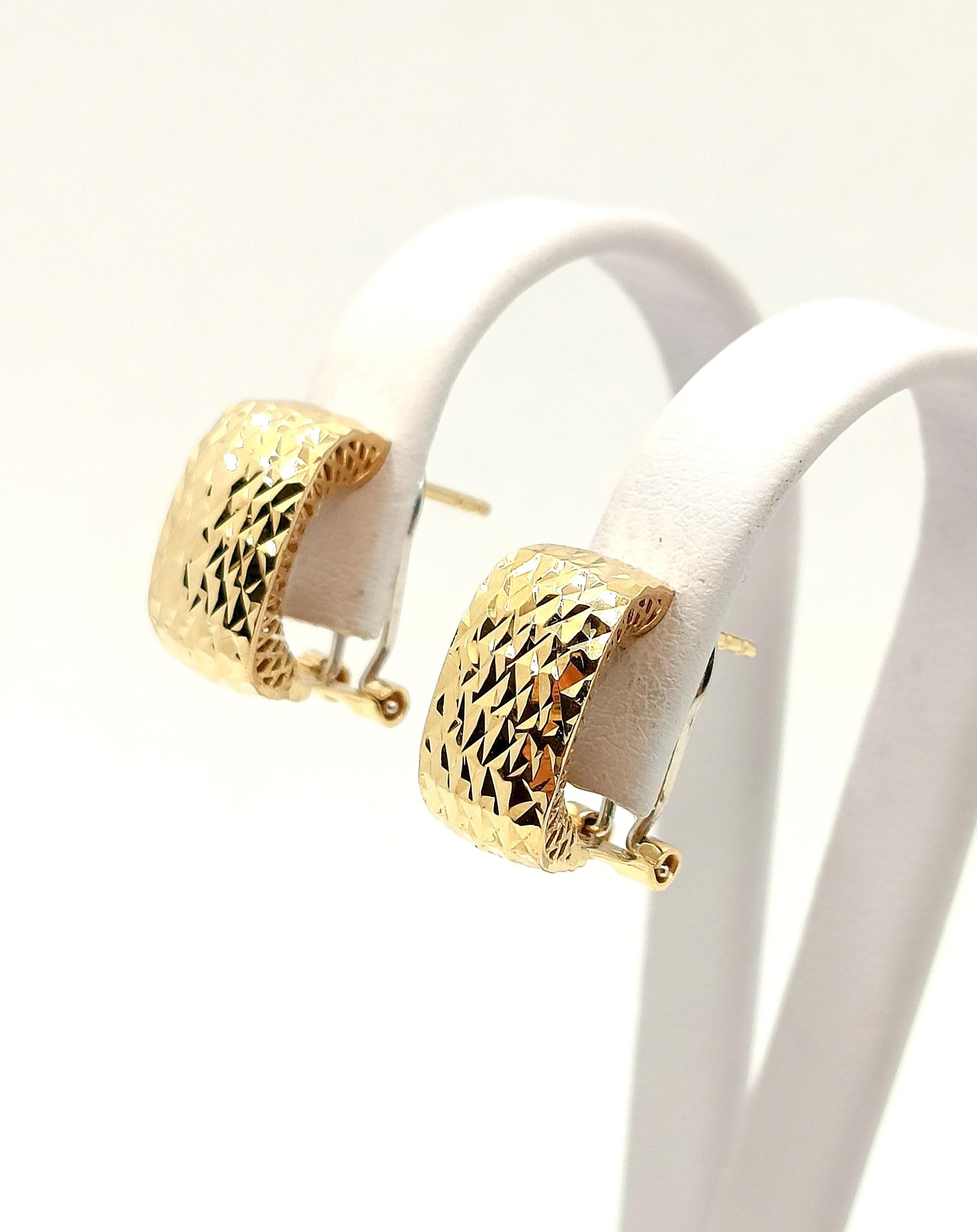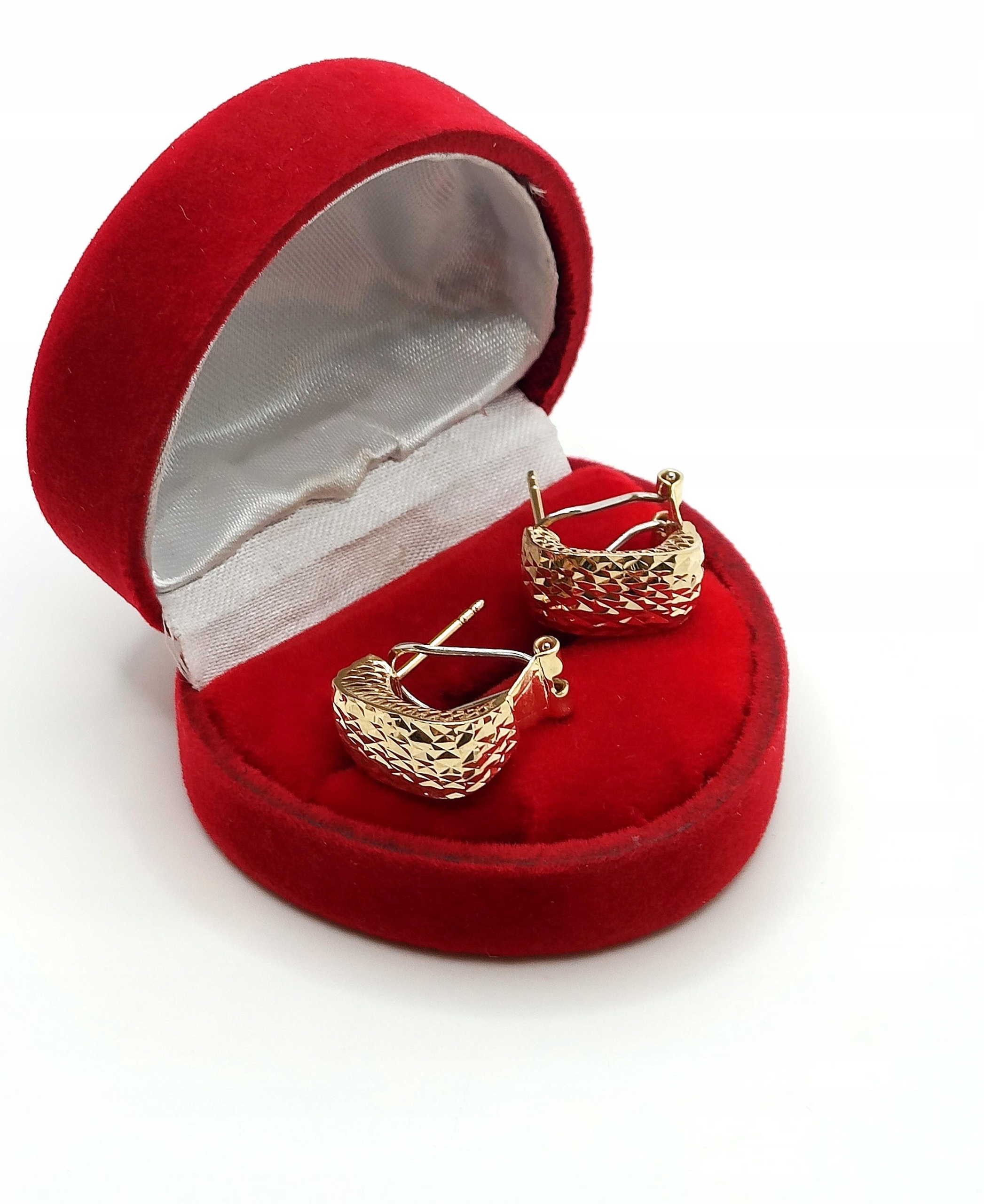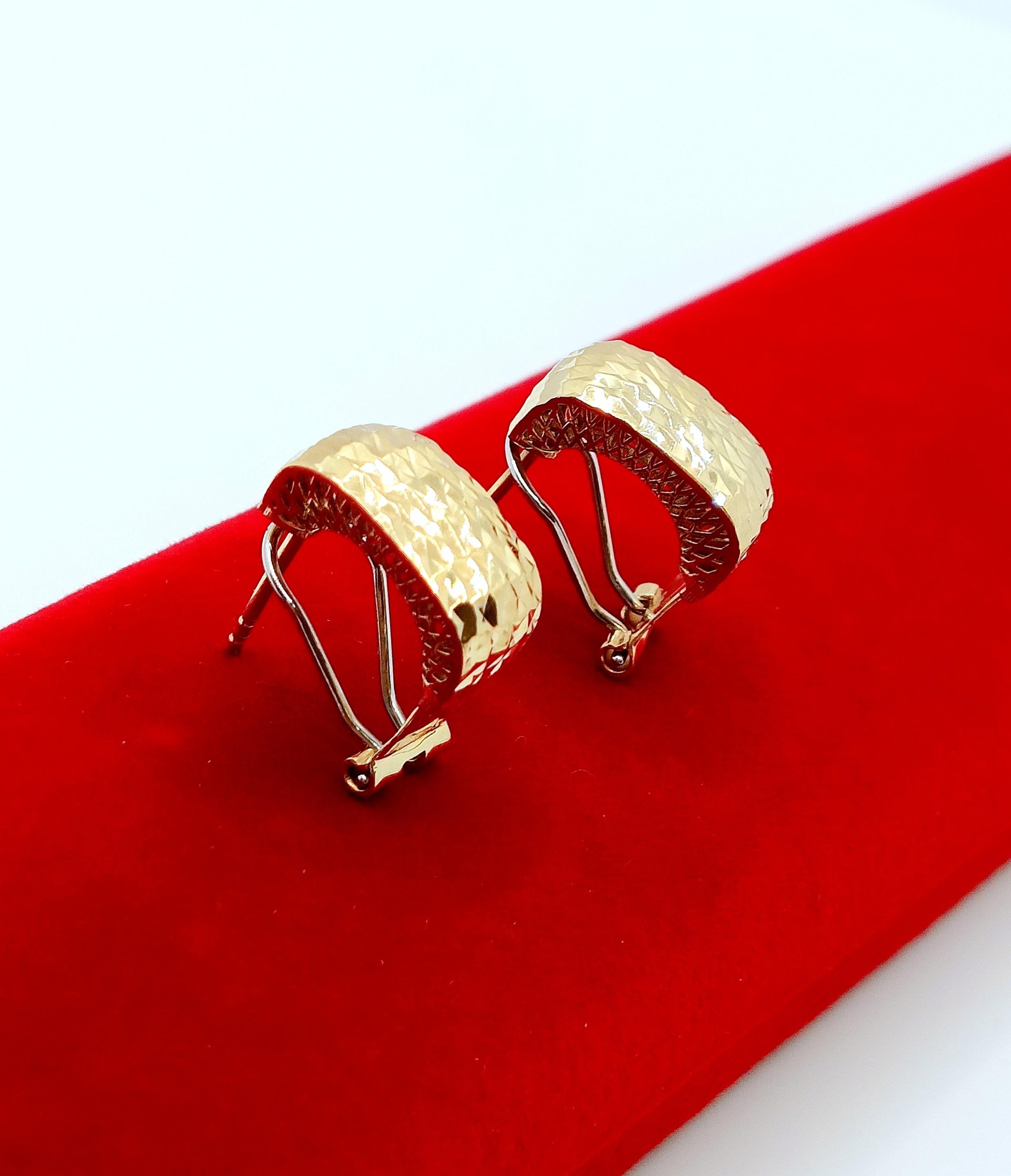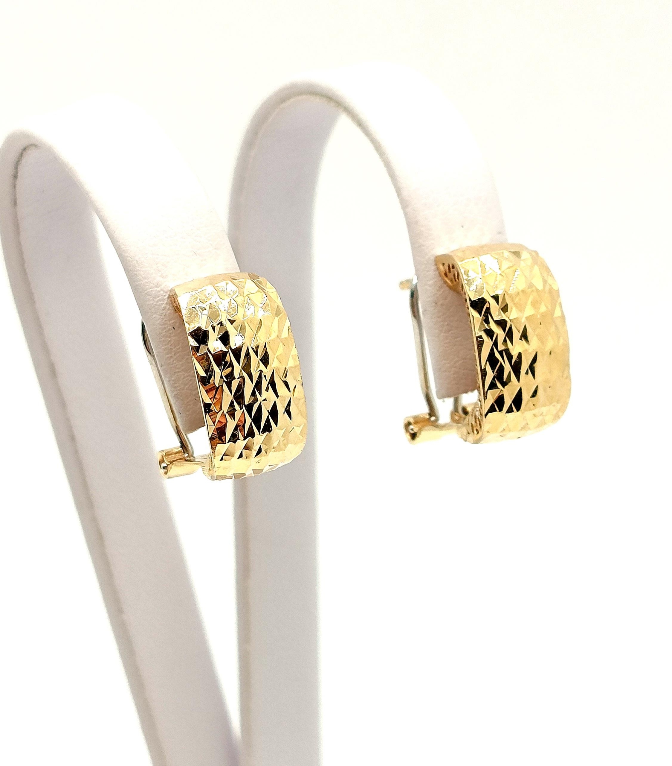 W ofercie na sprzedaż mamy dla Państwa złote kolczyki , Prostokąty zdobione żłobieniami na powierzchni. pięknie się mienią. Z tyłu kolczyki maja również piękne ażurowe zdobienie ze złota.