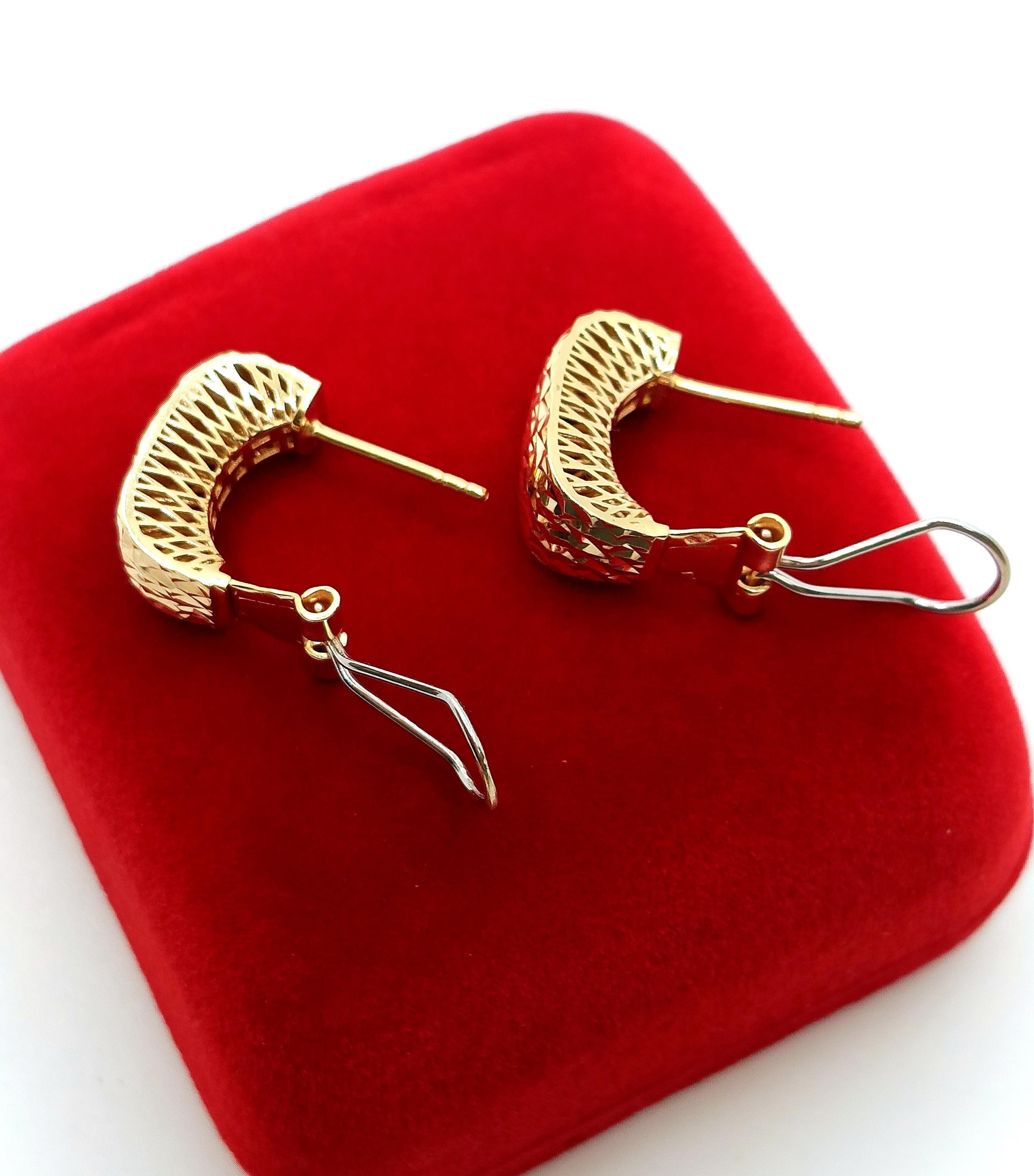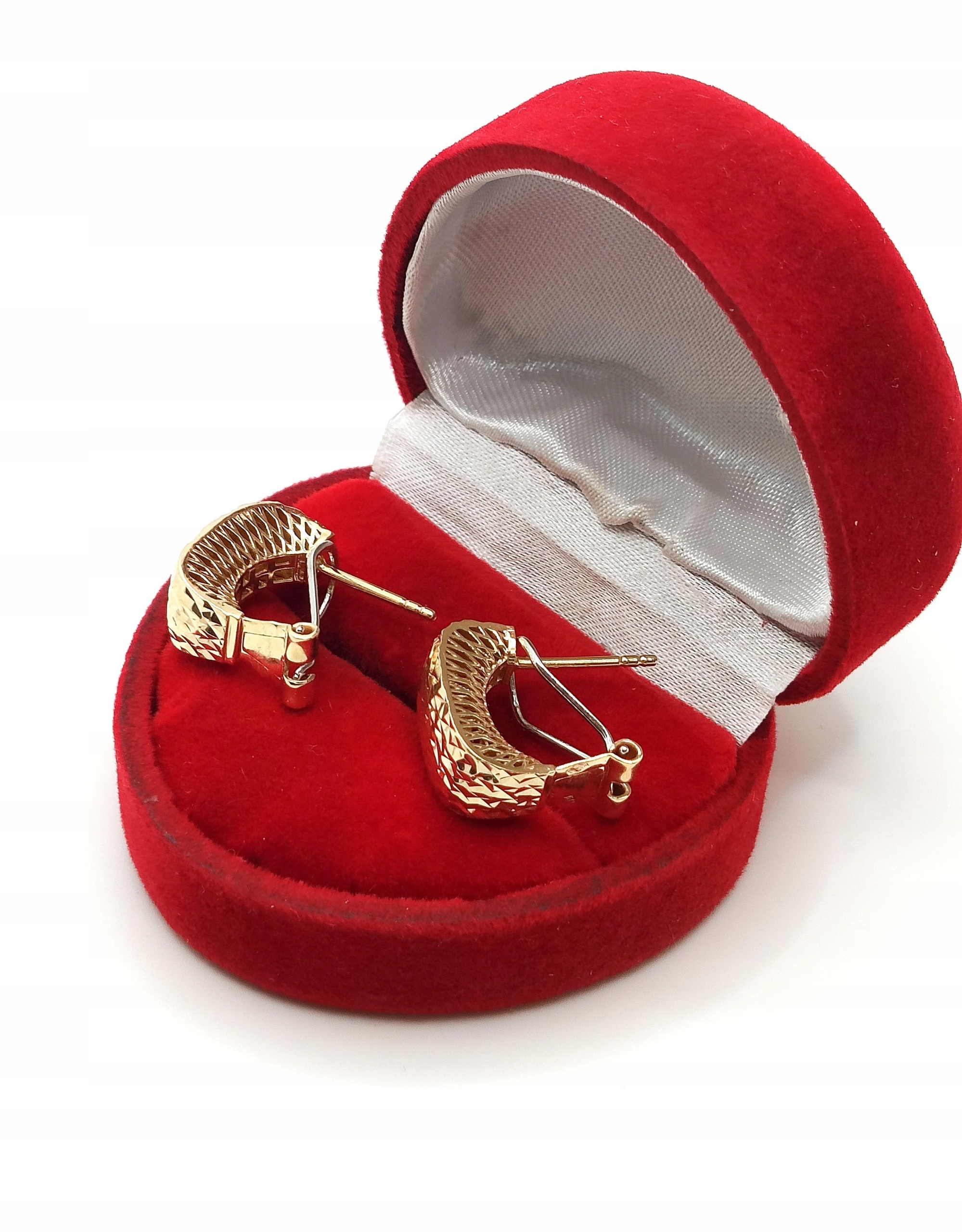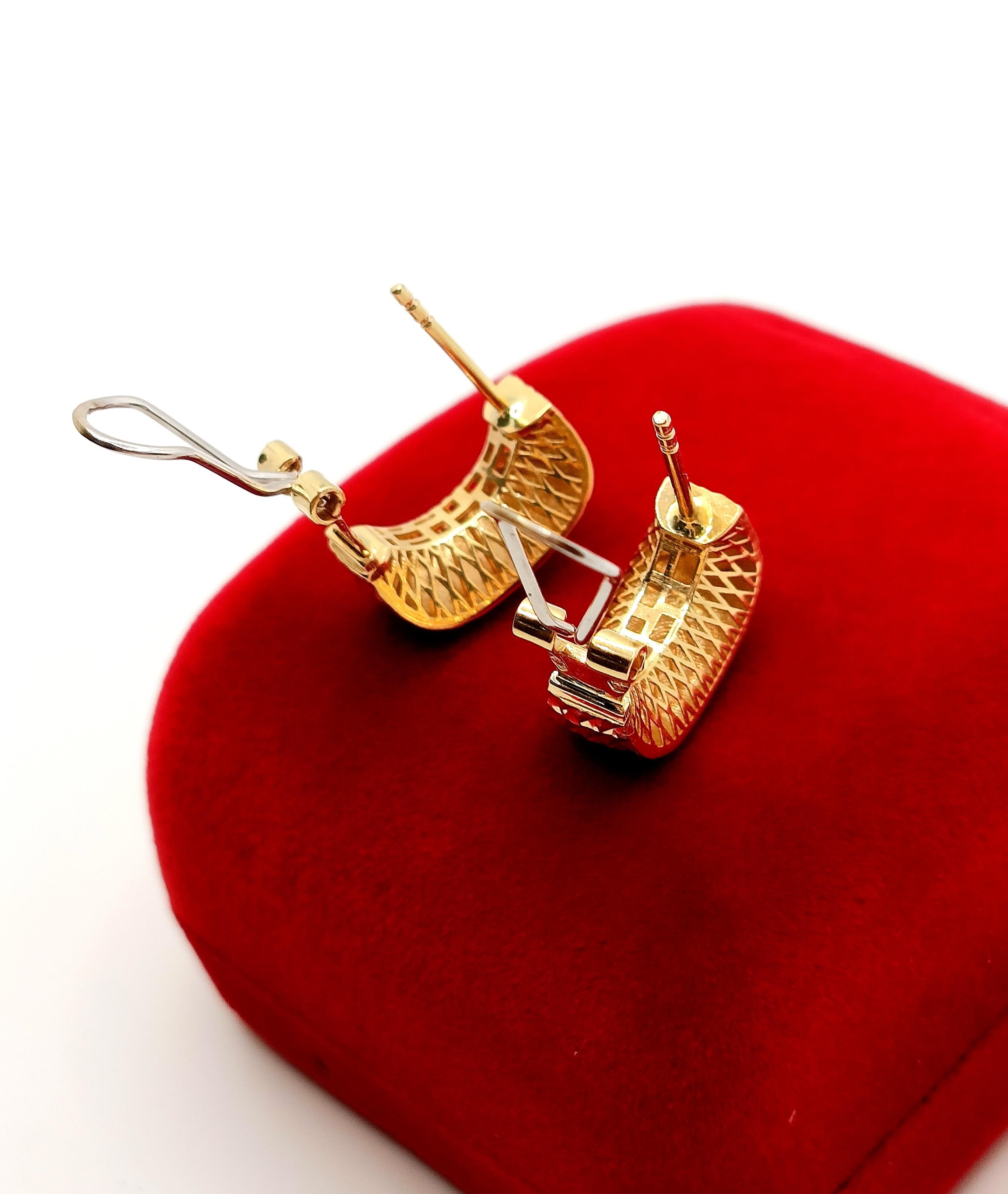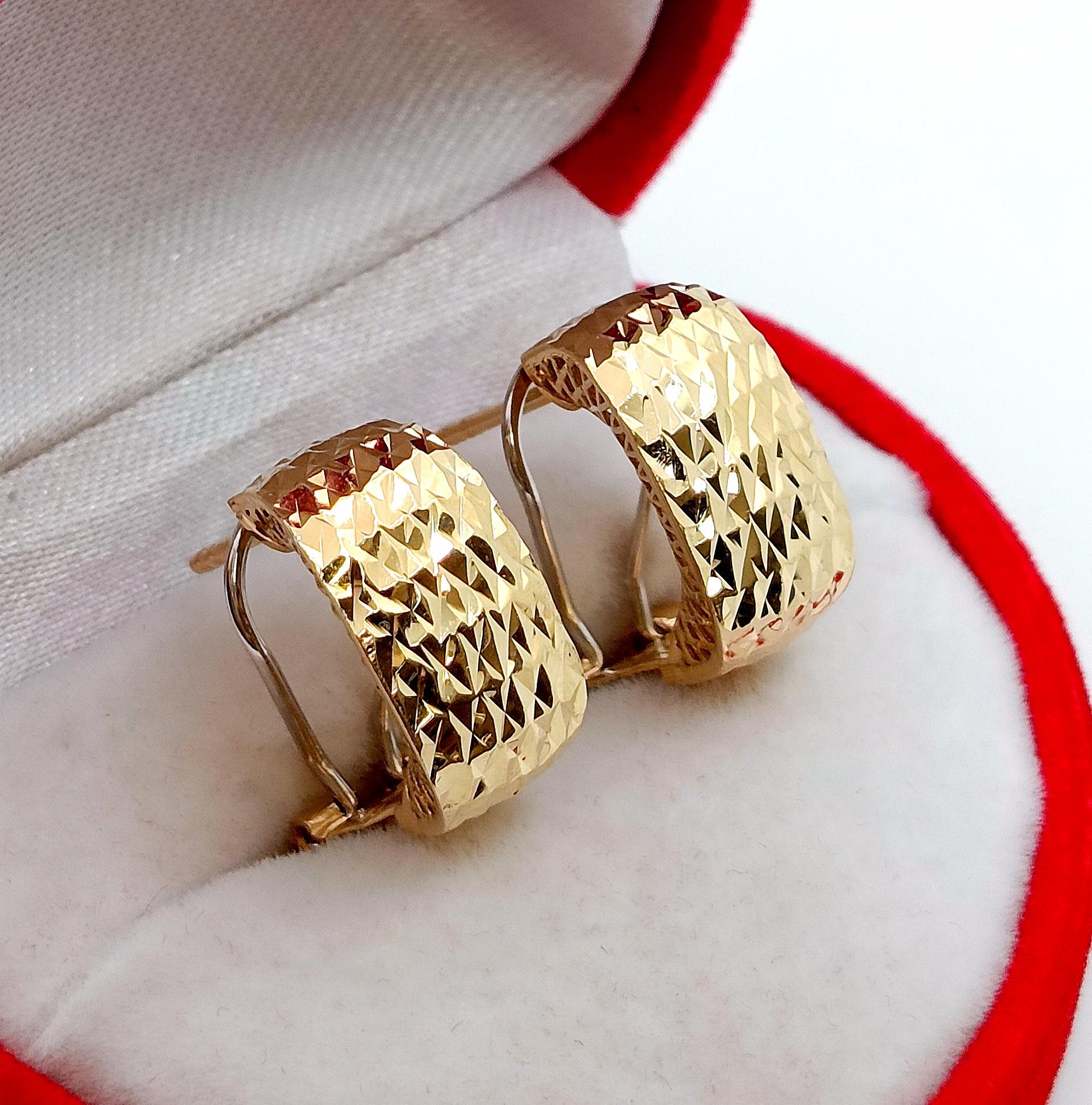 W ofercie na sprzedaż mamy dla Państwa złote kolczyki , Prostokąty zdobione żłobieniami na powierzchni. pięknie się mienią. Z tyłu kolczyki maja również piękne ażurowe zdobienie ze złota.