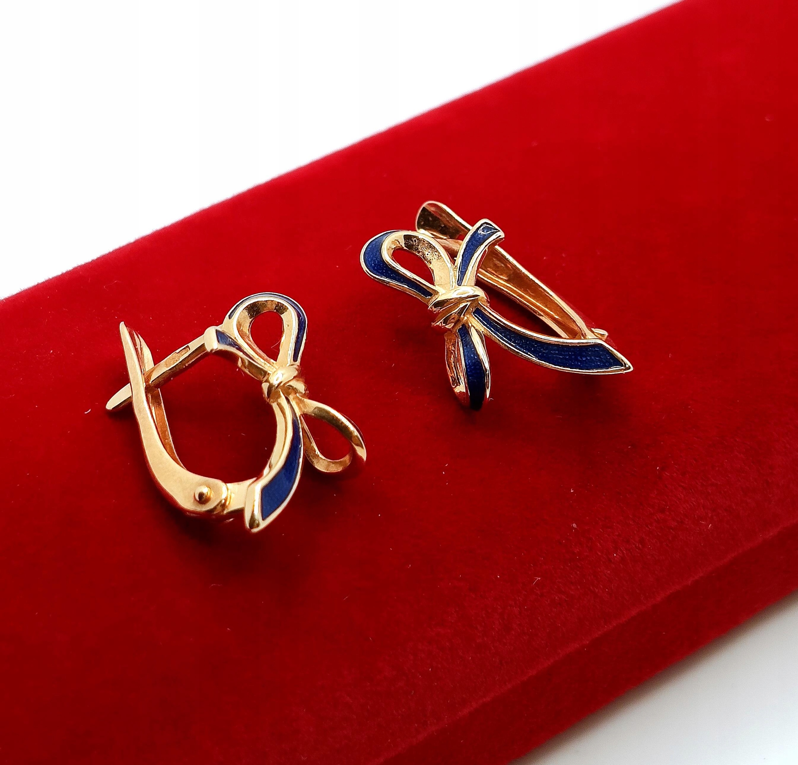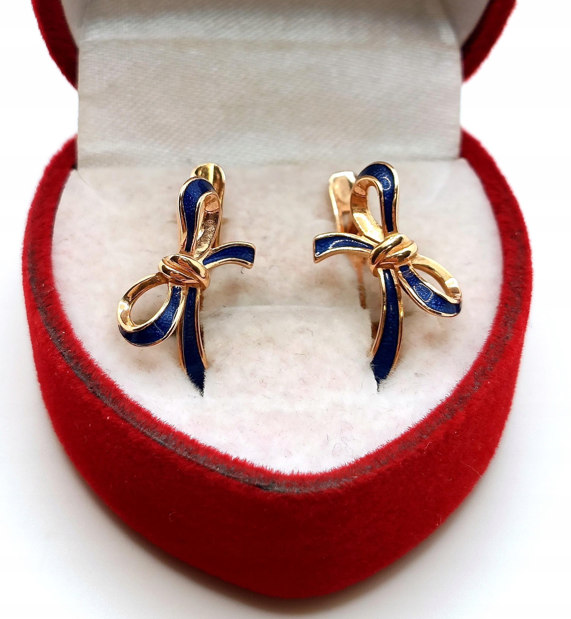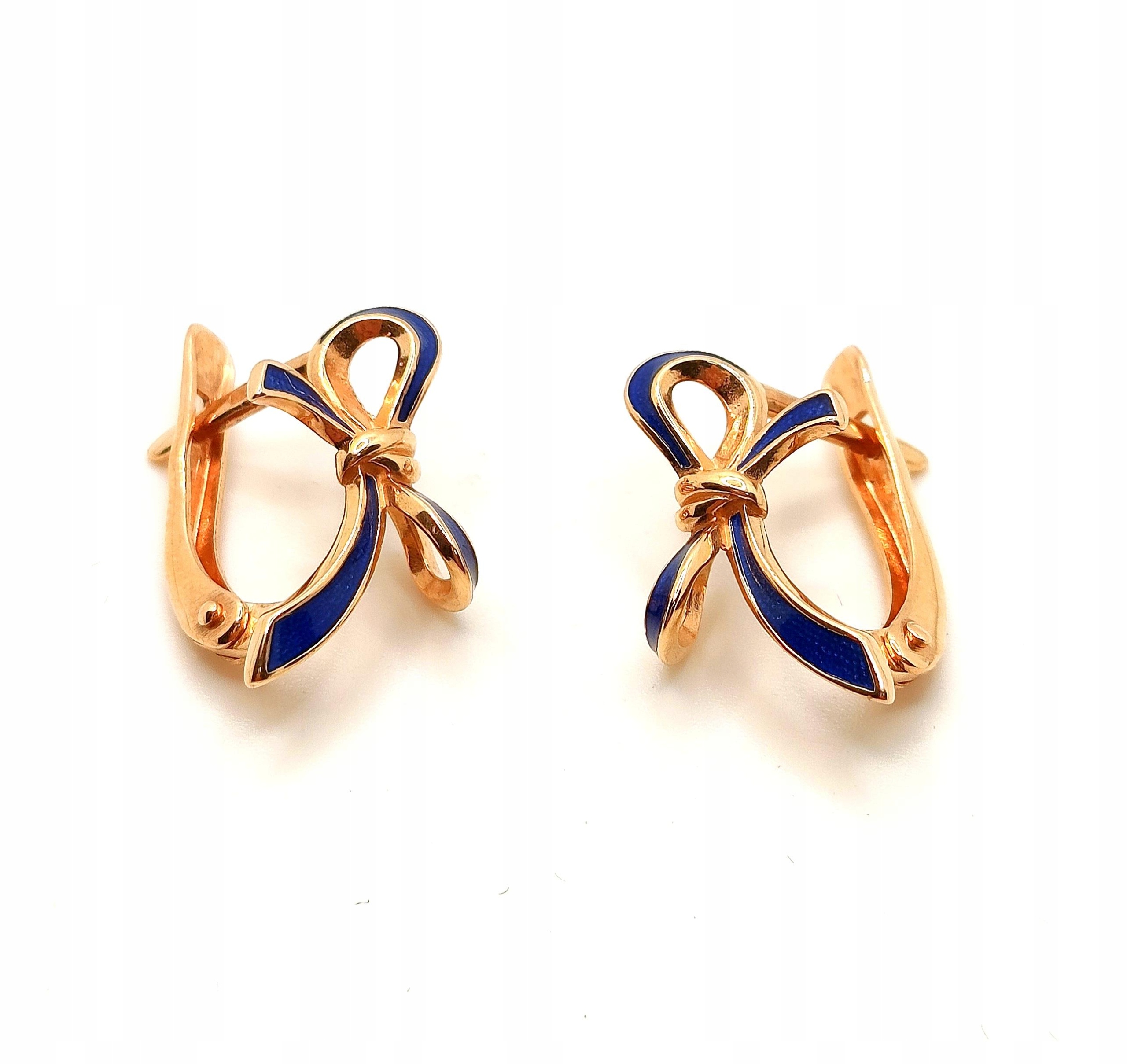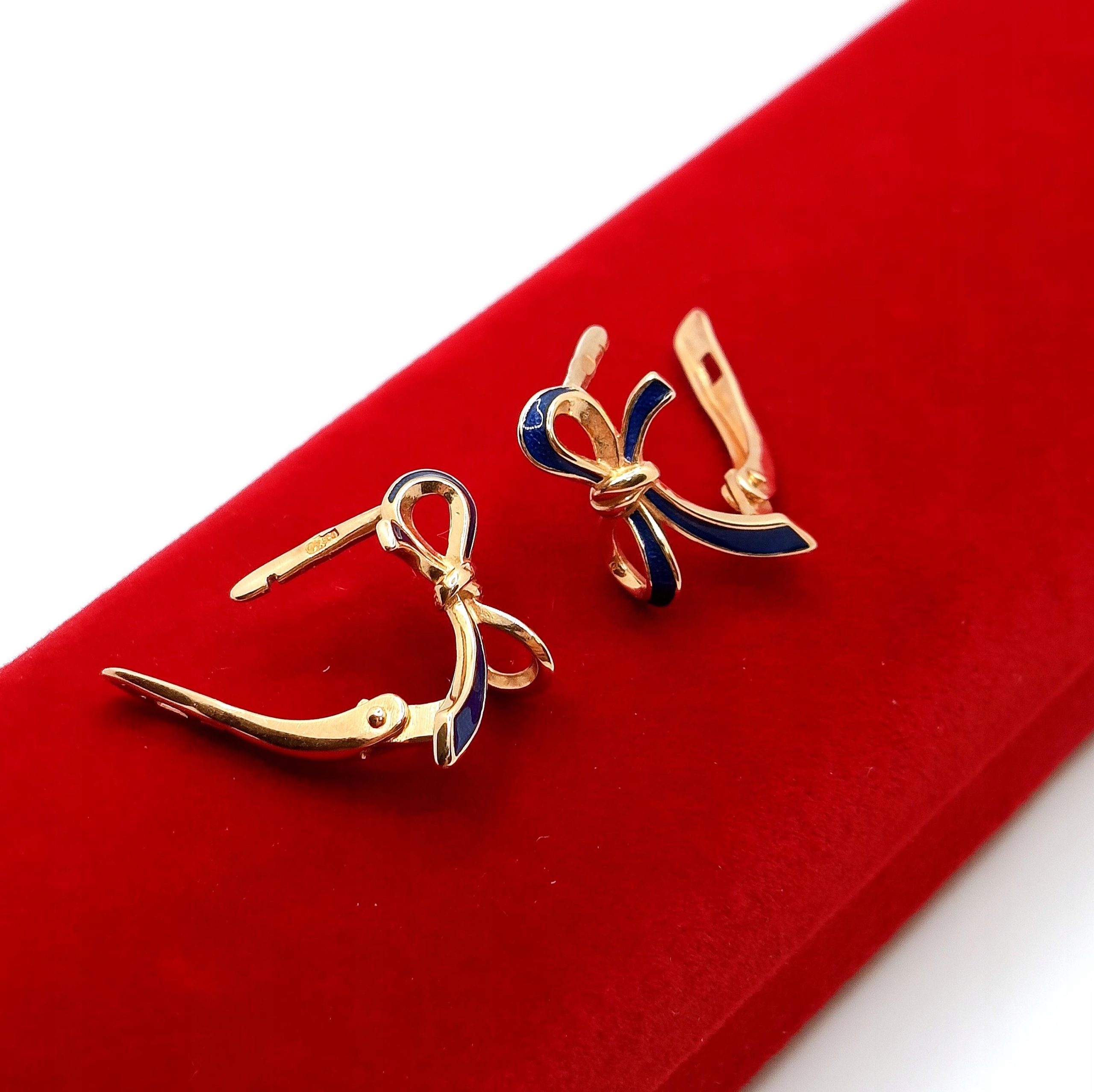 W ofercie na sprzedaż mamy dla Państwa urocze złote kolczyki , kokardki malowane niebieską emalią.
