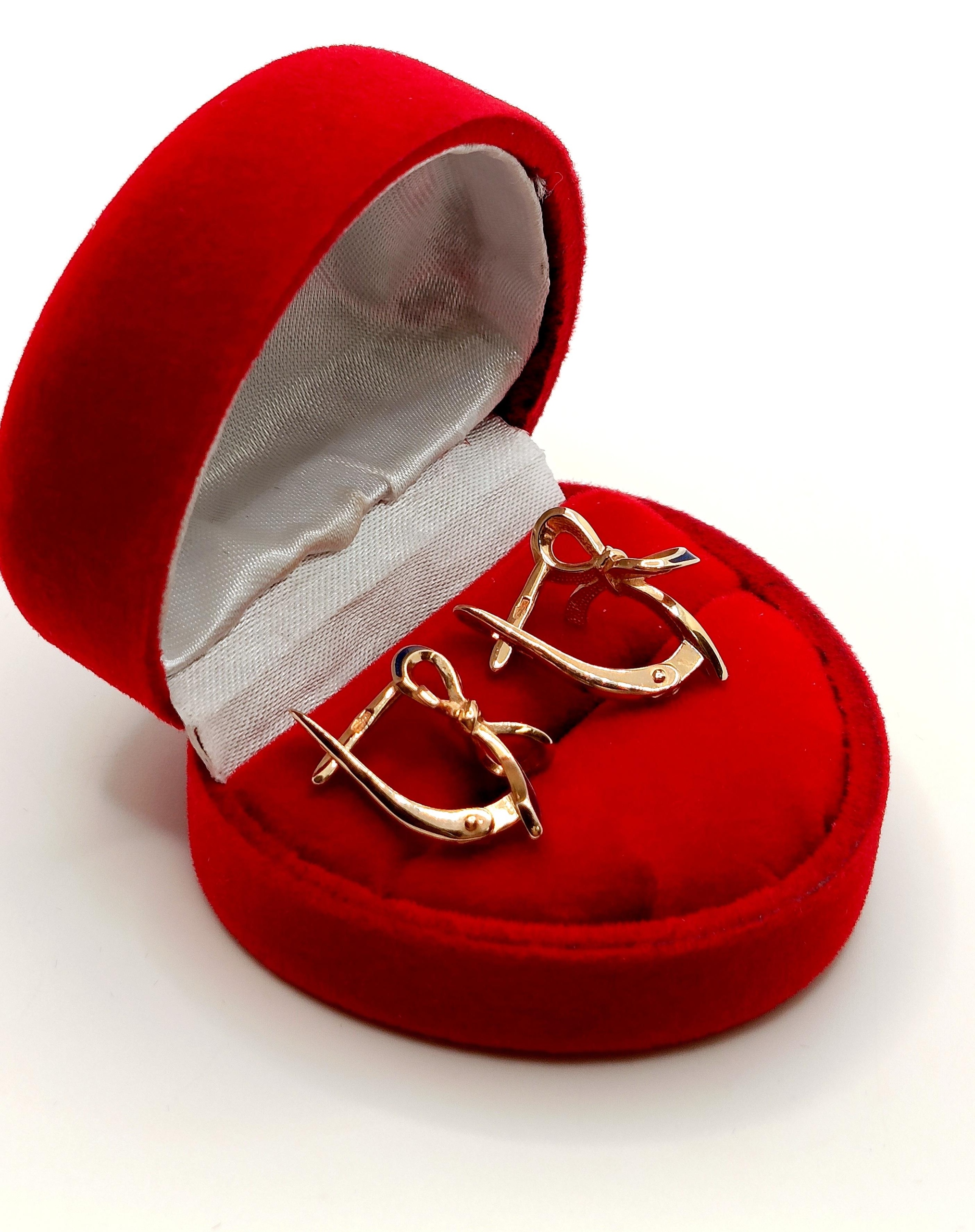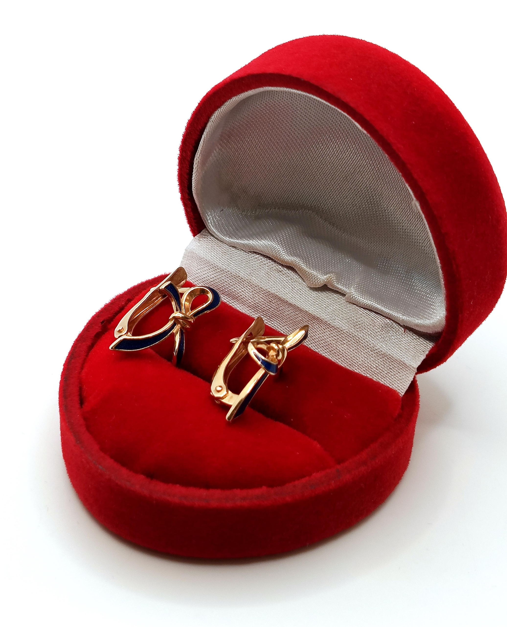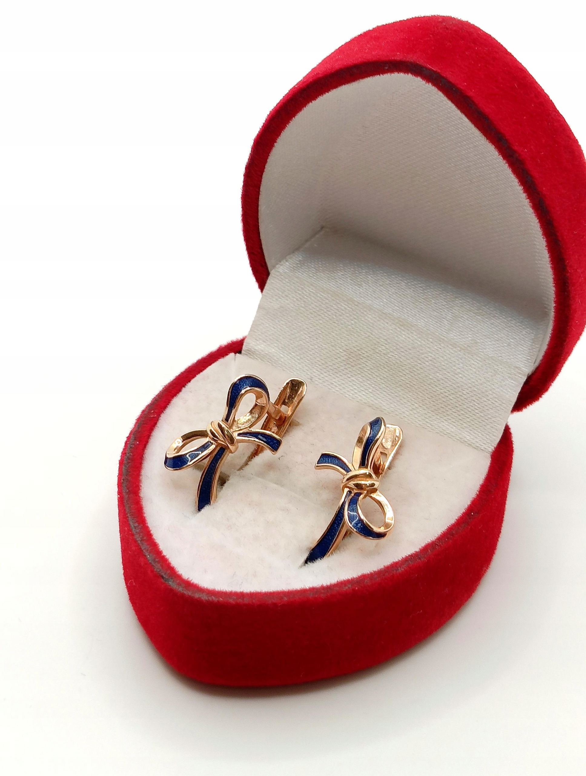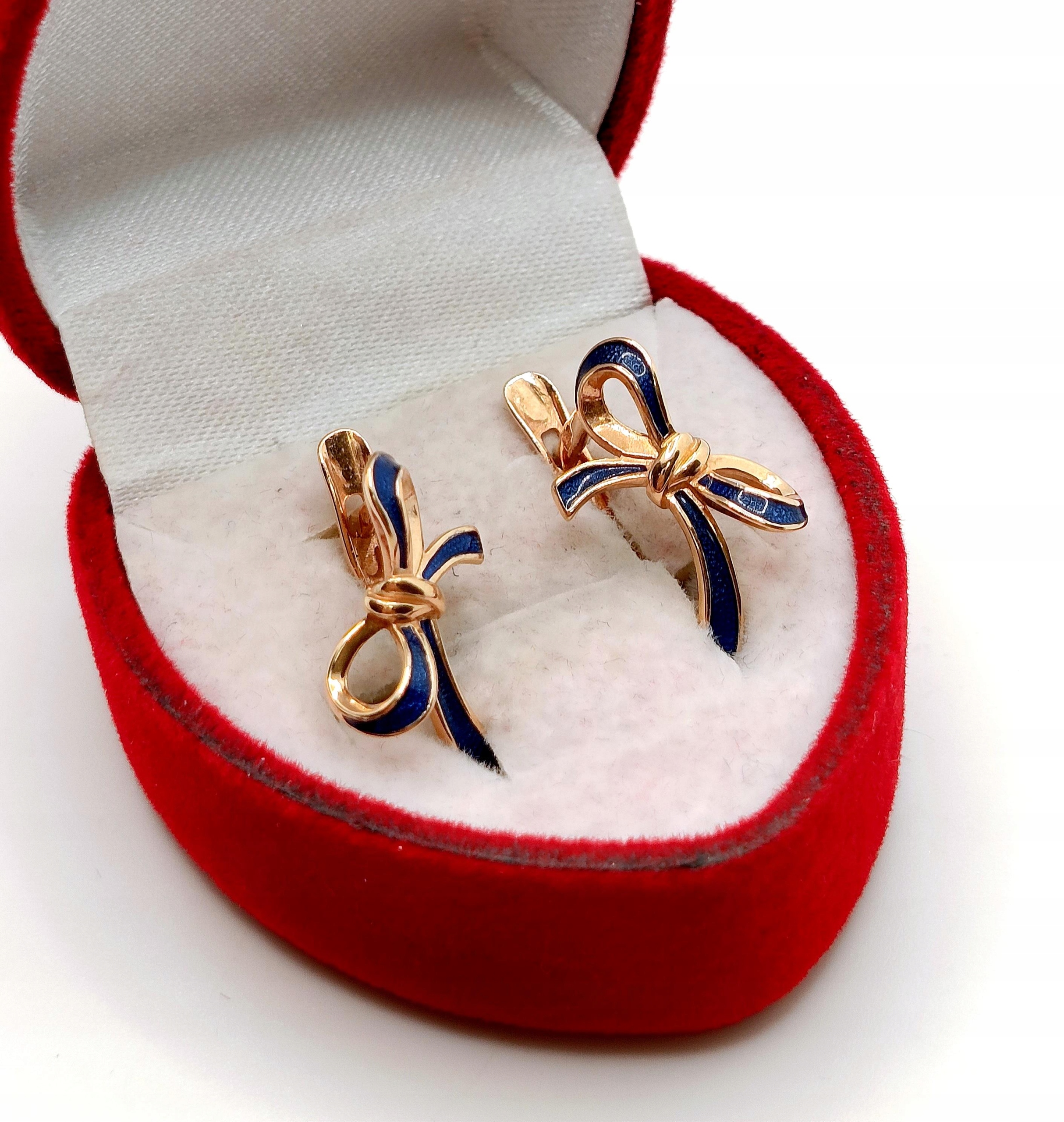 W ofercie na sprzedaż mamy dla Państwa urocze złote kolczyki , kokardki malowane niebieską emalią.