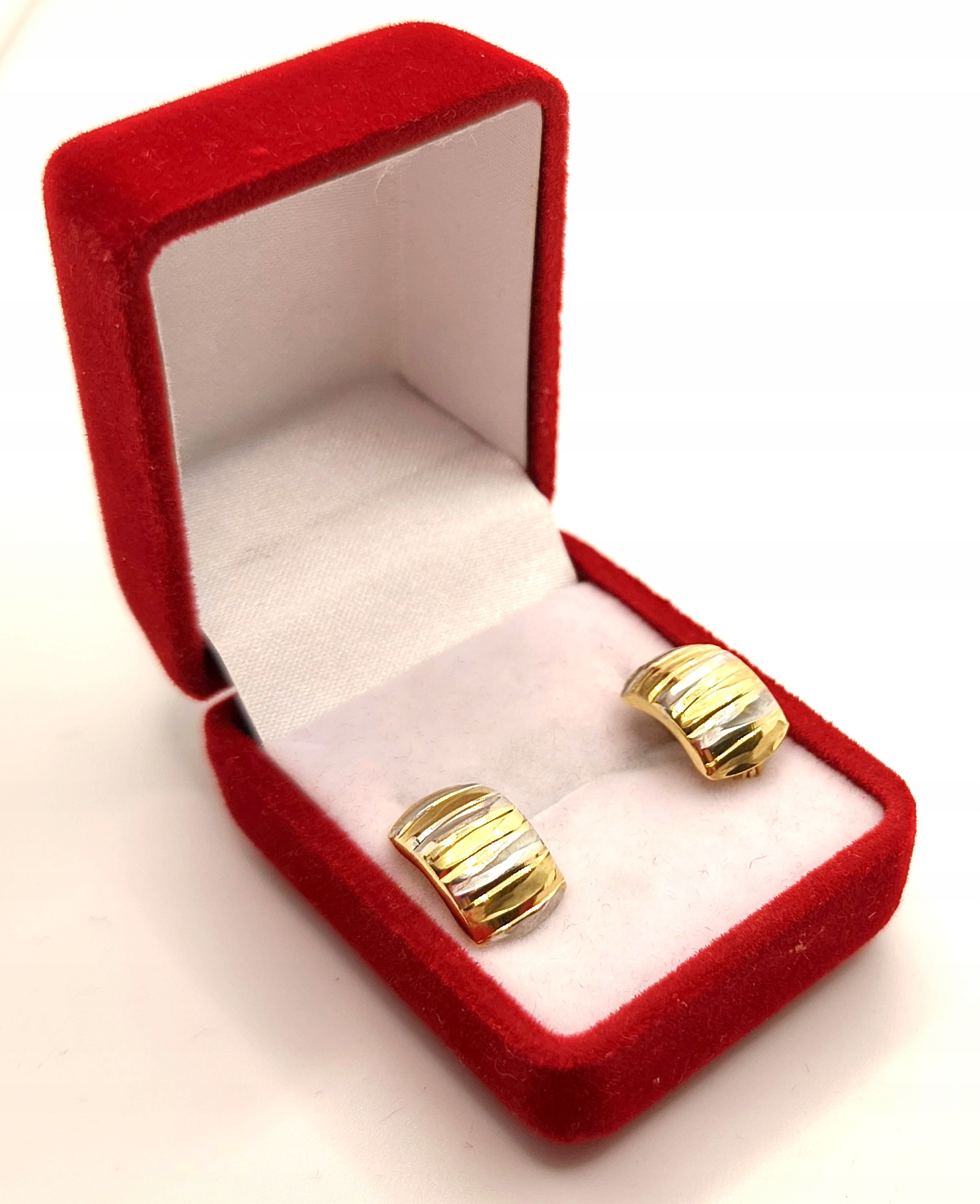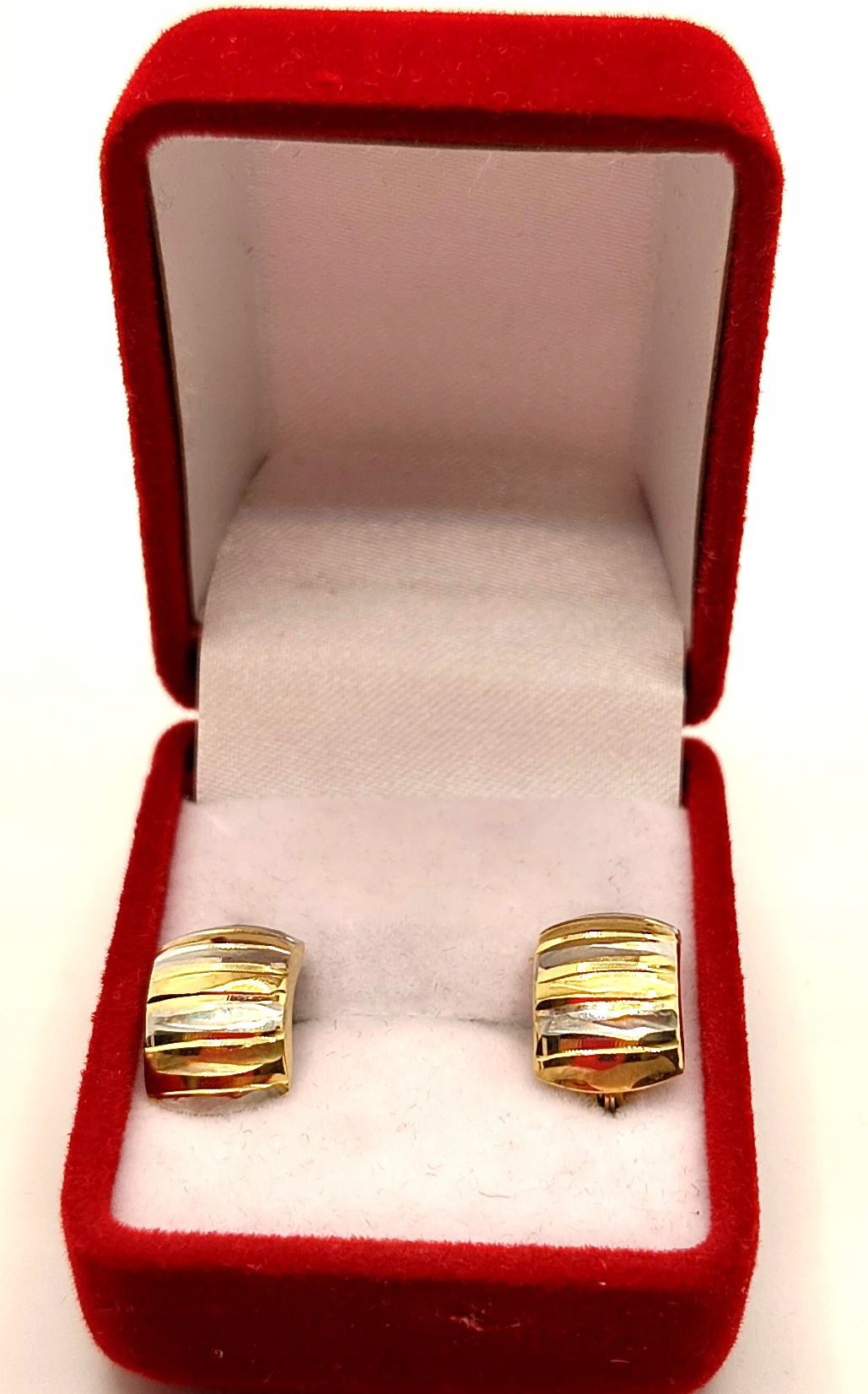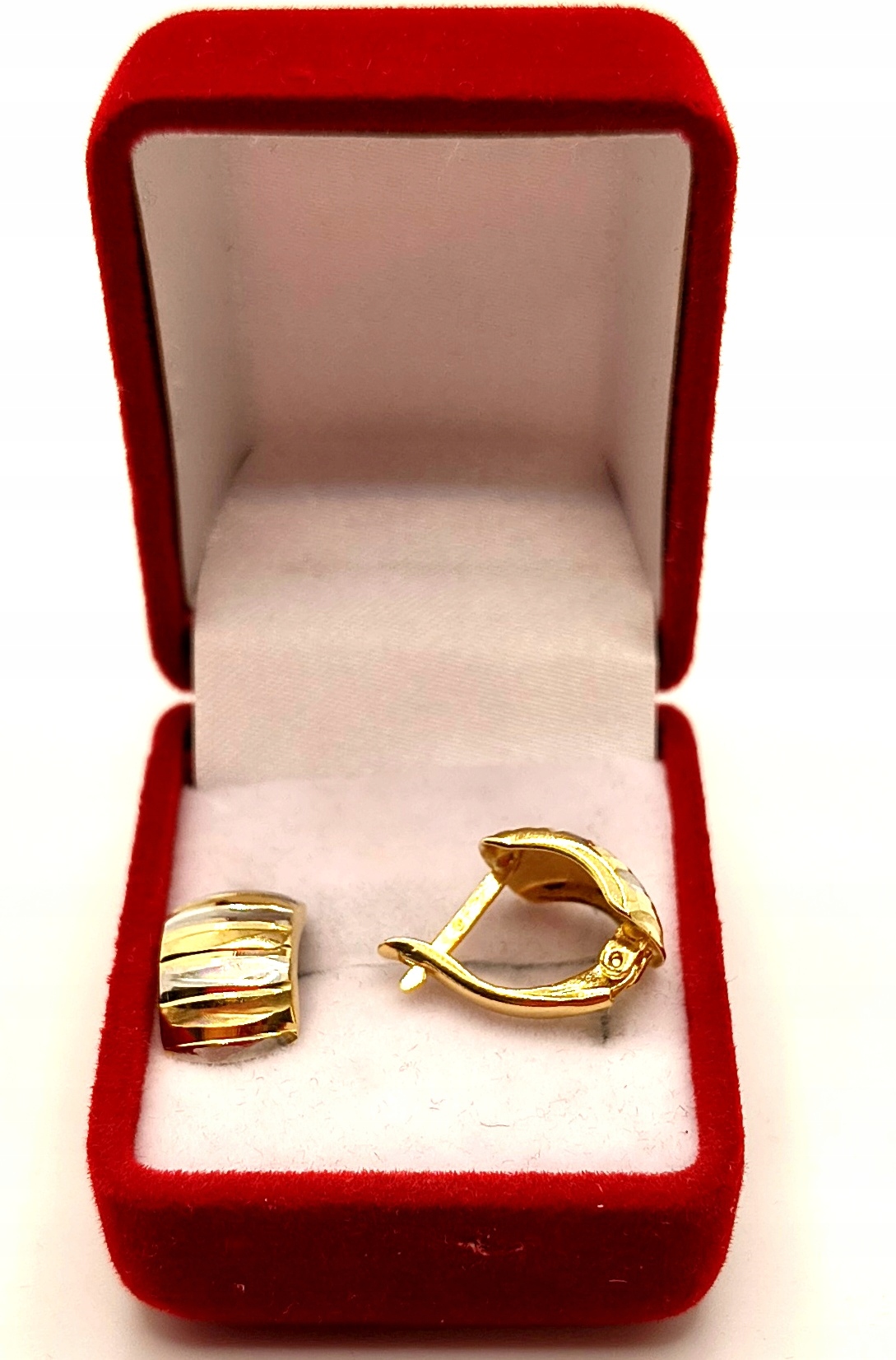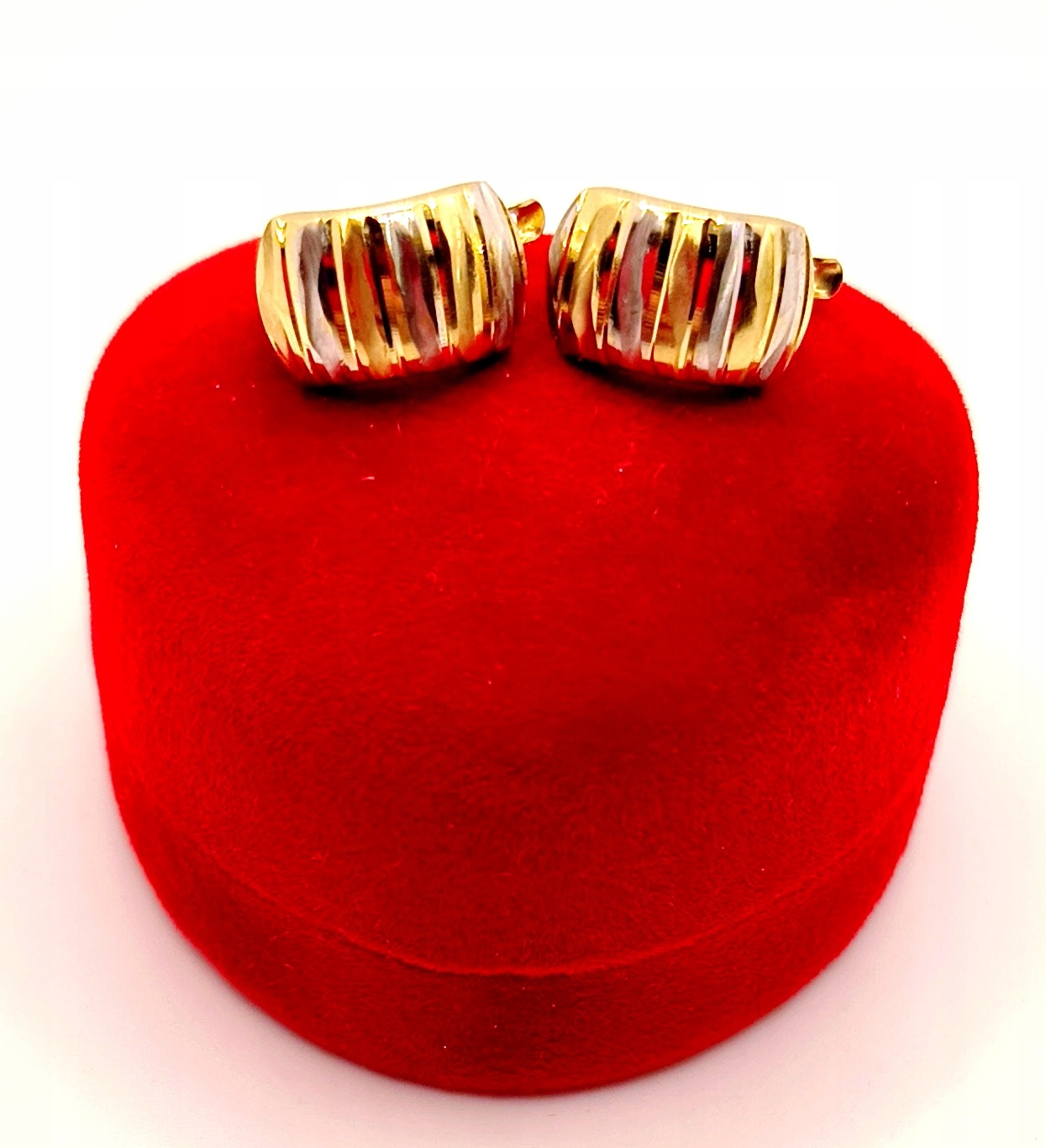 Oferujemy na sprzedaż piękne, złote kolczyki ozdobione wzorem przypominającym paski.