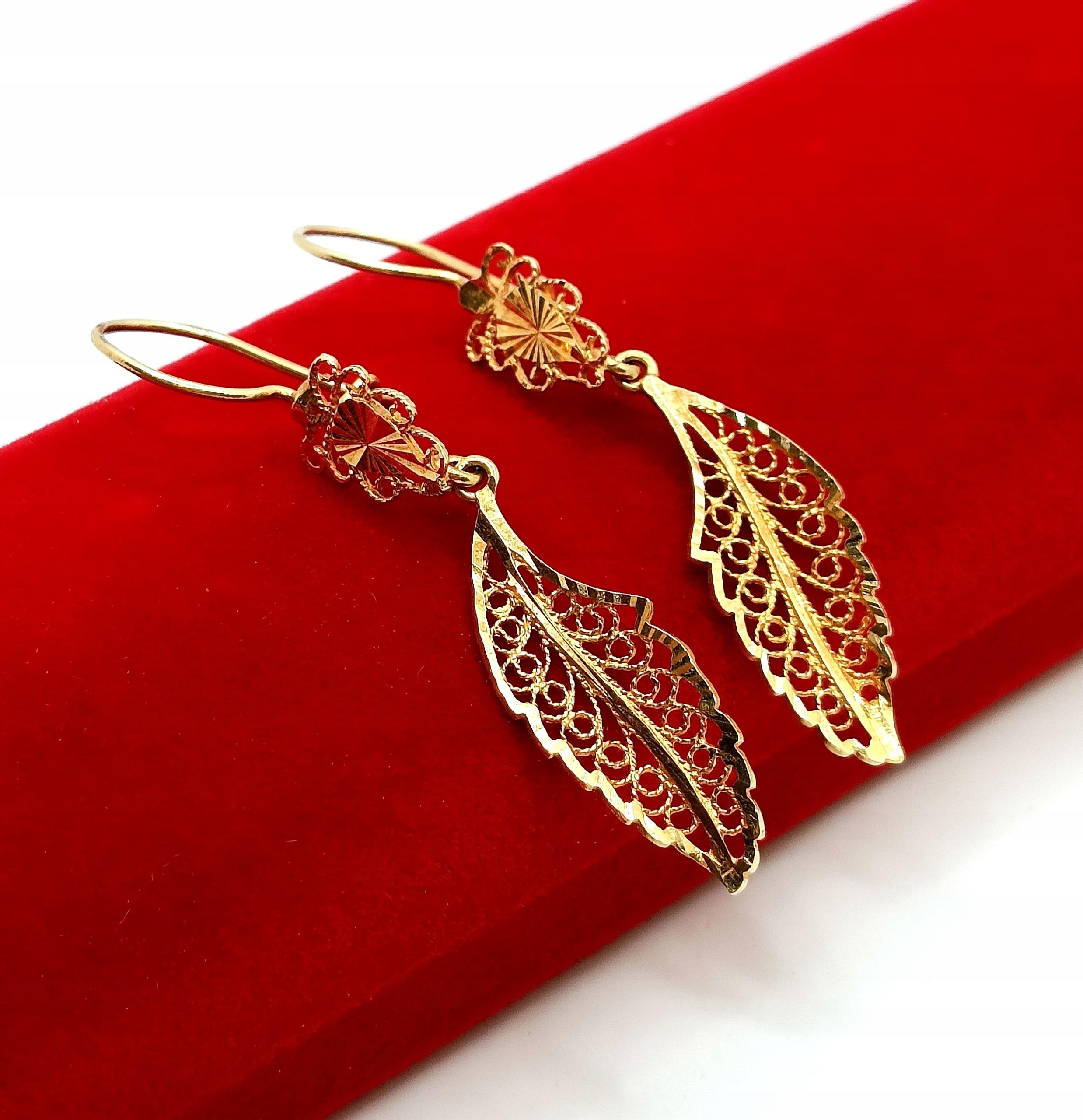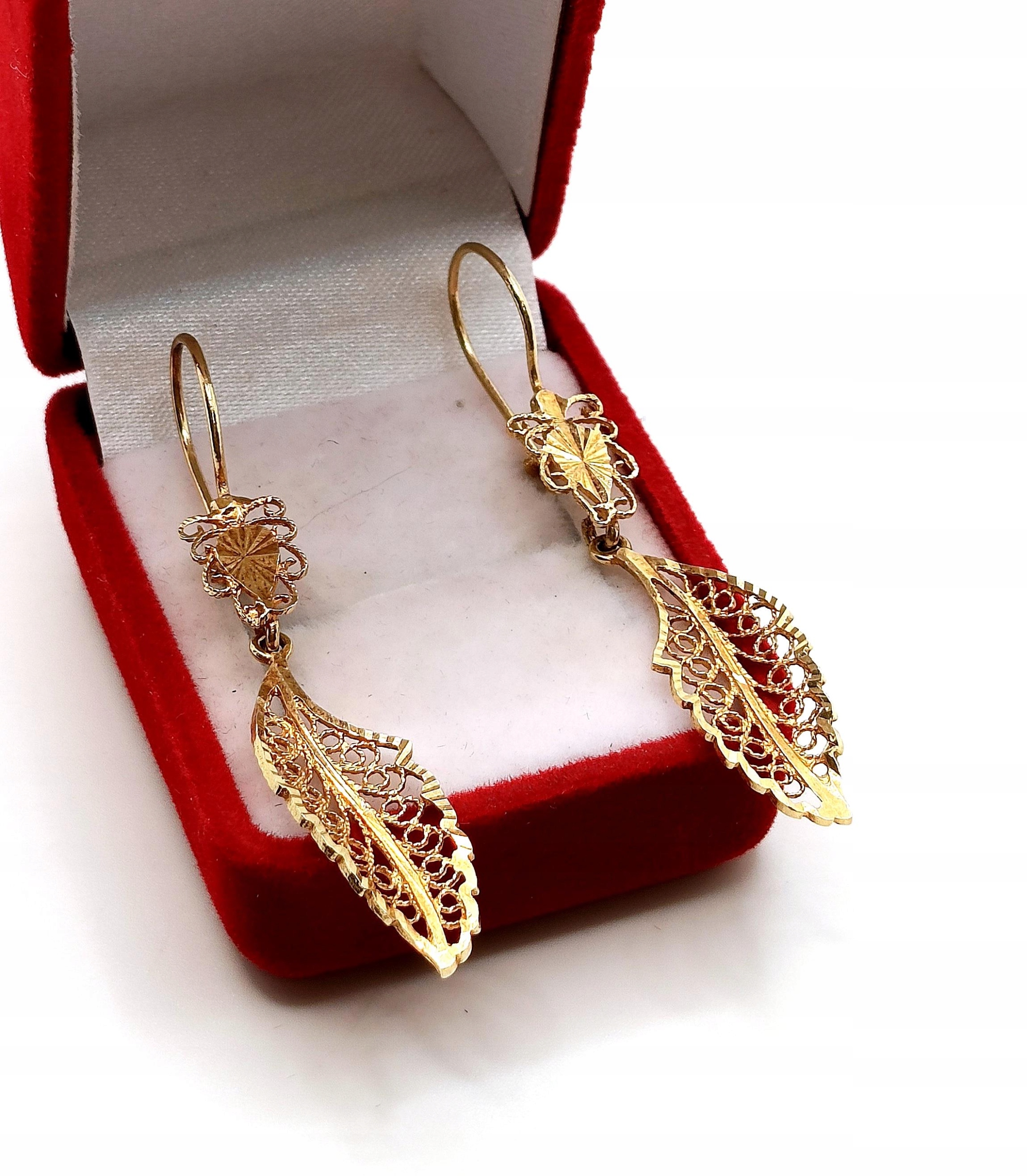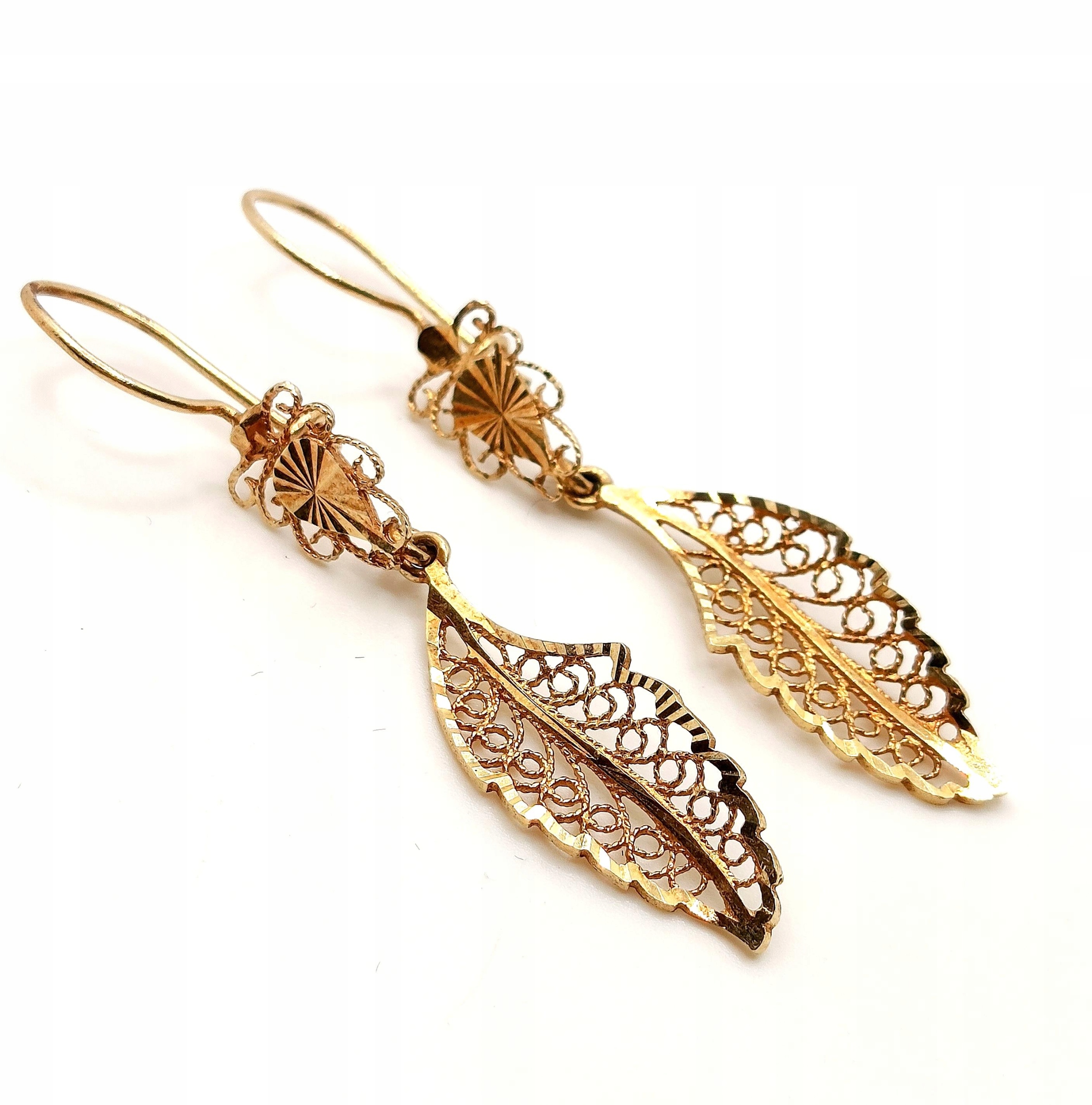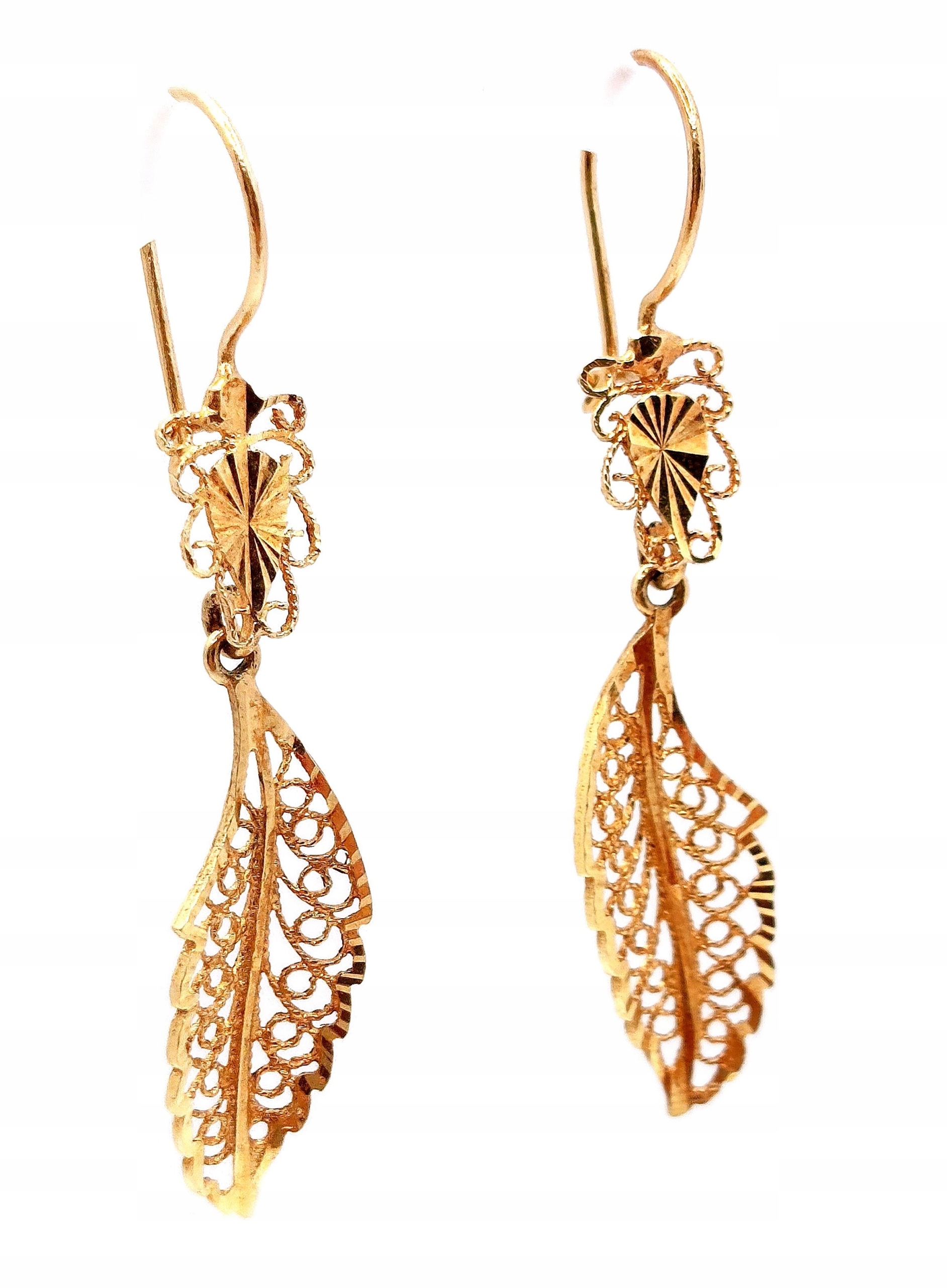 W ofercie na sprzedaż mamy dla Państwa złote kolczyki , długie ze zdobieniem ażurowym w formie liści.