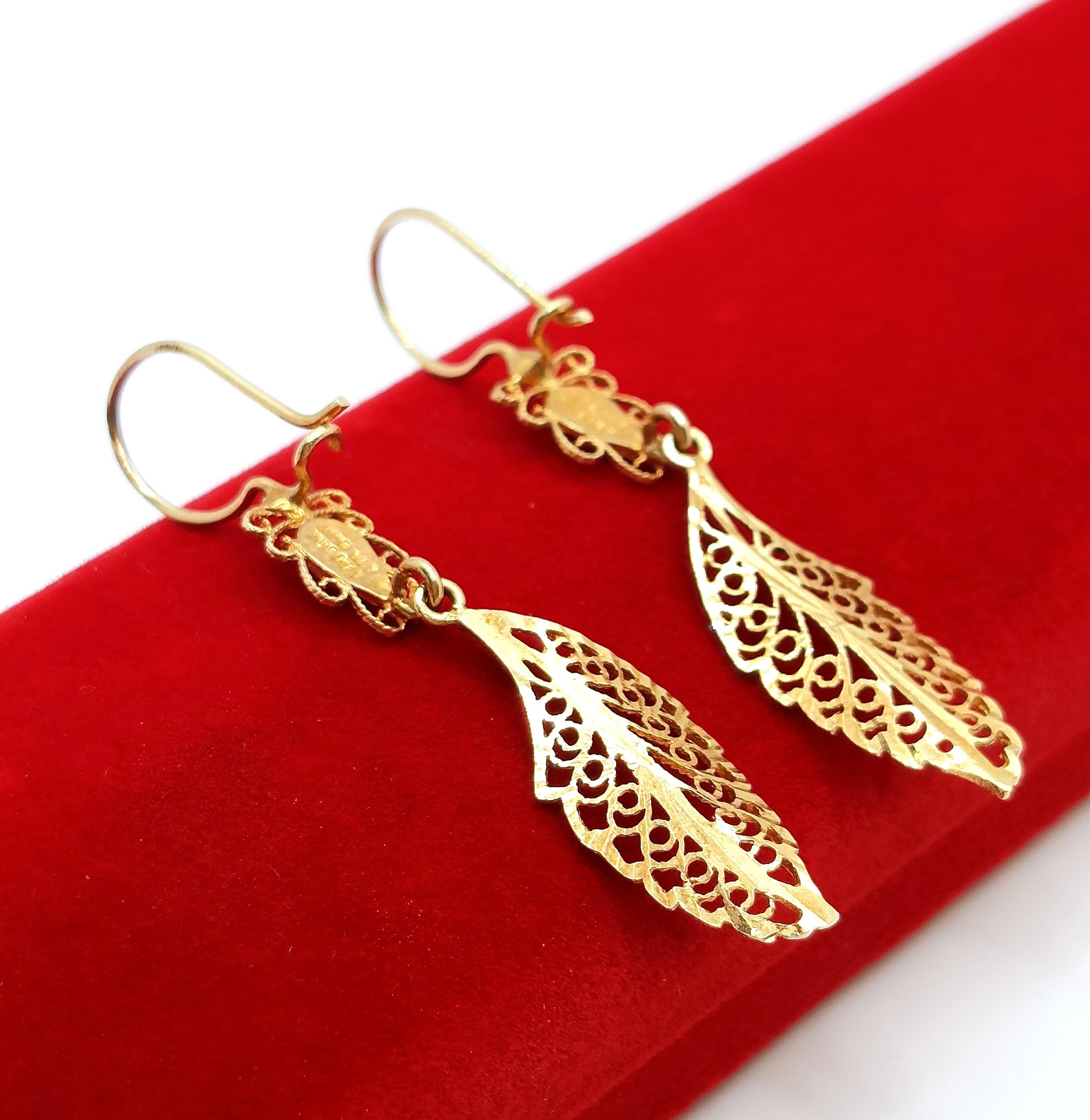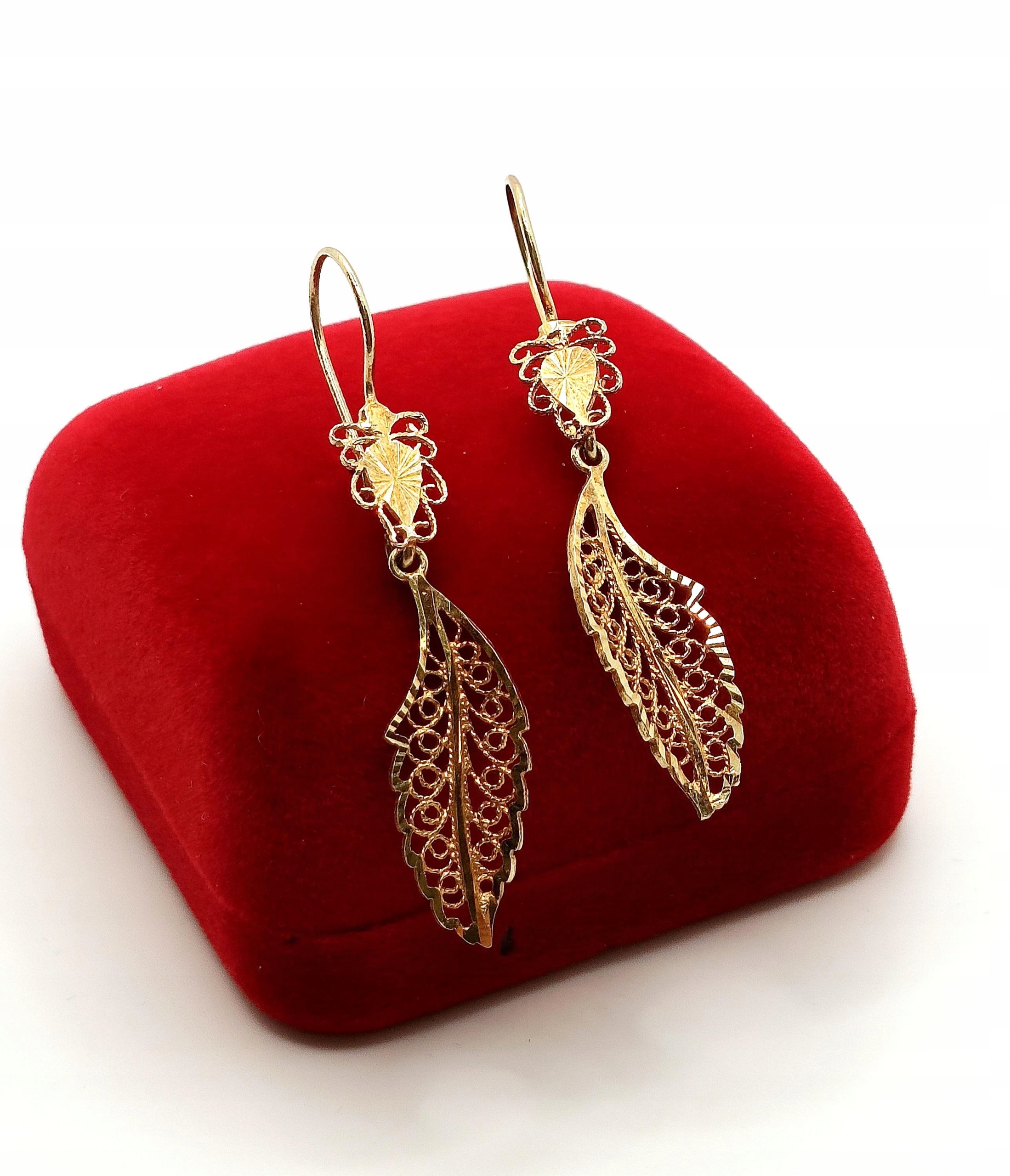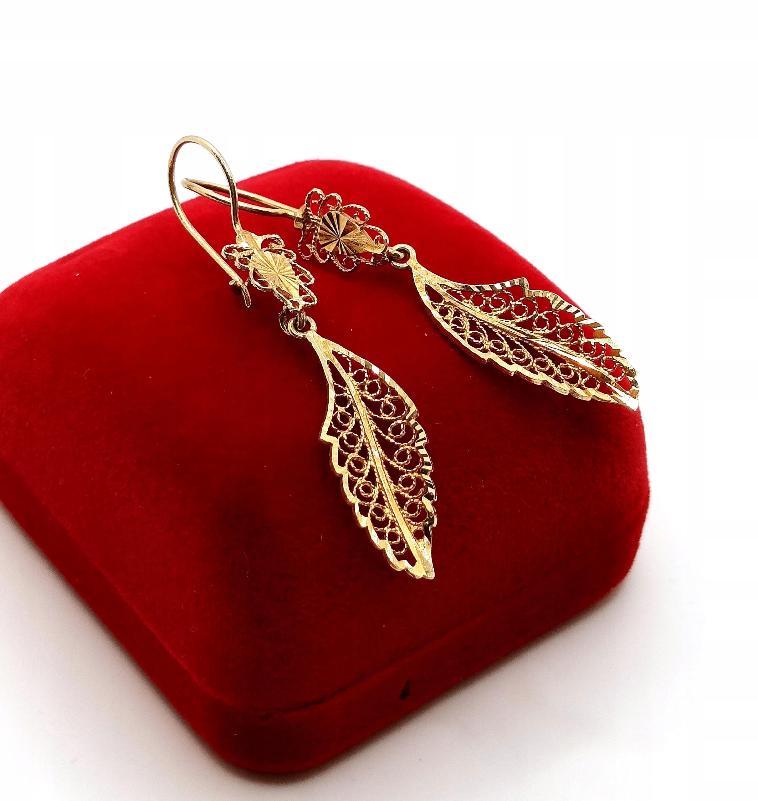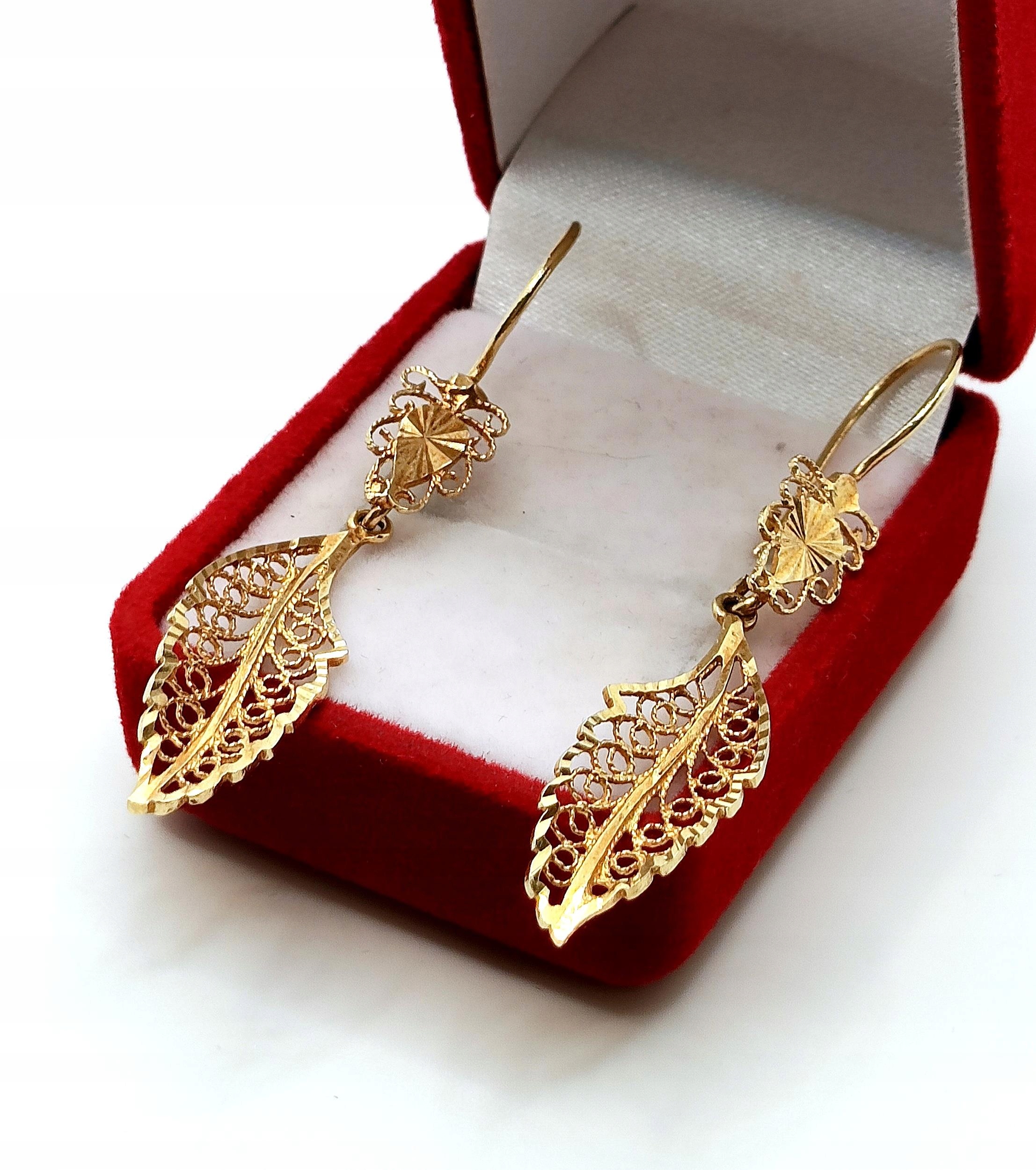 W ofercie na sprzedaż mamy dla Państwa złote kolczyki , długie ze zdobieniem ażurowym w formie liści.