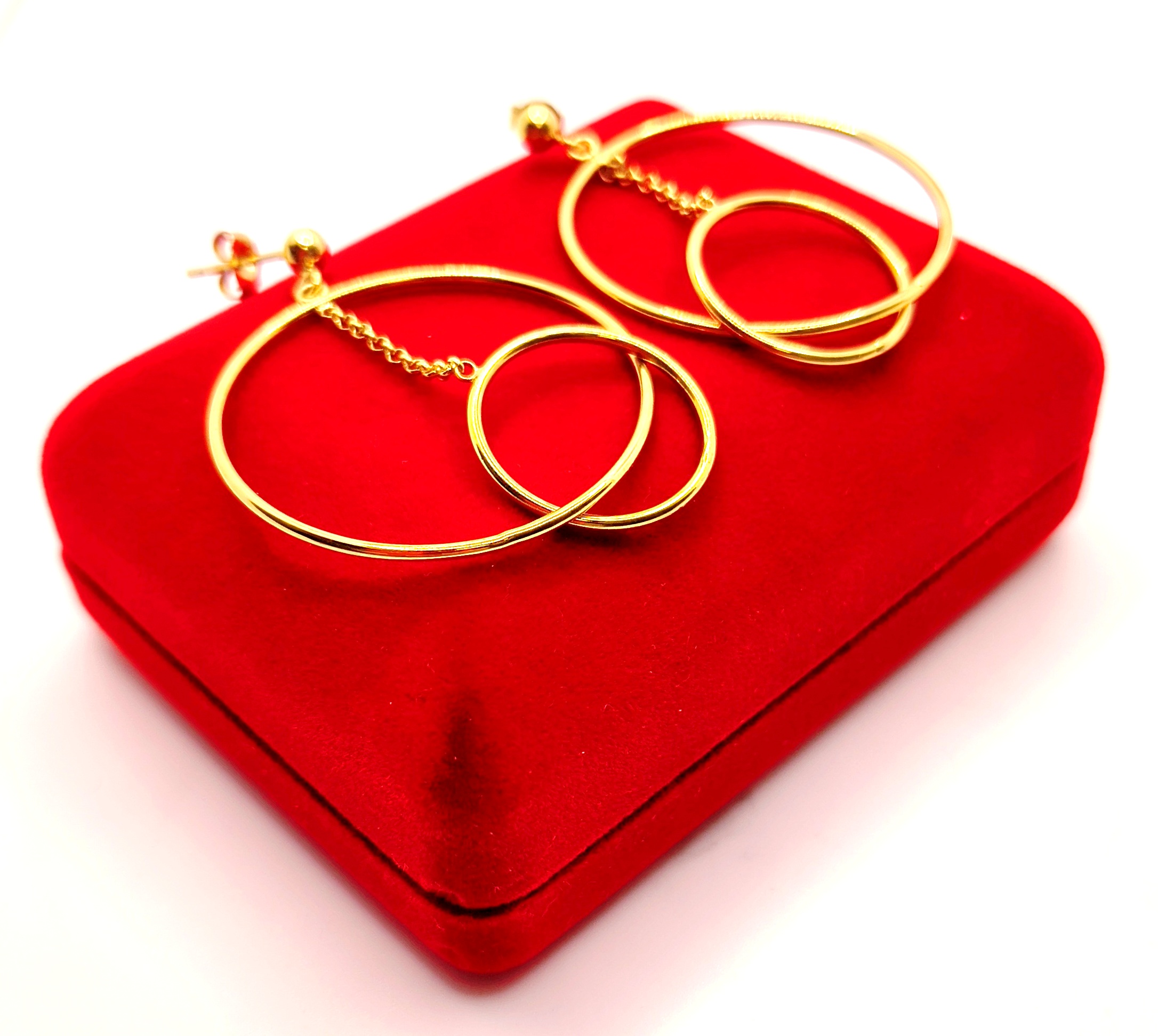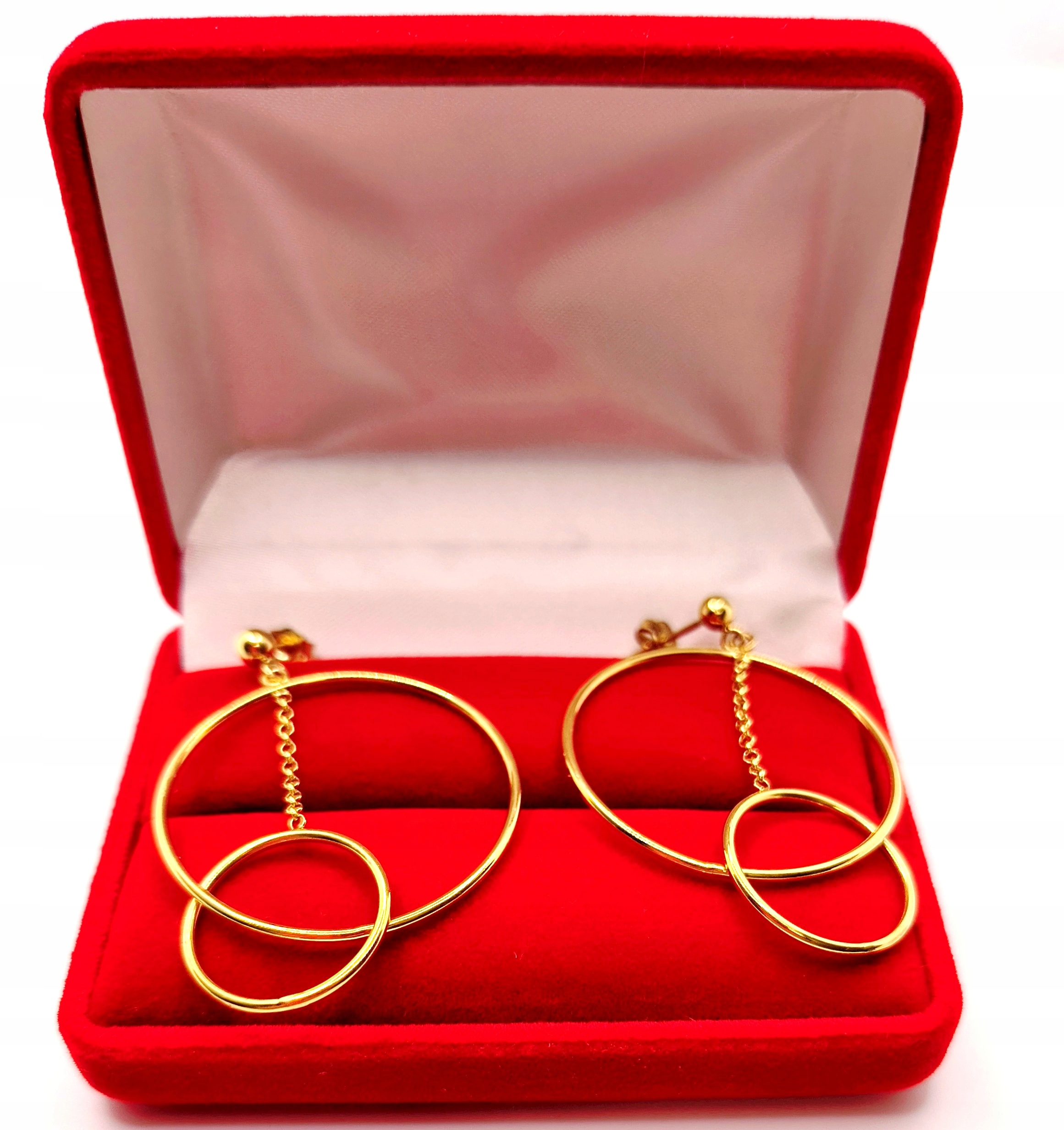 W ofercie na sprzedaż mamy dla państwa piękne, złote, wiszące kolczyki w kształcie dwóch przeplatających się kółek.