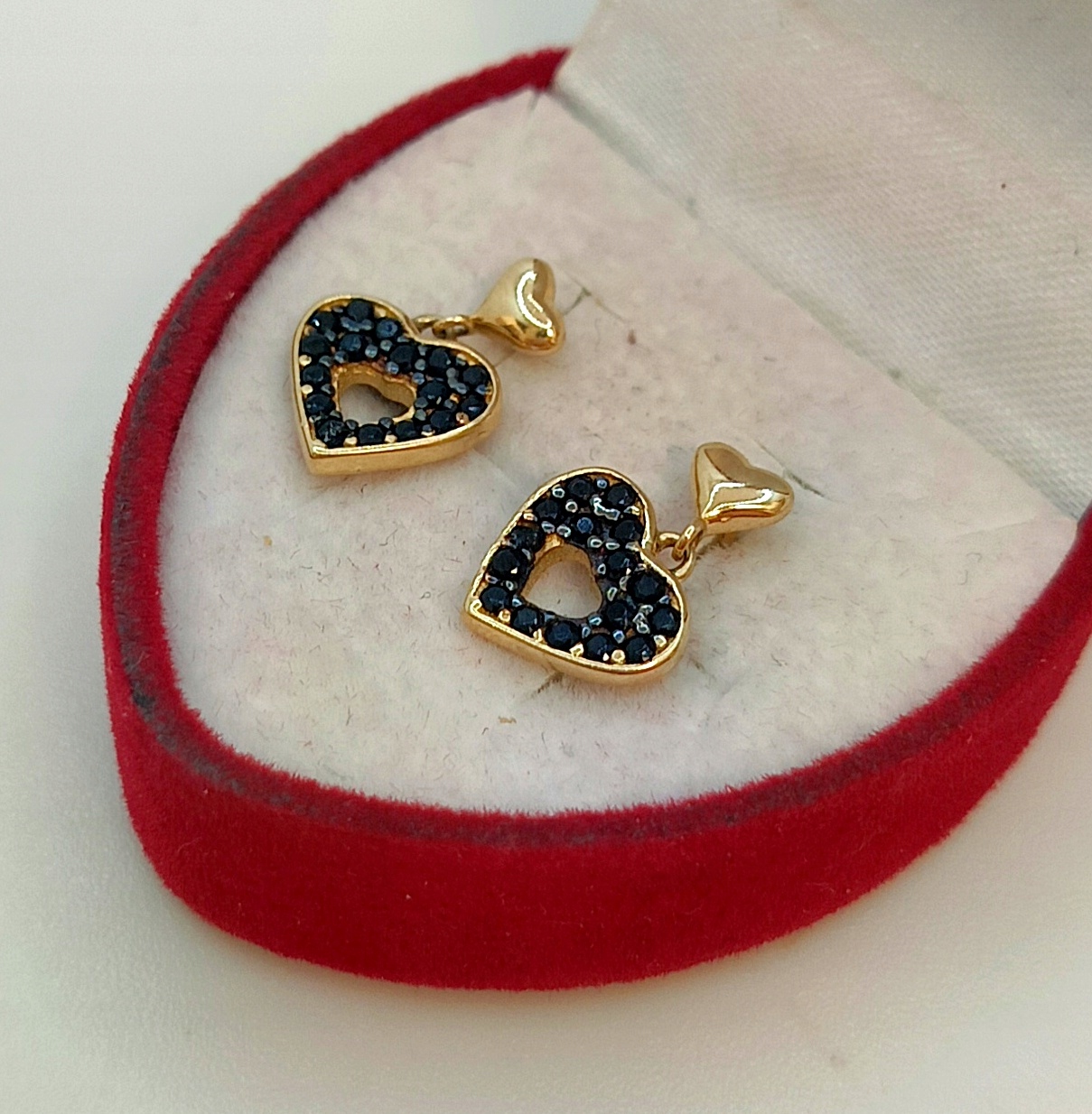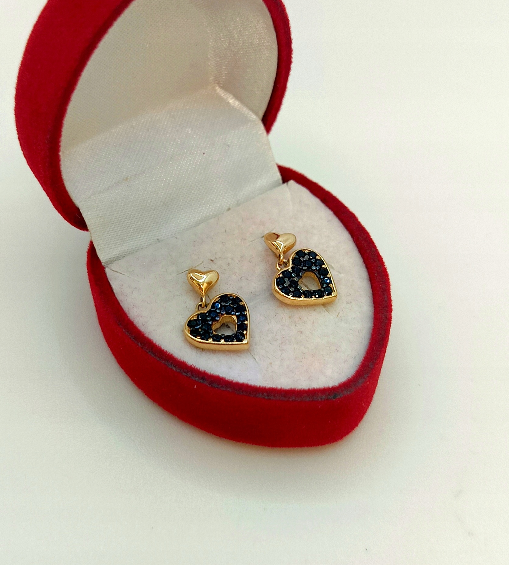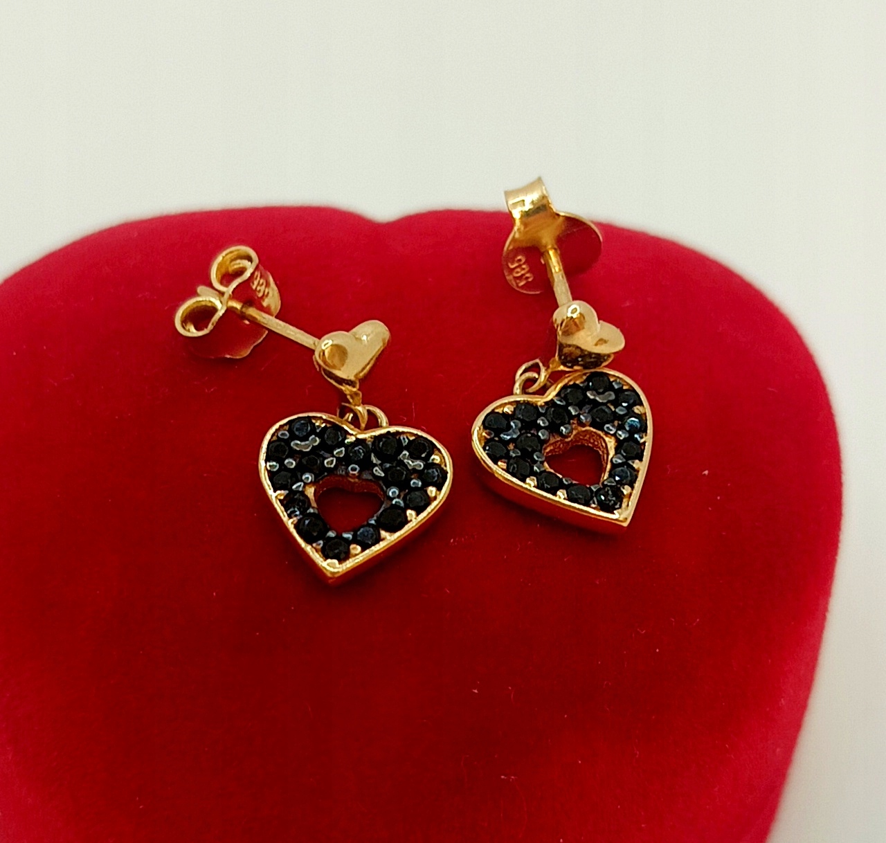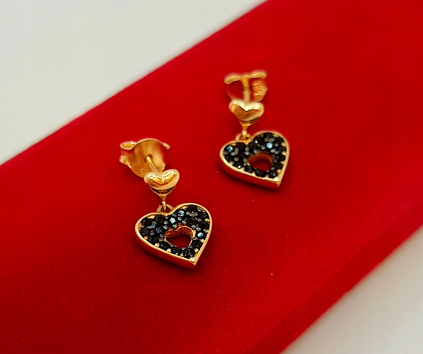 W ofercie na sprzedaż mamy dla Państwa , złote kolczyki serca zdobione czarnymi cyrkoniami.