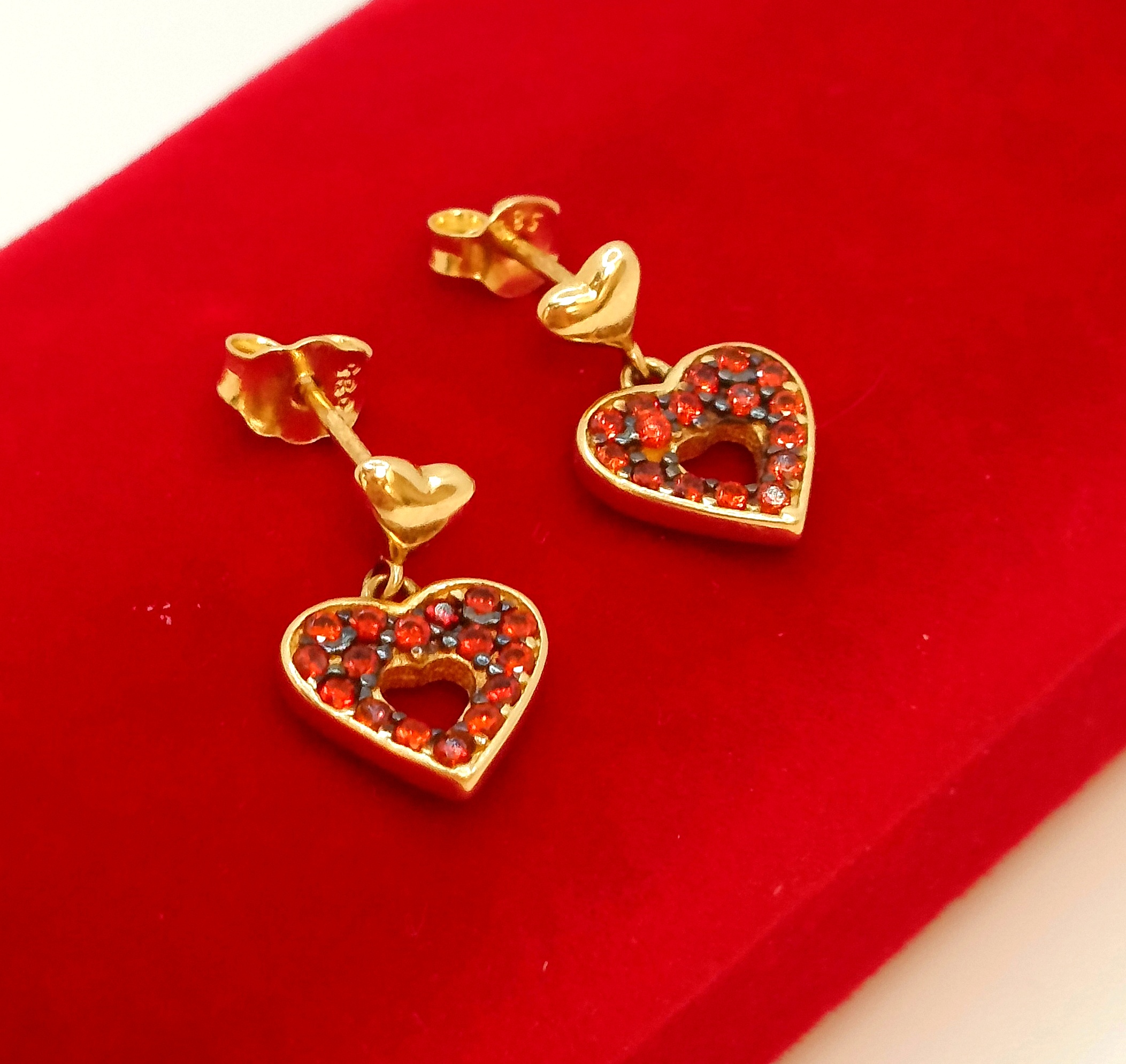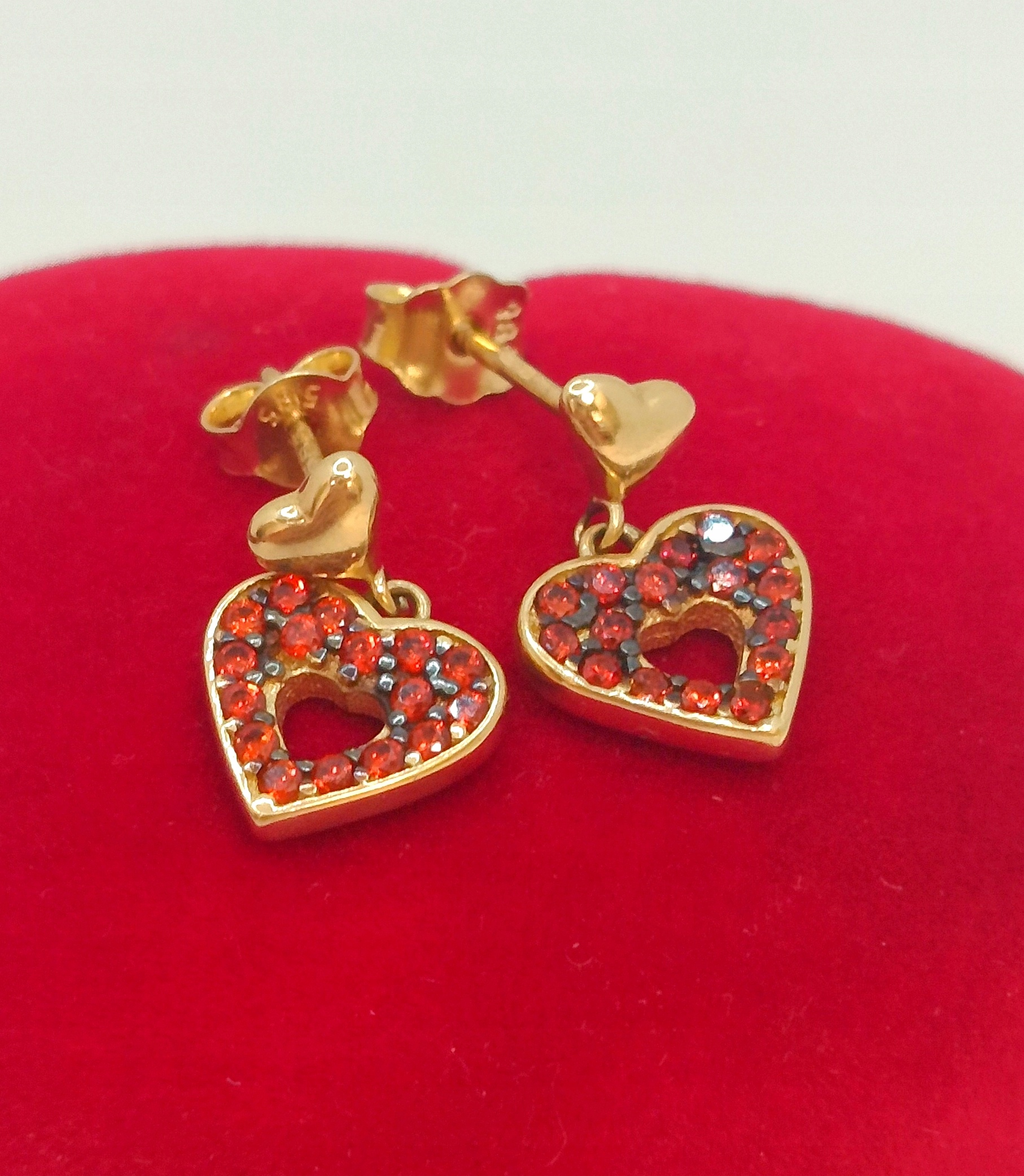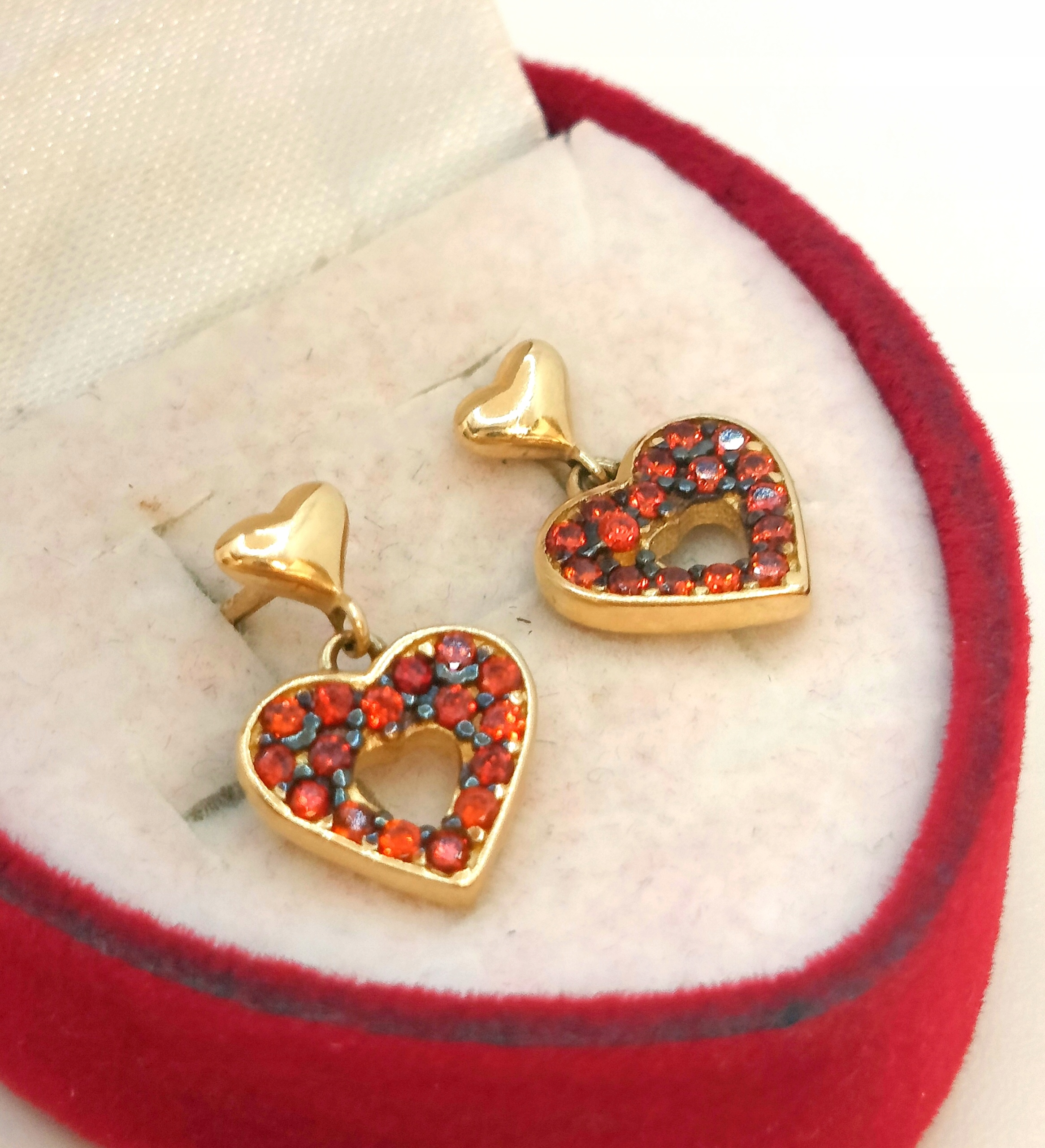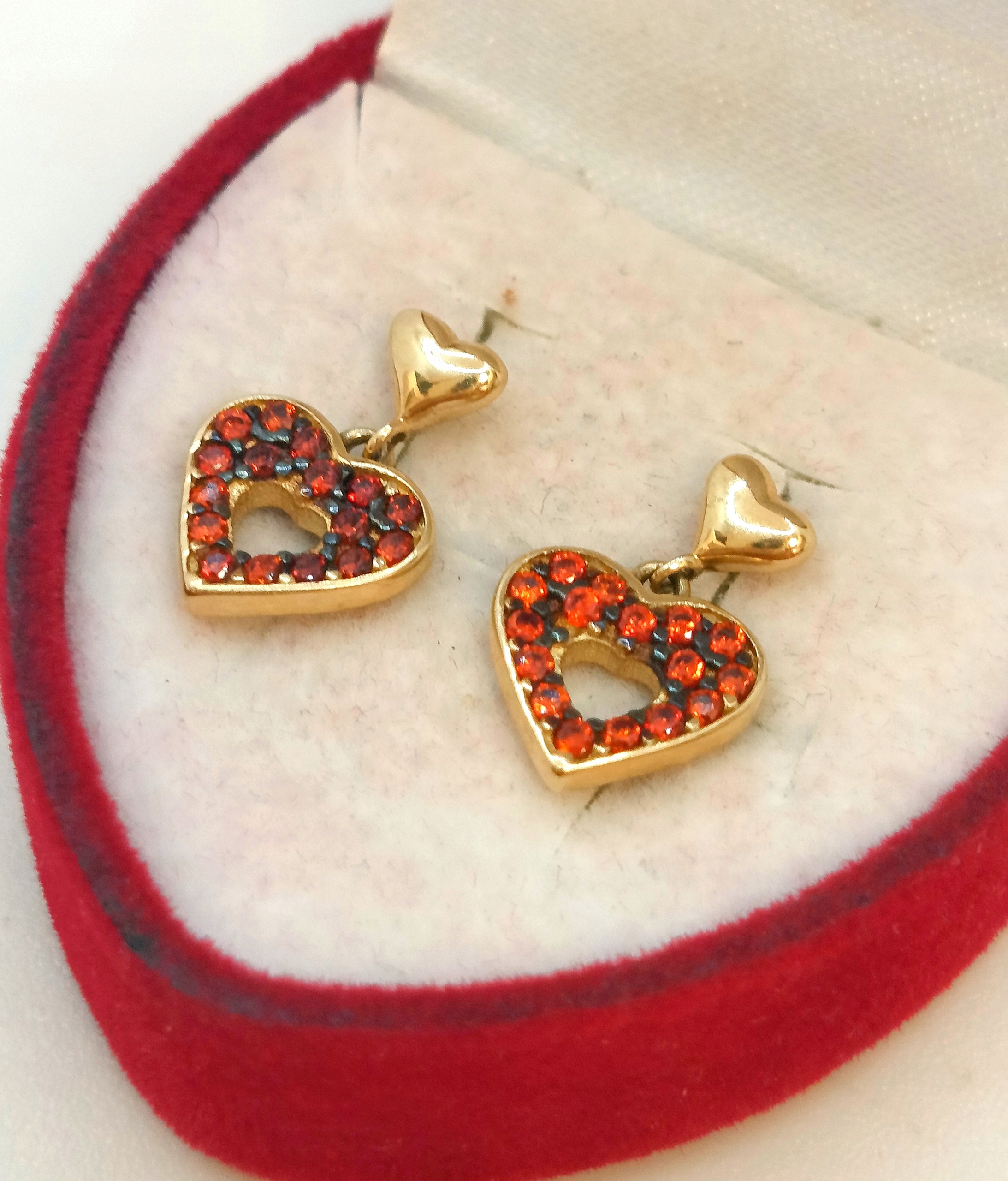 W ofercie na sprzedaż mamy dla Państwa , złote kolczyki serca zdobione pomarańczowymi cyrkoniami.