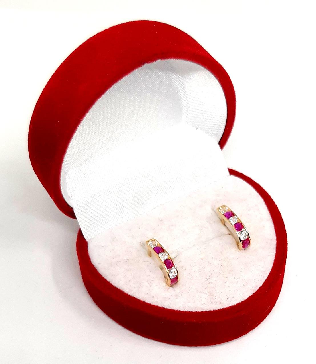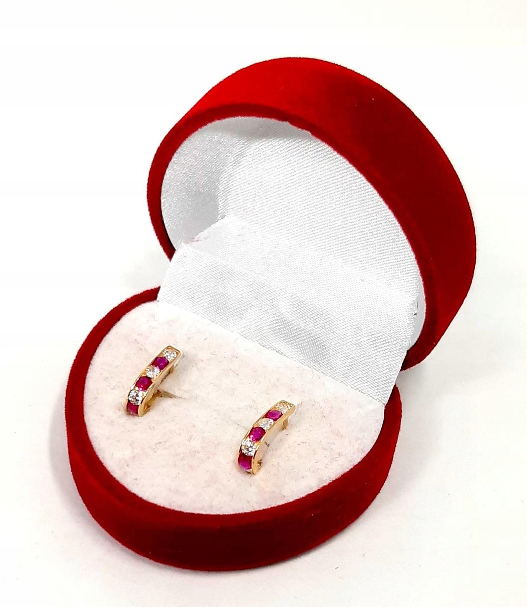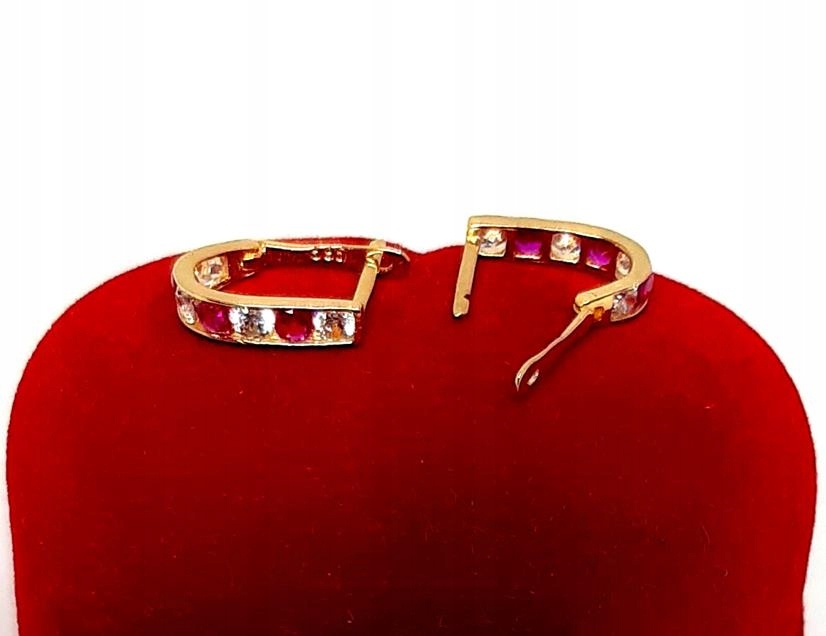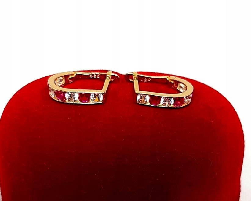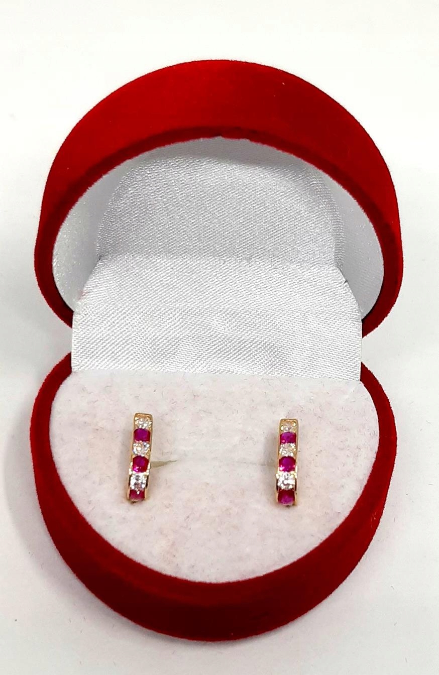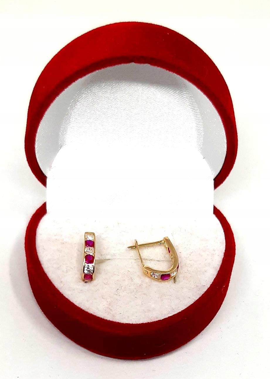 W ofercie sprzedaży posiadamy delikatne, złote kolczyki ozdobione ciemno różowymi i białymi cyrkoniami.