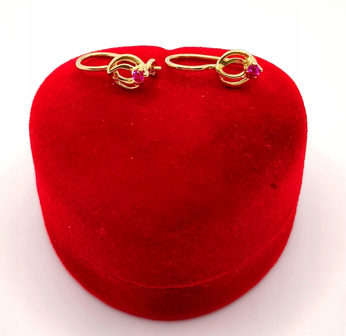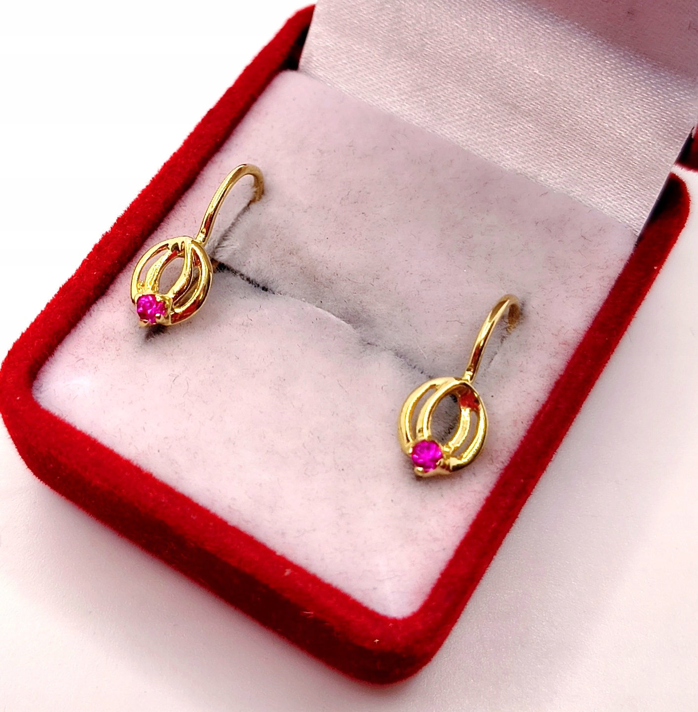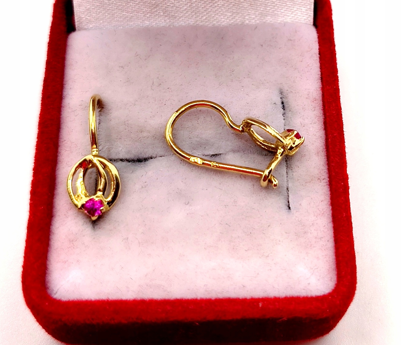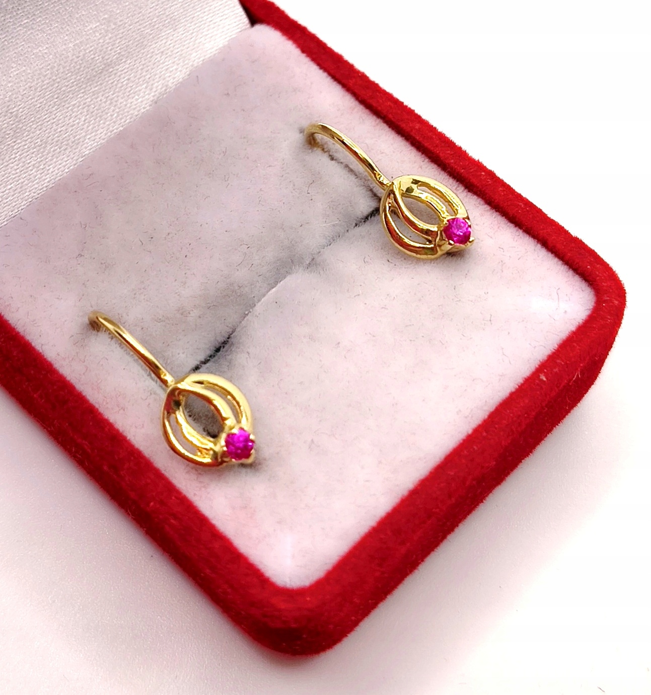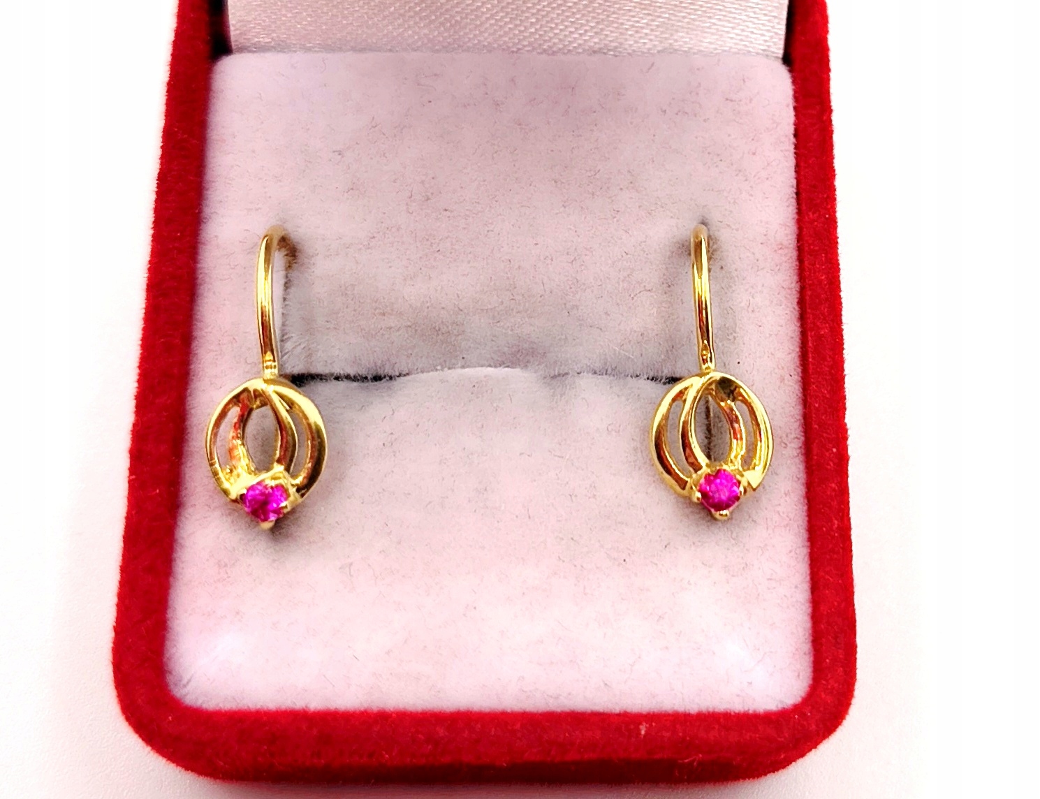 W ofercie na sprzedaż mamy dla państwa złote kolczyki ozdobione różowym kamieniem.