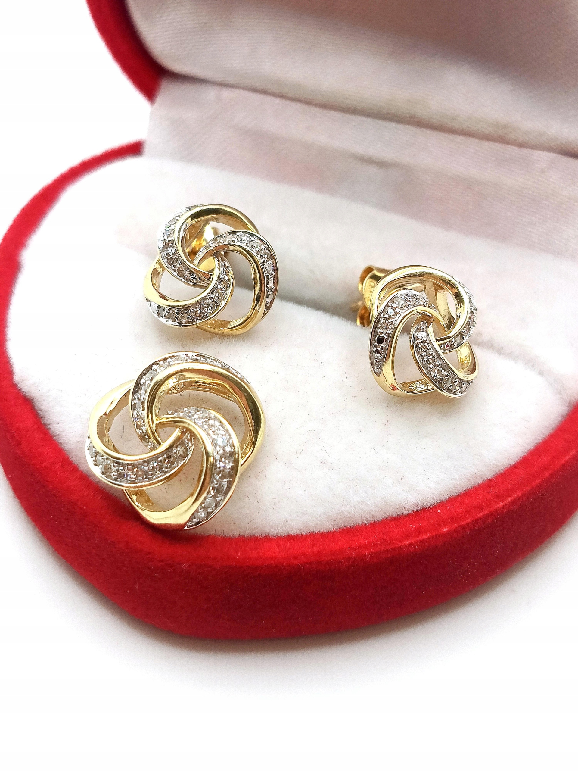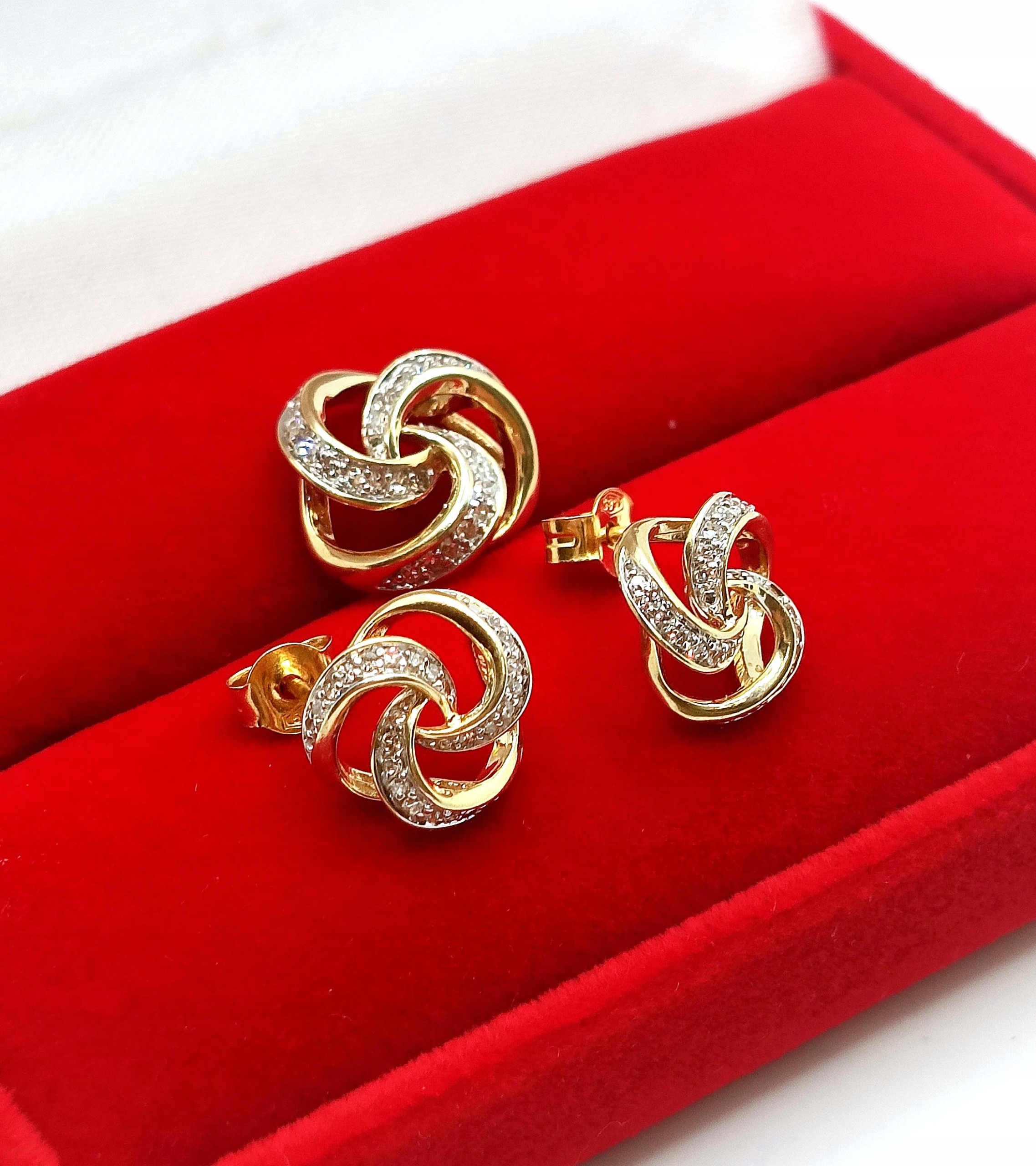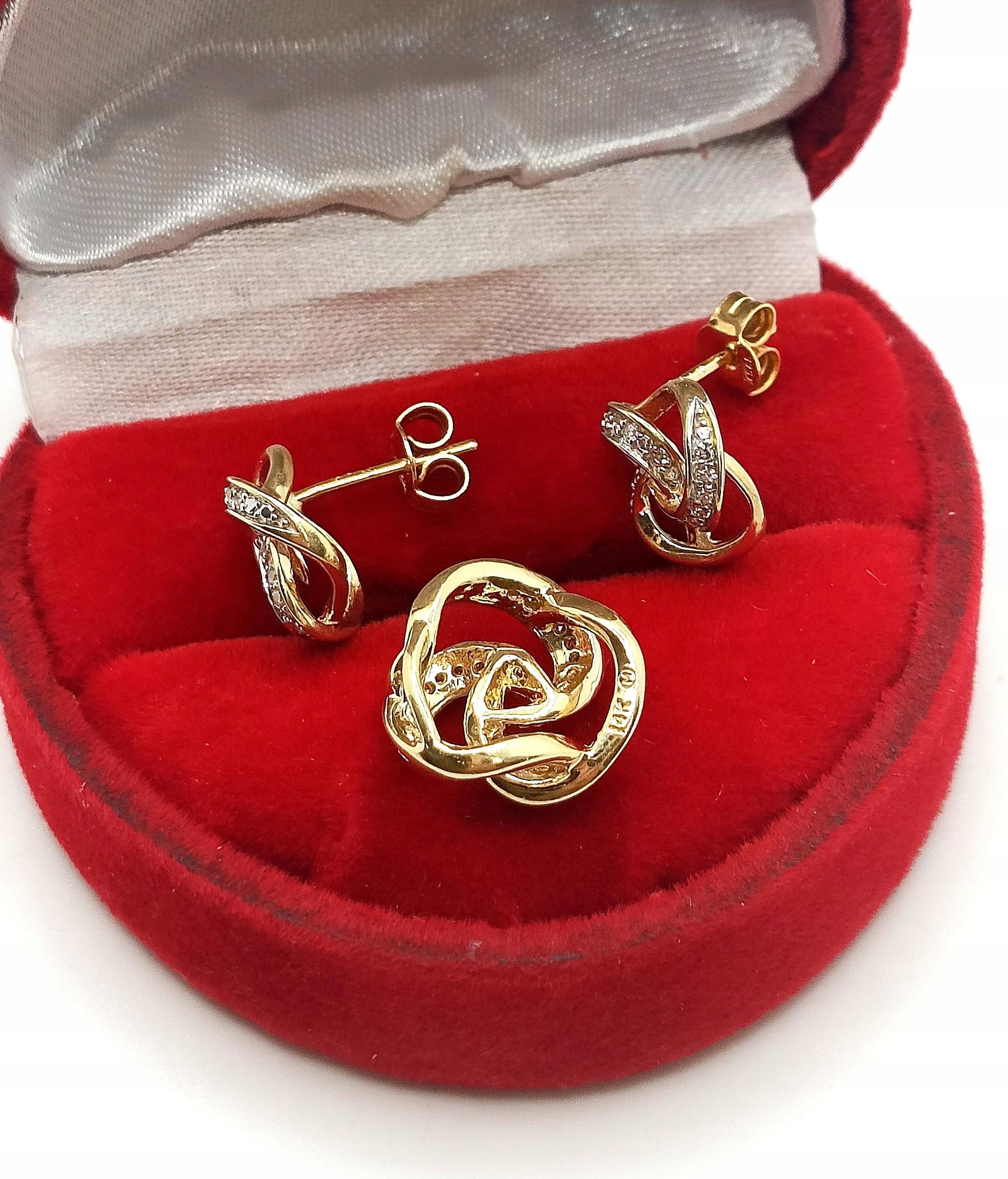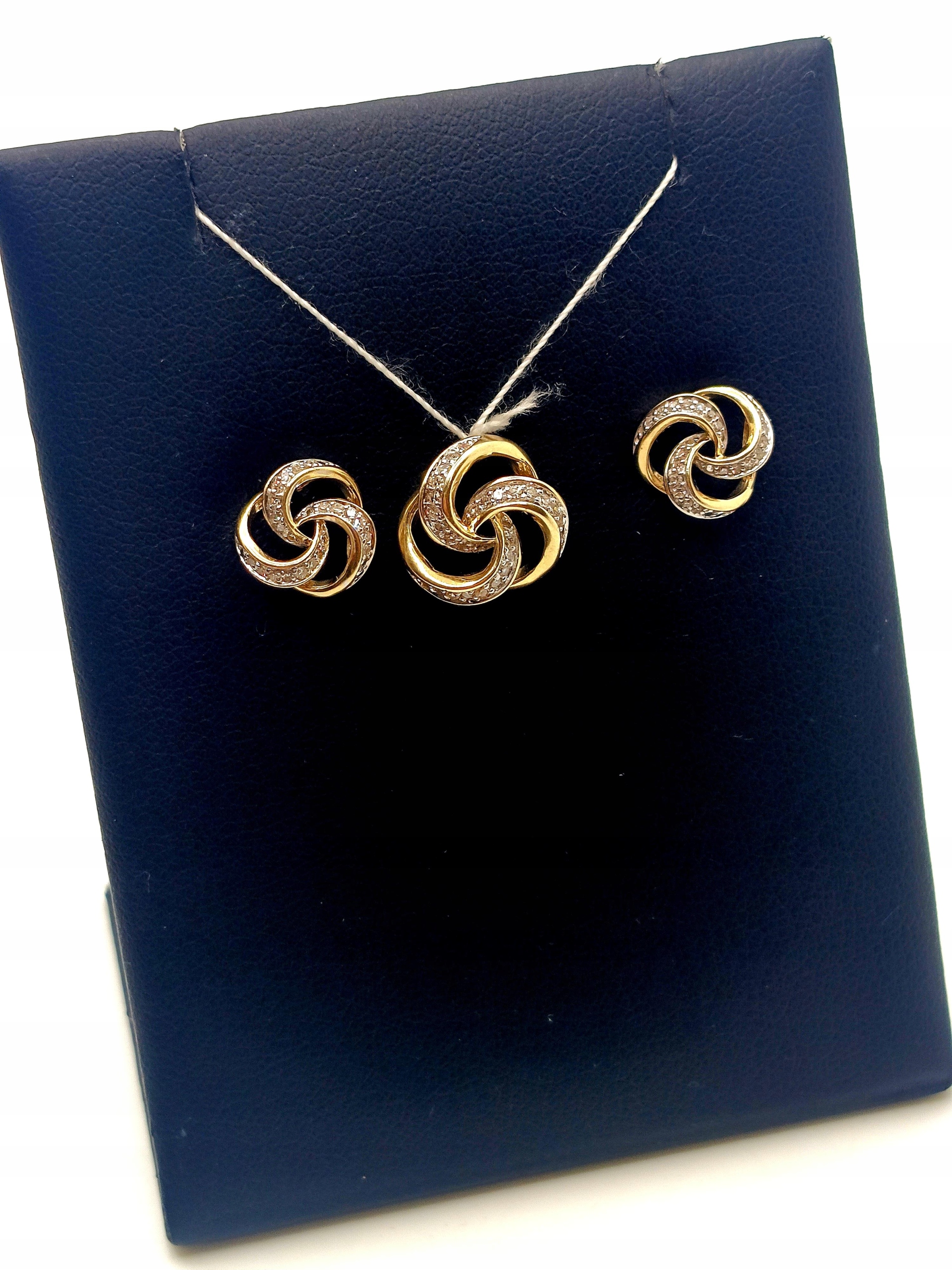 W ofercie na sprzedaż mamy dla Państwa piękny, złoty komplet ozdobiony diamentami, składający się z zawieszki i koczyków.