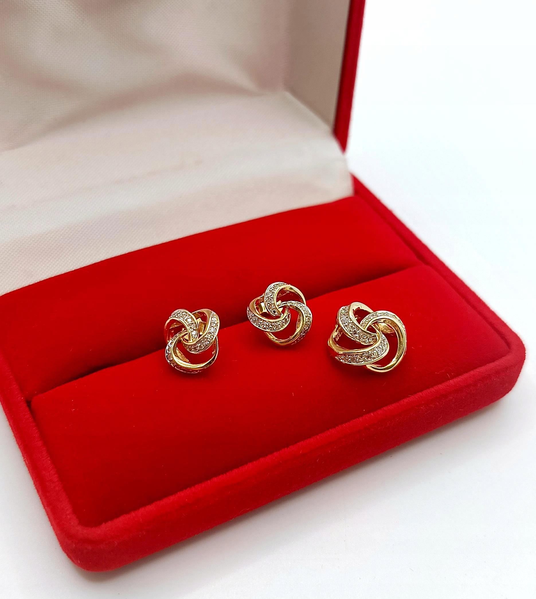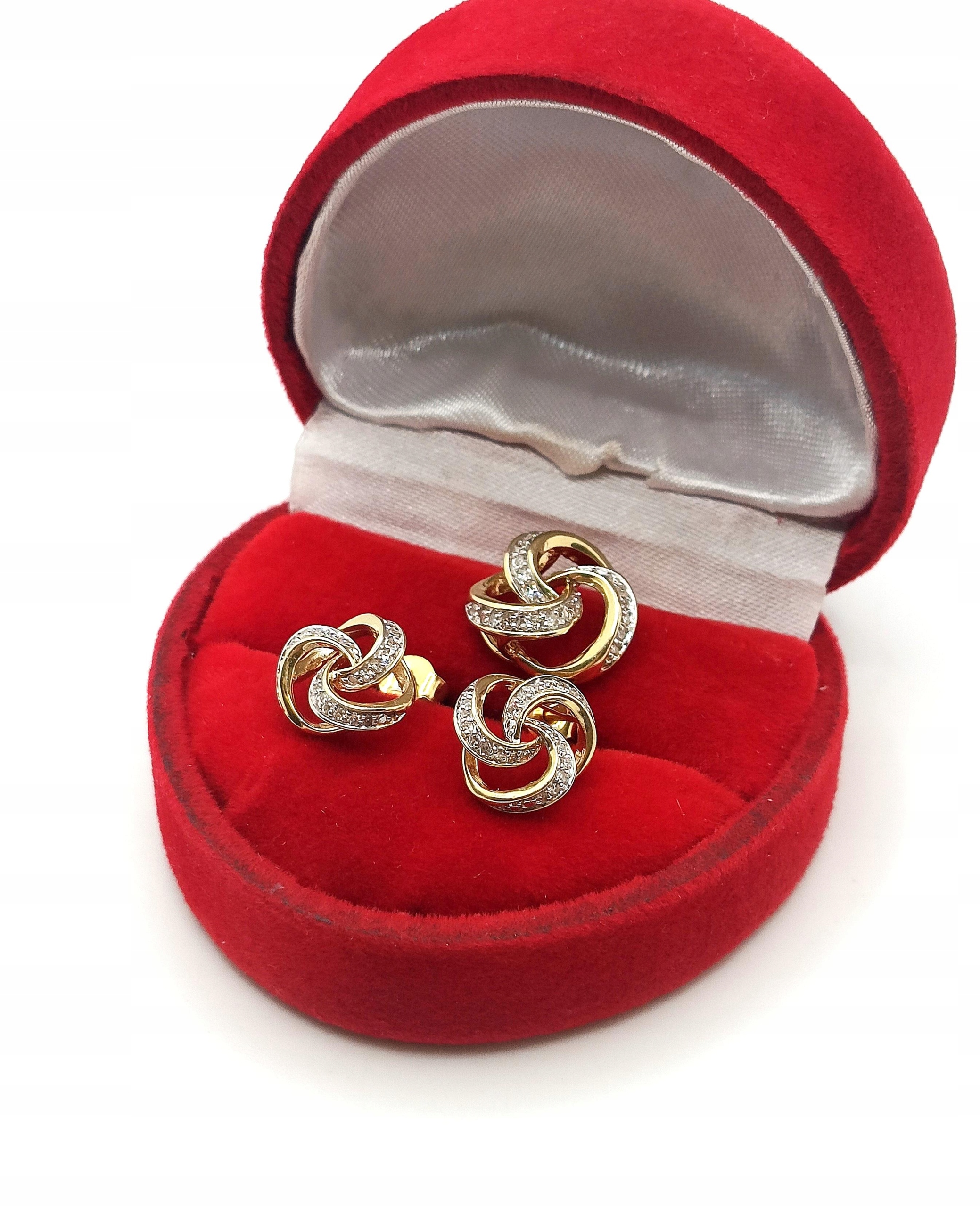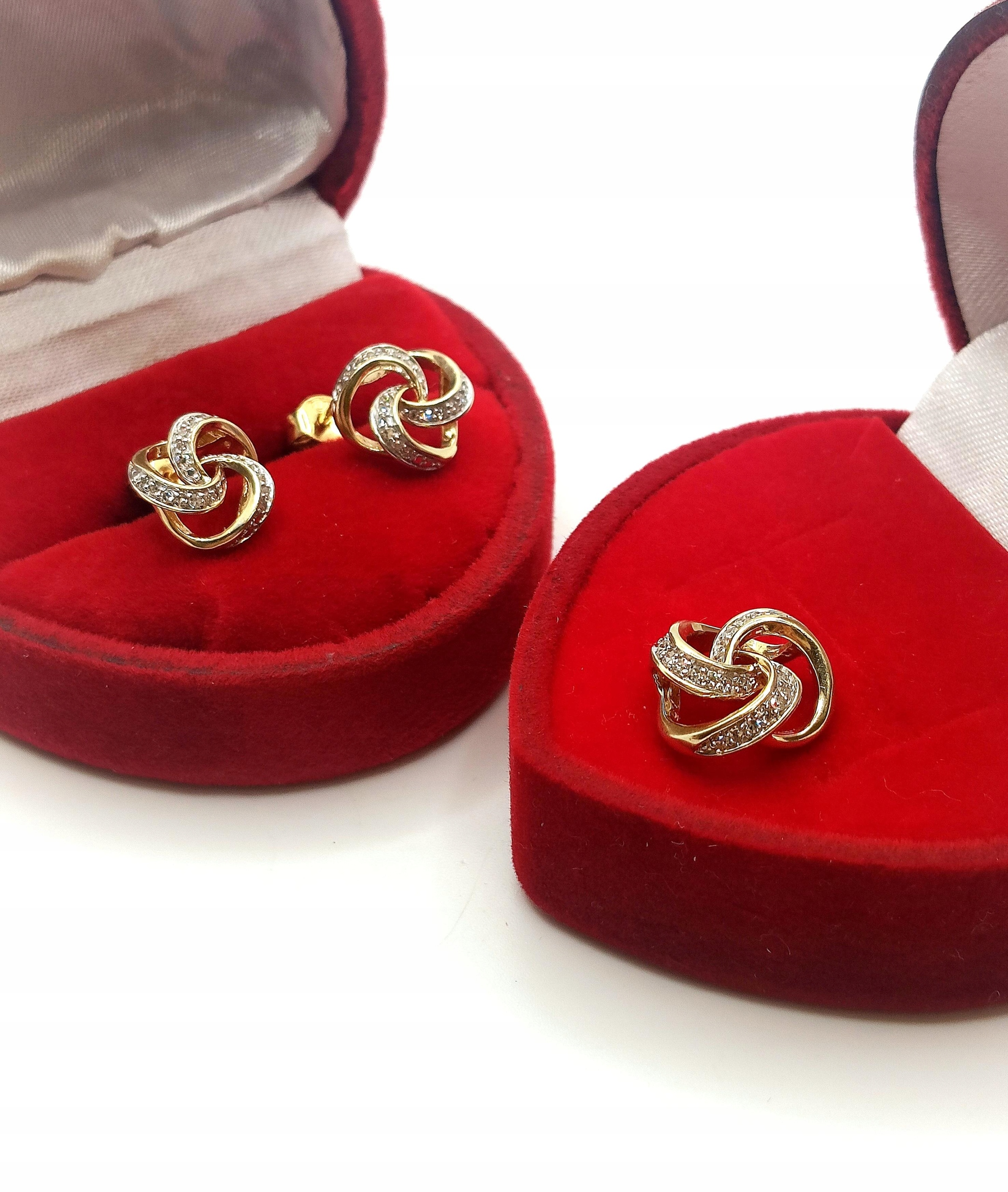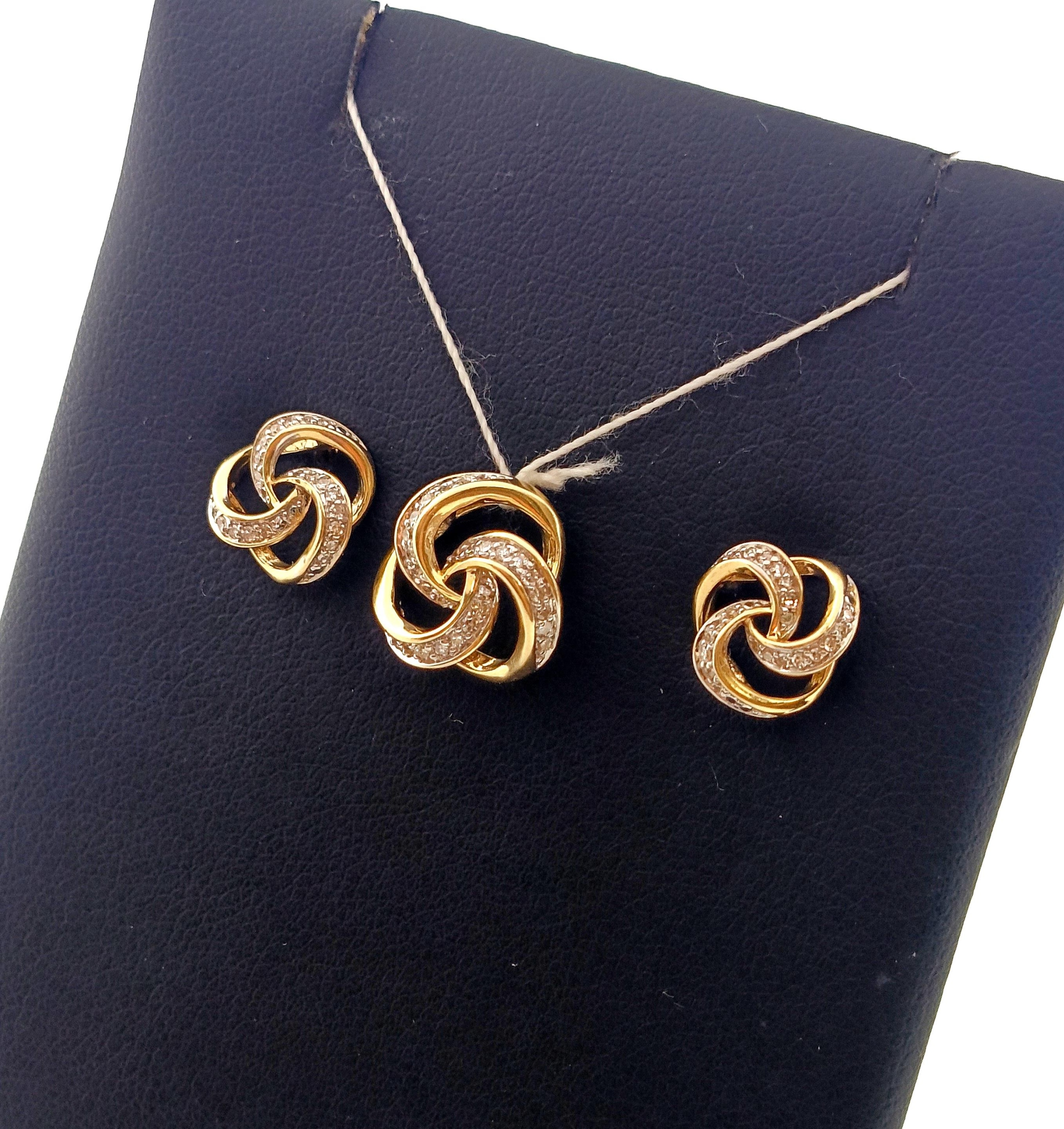 W ofercie na sprzedaż mamy dla Państwa piękny, złoty komplet ozdobiony diamentami, składający się z zawieszki i koczyków.