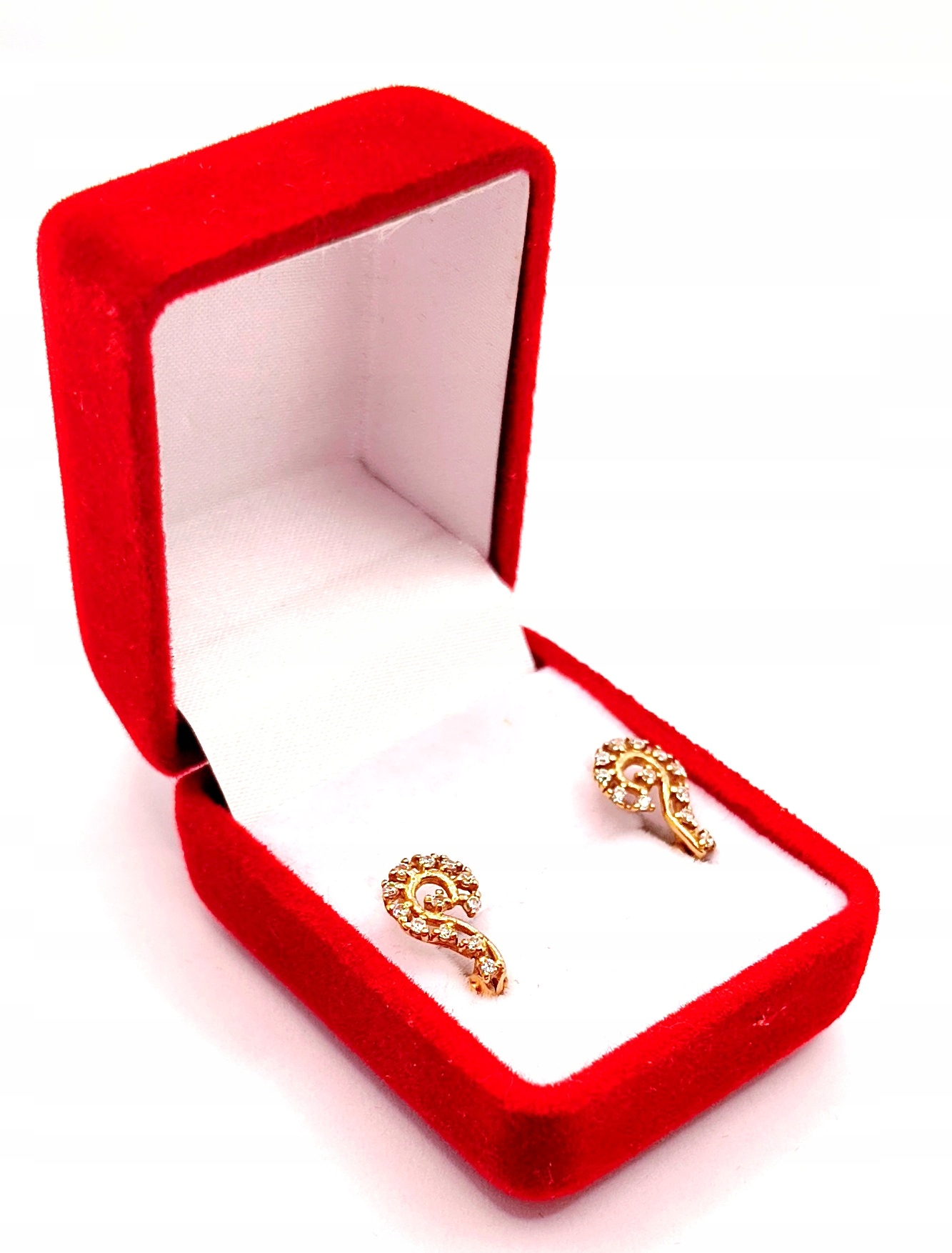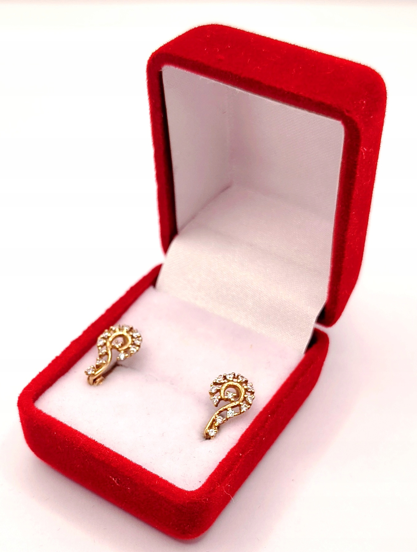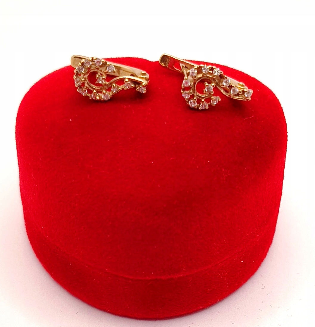 W ofercie na sprzedaż mamy dla Państwa piękne, złote kolczyki, o kształcie przypominającym znak zapytania, ozdobione cyrkoniami.