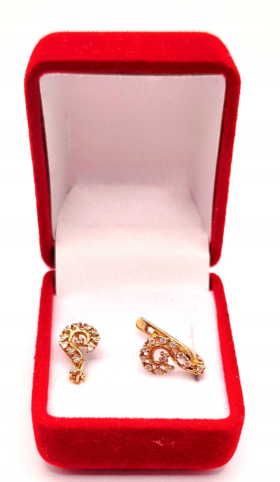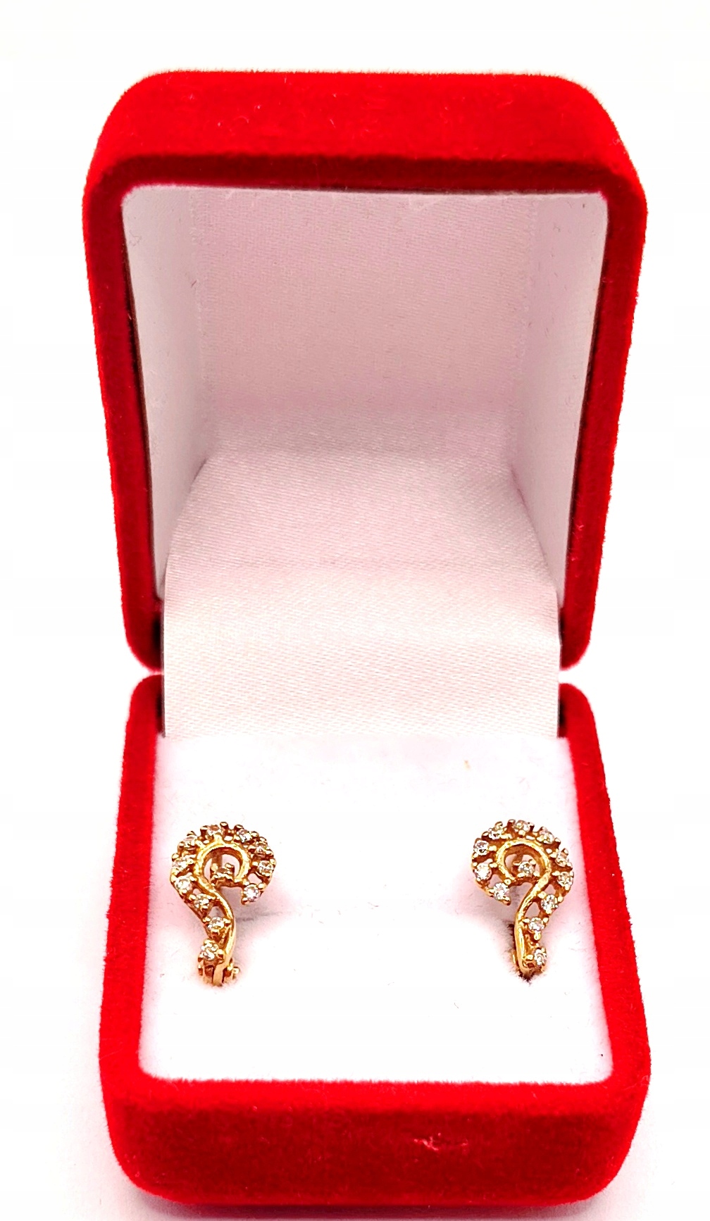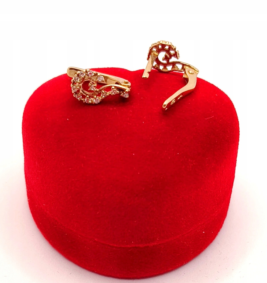 W ofercie na sprzedaż mamy dla Państwa piękne, złote kolczyki, o kształcie przypominającym znak zapytania, ozdobione cyrkoniami.