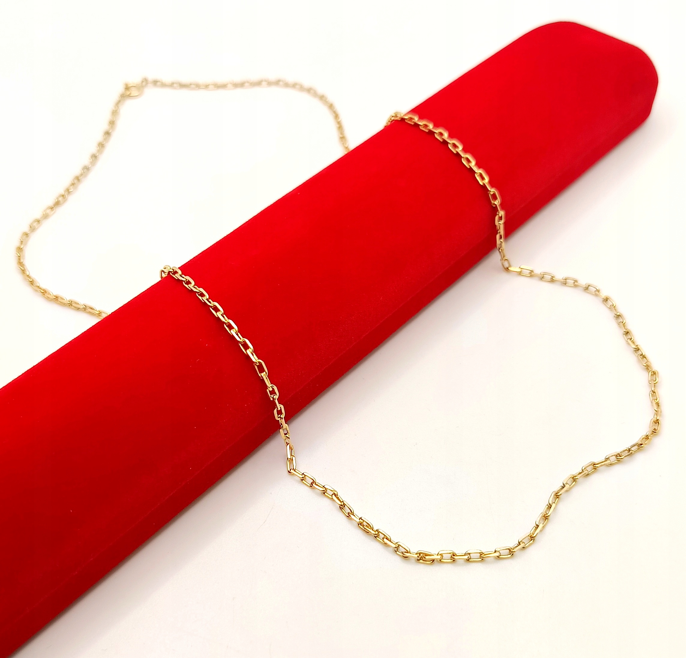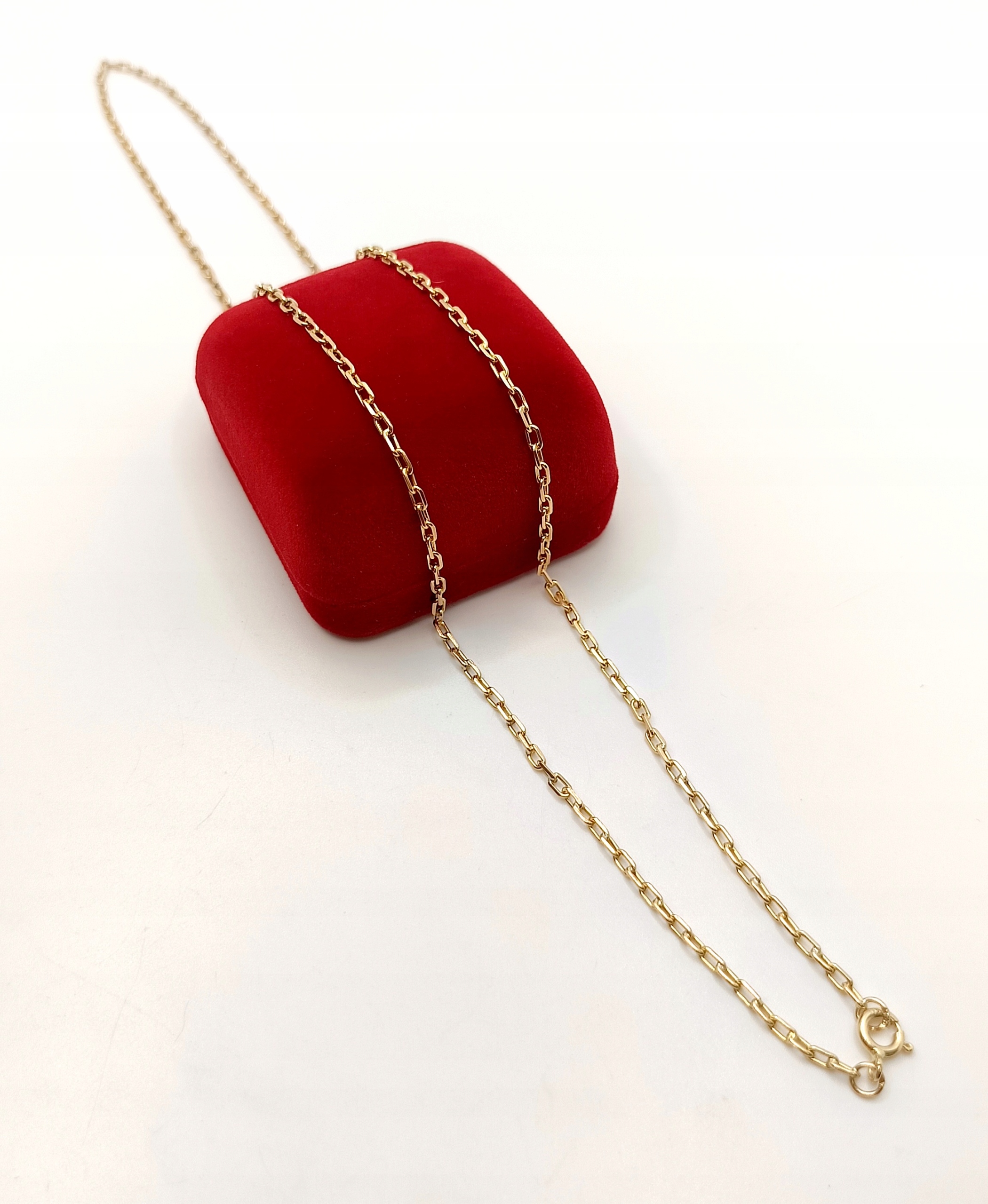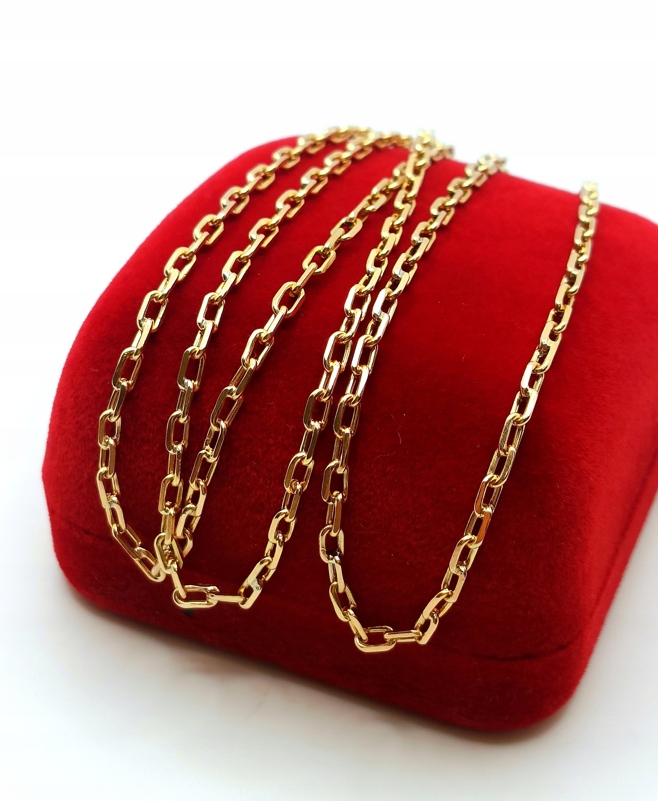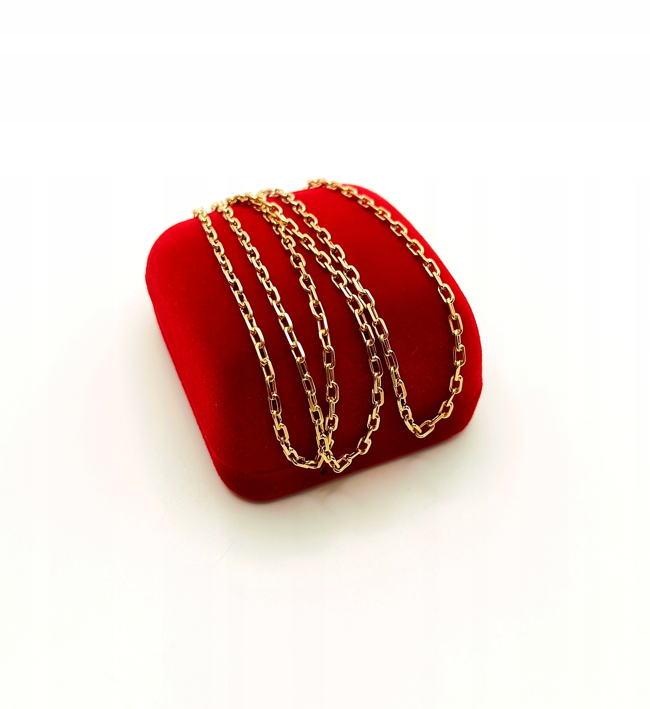 Oferujemy na sprzedaż piękny, złoty łańcuszek, o splocie ankier. Ogniwa pełne. Co drugie ogniwo jest przylutowane do kolejnego. Do lutowania ogniw używano srebra z miedzią w związku z czym mogą znajdować się śladowe ilości tego kruszcu.