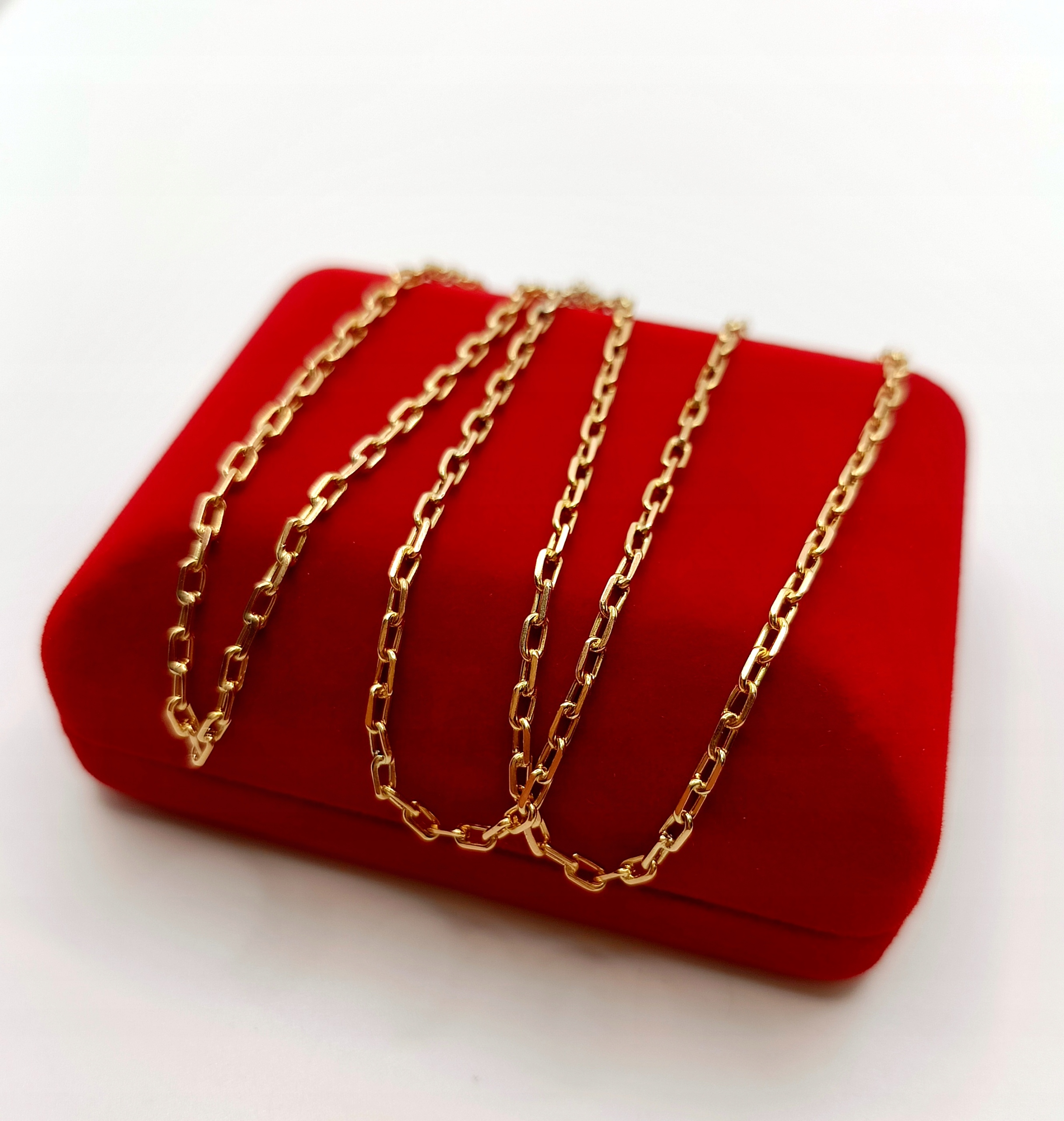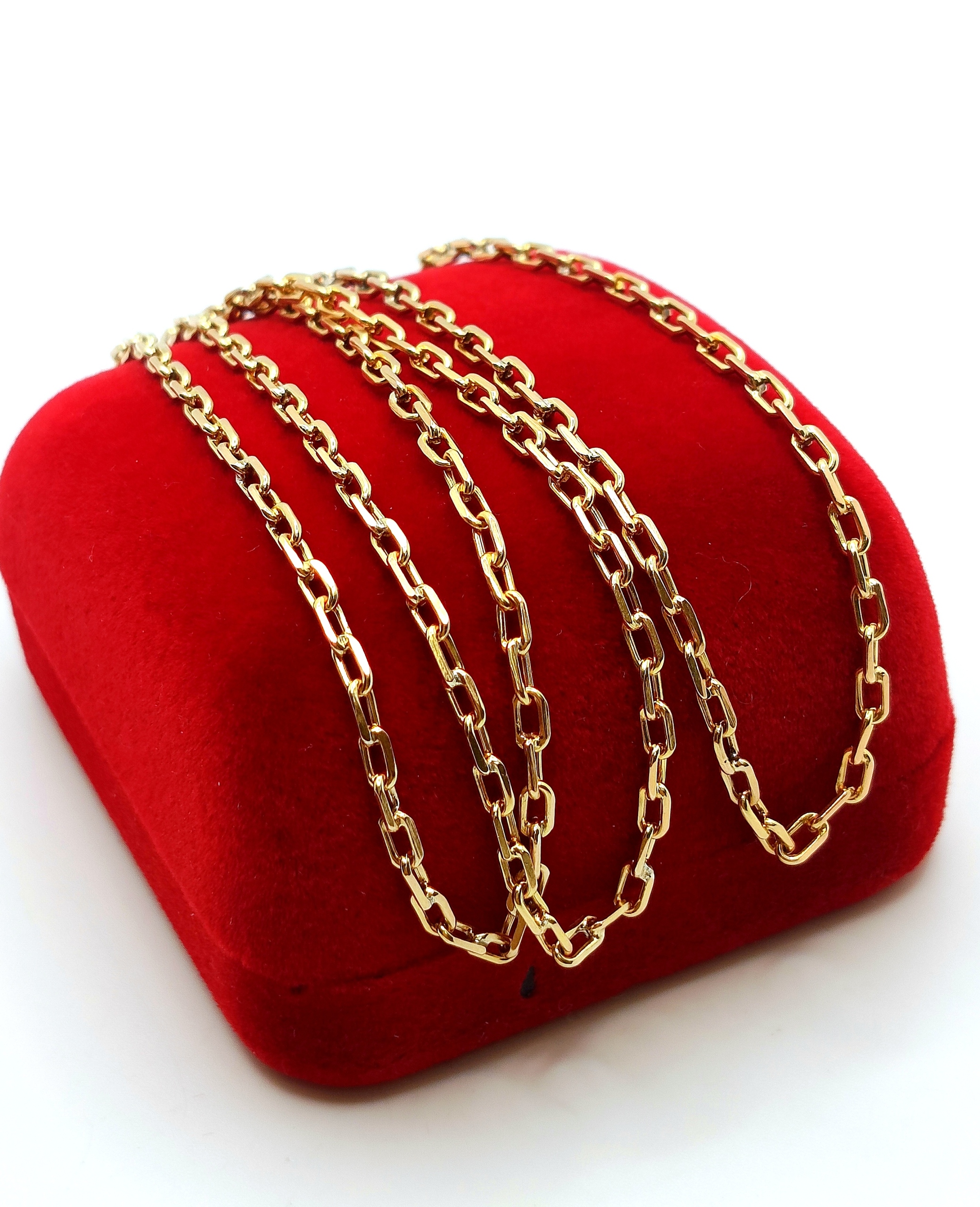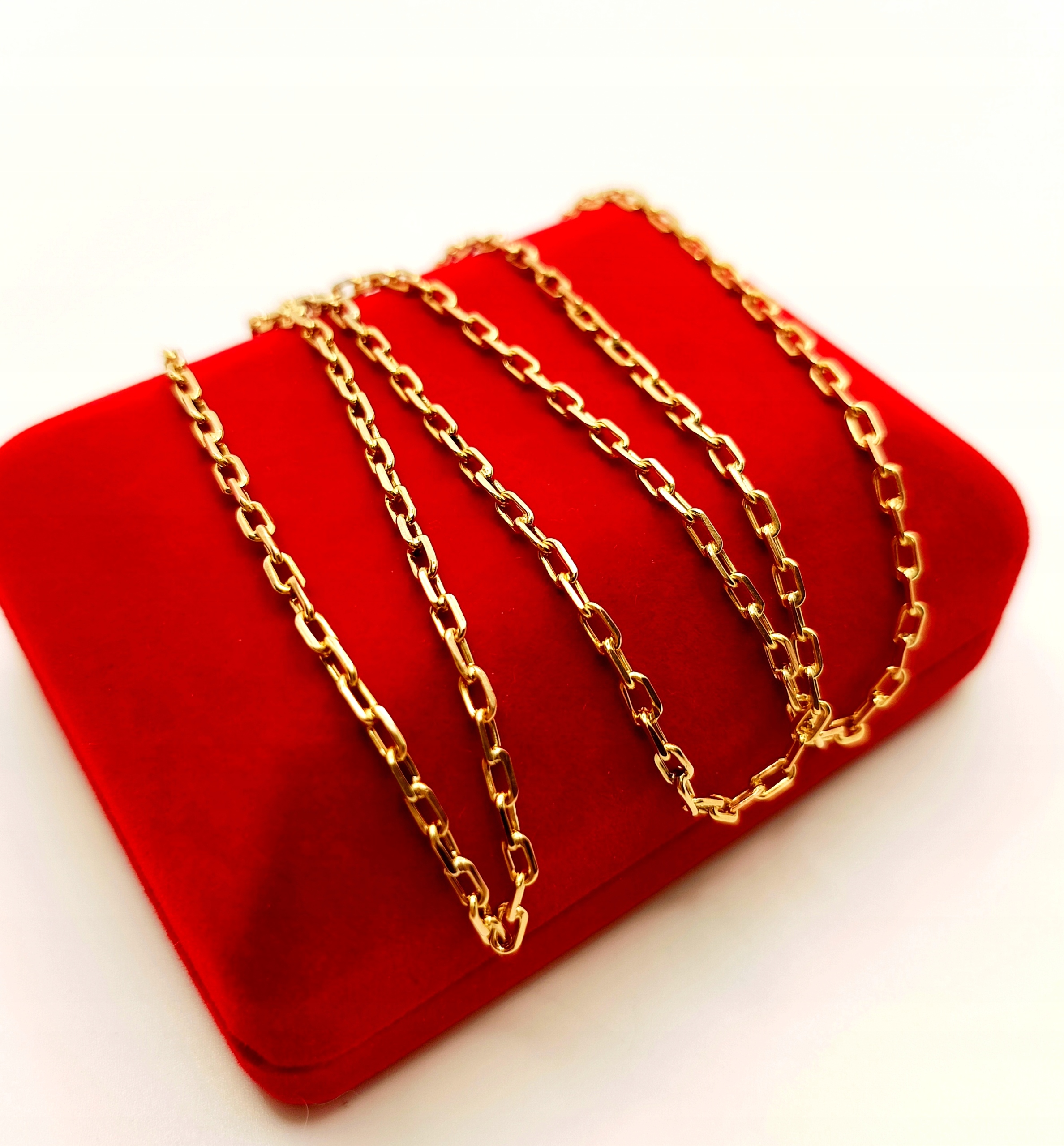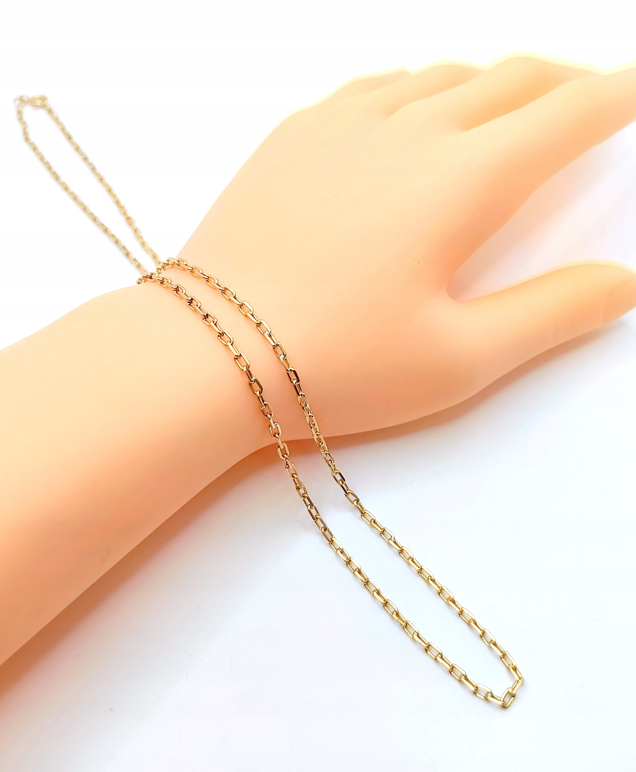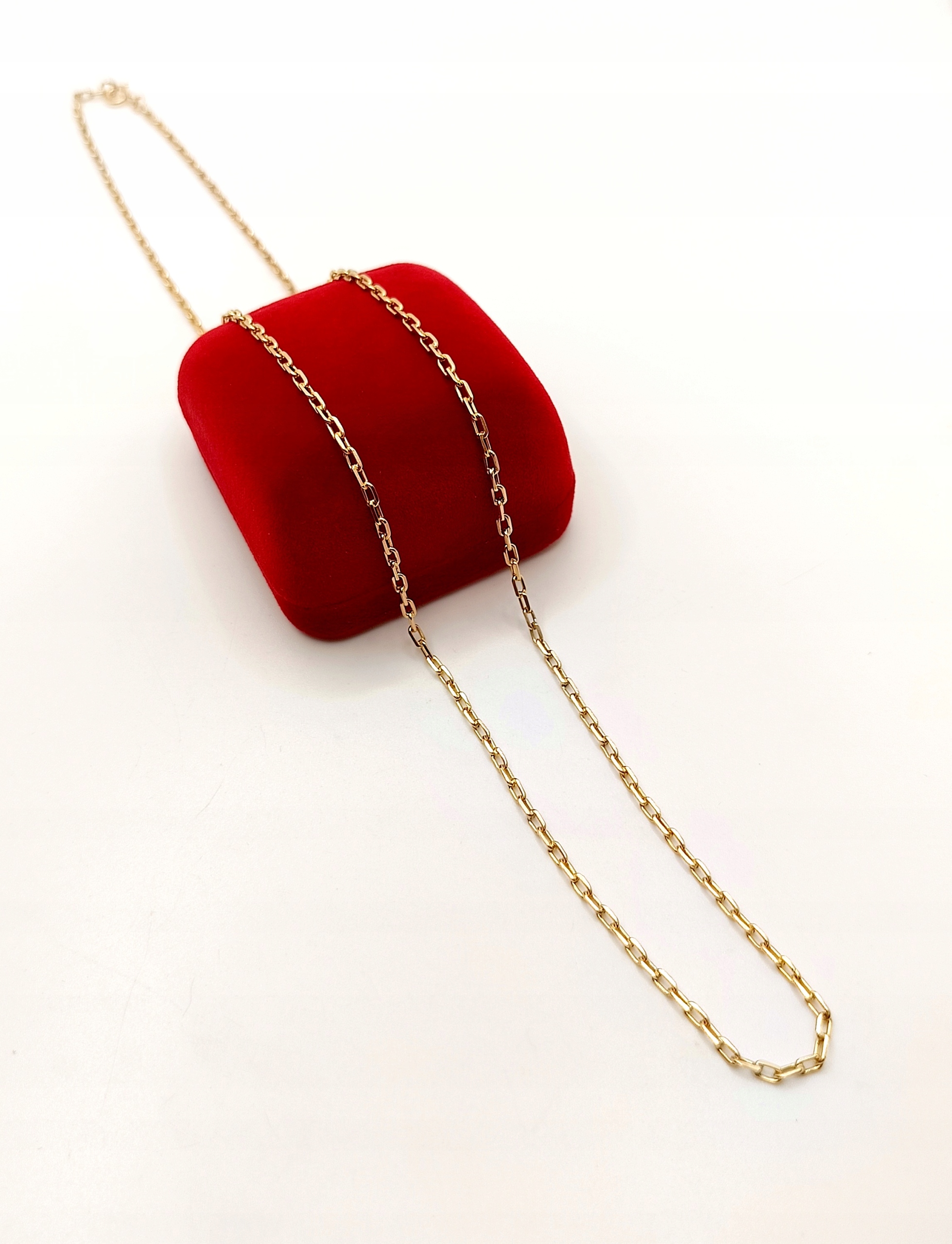 Oferujemy na sprzedaż piękny, złoty łańcuszek, o splocie ankier. Ogniwa pełne. Co drugie ogniwo jest przylutowane do kolejnego. Do lutowania ogniw używano srebra z miedzią w związku z czym mogą znajdować się śladowe ilości tego kruszcu.