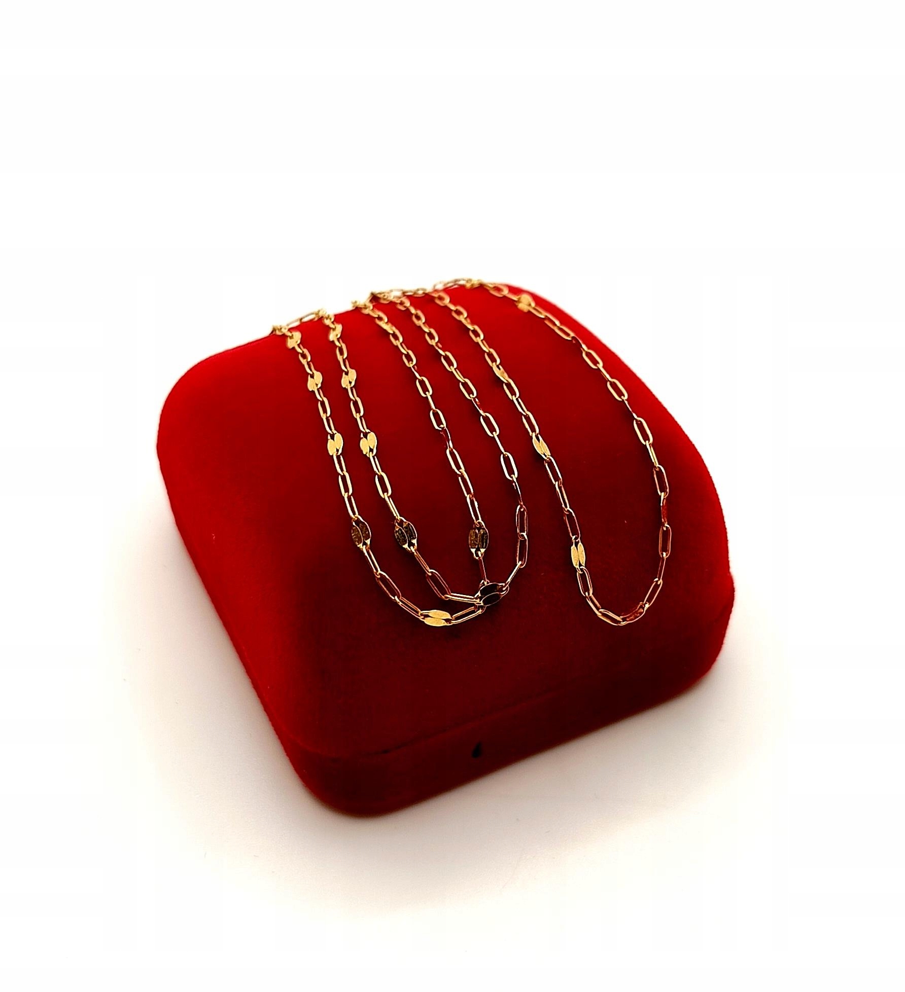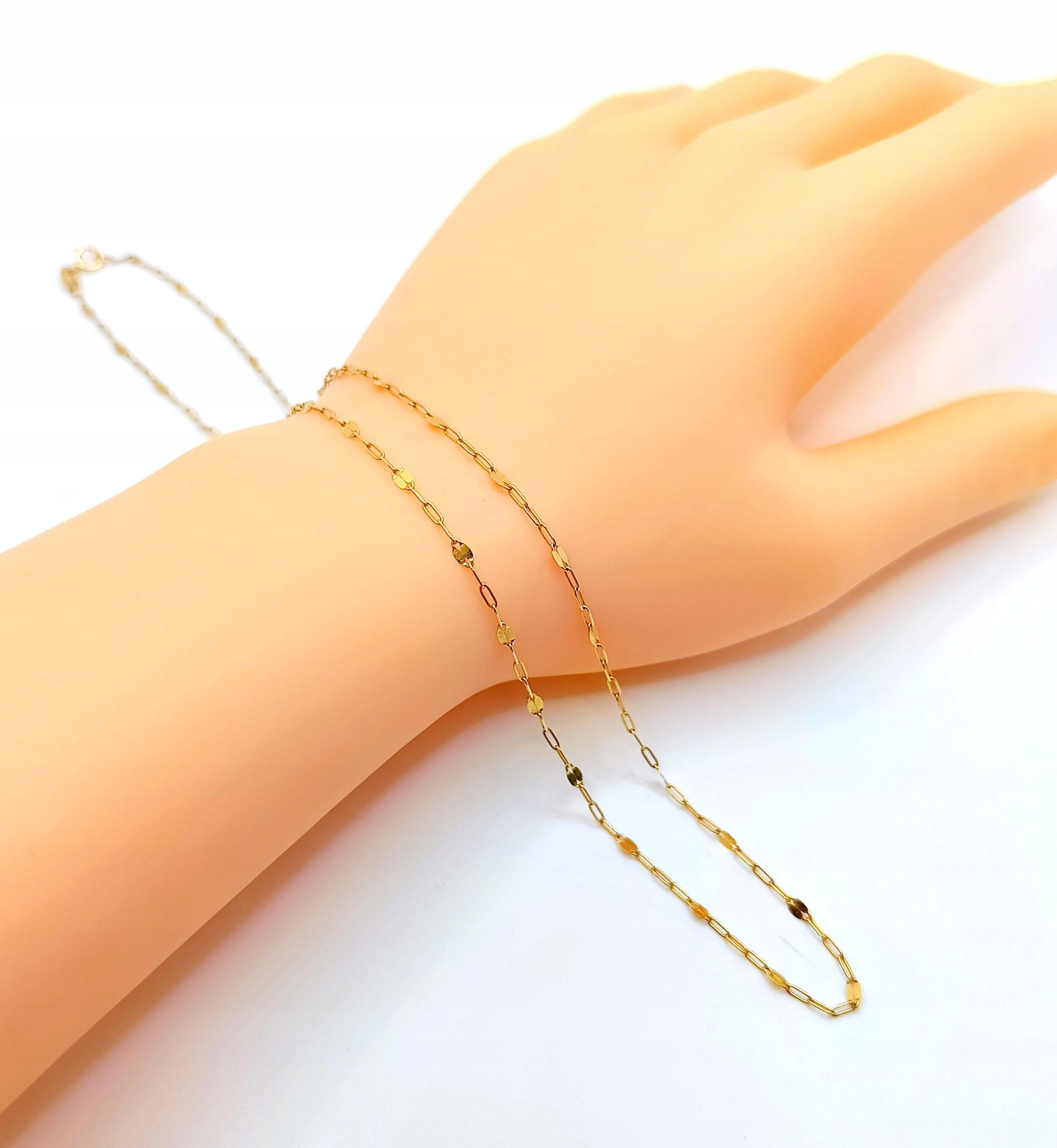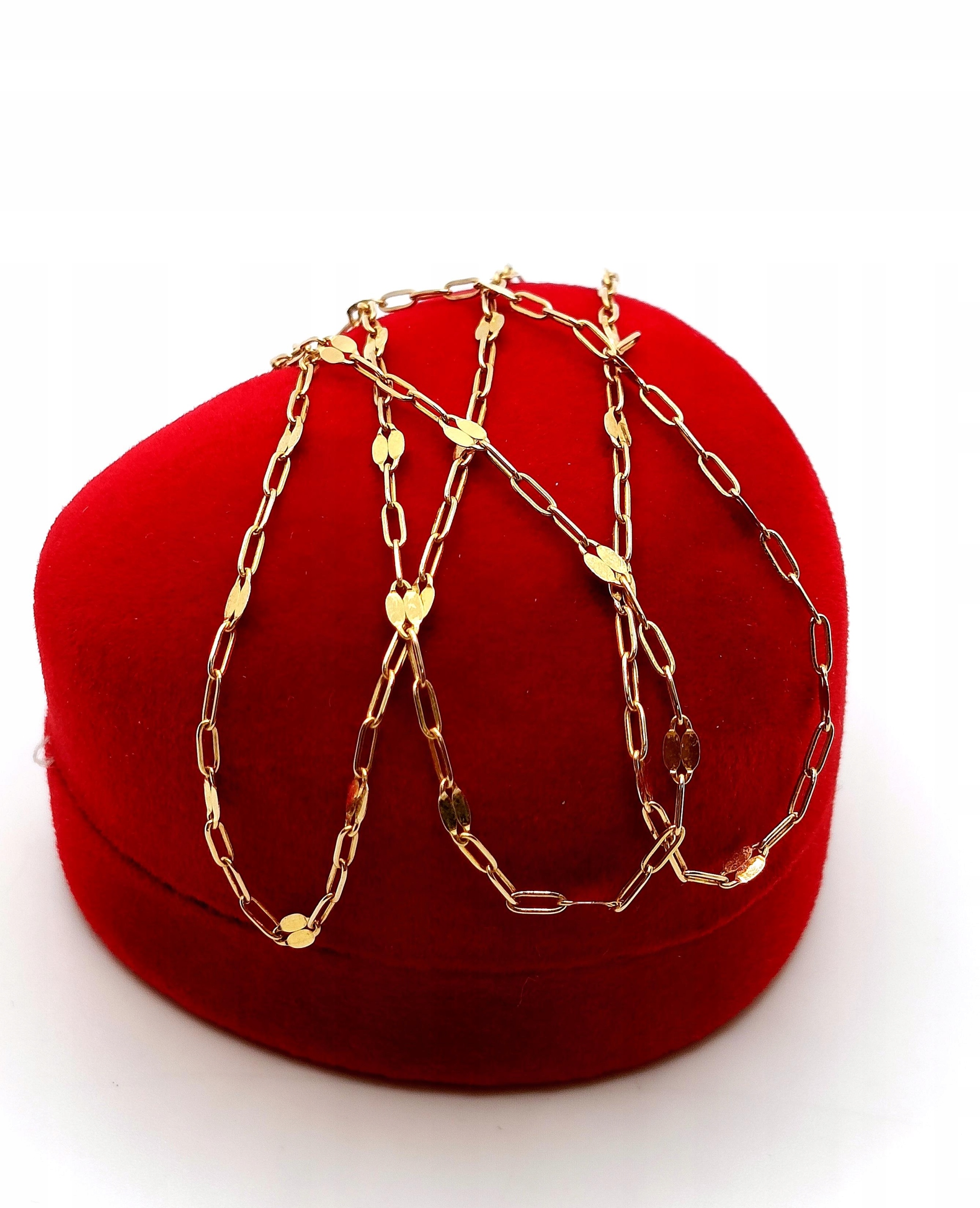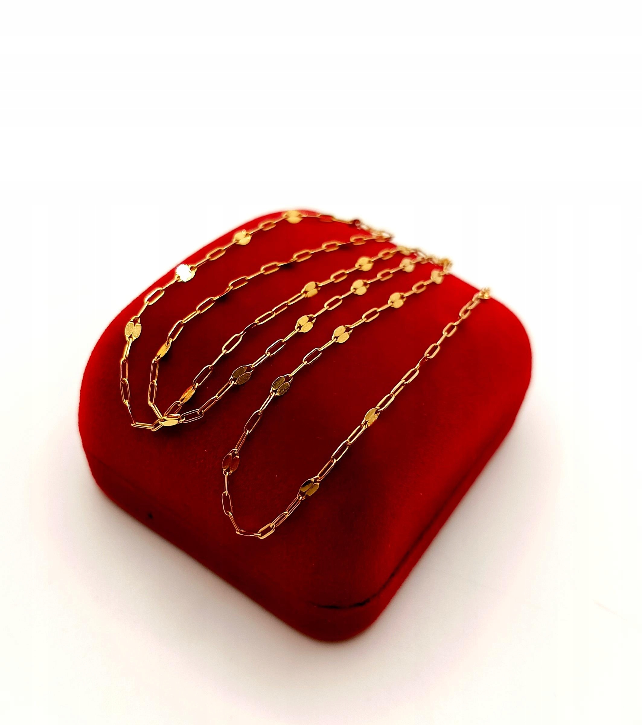 Oferujemy na sprzedaż piękny, złoty łańcuszek, o splocie ankier. Co czwarte ogniwko w formie blaszki, które pięknie odbija światło.