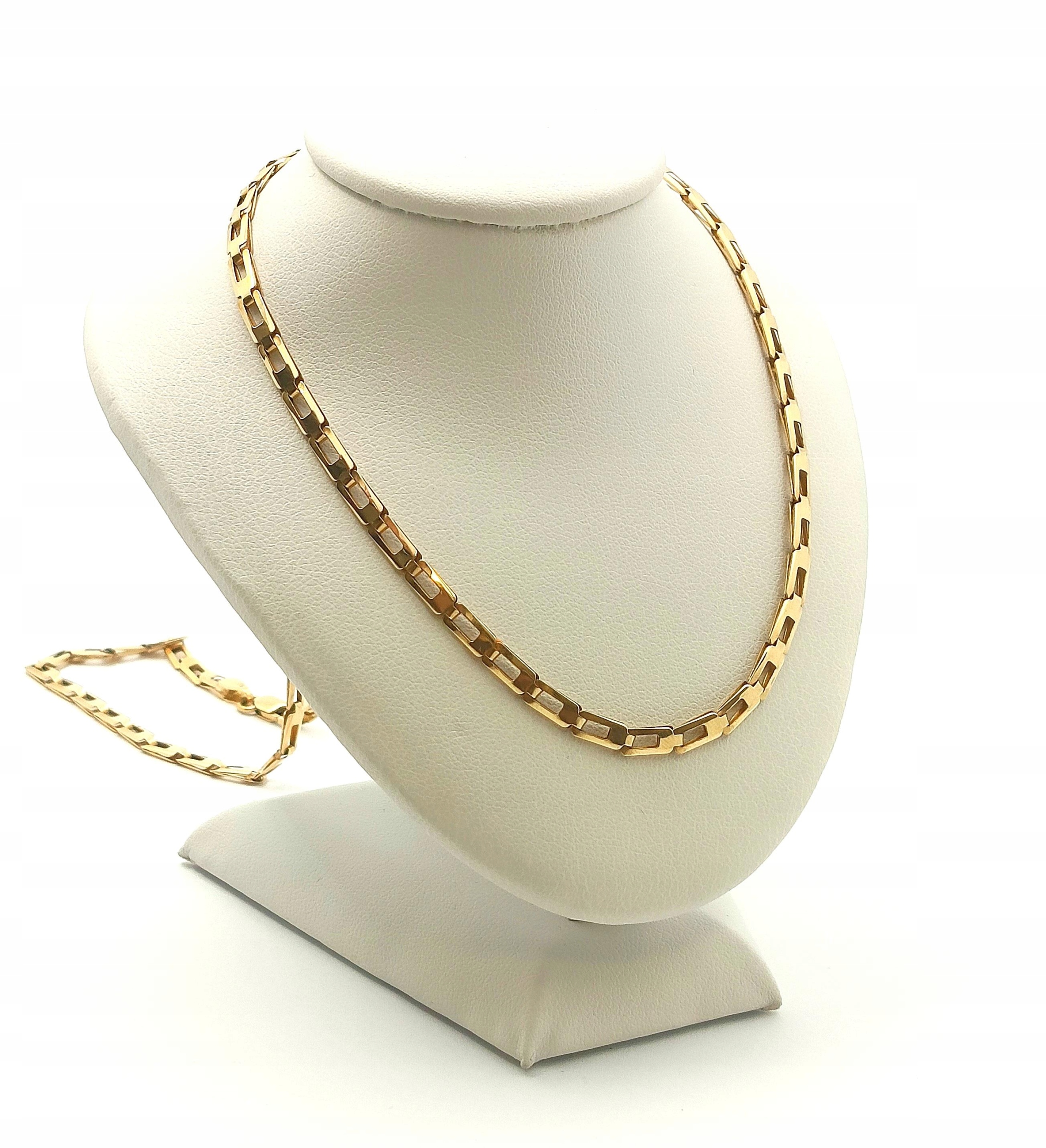 Oferujemy na sprzedaż złoty łańcuszek o unikatowym splocie w formie przeplatających się wzajemnie, podwójnych blaszek.